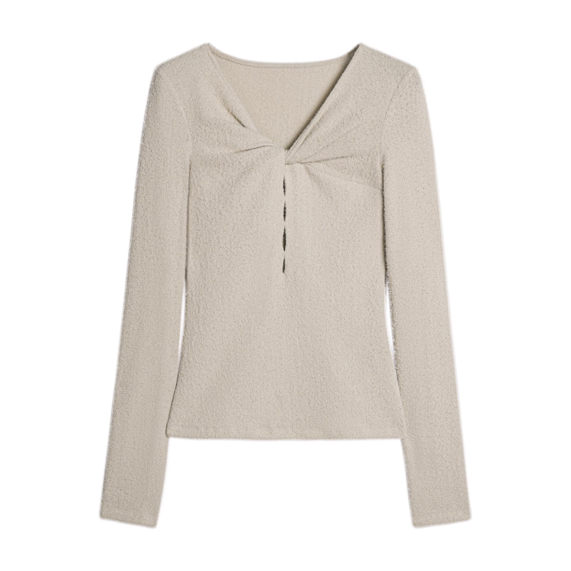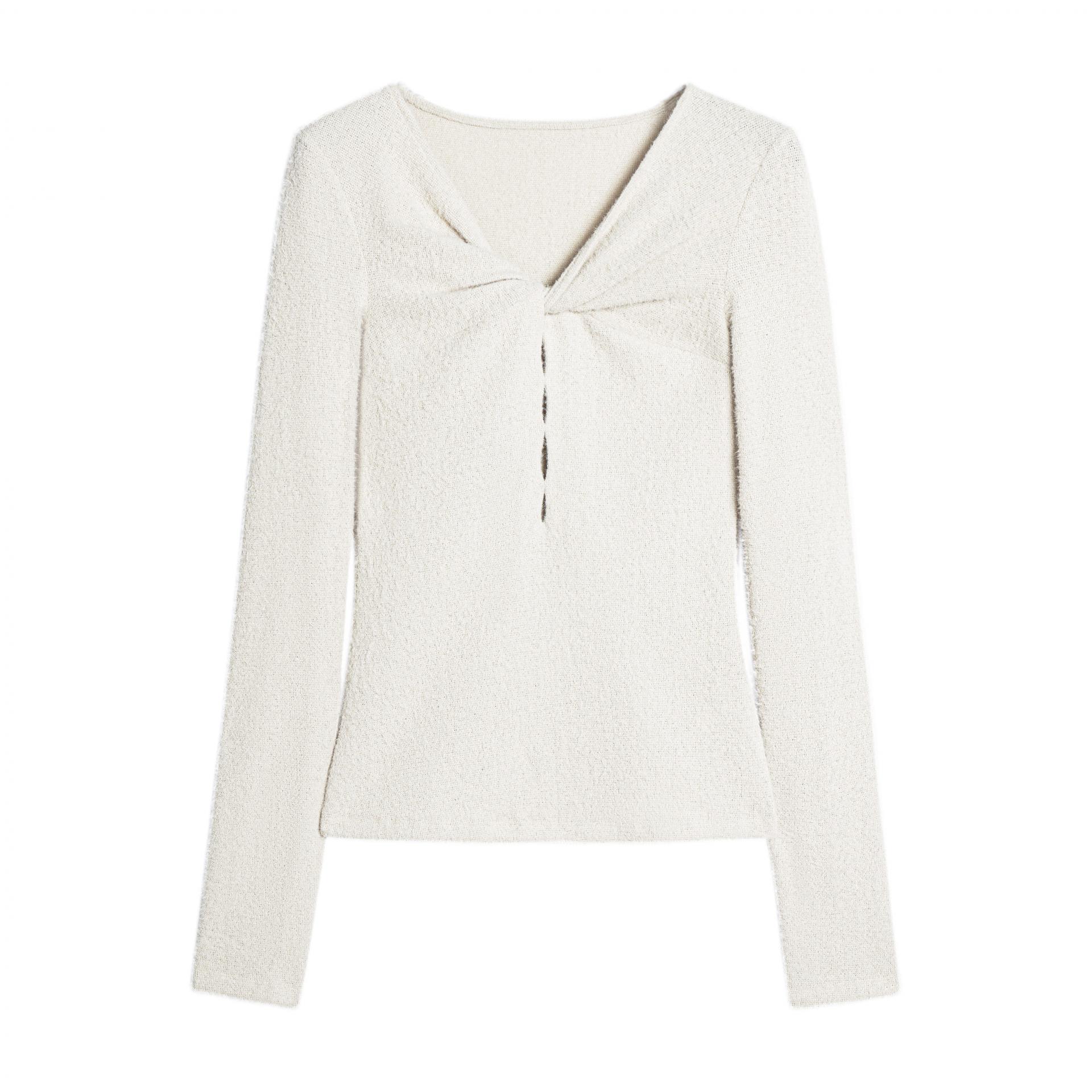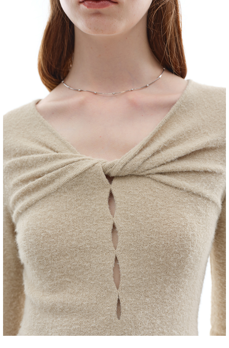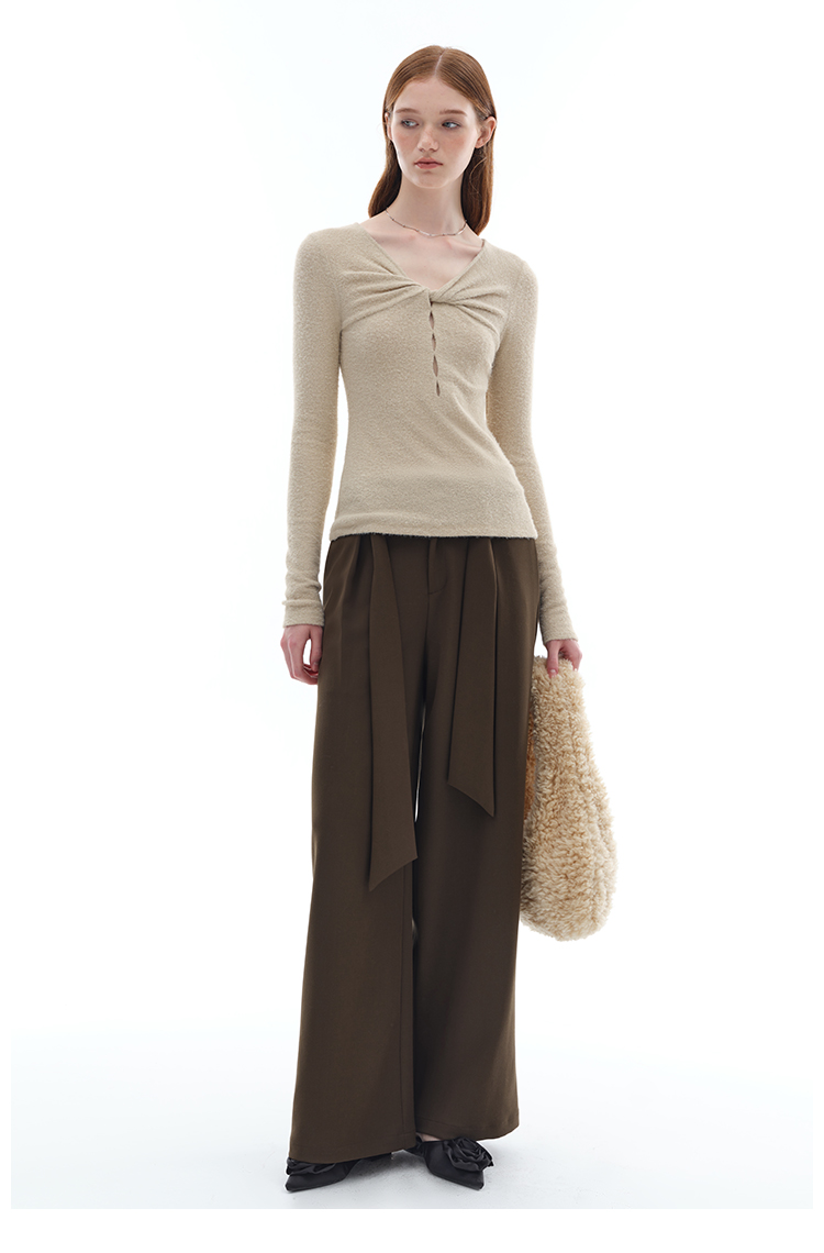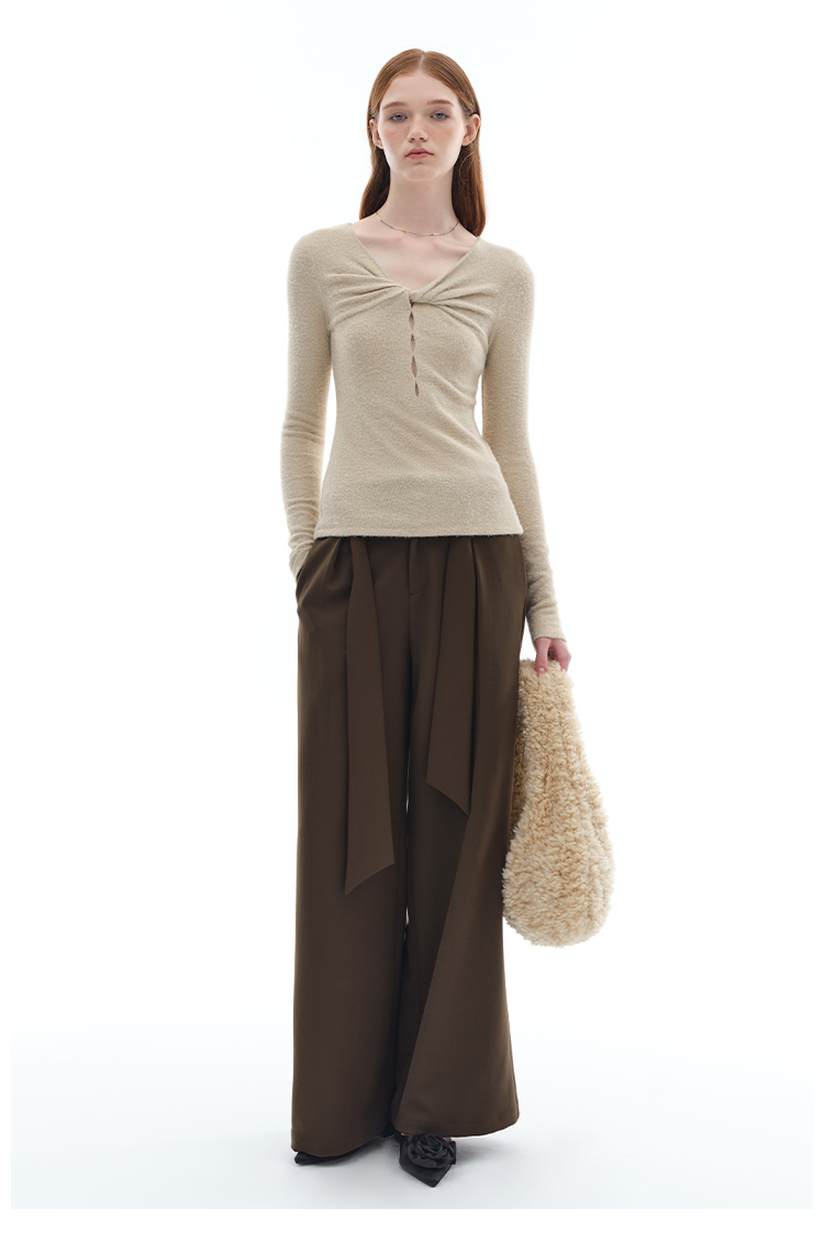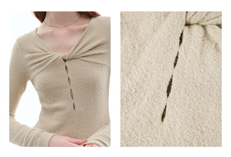 Waffle V-neck knot lace elastic slimming knitted long-sleeve T-shirt
