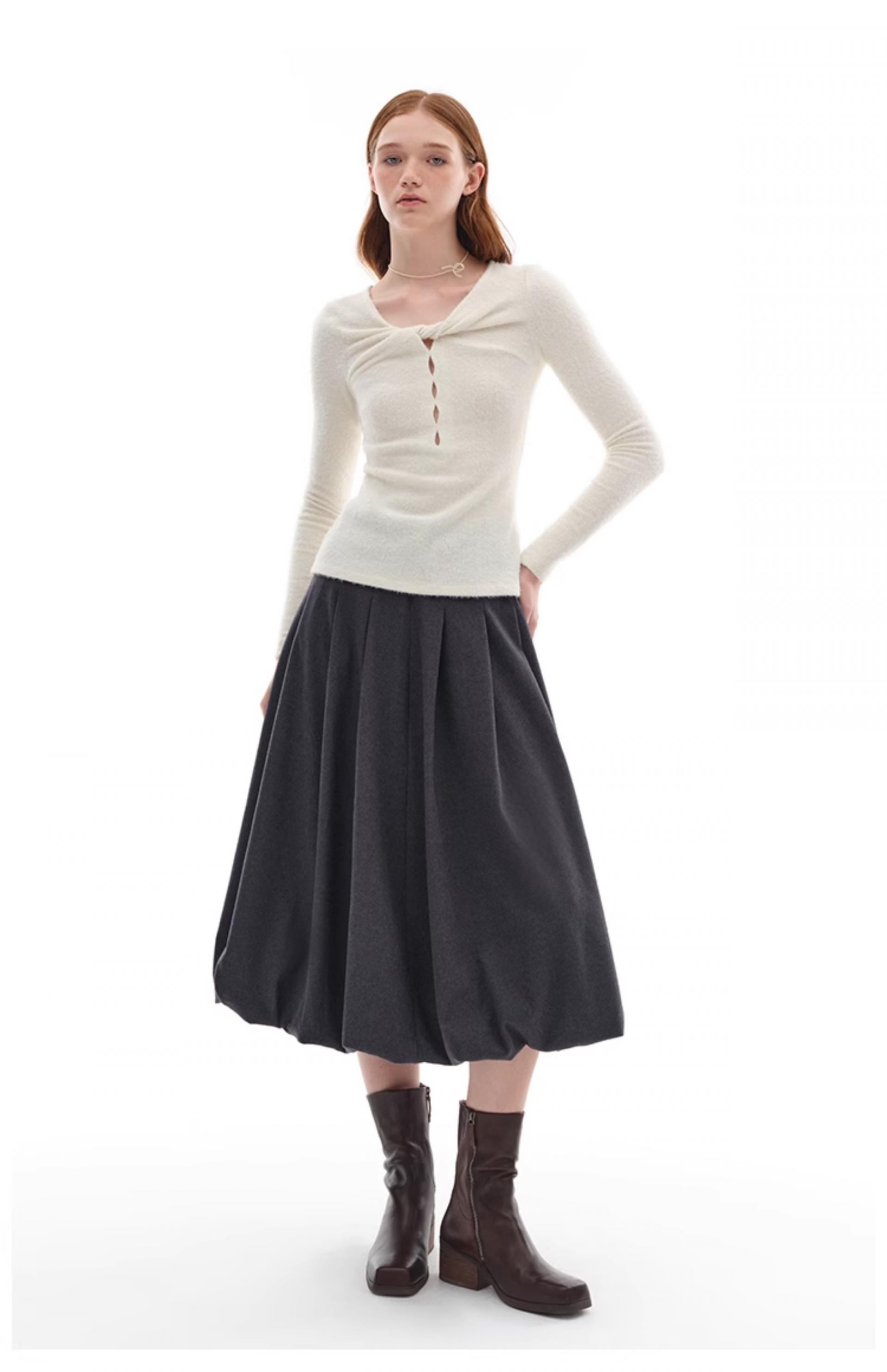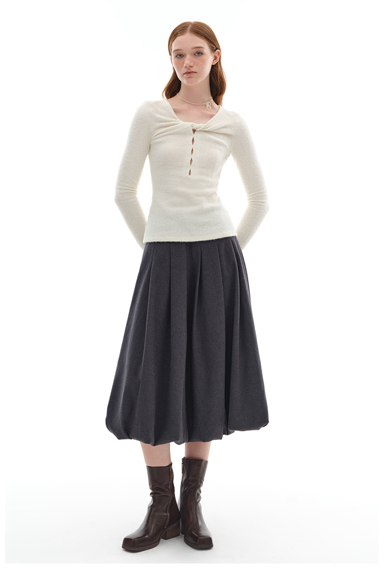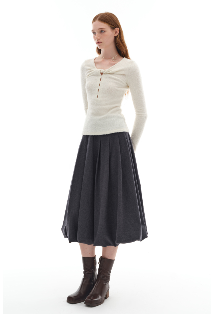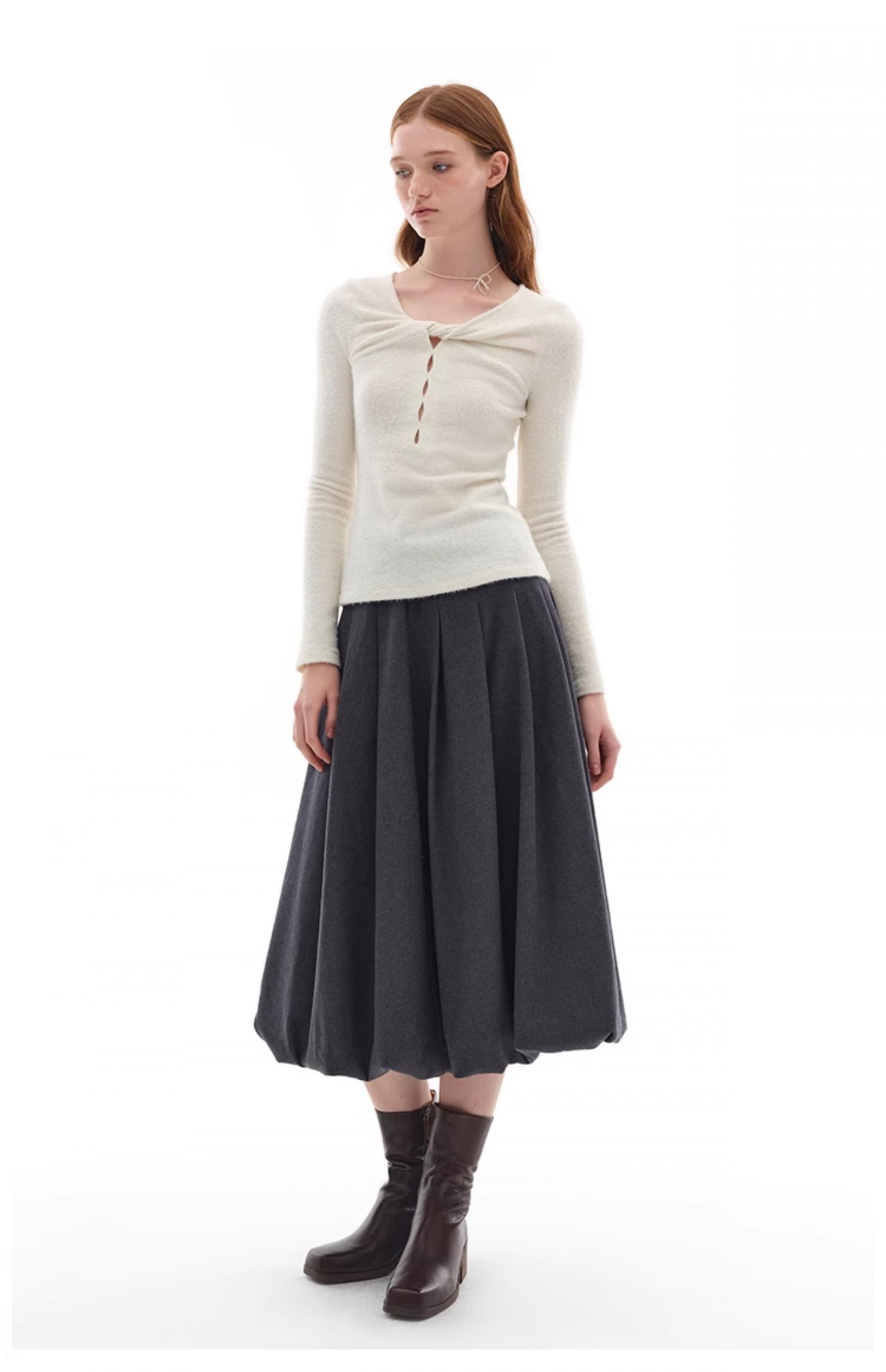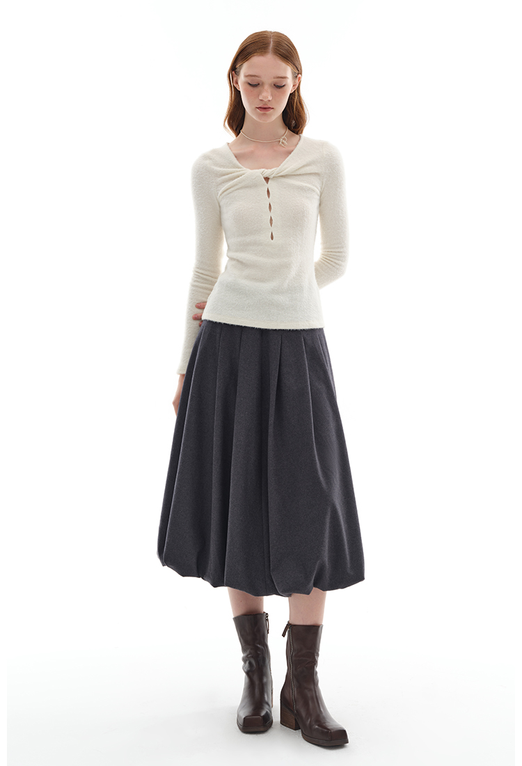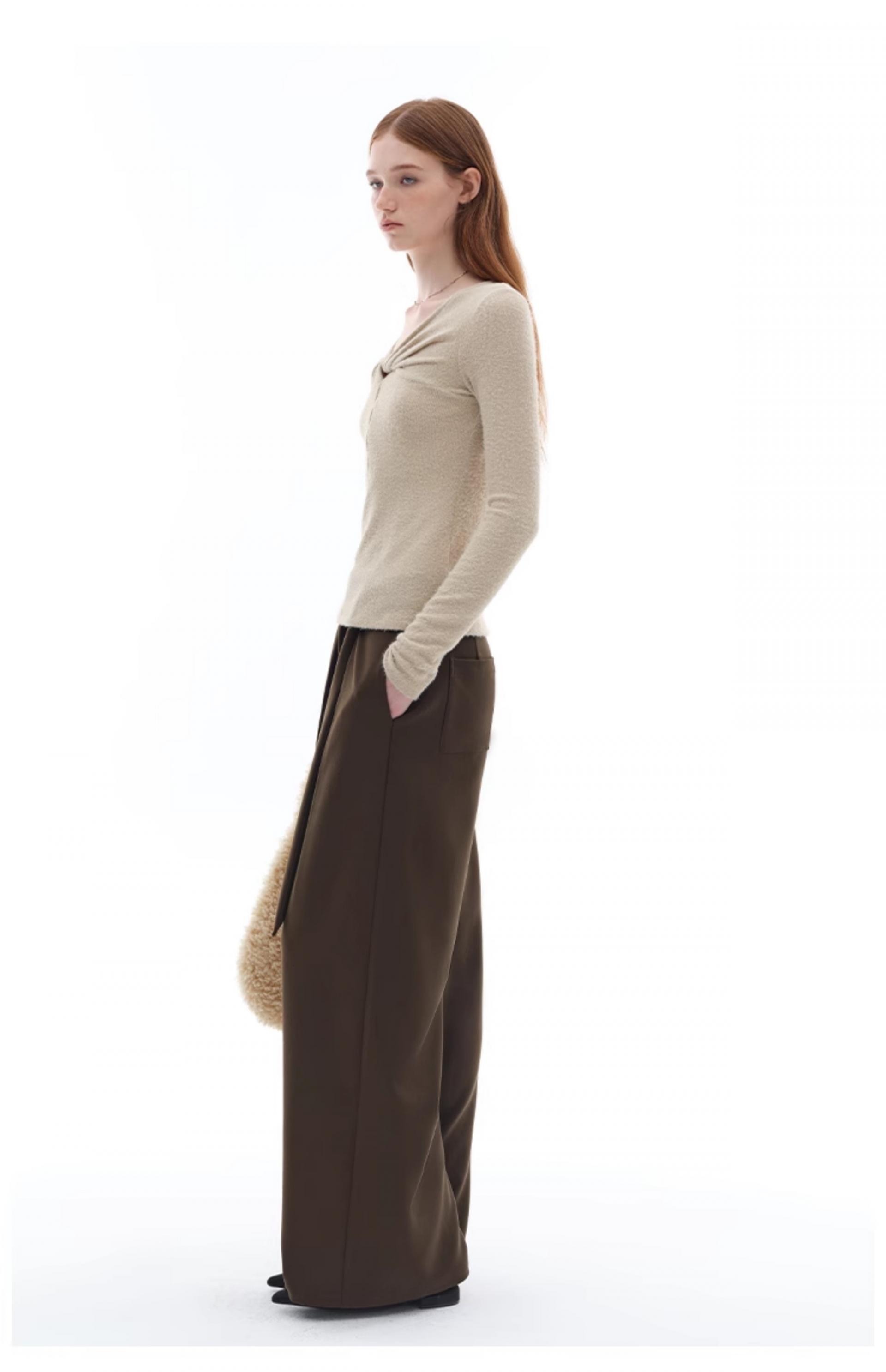 Waffle V-neck knot lace elastic slimming knitted long-sleeve T-shirt