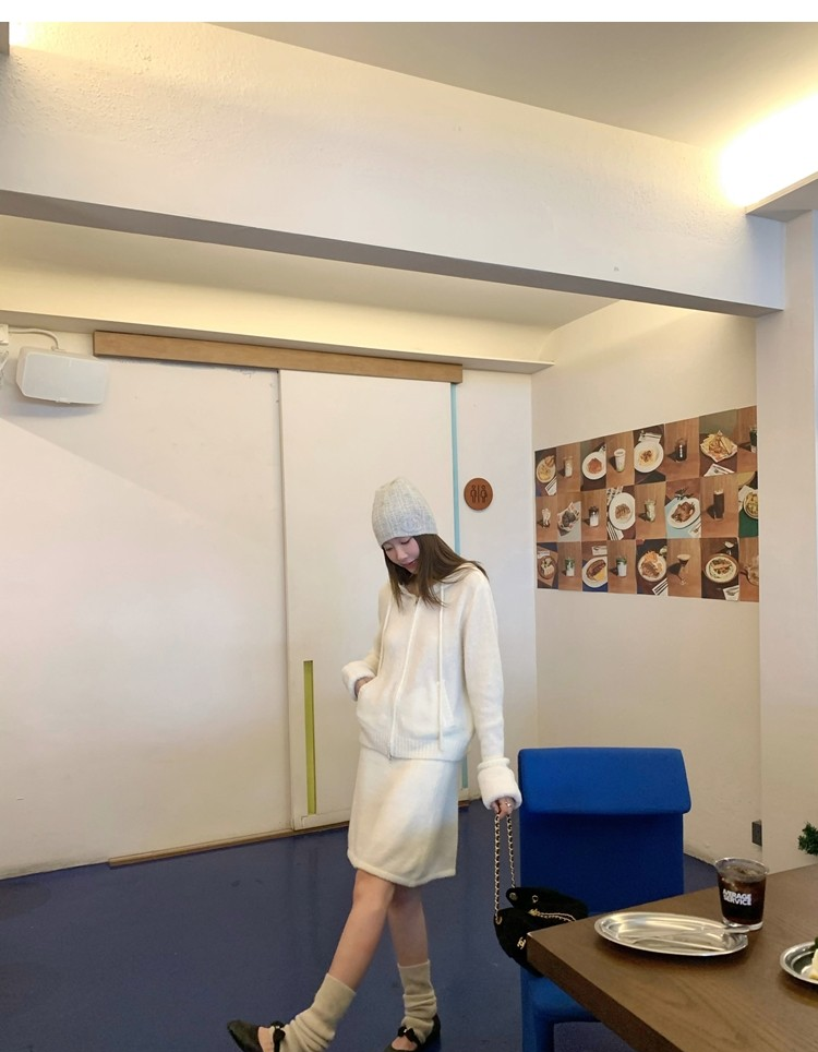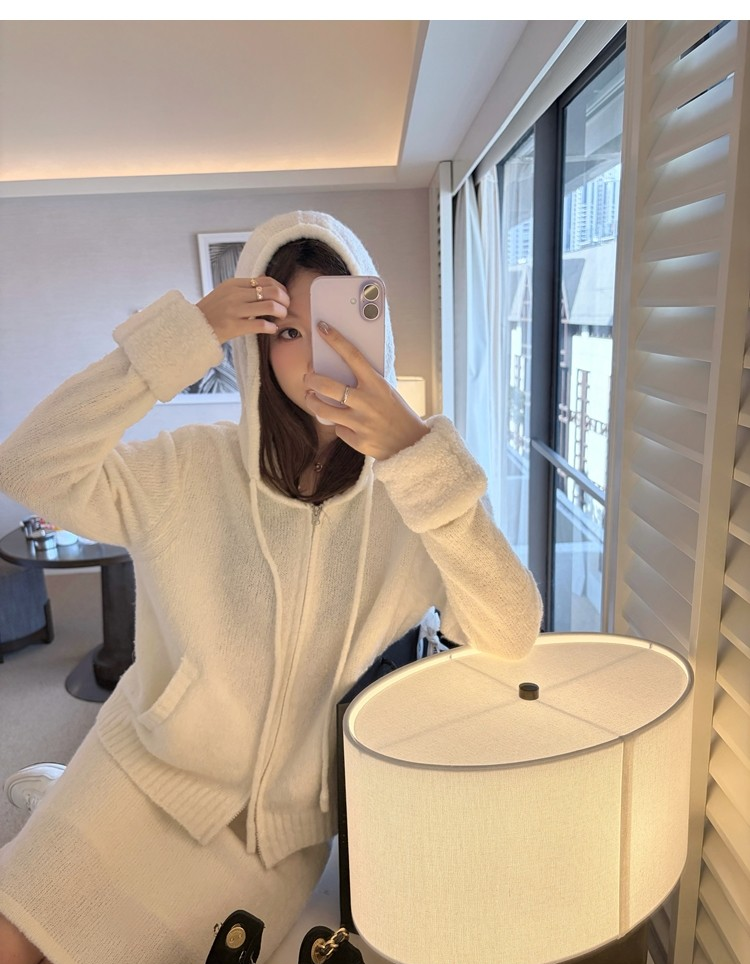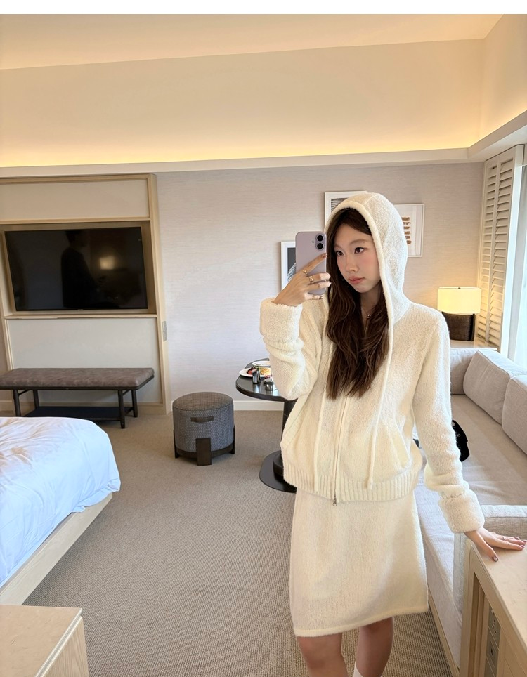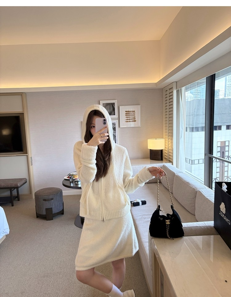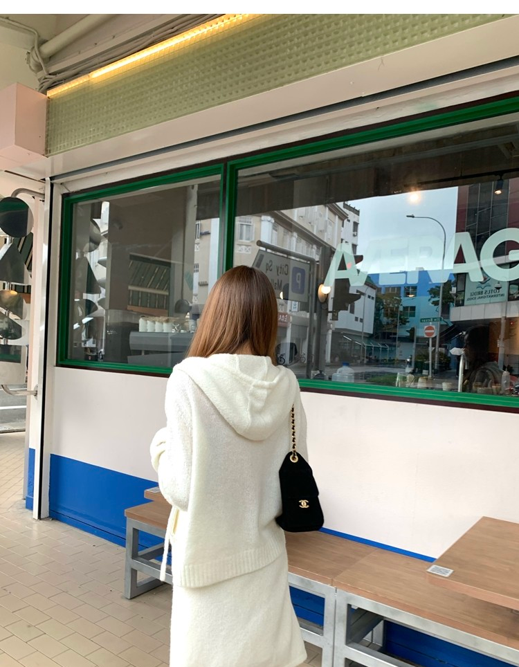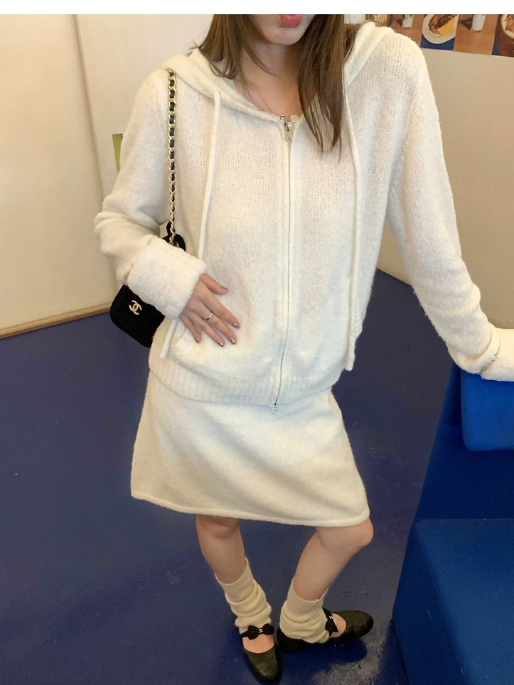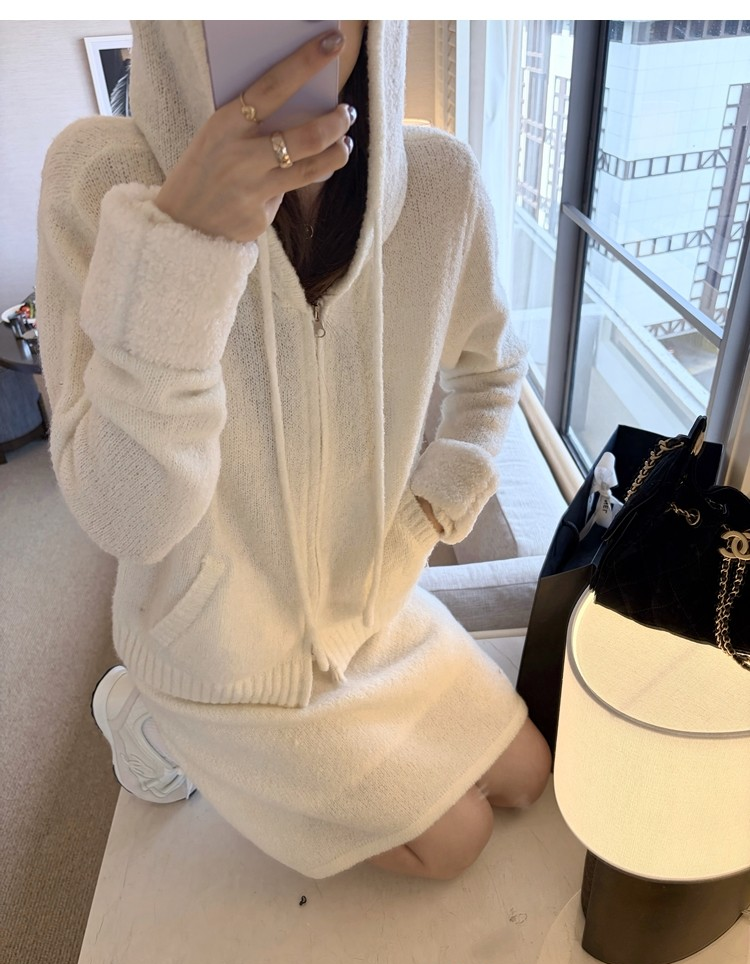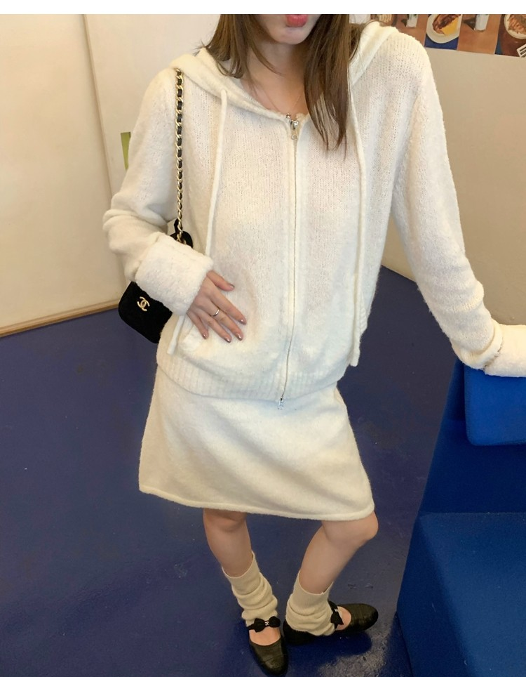 Sweet Texture Wool Hooded Removable Loop Sleeve Cardigan A-Shaped Skirt Set