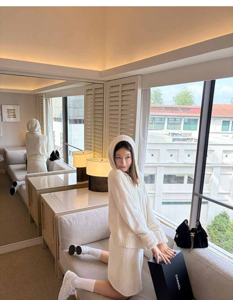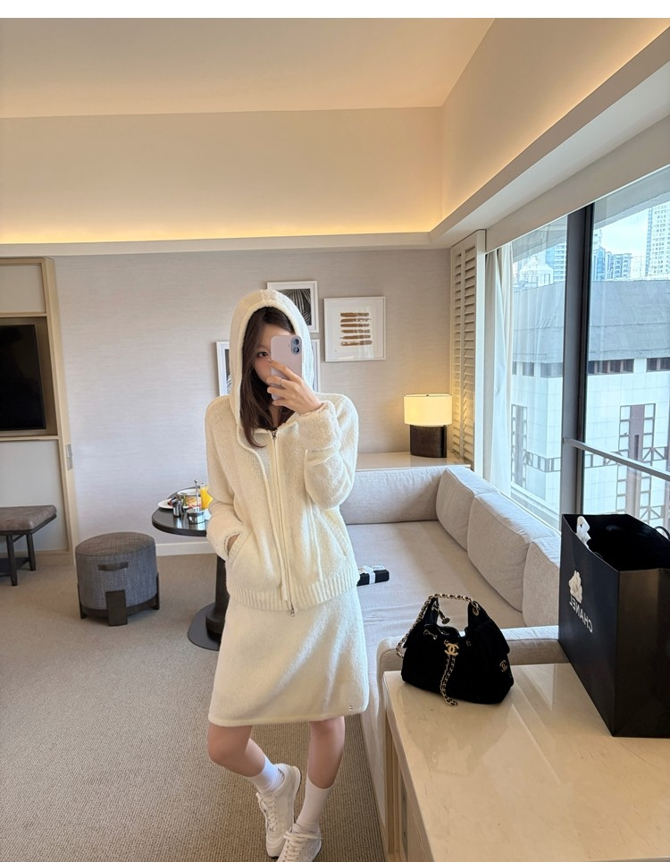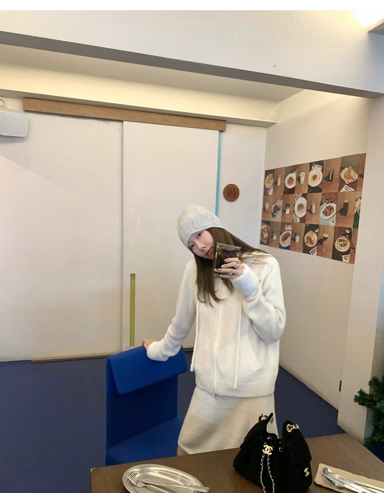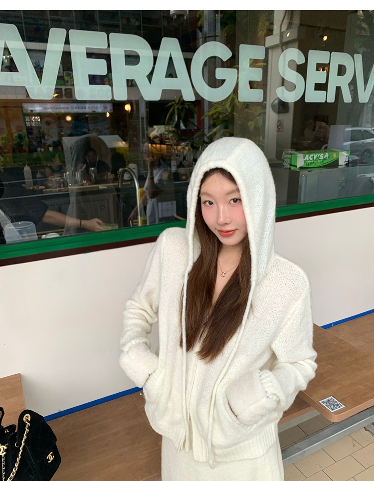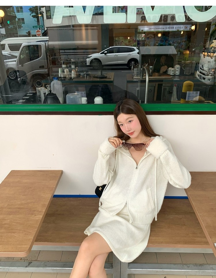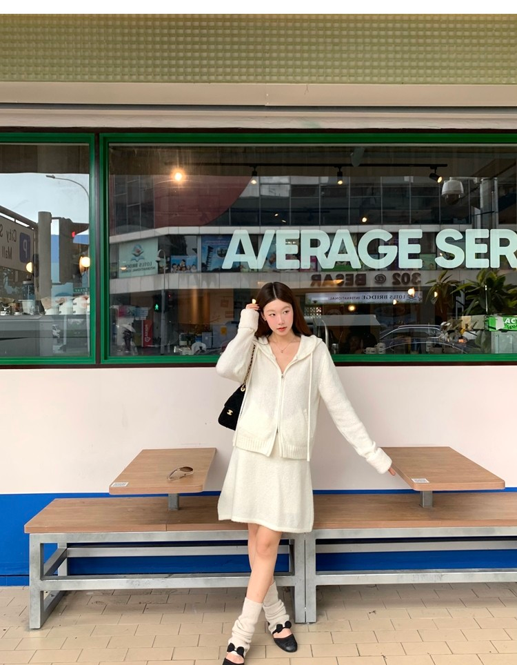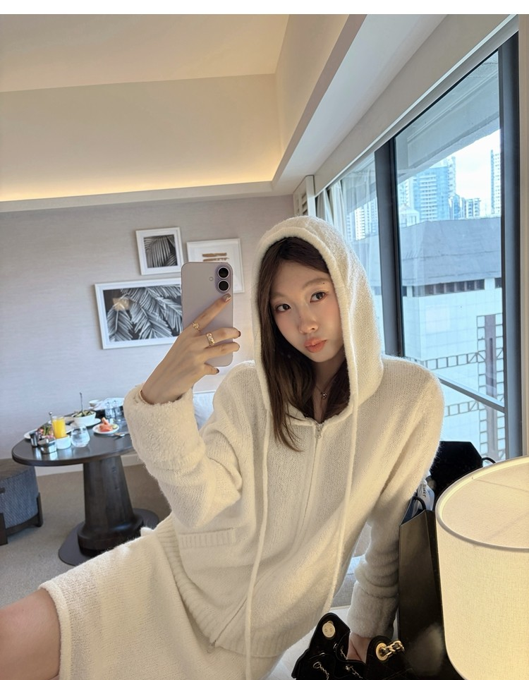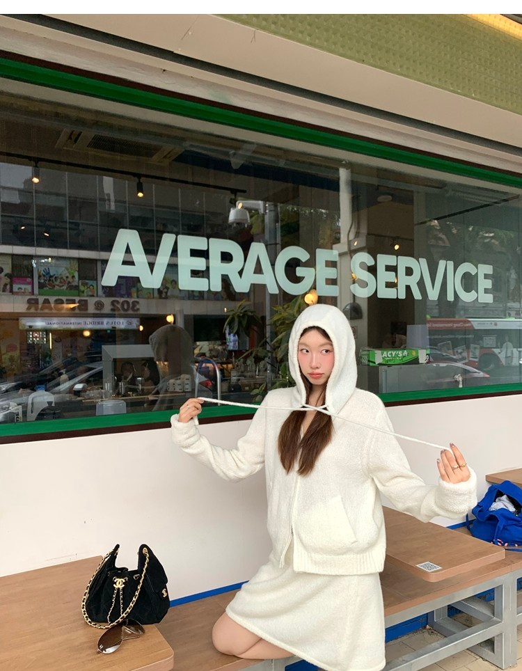 Sweet Texture Wool Hooded Removable Loop Sleeve Cardigan A-Shaped Skirt Set