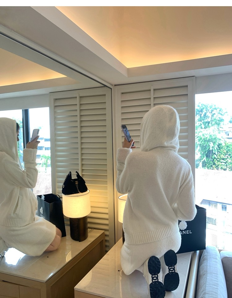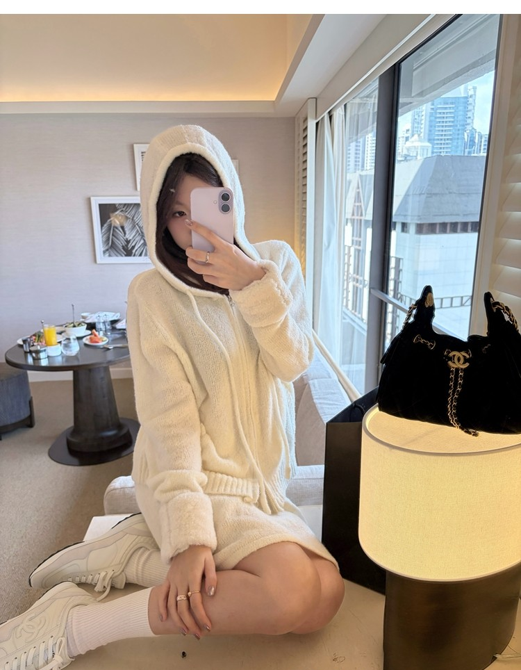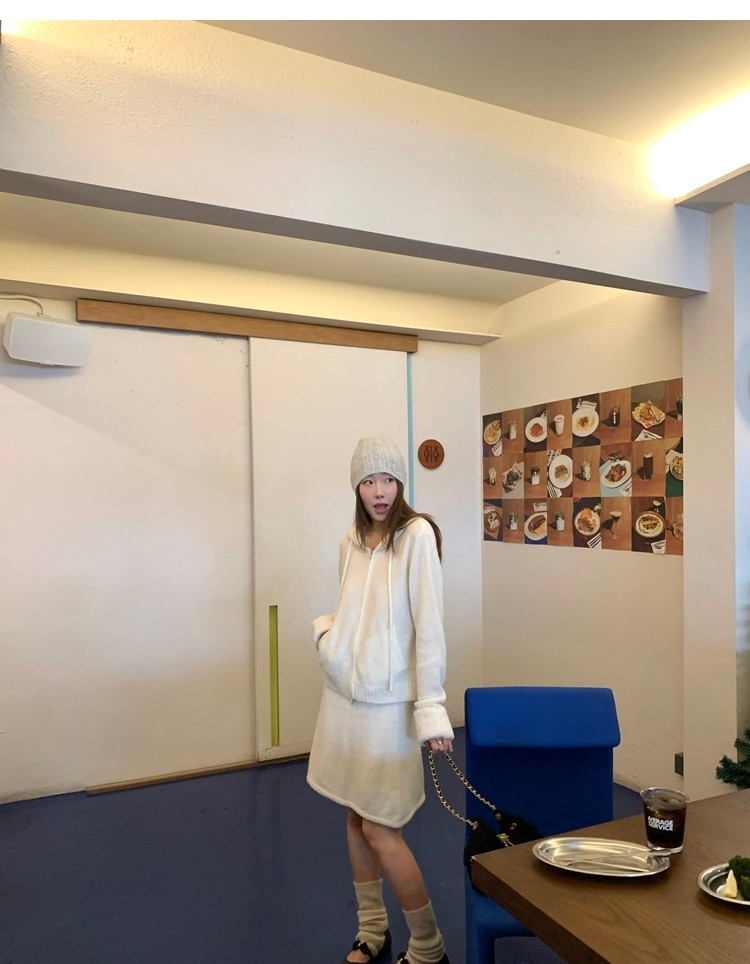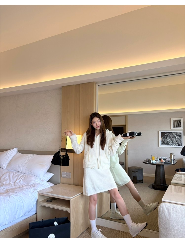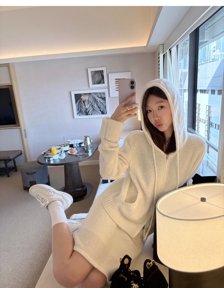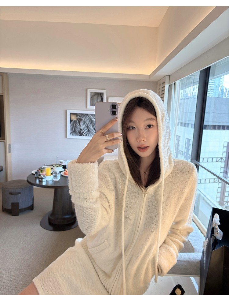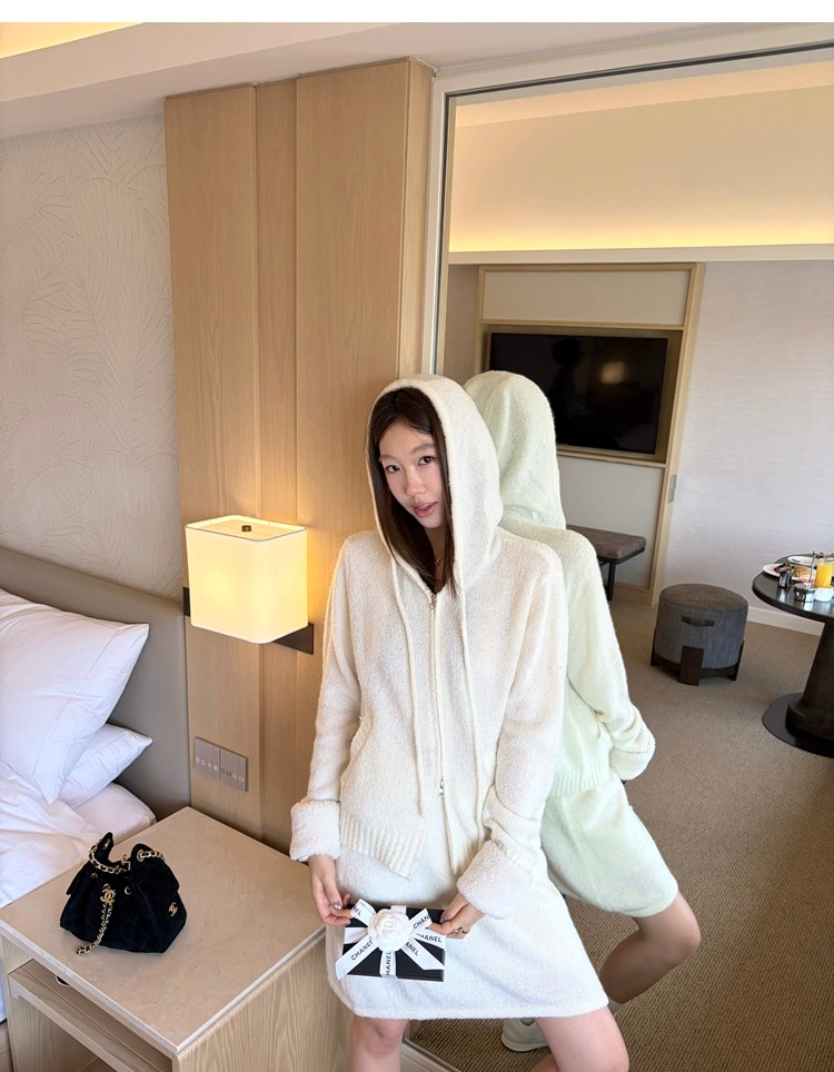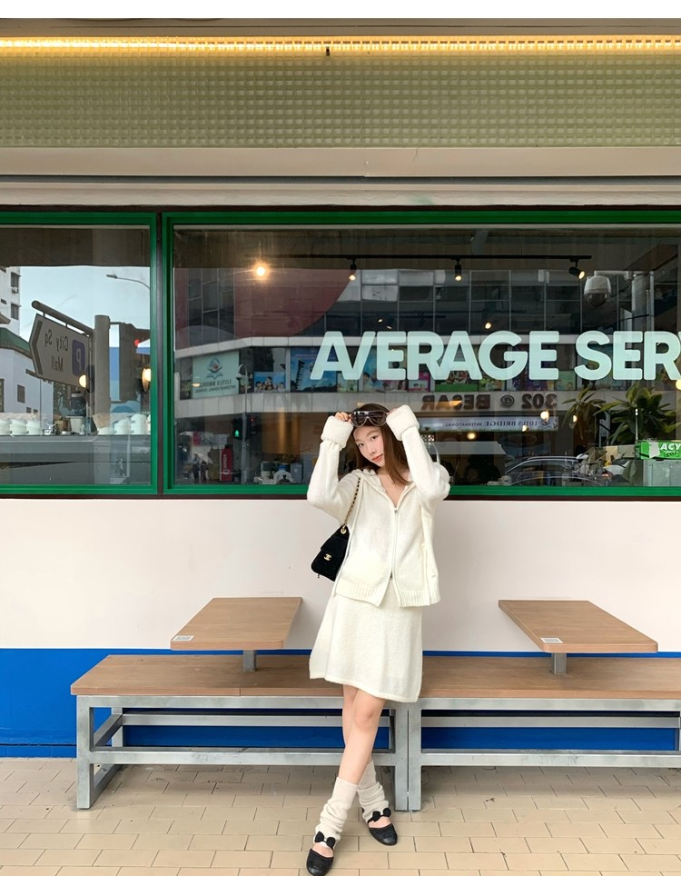 Sweet Texture Wool Hooded Removable Loop Sleeve Cardigan A-Shaped Skirt Set