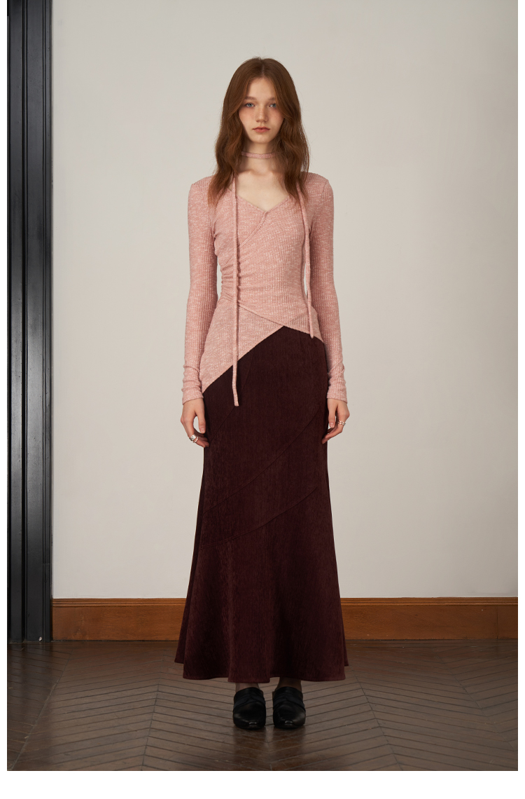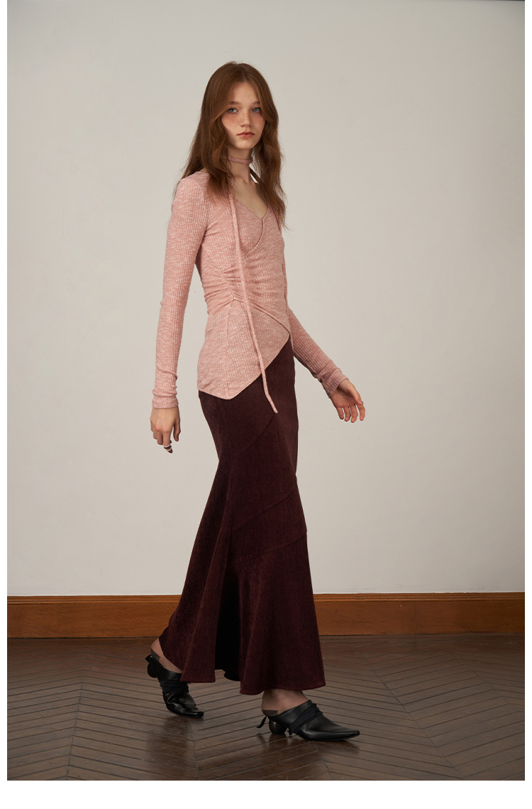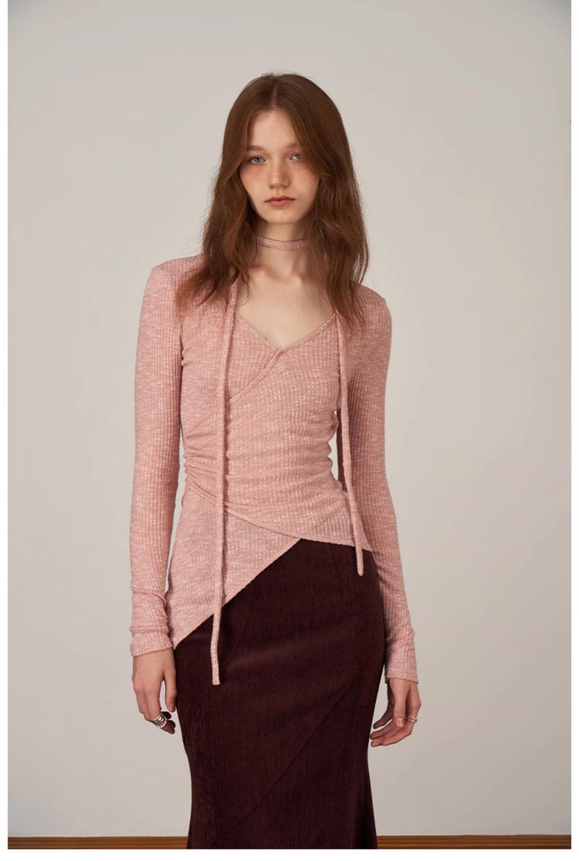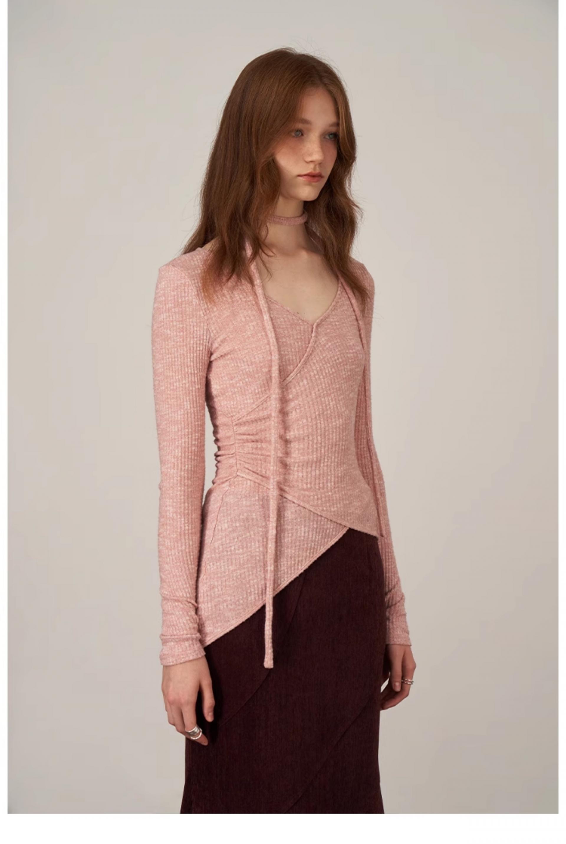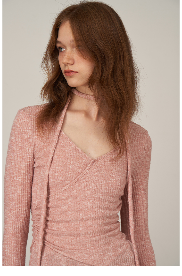 Wool yarn overlapping pleated ribbon peach pink knitted top