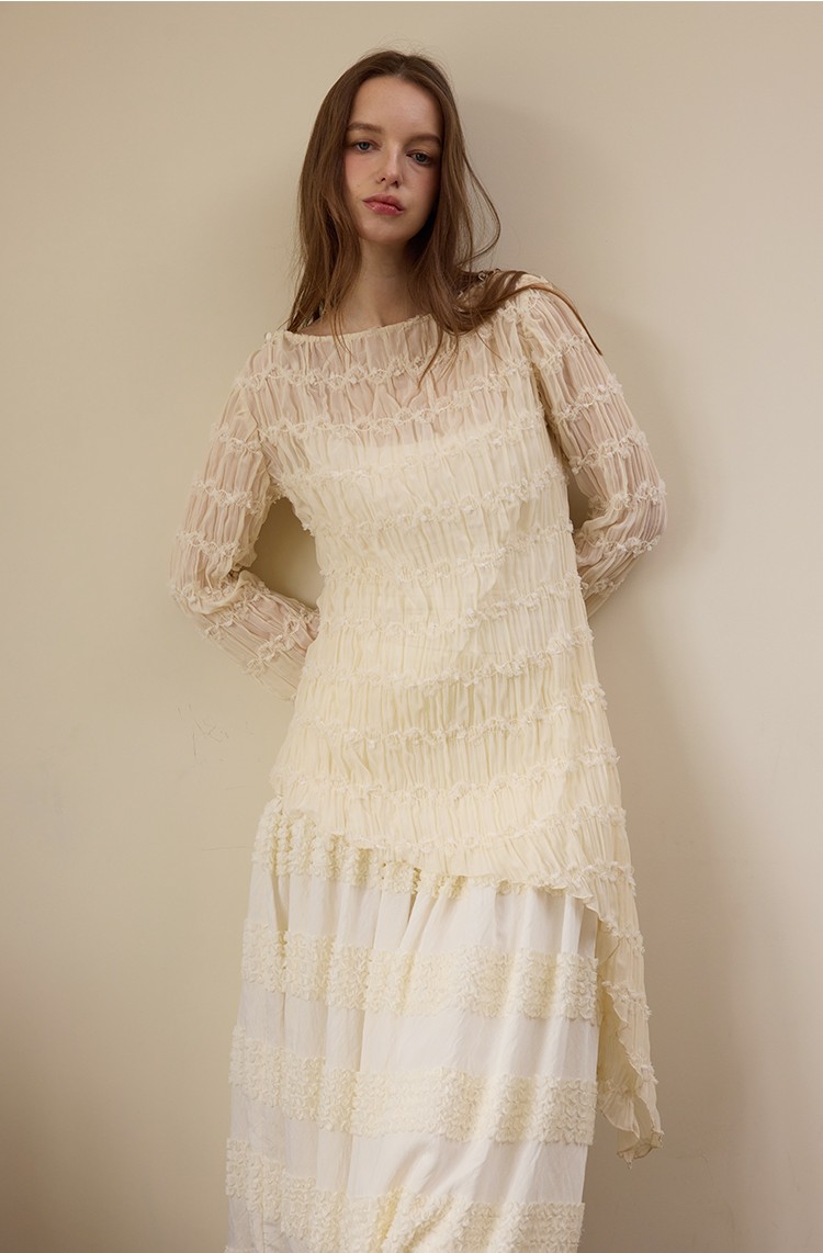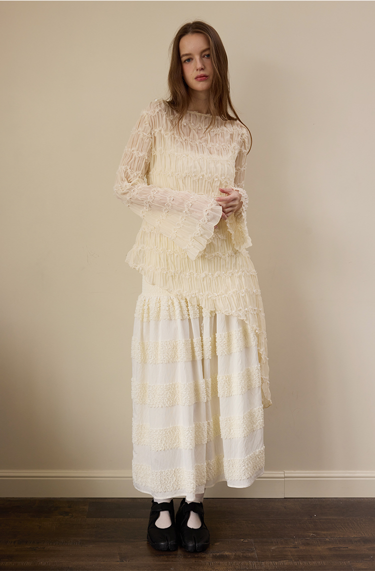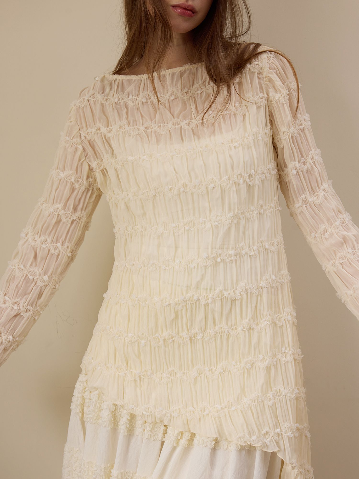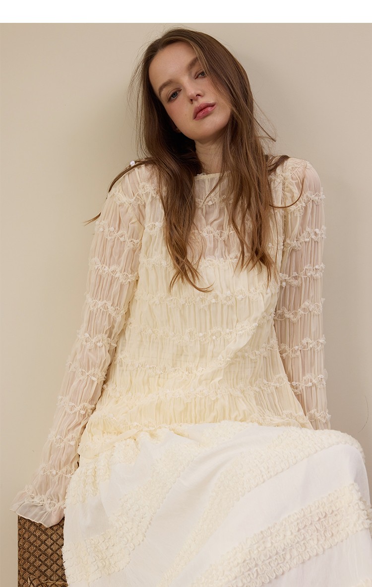 Beige wrinkled texture elastic long-sleeved T-shirt