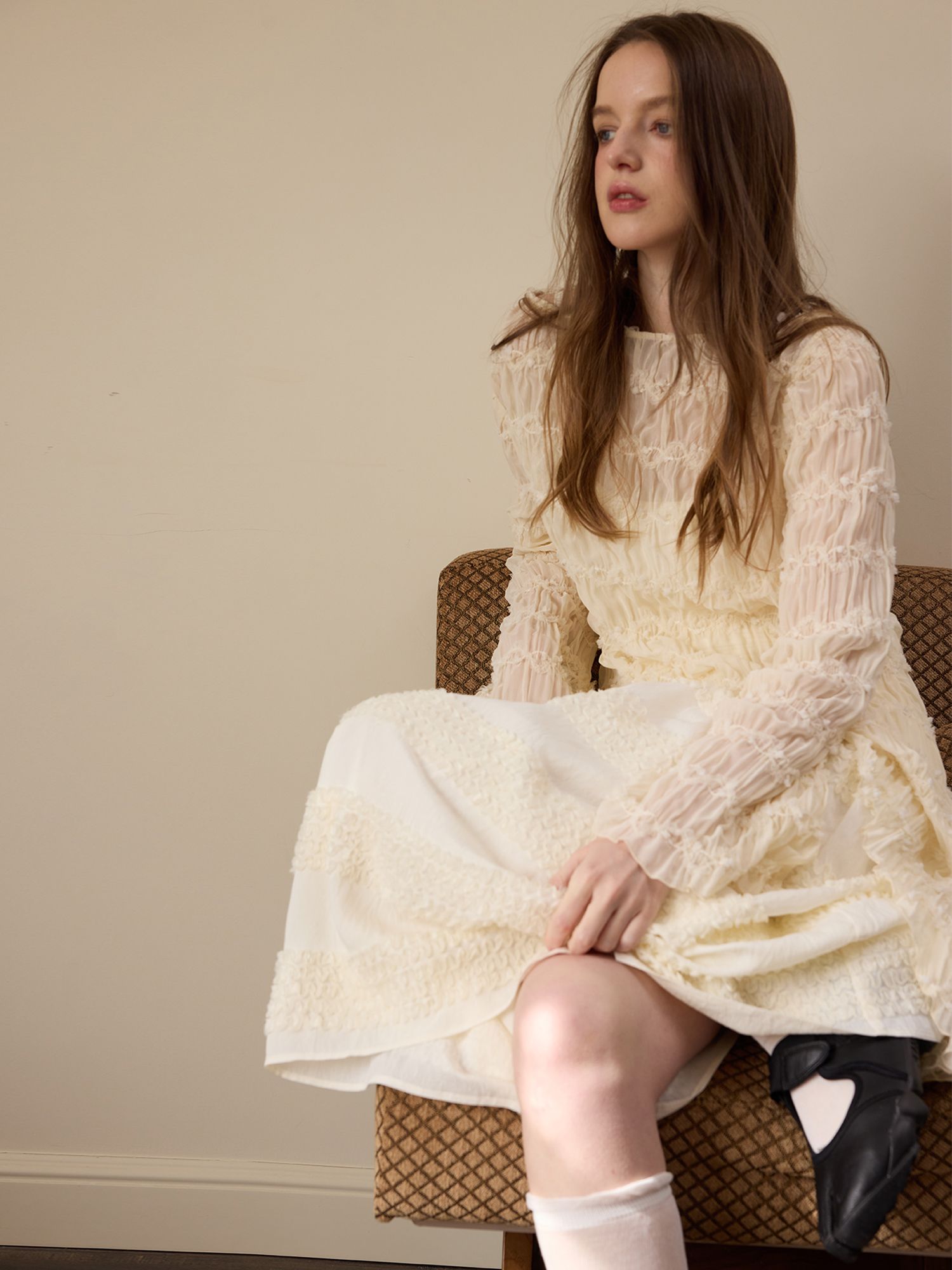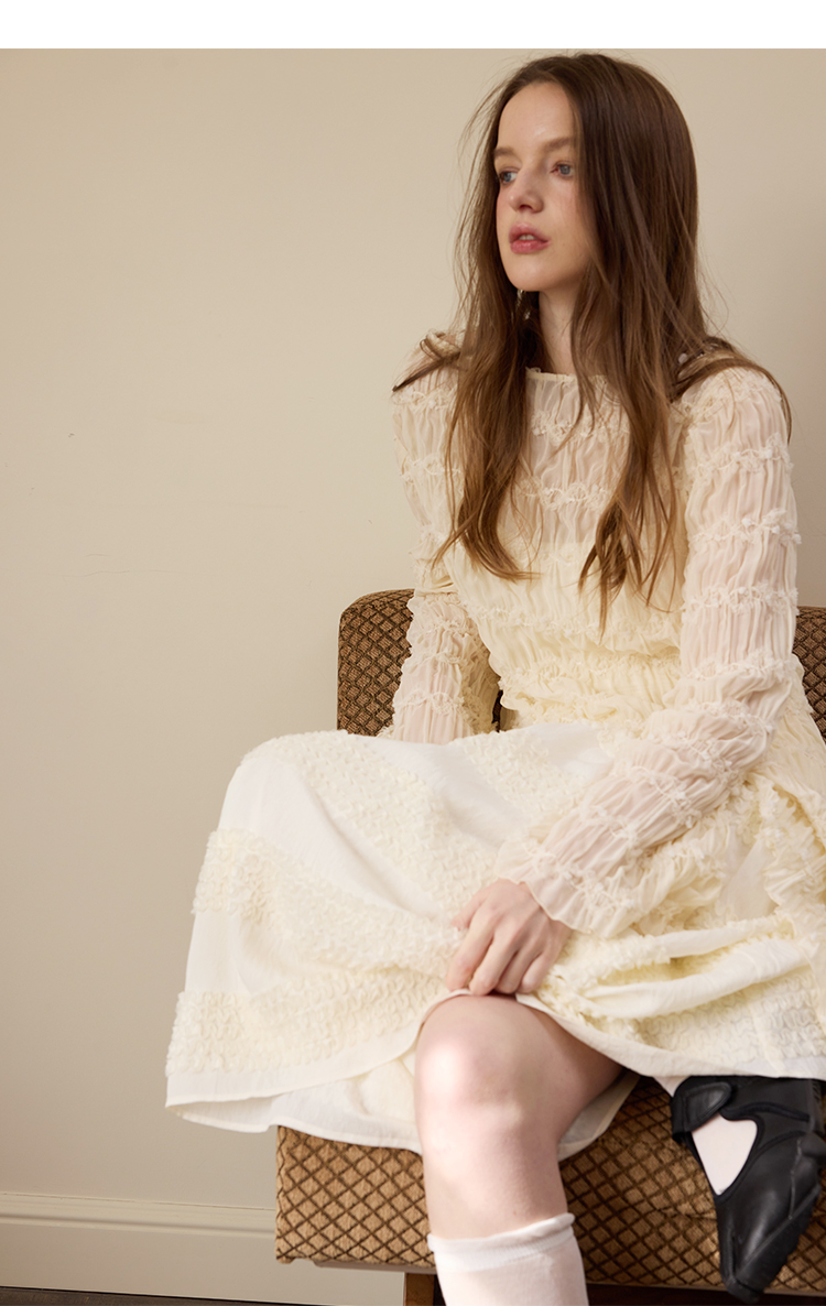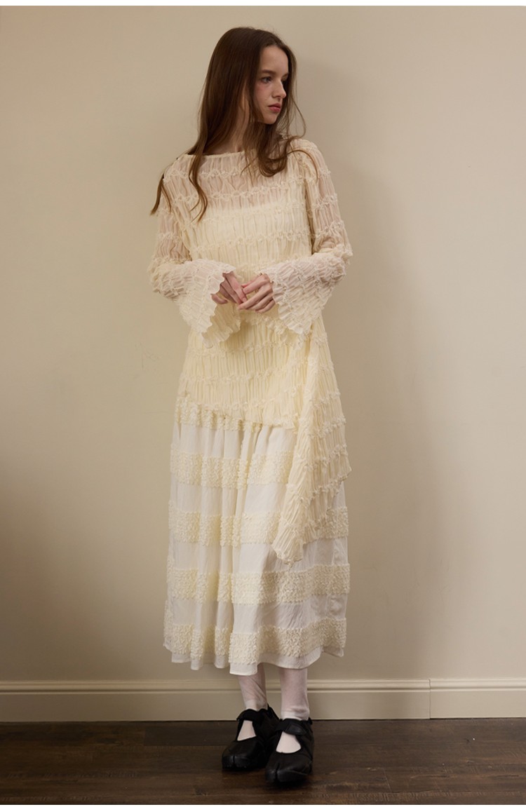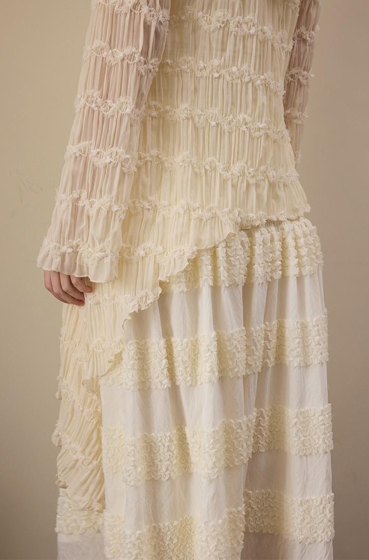 Beige wrinkled texture elastic long-sleeved T-shirt