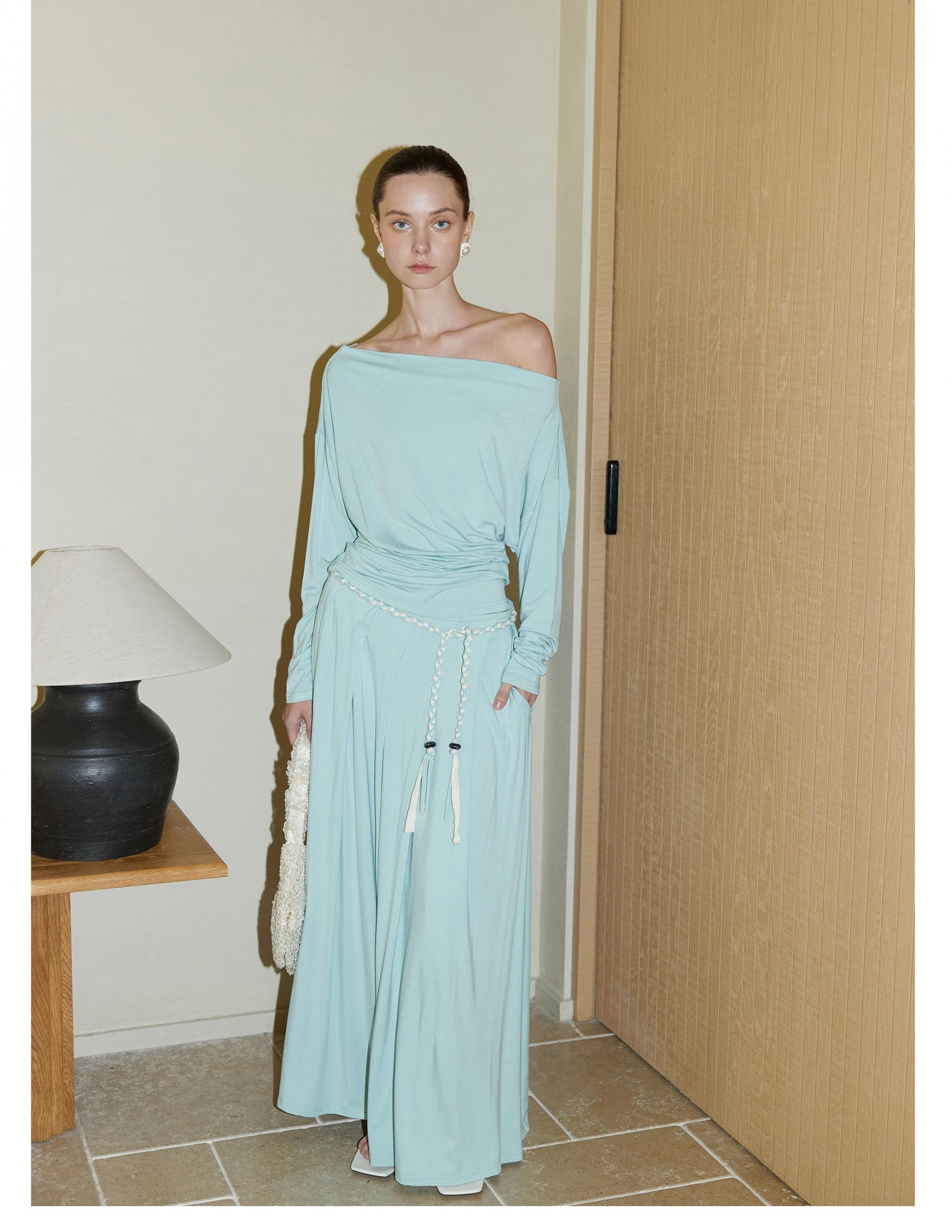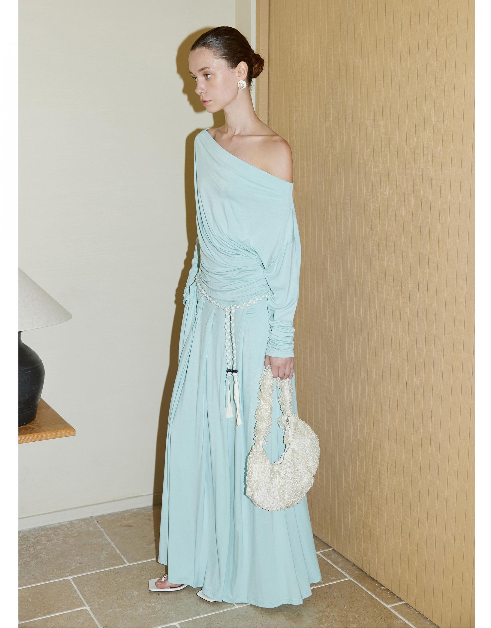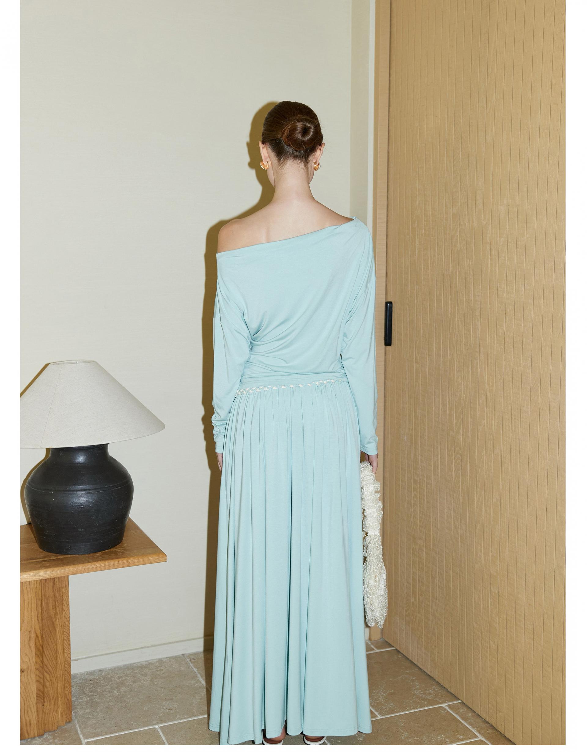 Oblique shoulder pleated knitted suit skirt two-piece
