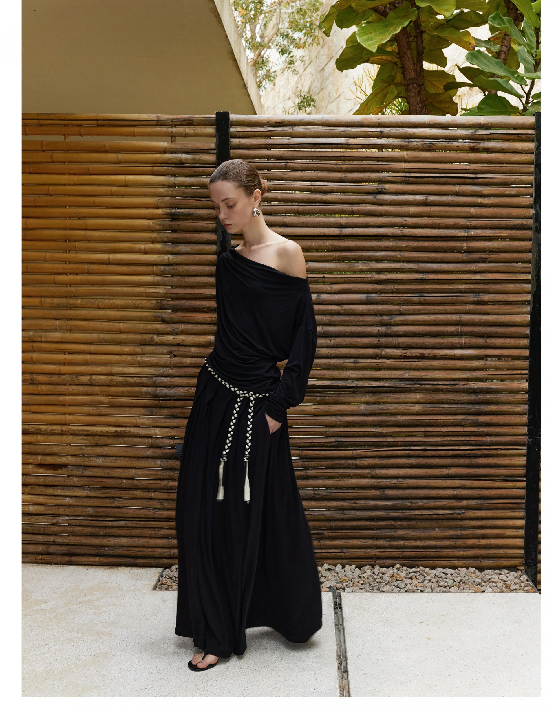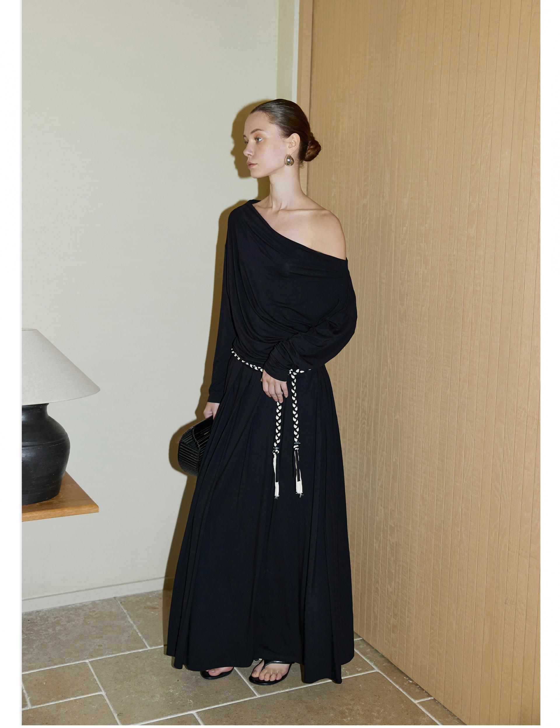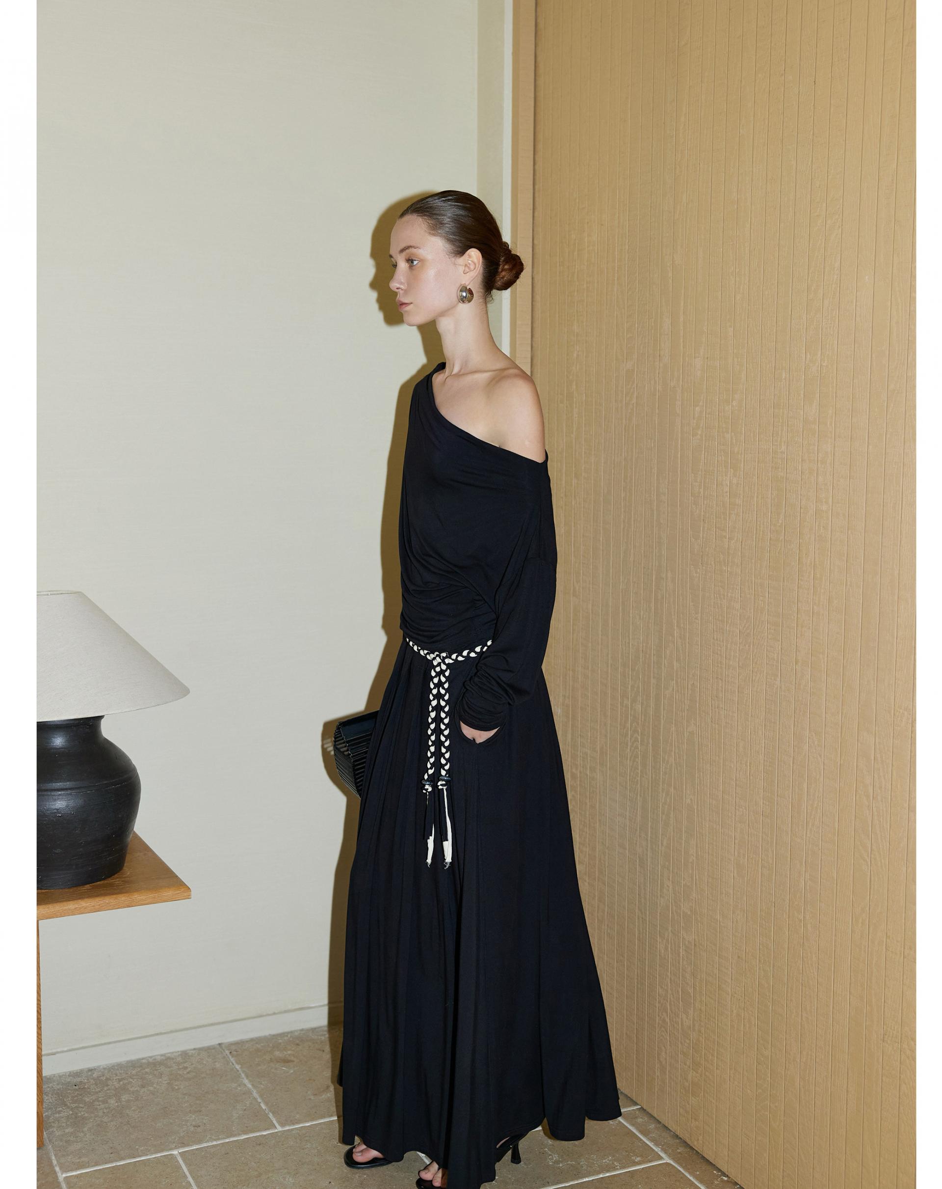 Oblique shoulder pleated knitted suit skirt two-piece
