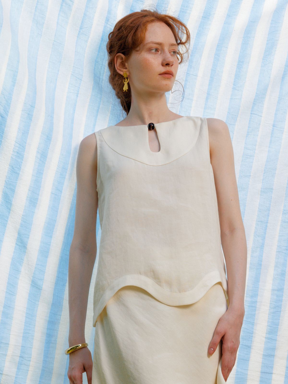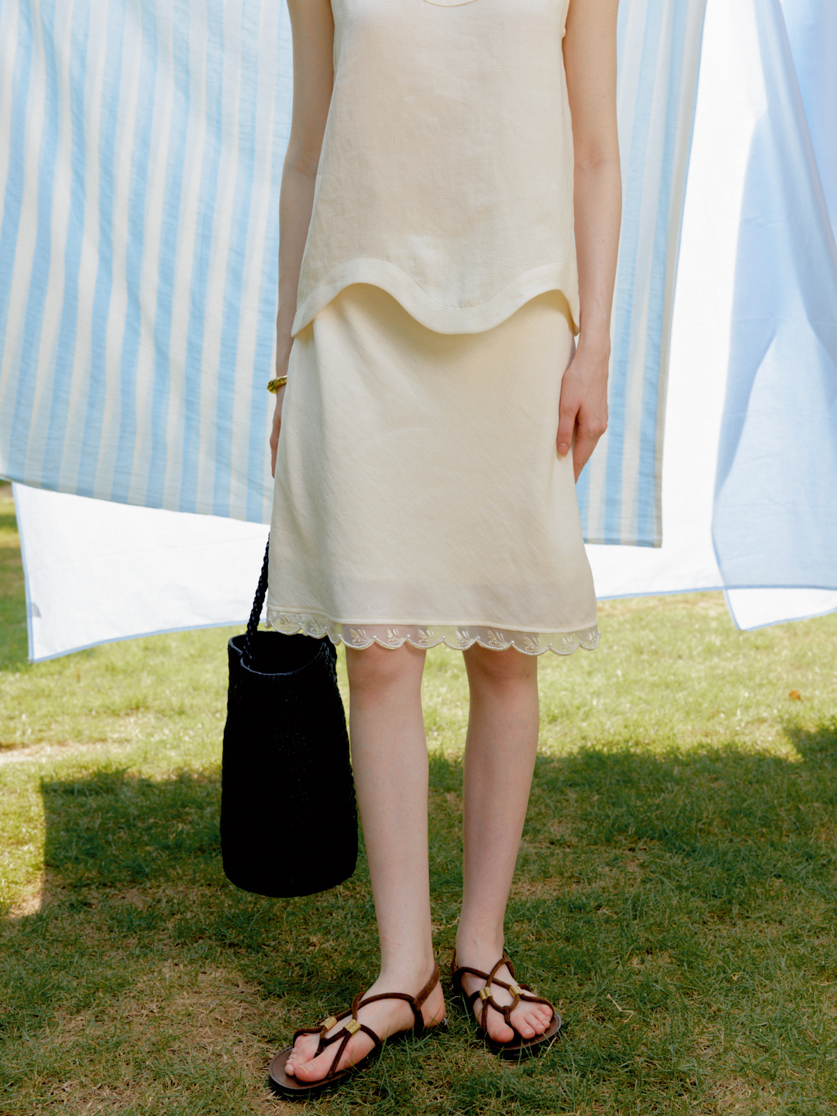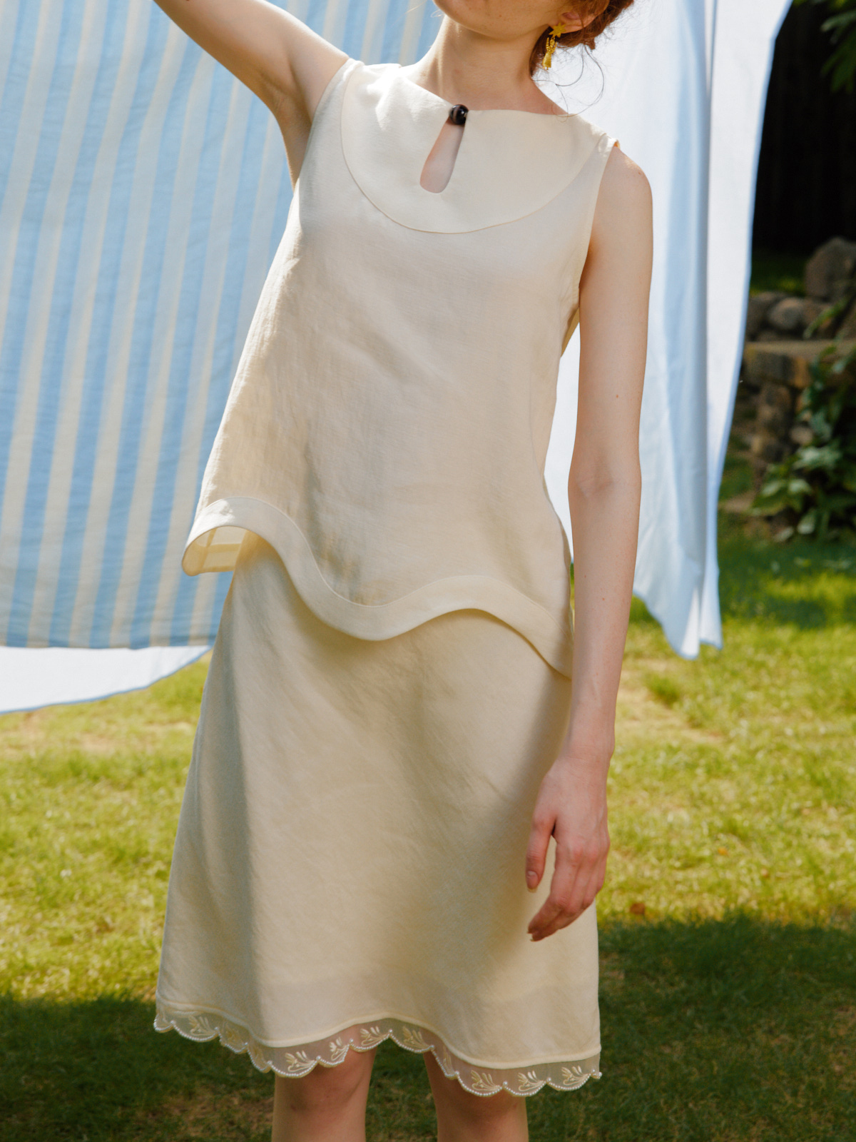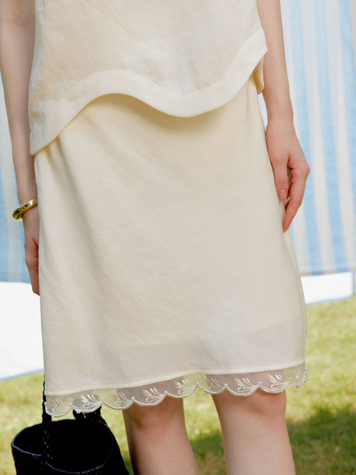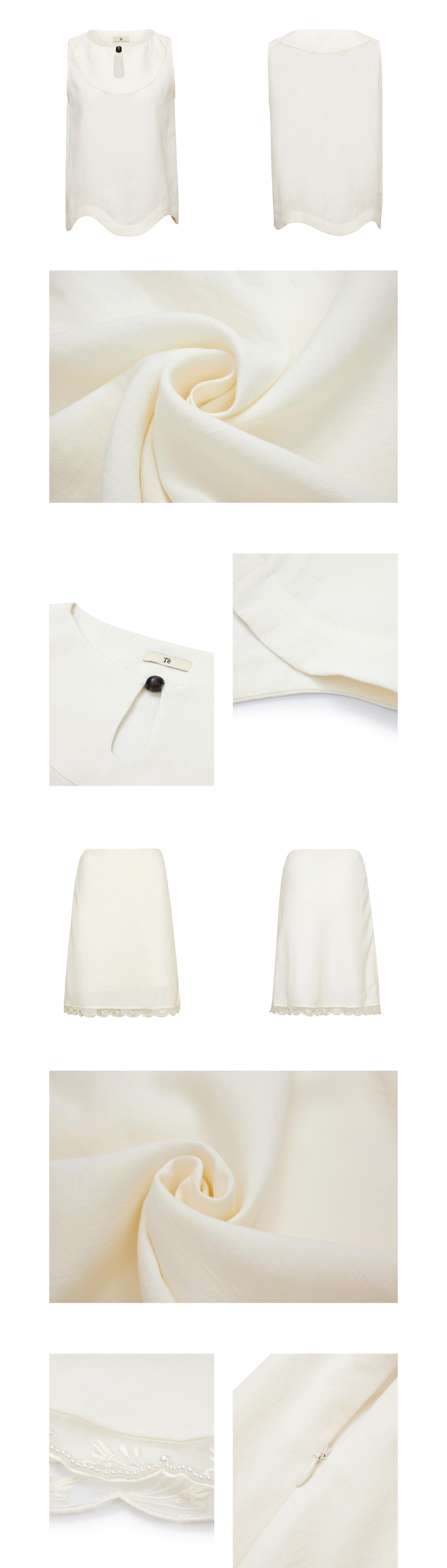 Silk Linen Wavy Edge Vest Top Pearl Embroidery Skirt Set