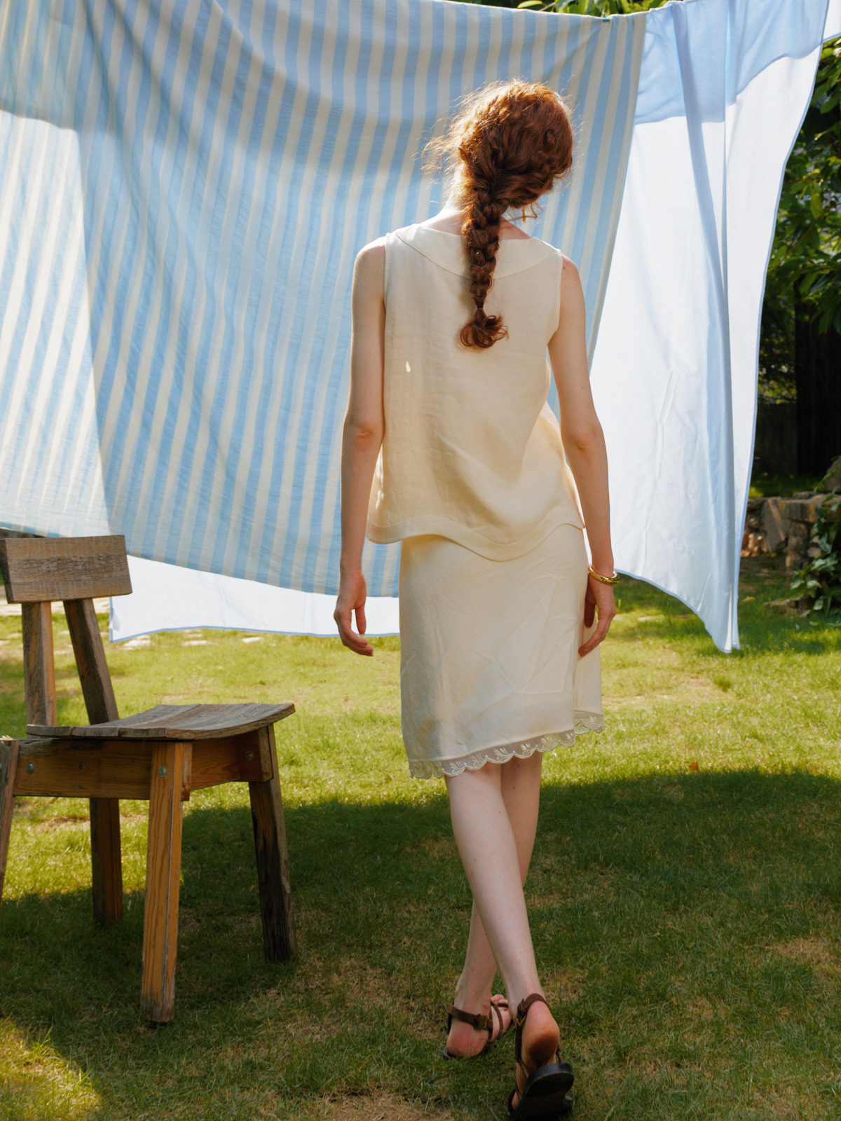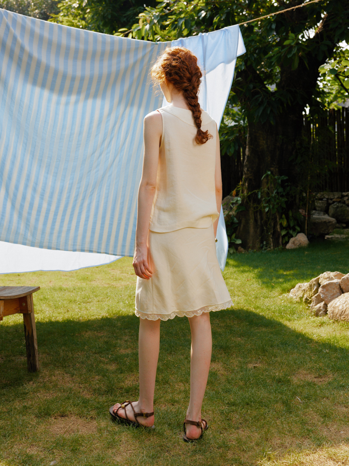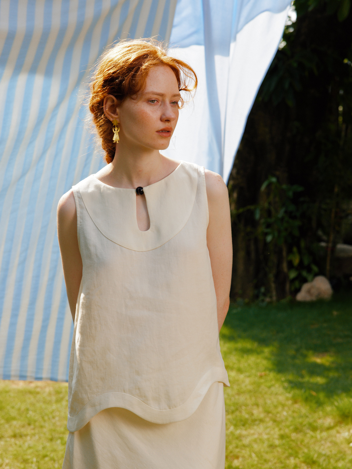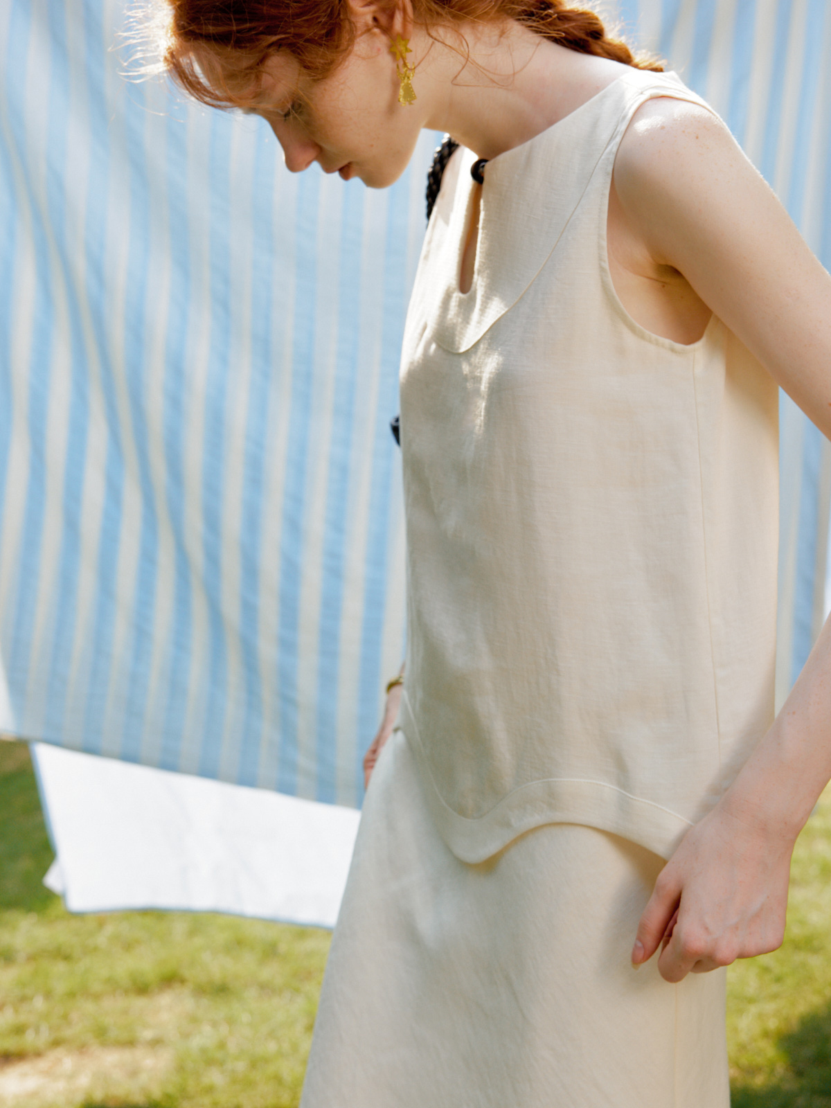 Silk Linen Wavy Edge Vest Top Pearl Embroidery Skirt Set