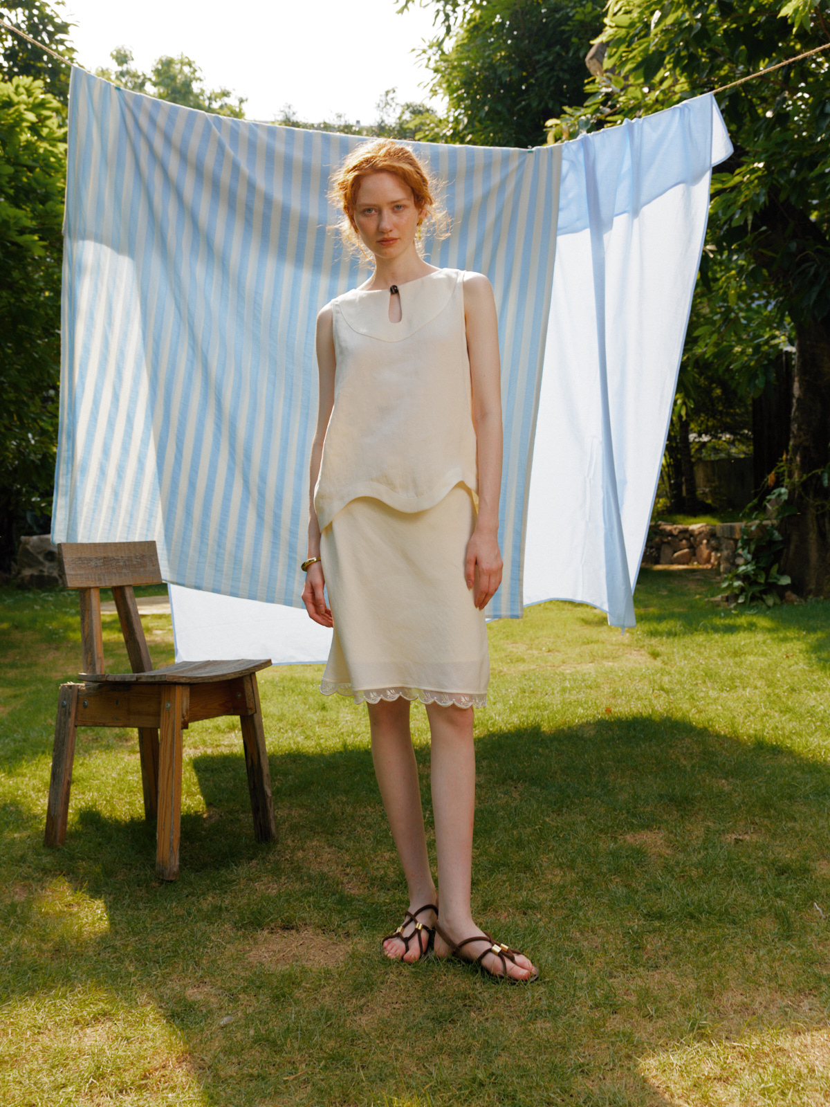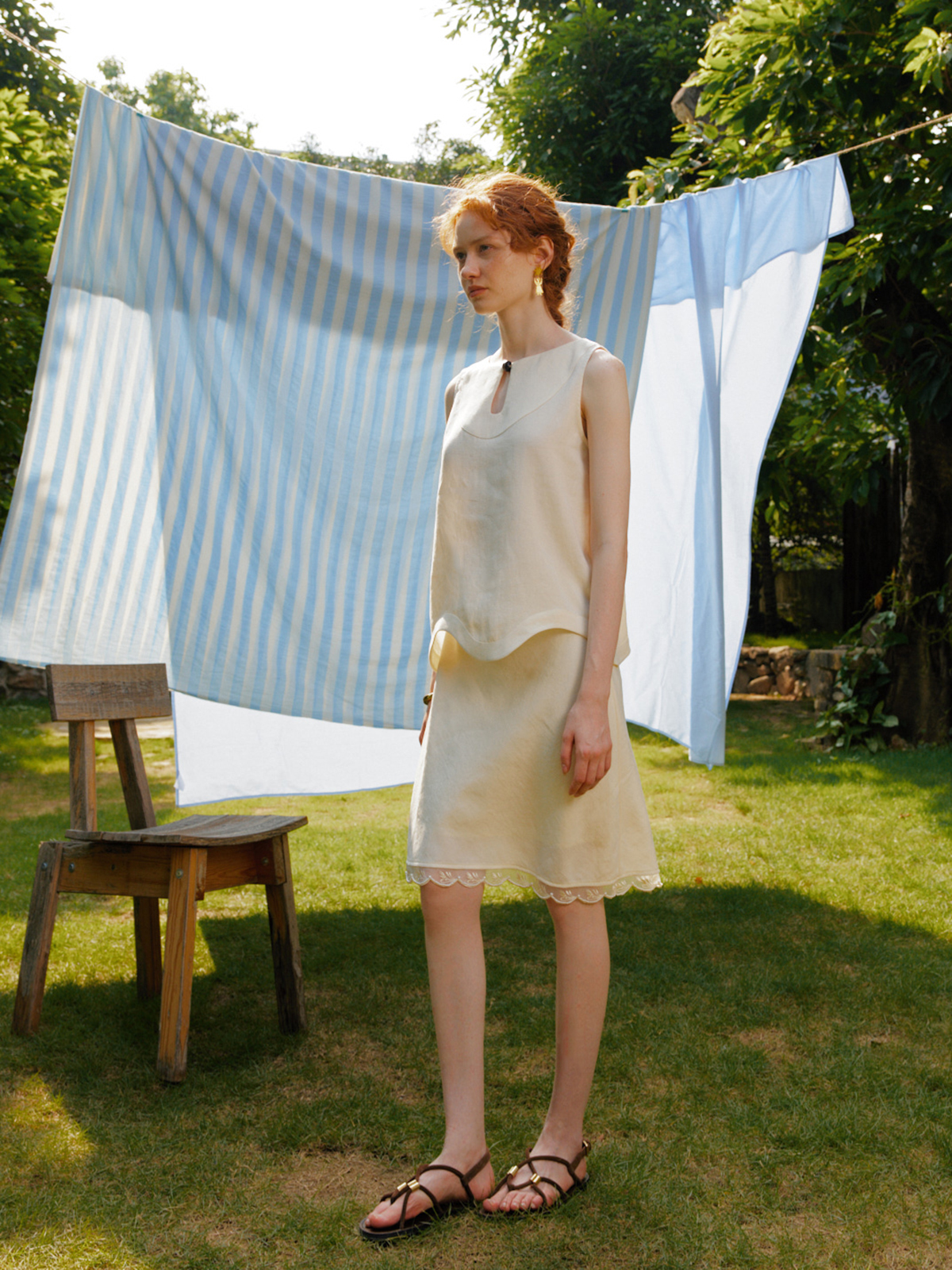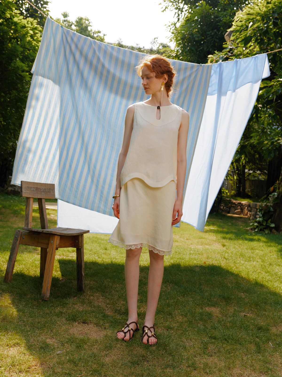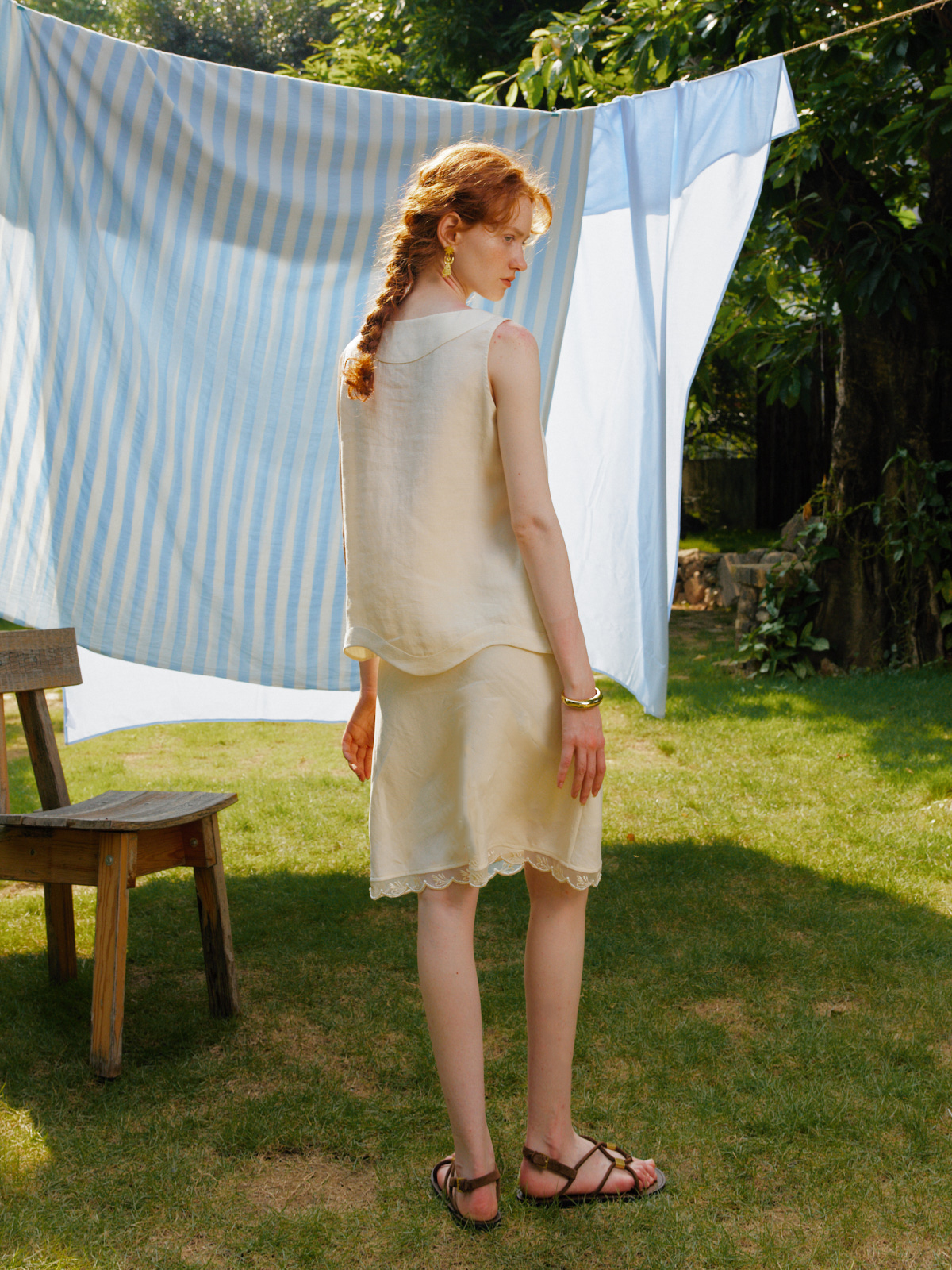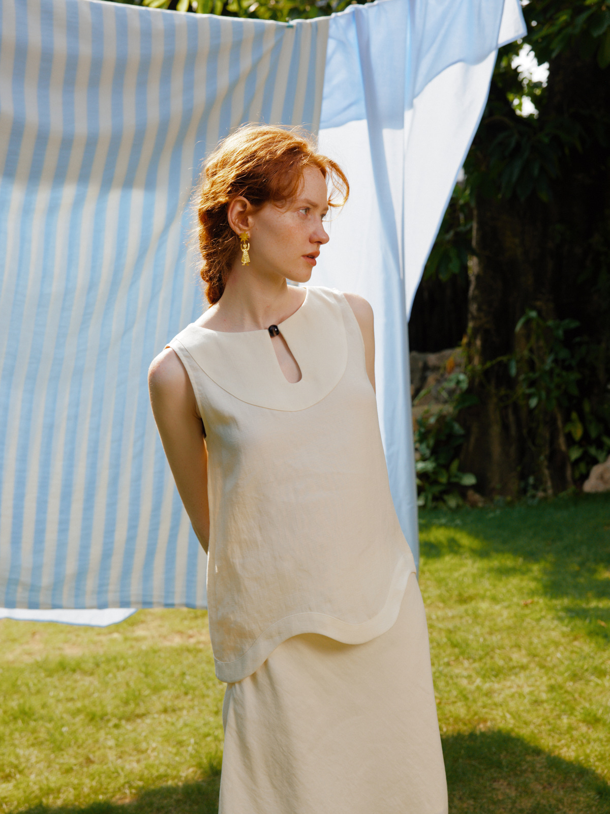 Silk Linen Wavy Edge Vest Top Pearl Embroidery Skirt Set