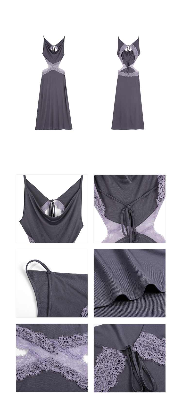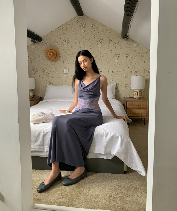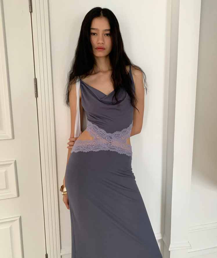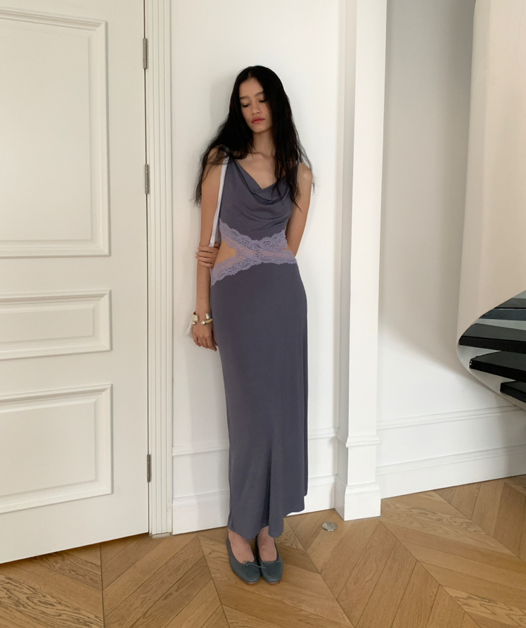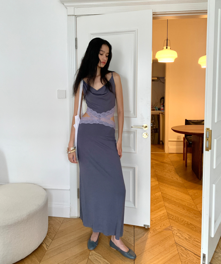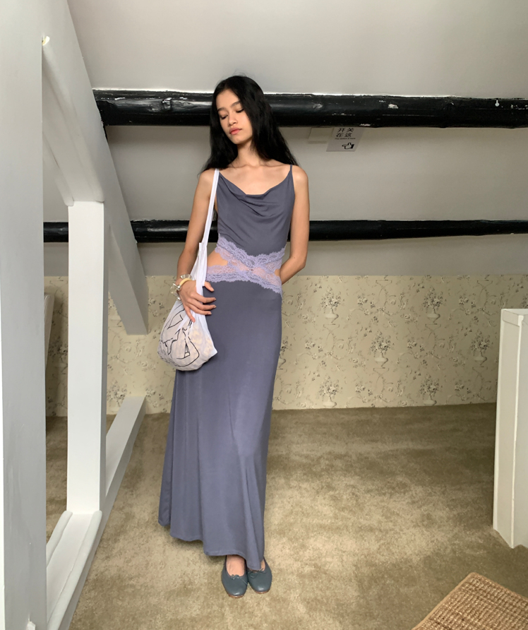 Waist hollow stitching lace French backless dress