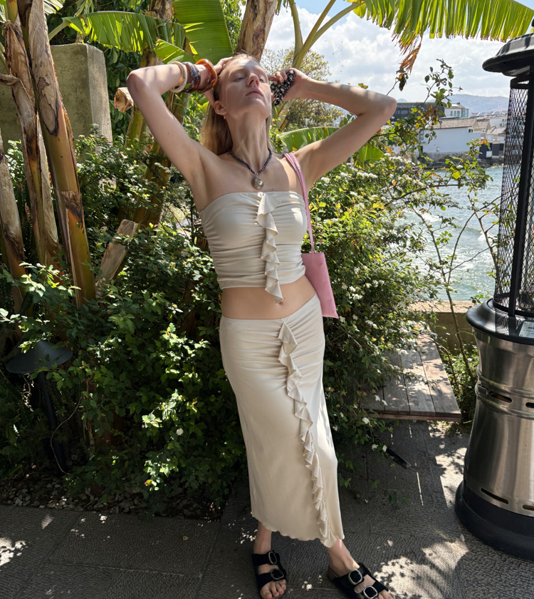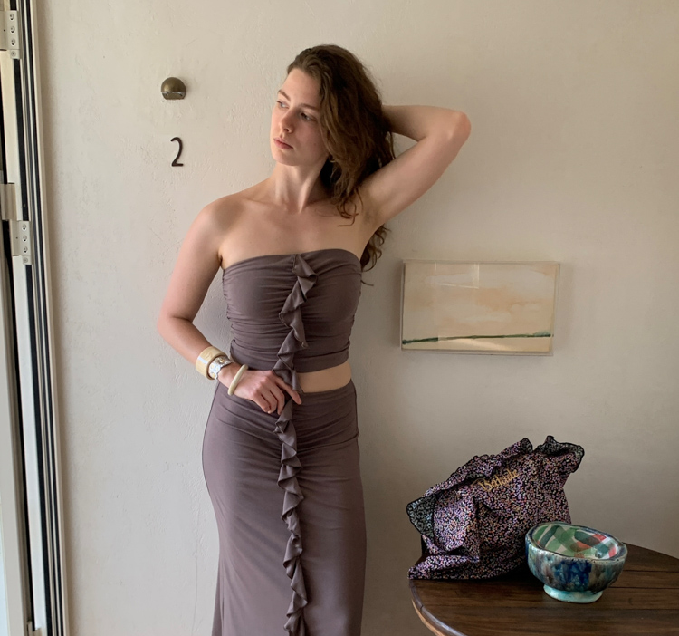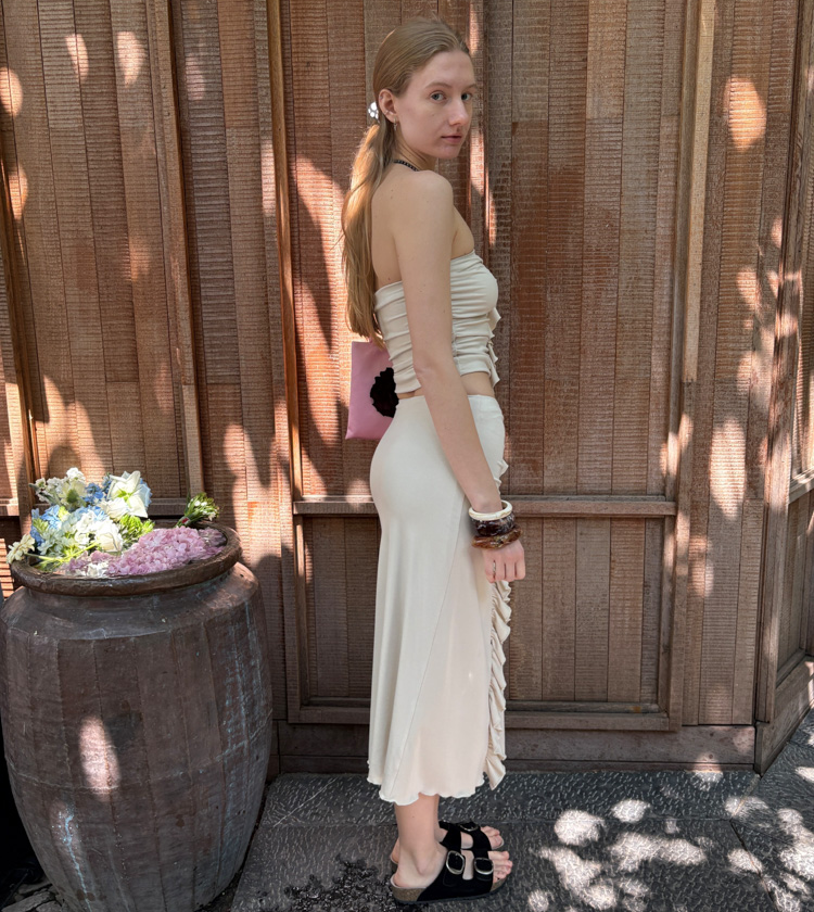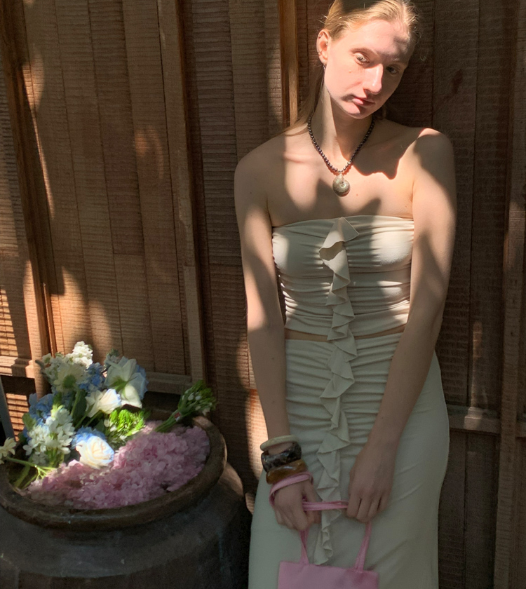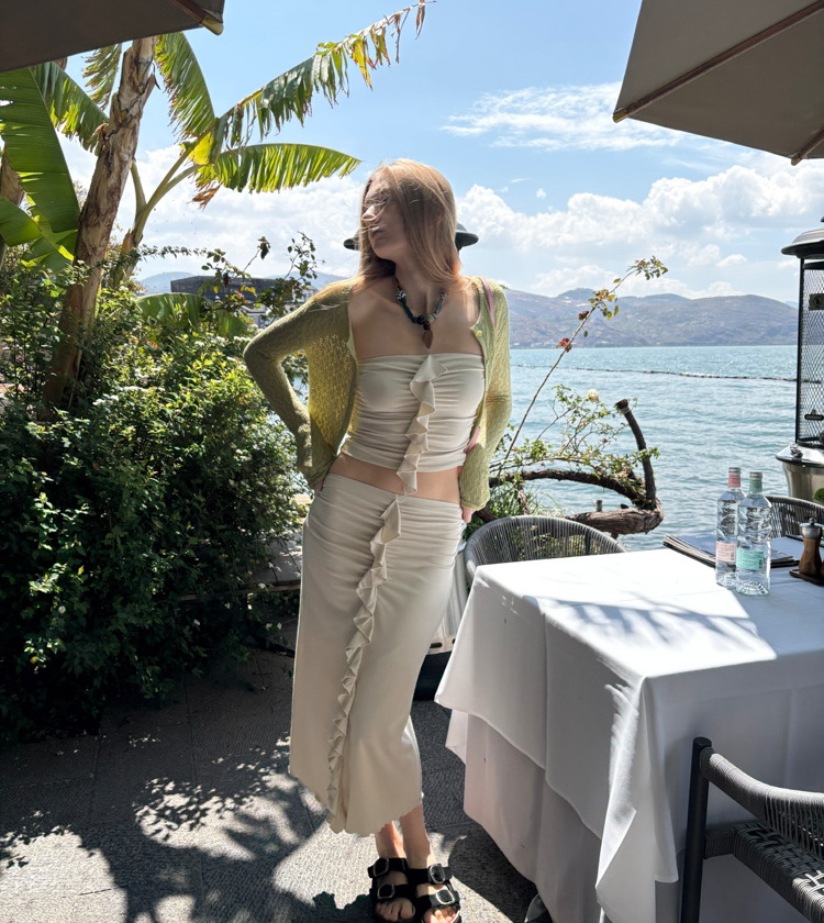 Elastic Knit Pleated Leaf Edge Chest Cover Half Skirt Set