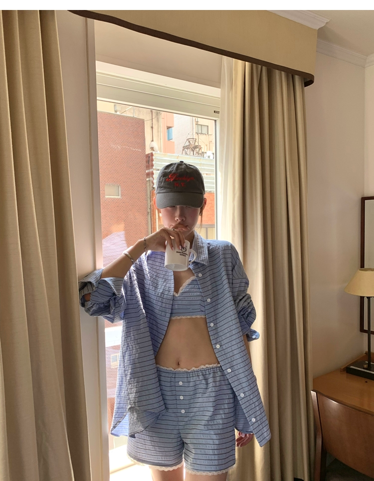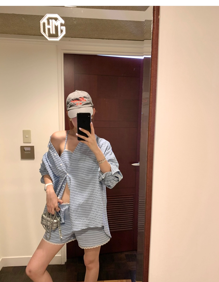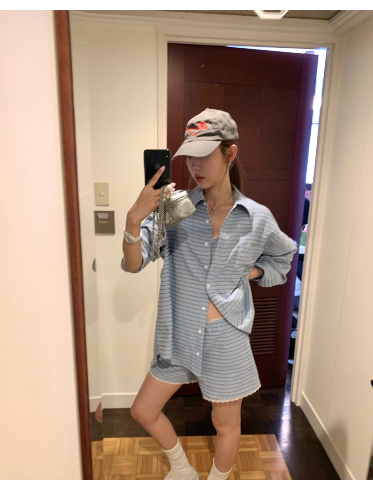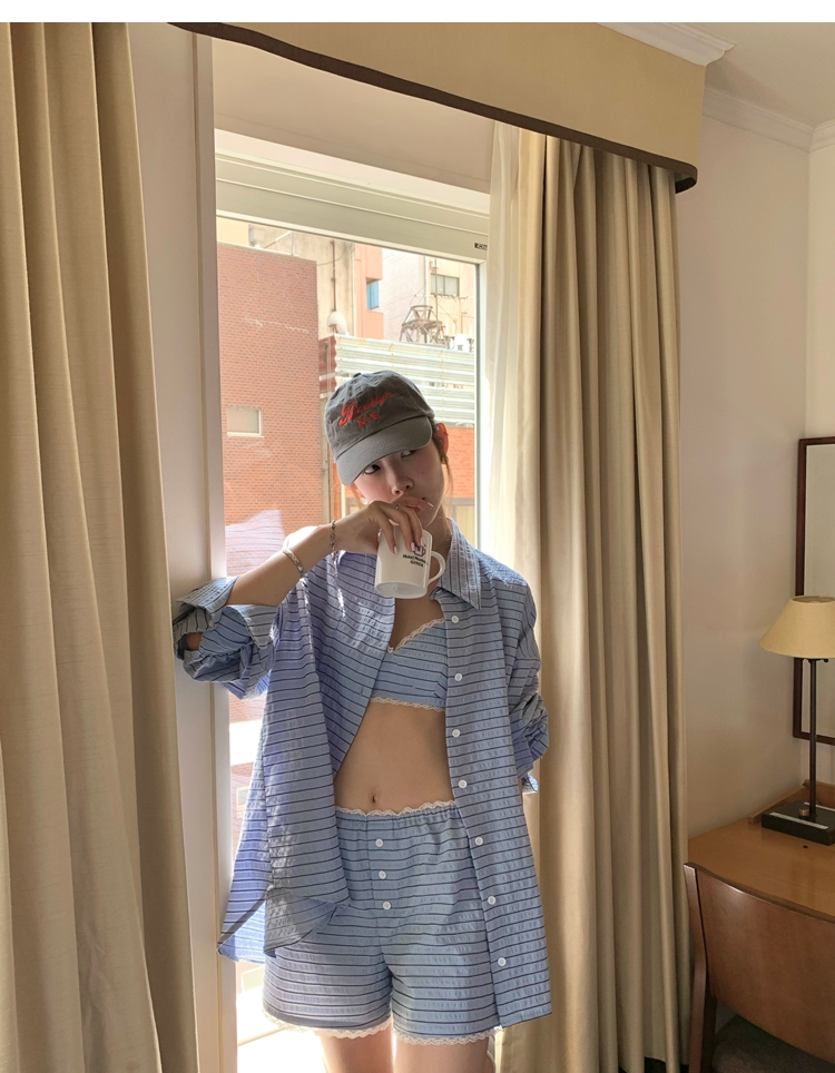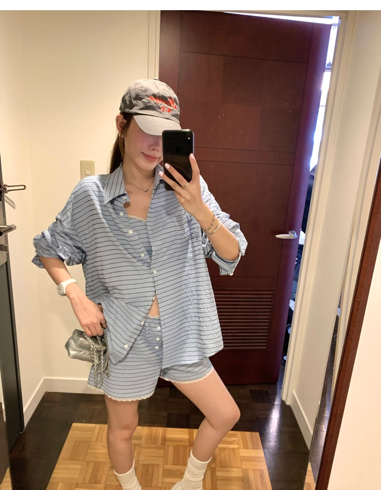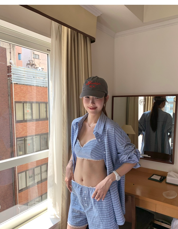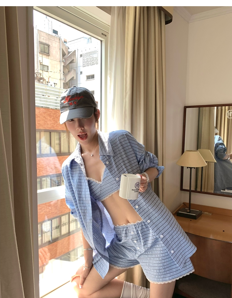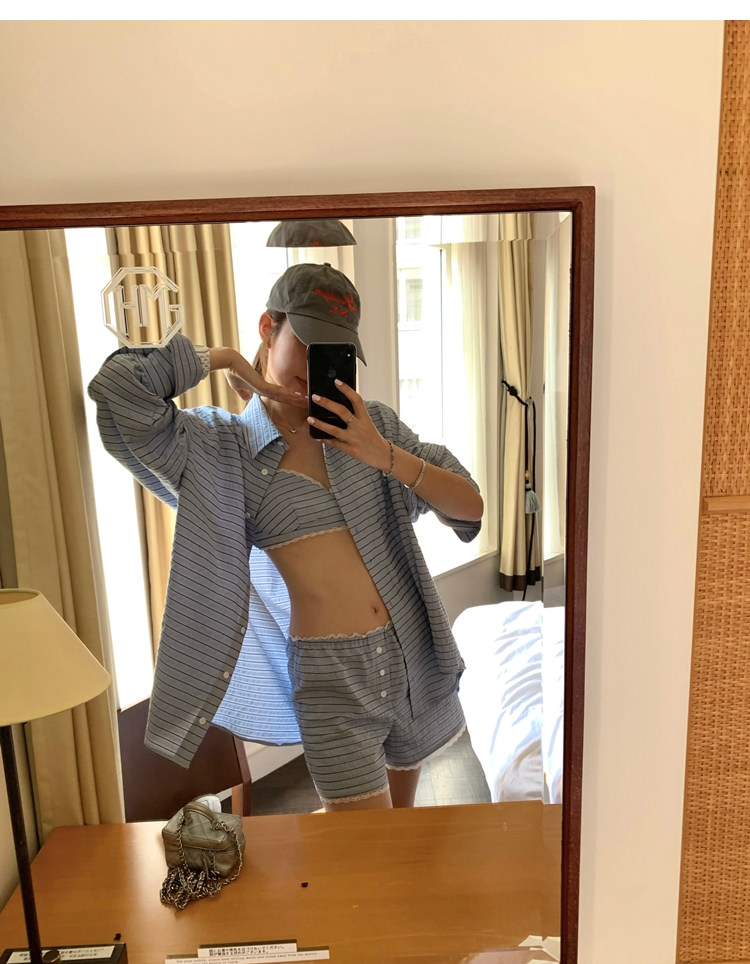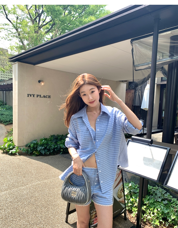 versatile Lazy yarn-dyed striped shirt lace bikini casual shorts set