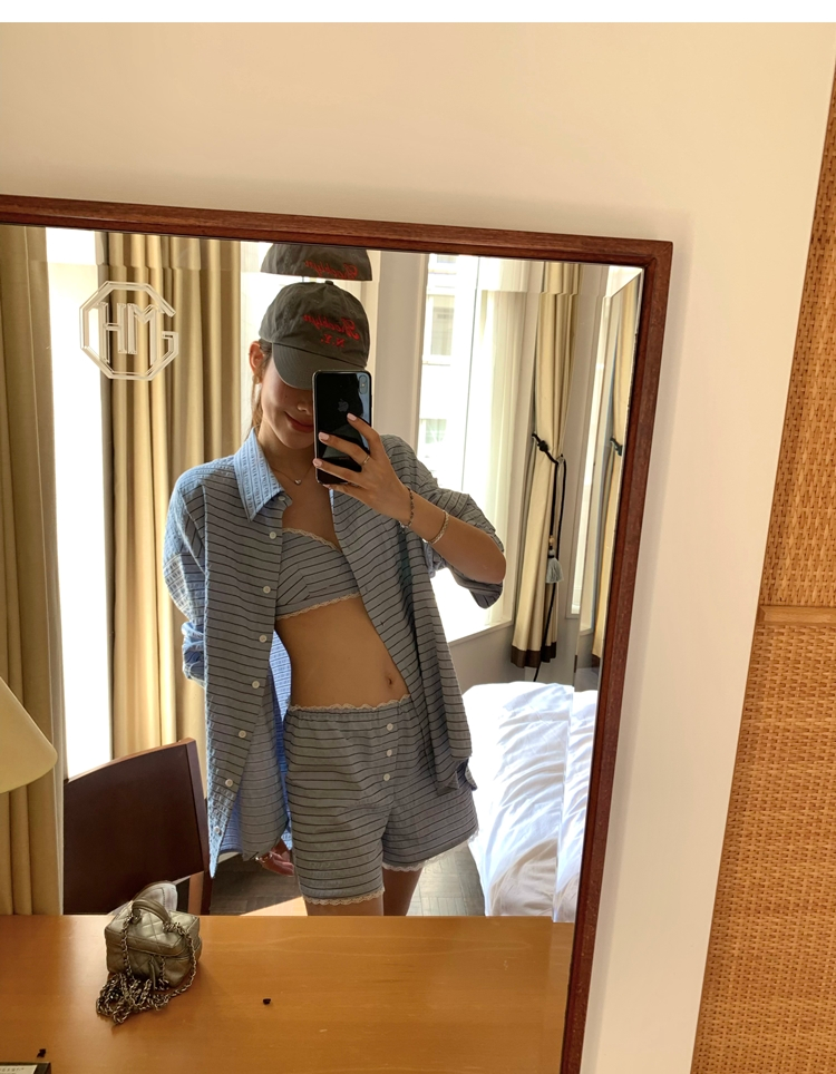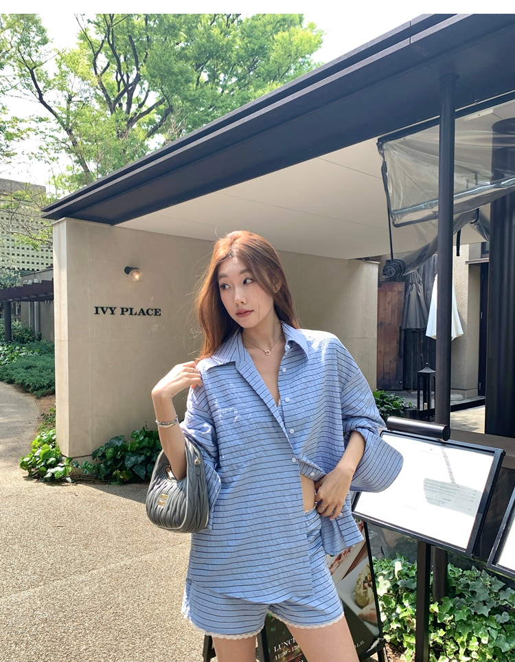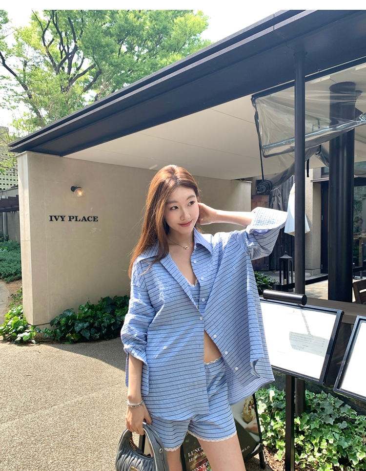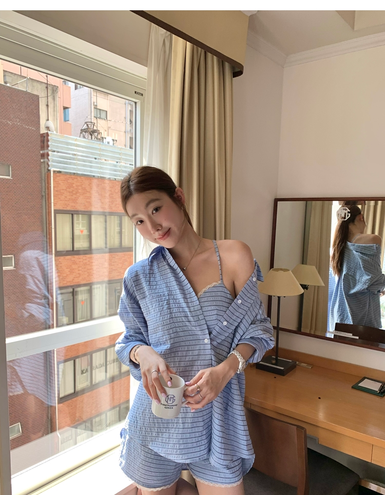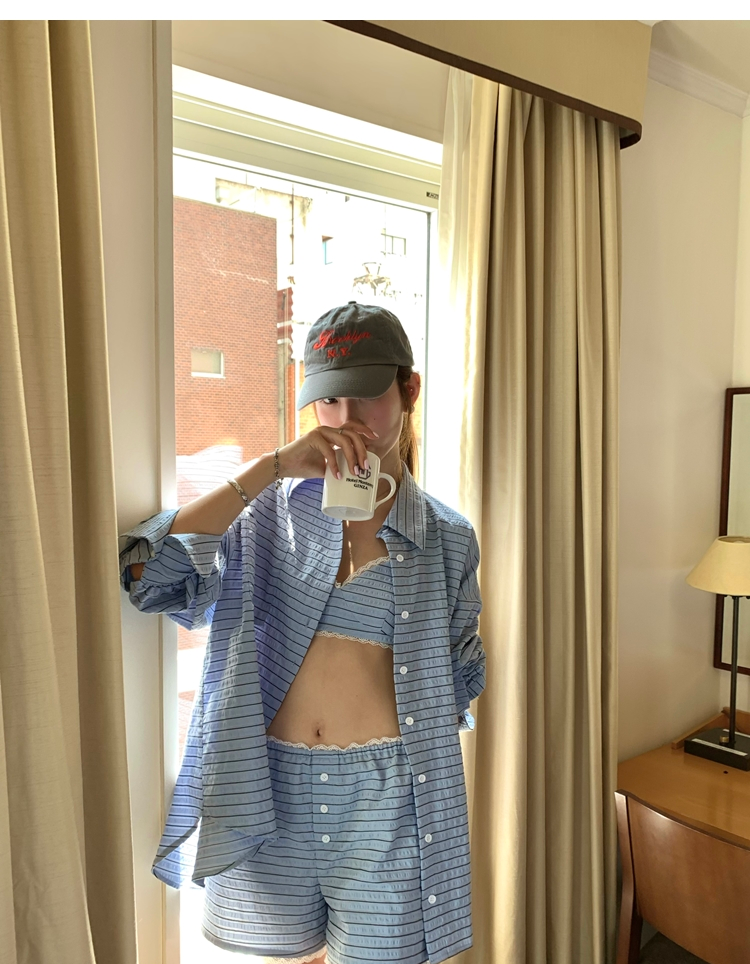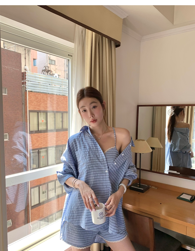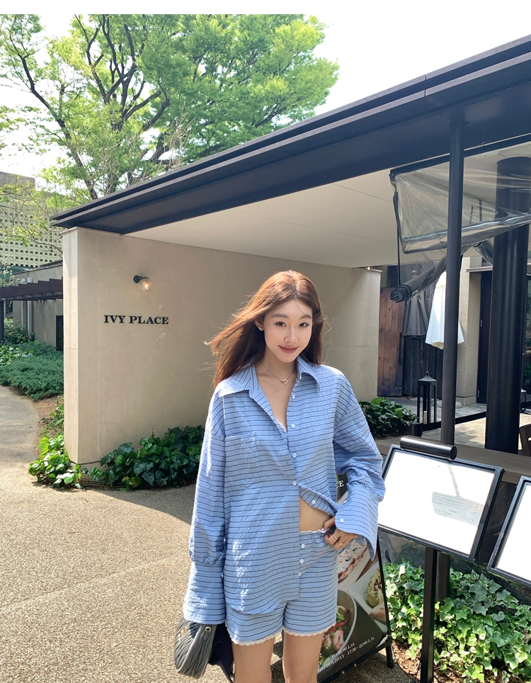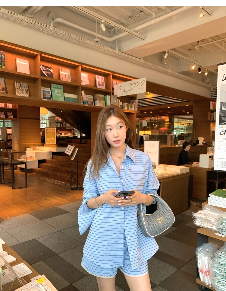 versatile Lazy yarn-dyed striped shirt lace bikini casual shorts set