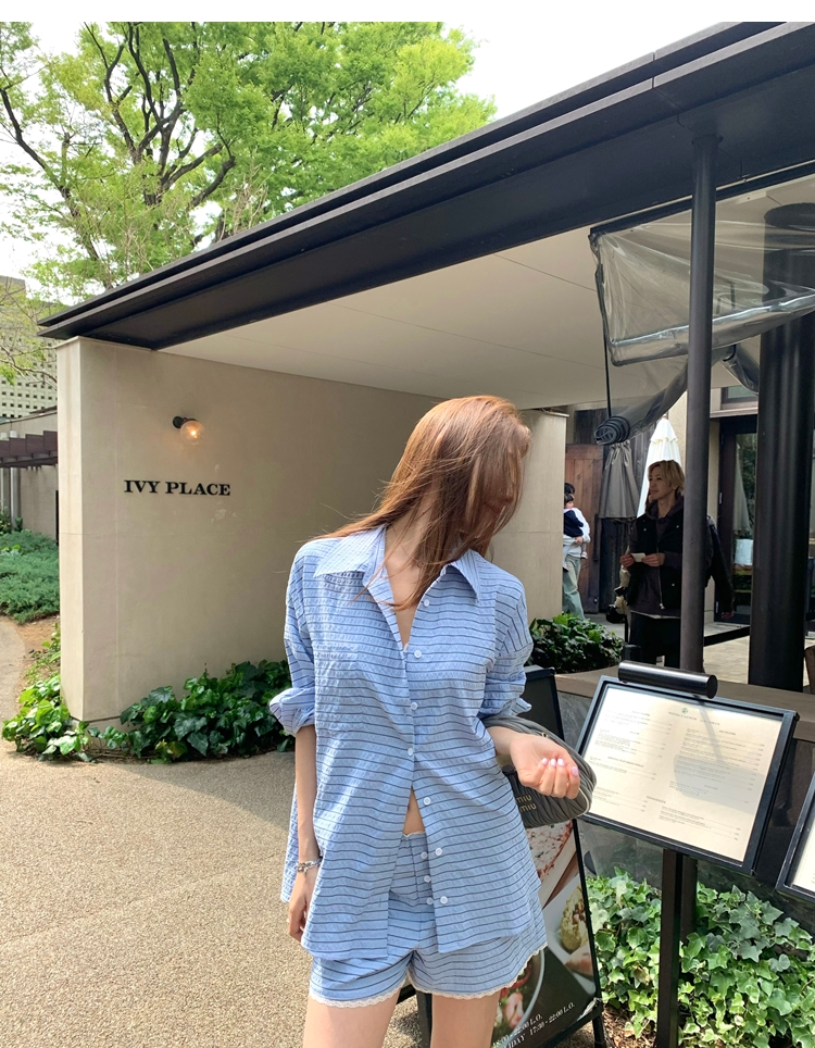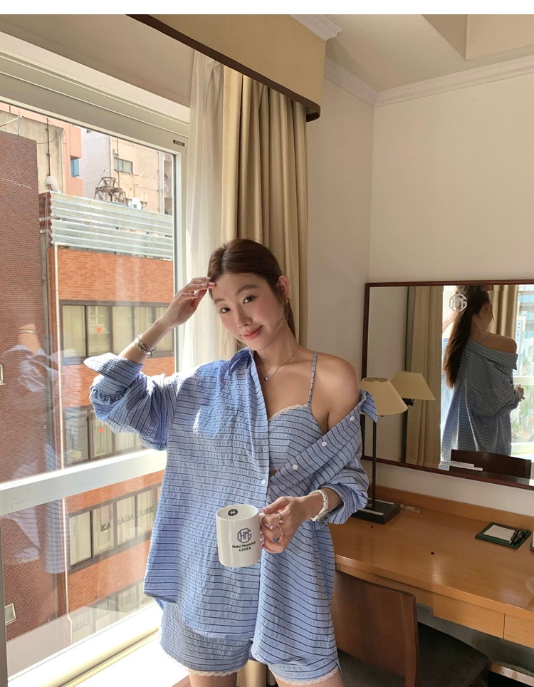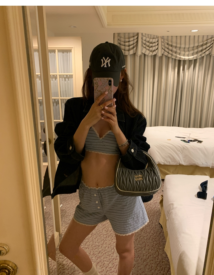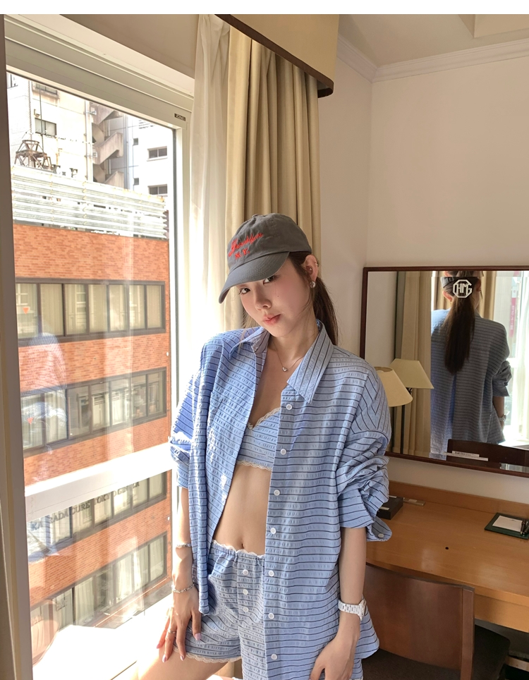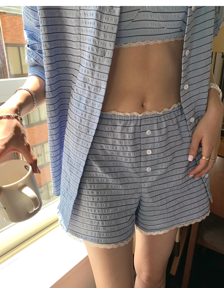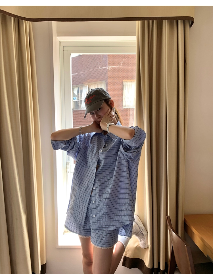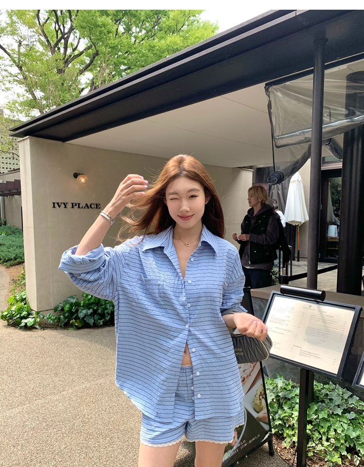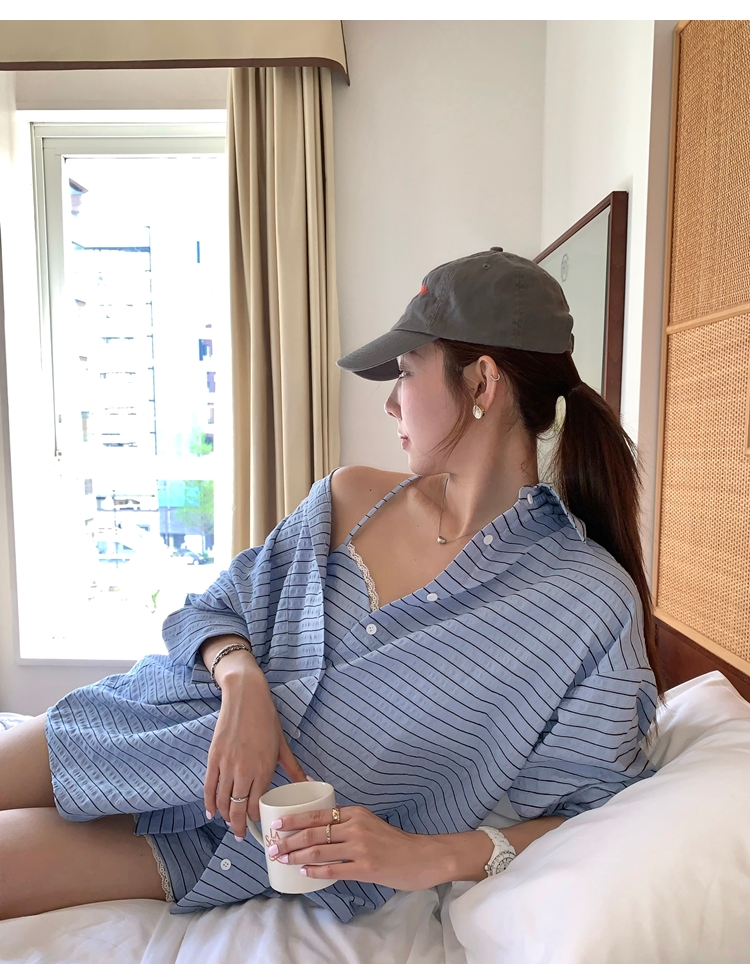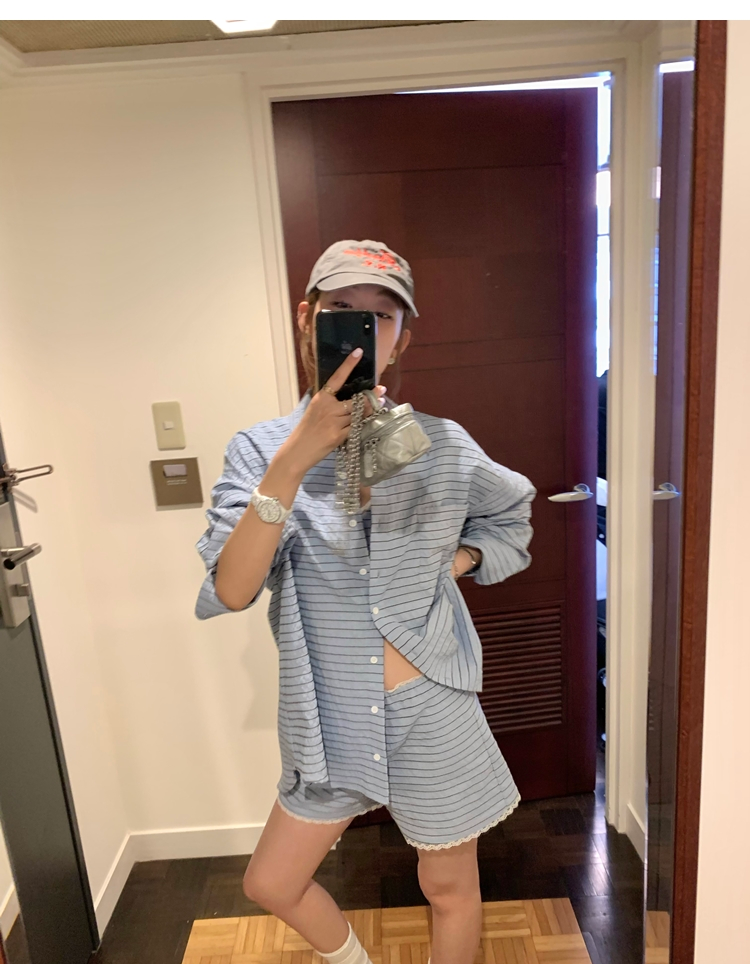 versatile Lazy yarn-dyed striped shirt lace bikini casual shorts set