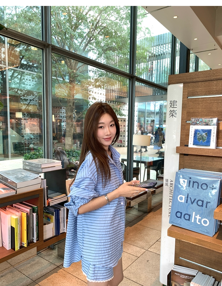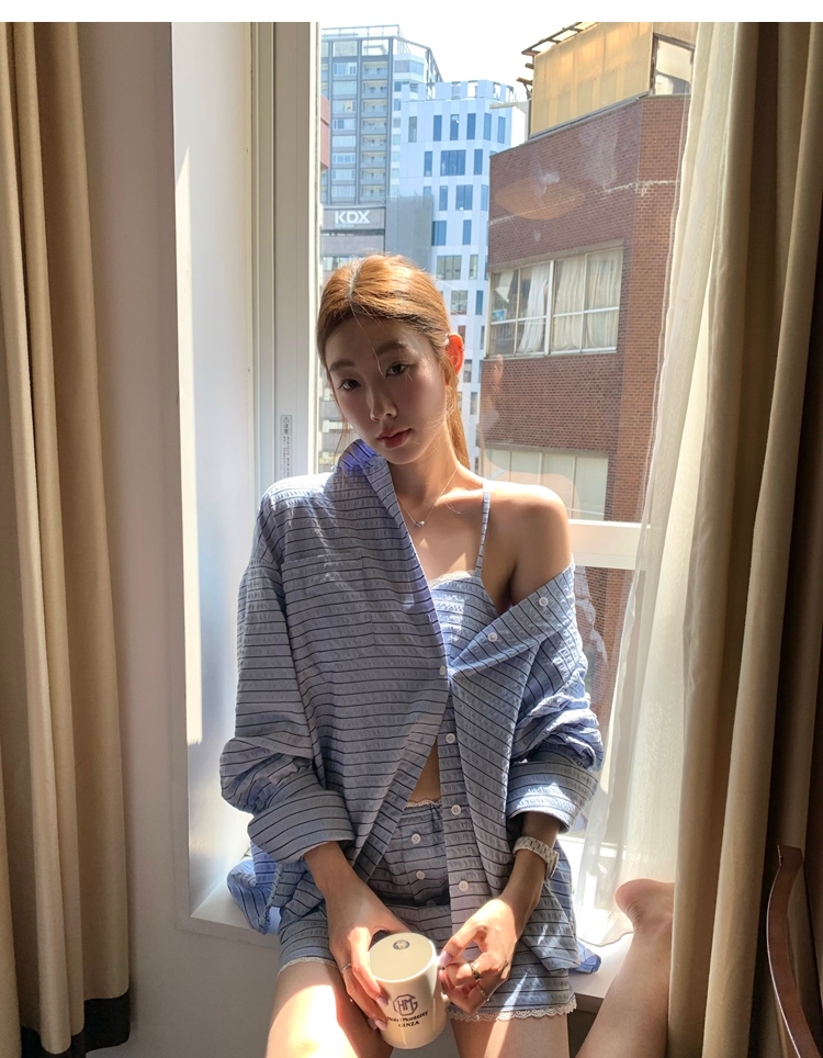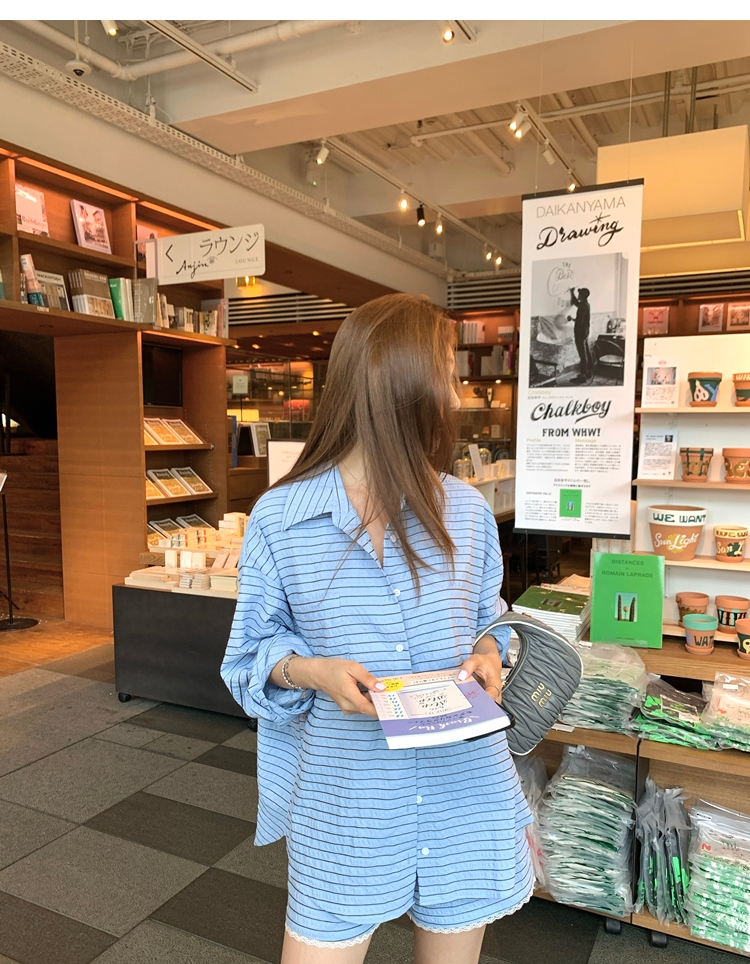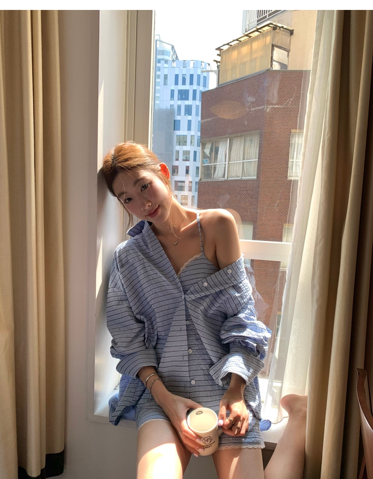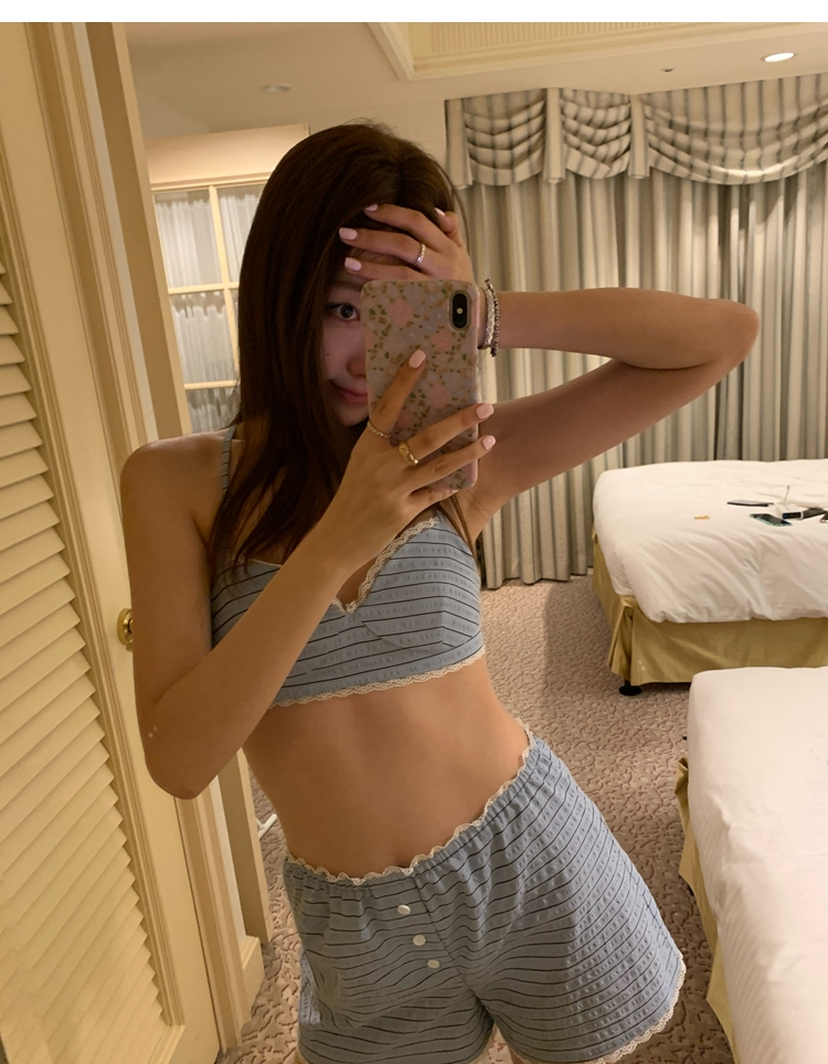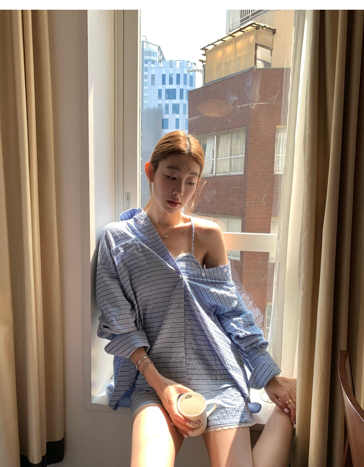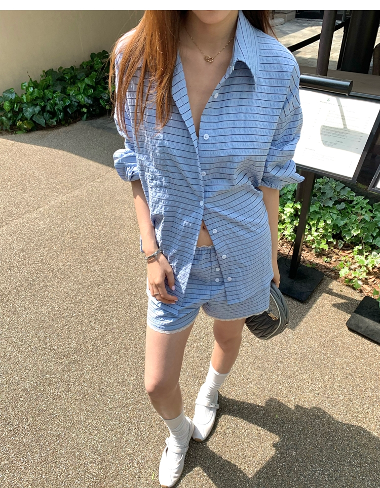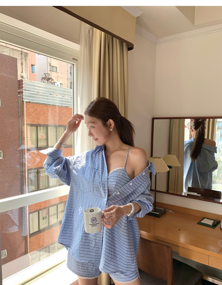 versatile Lazy yarn-dyed striped shirt lace bikini casual shorts set