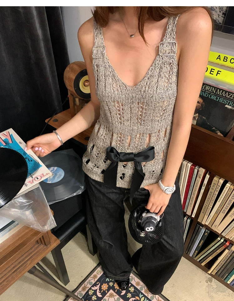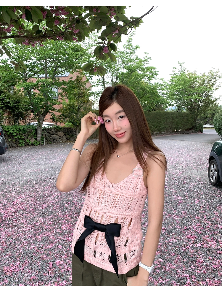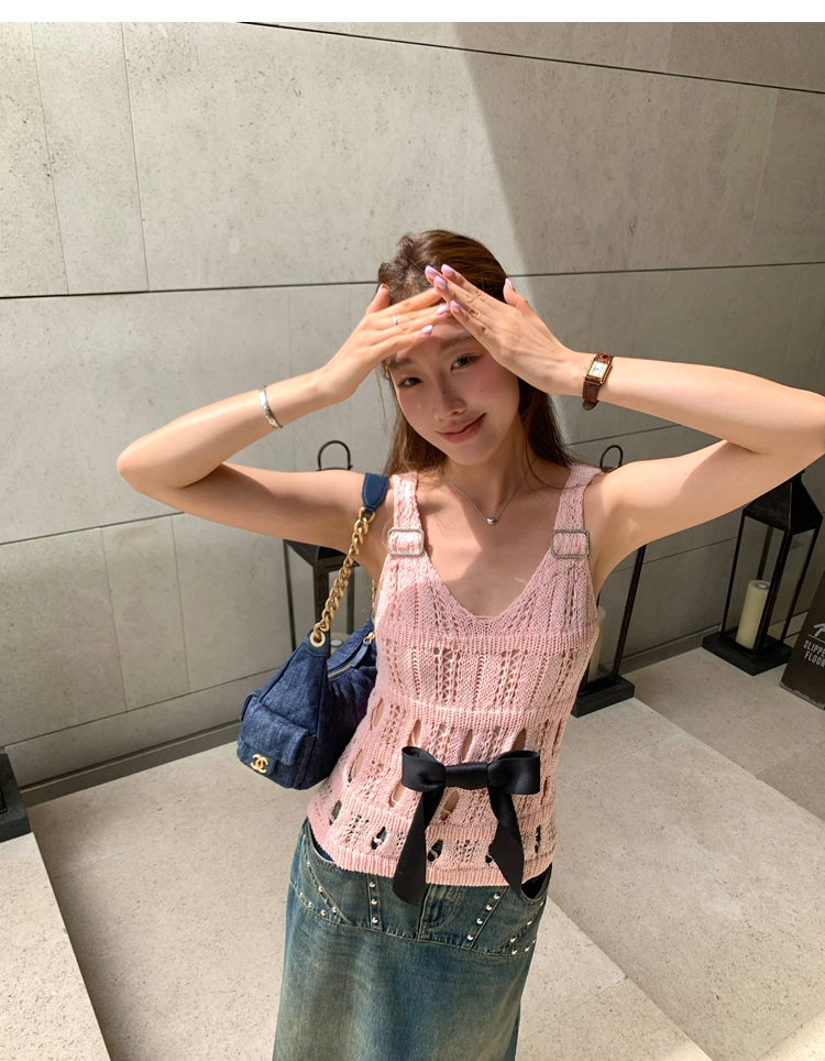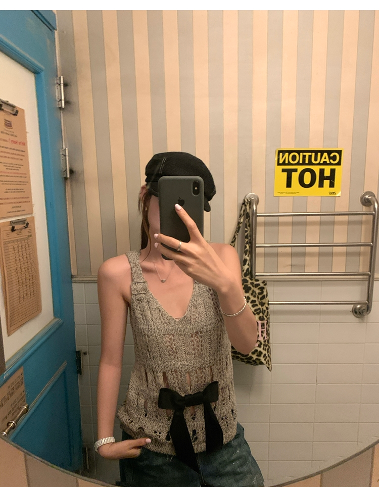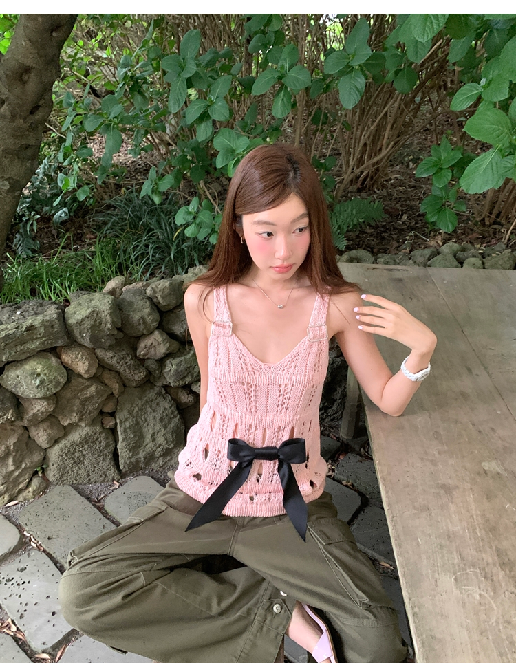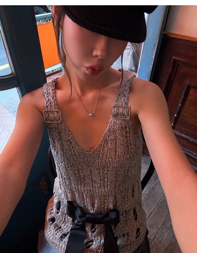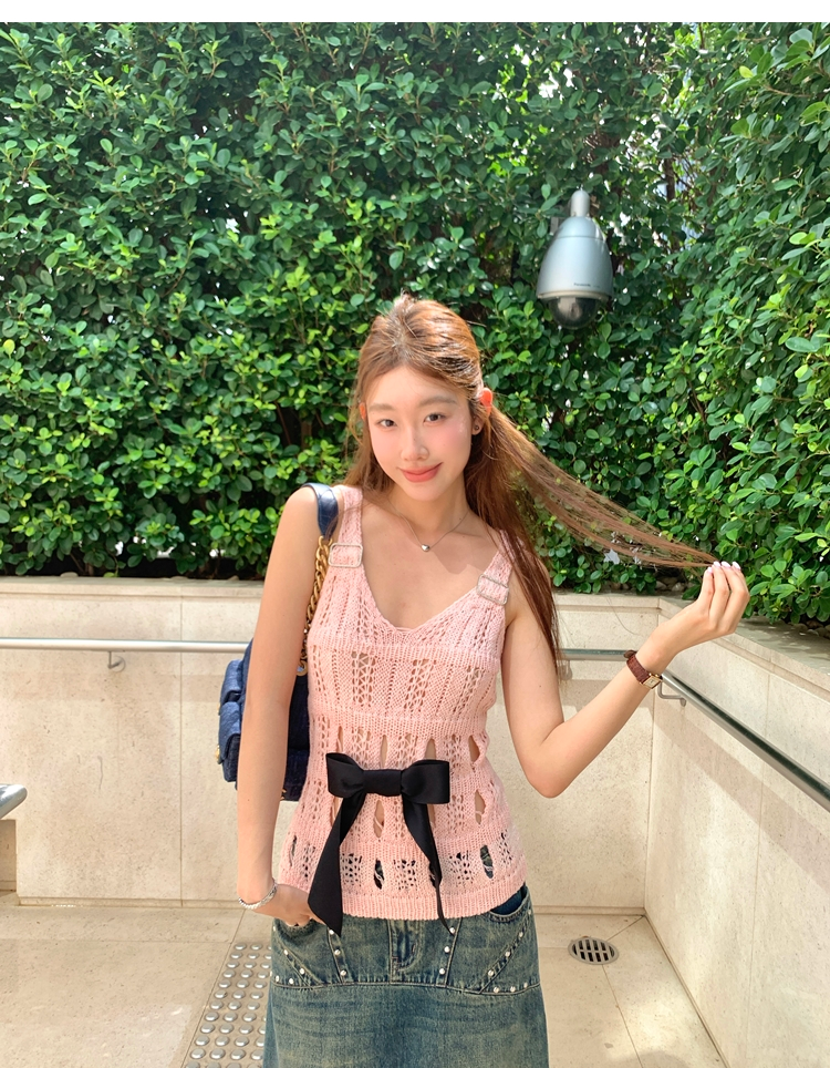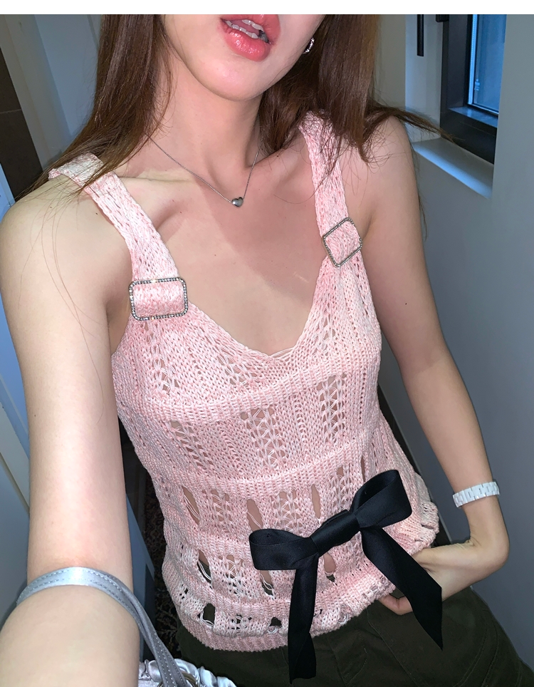 Hollow Crochet Knitted Diamond Button Bow Waist Vest