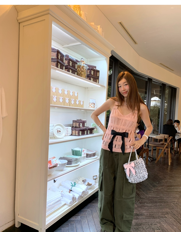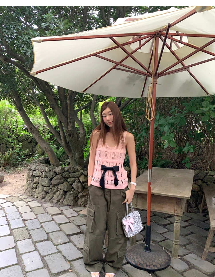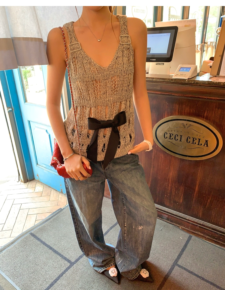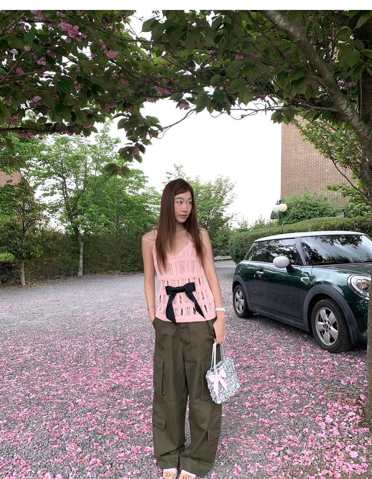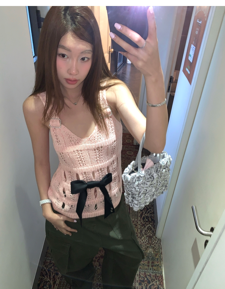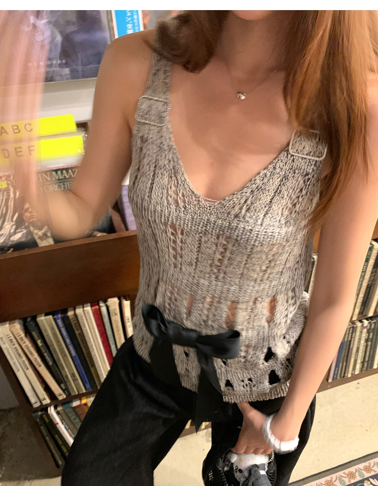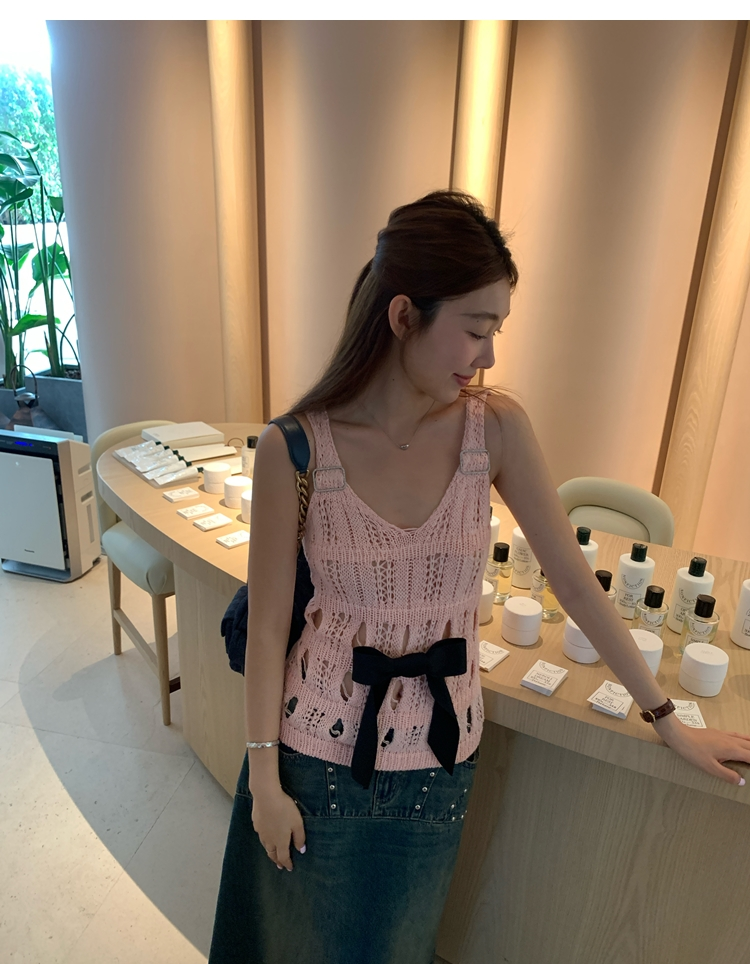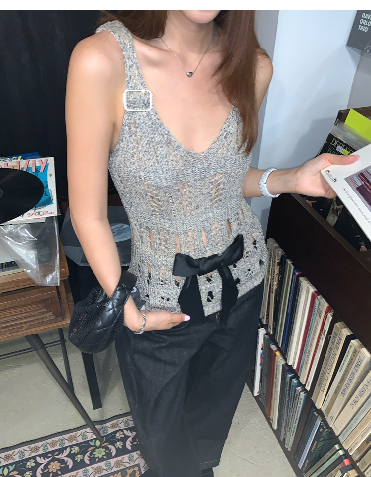 Hollow Crochet Knitted Diamond Button Bow Waist Vest