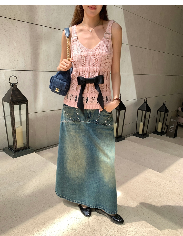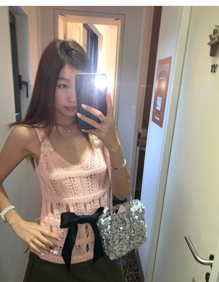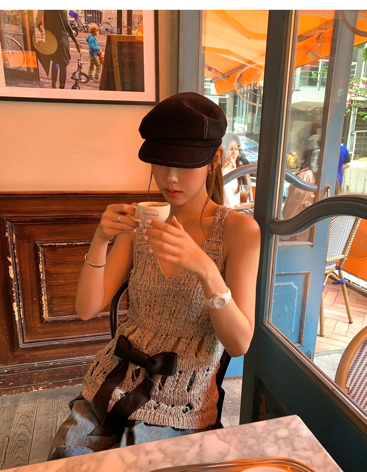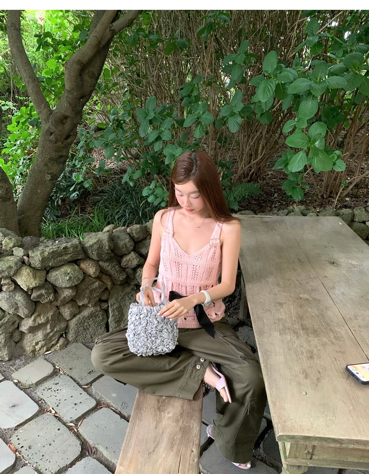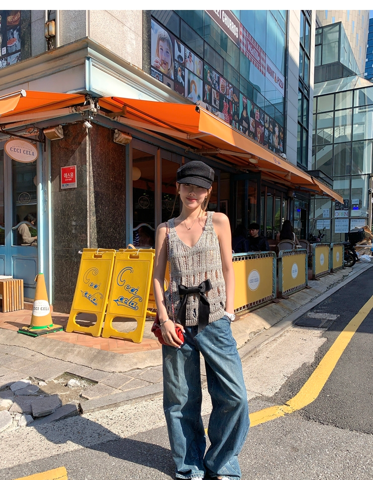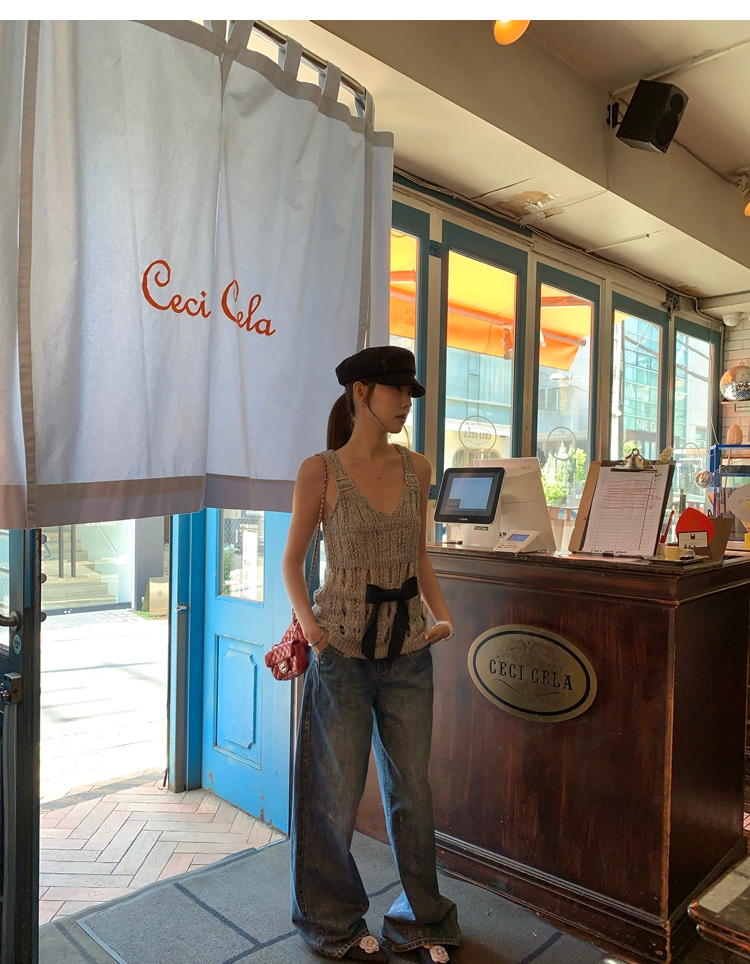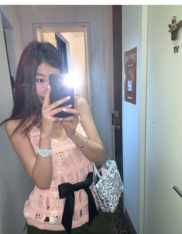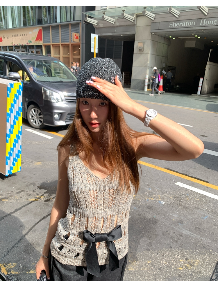 Hollow Crochet Knitted Diamond Button Bow Waist Vest