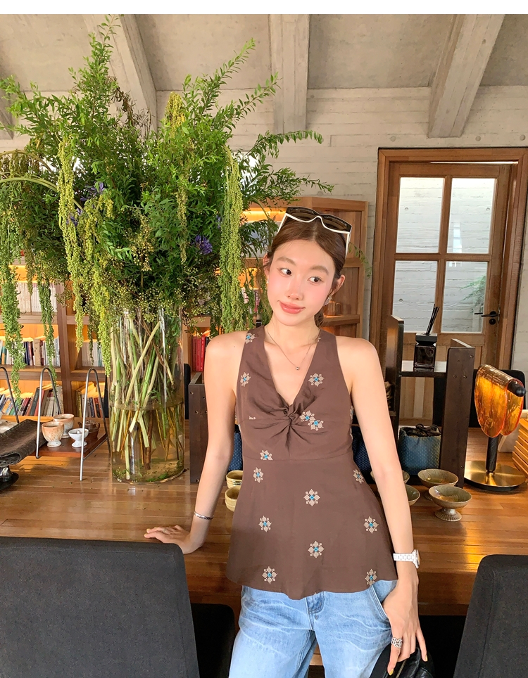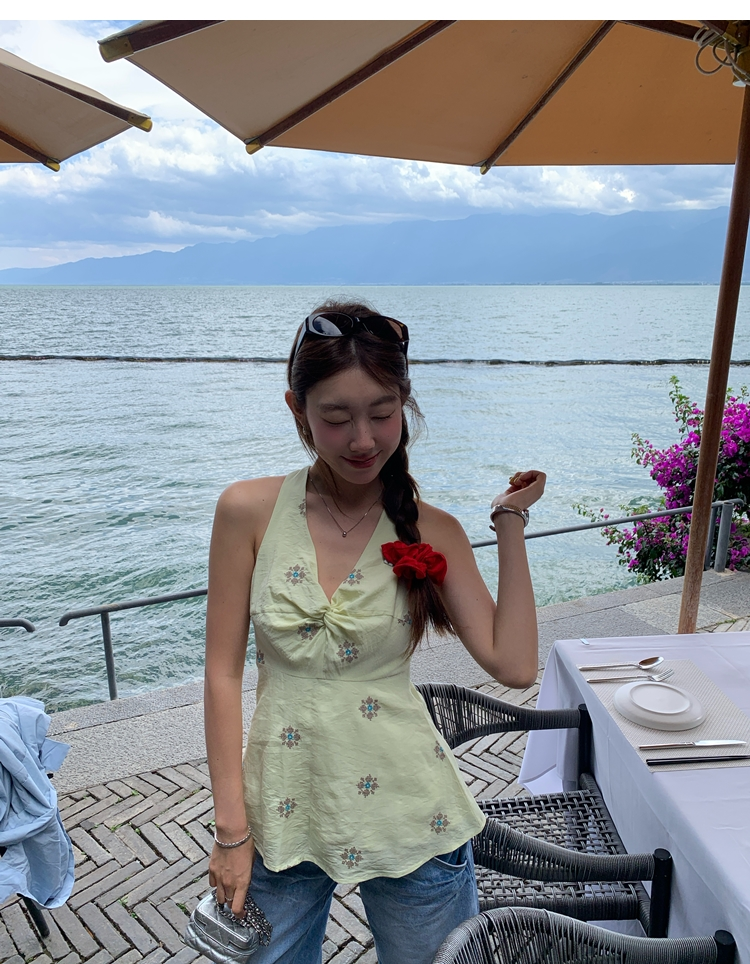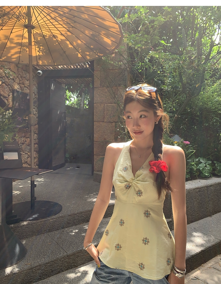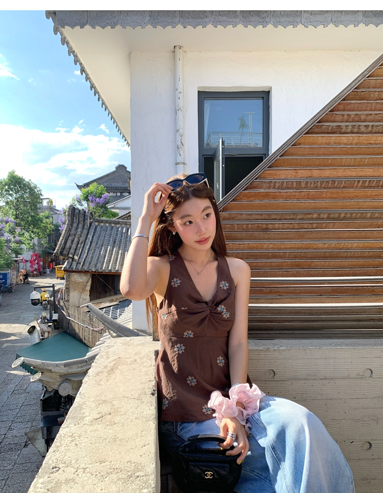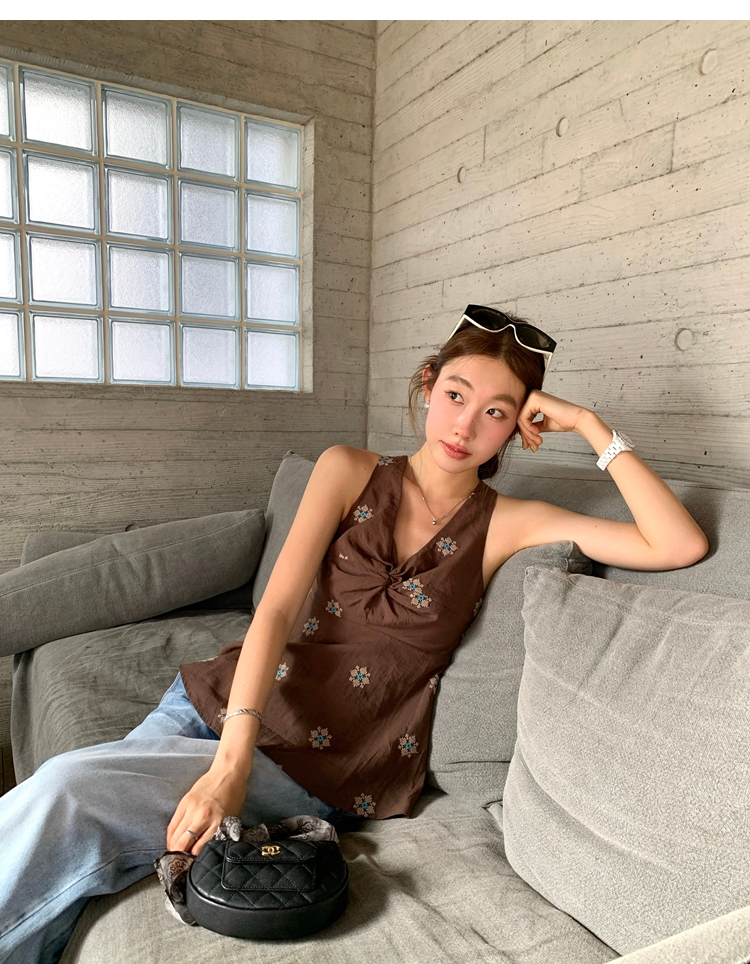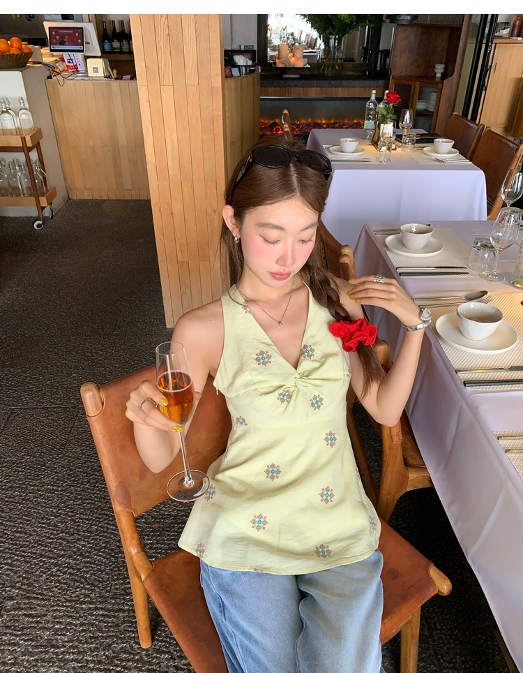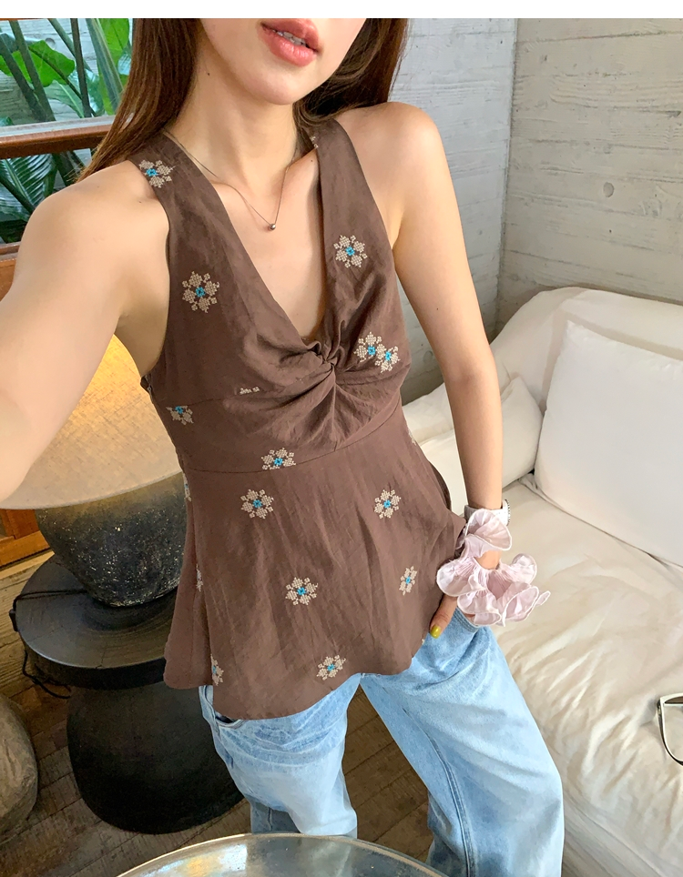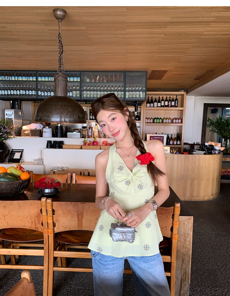 Silk Embroidery Sweet V-neck Twisted Necklace Sleeveless Tank Top