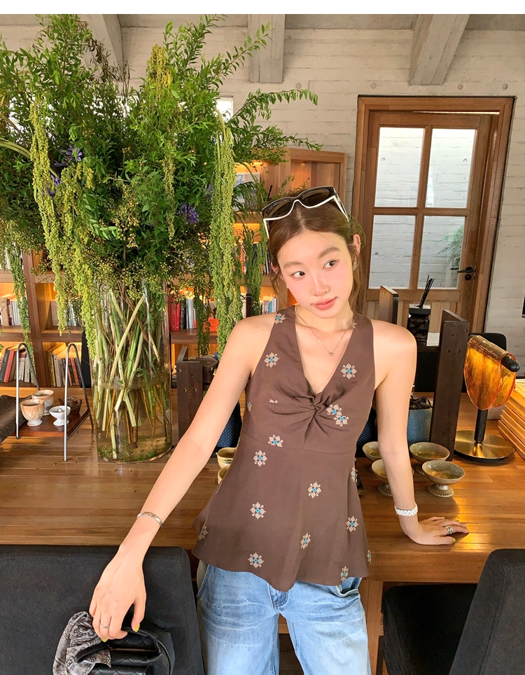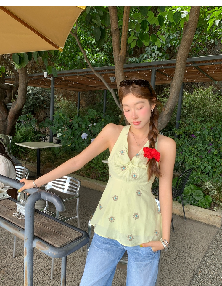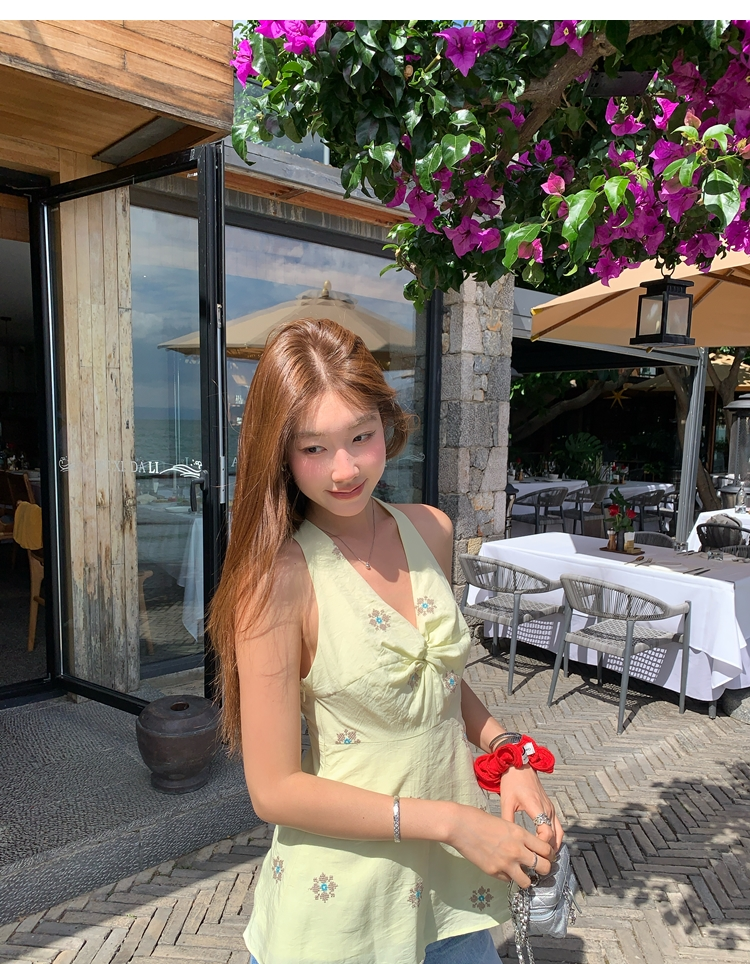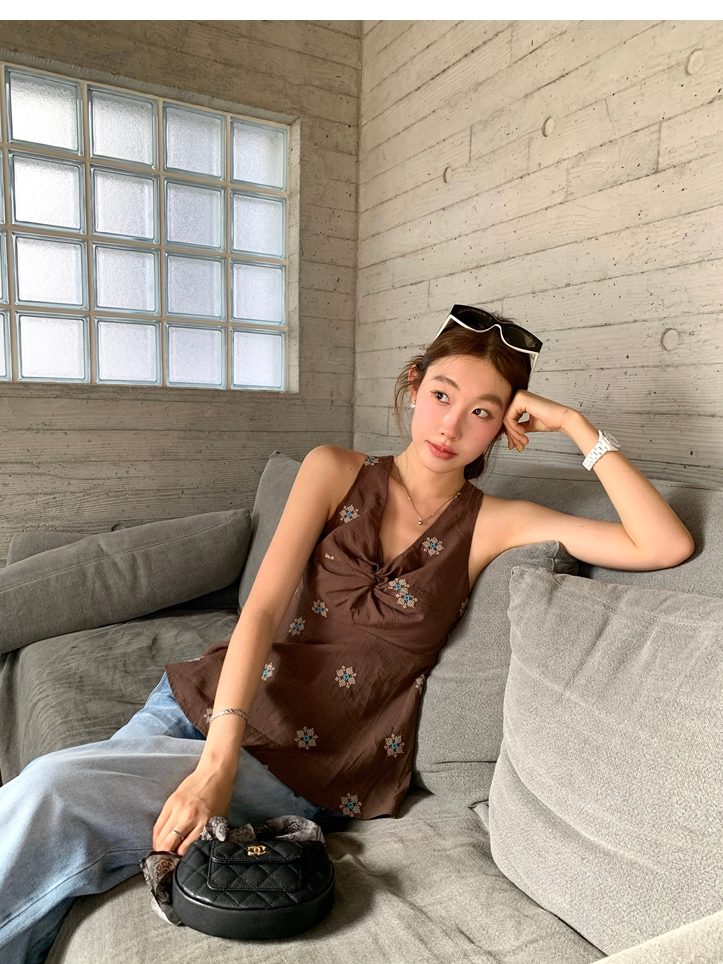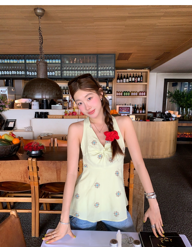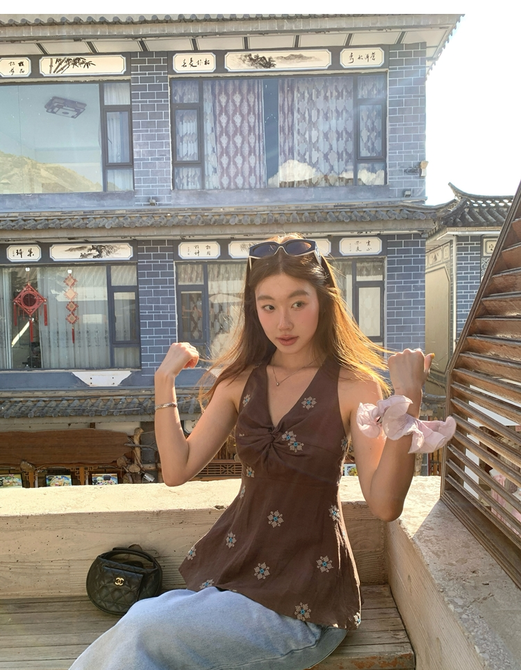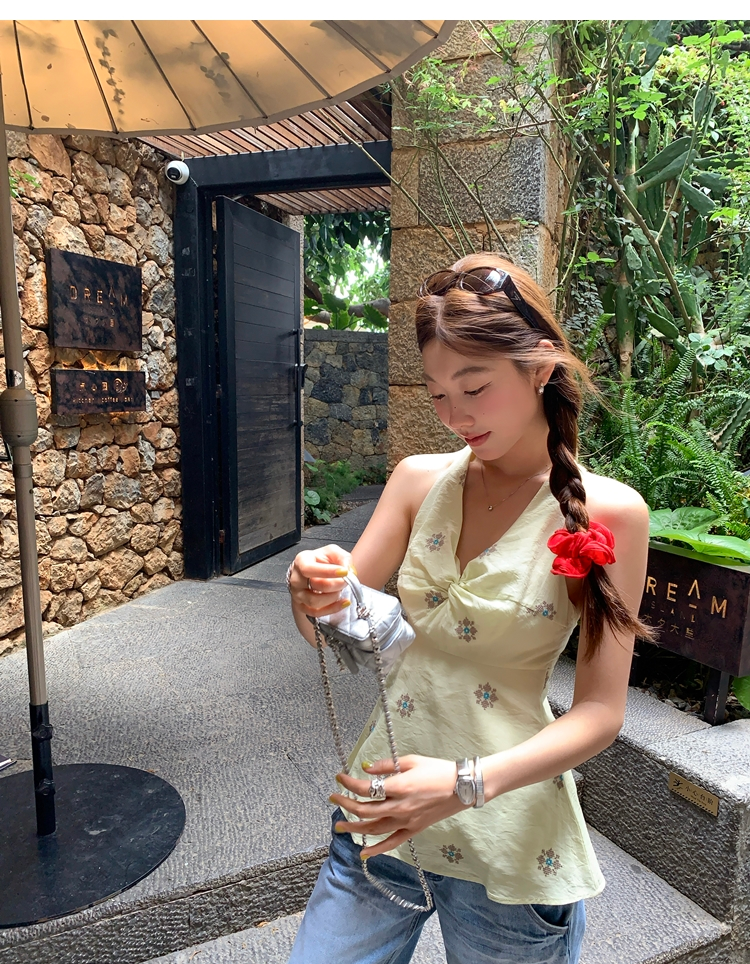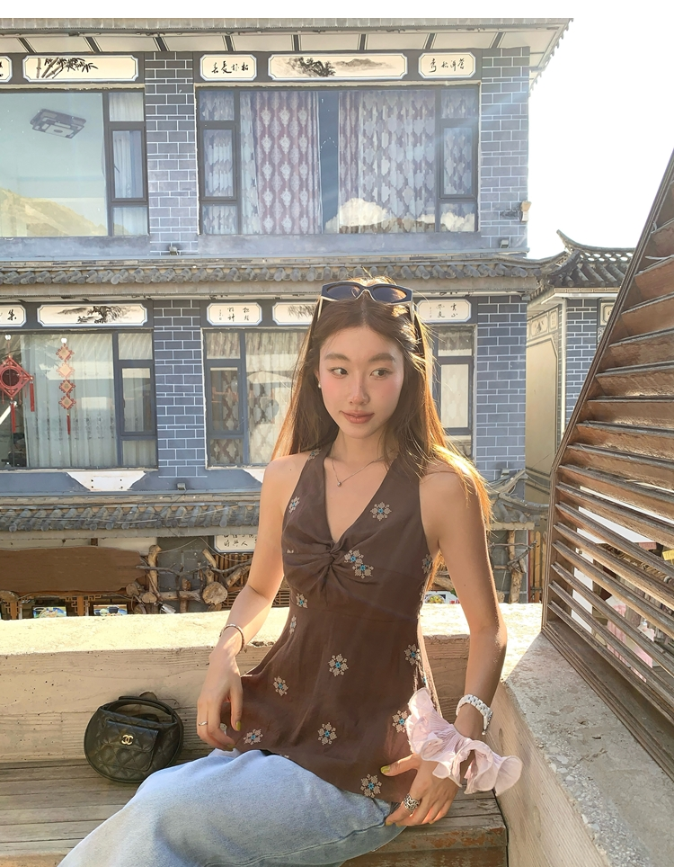 Silk Embroidery Sweet V-neck Twisted Necklace Sleeveless Tank Top