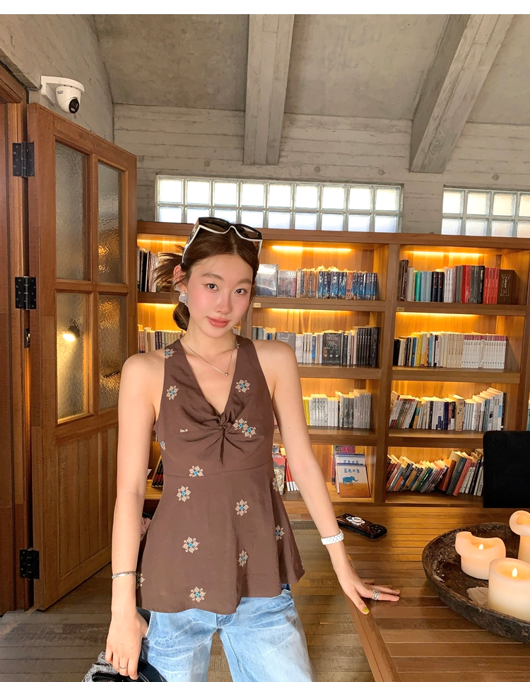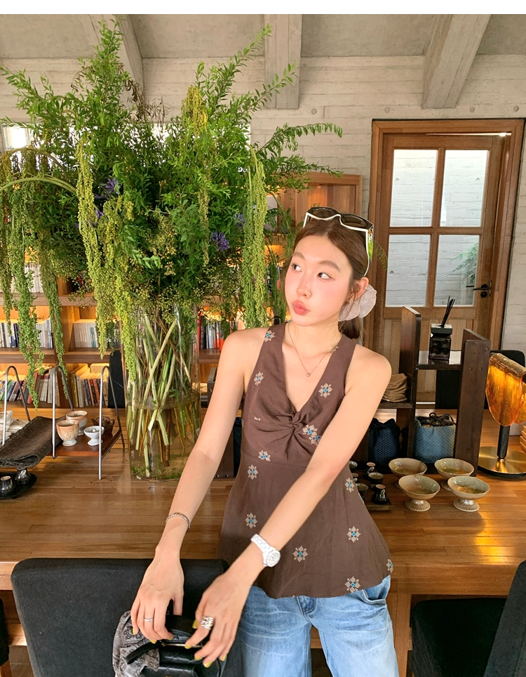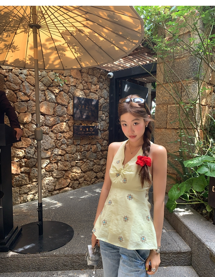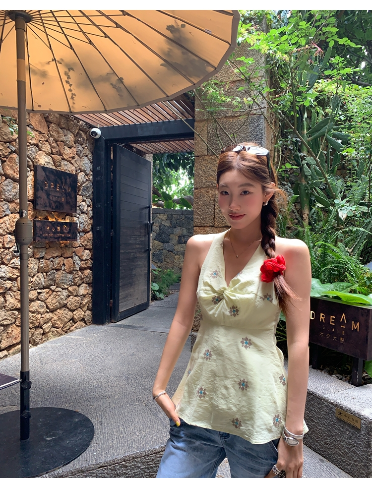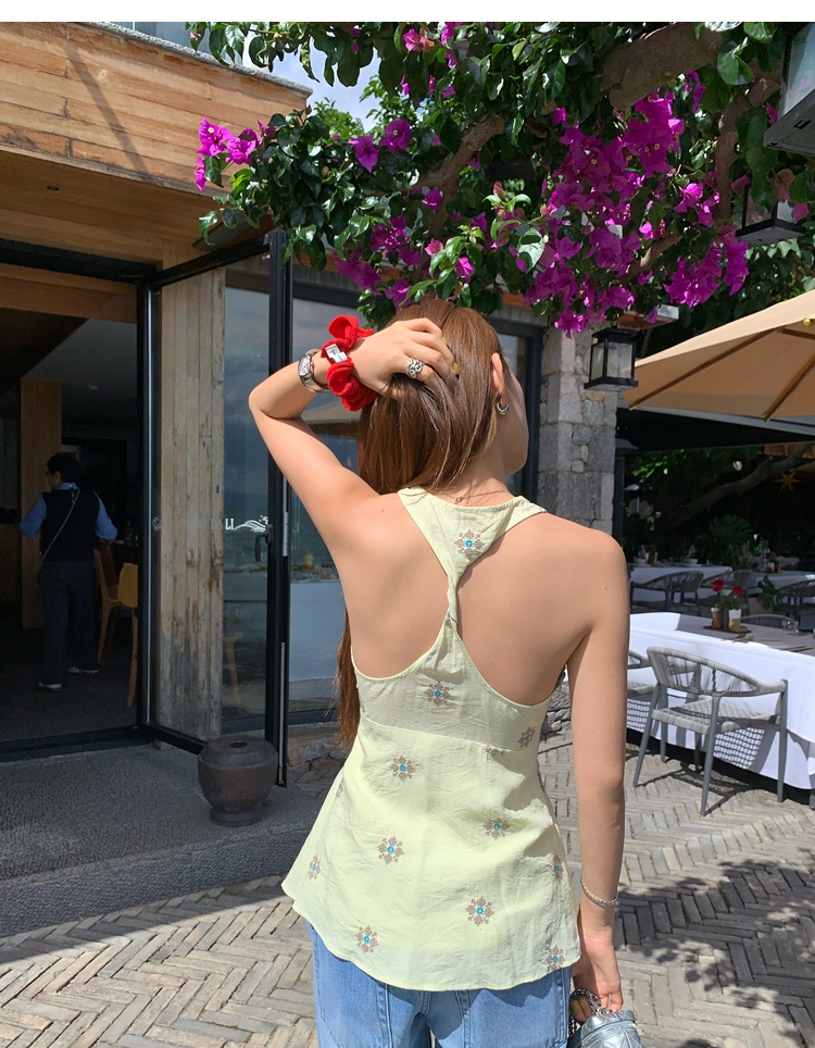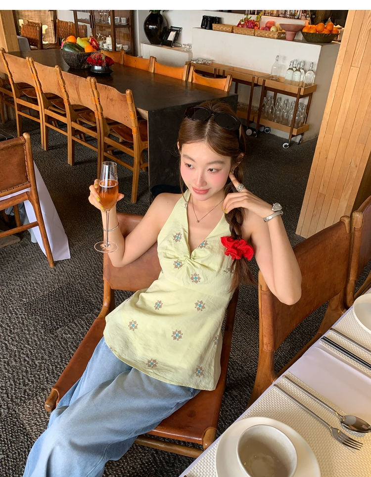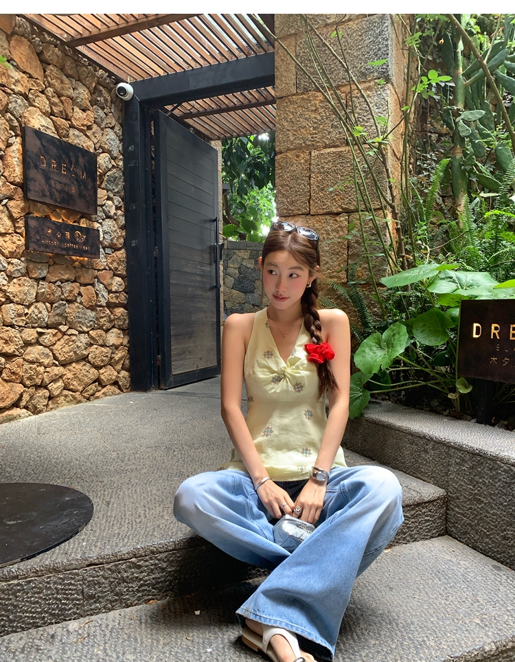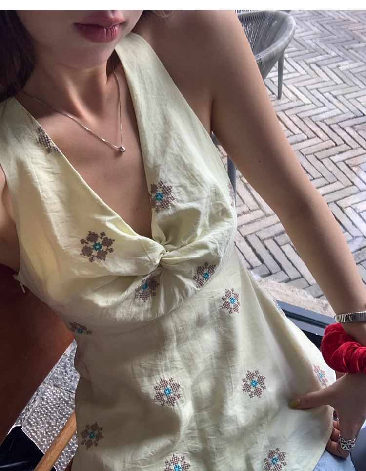 Silk Embroidery Sweet V-neck Twisted Necklace Sleeveless Tank Top