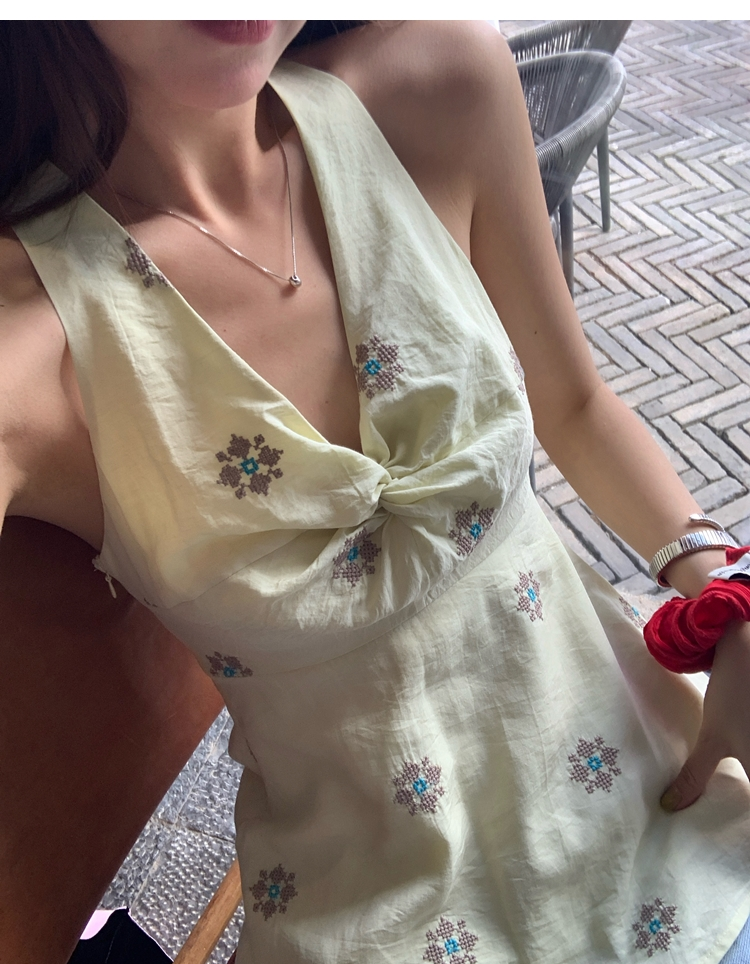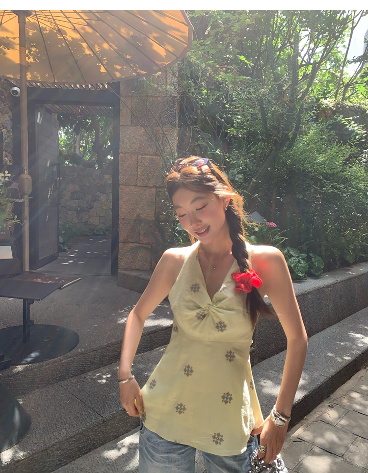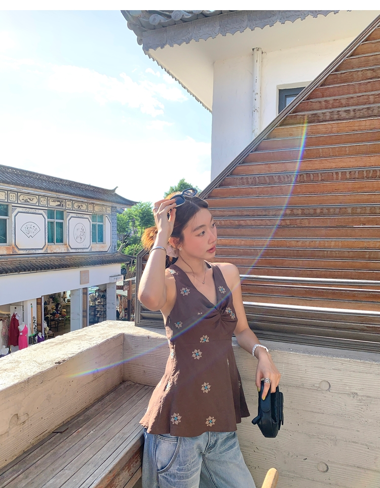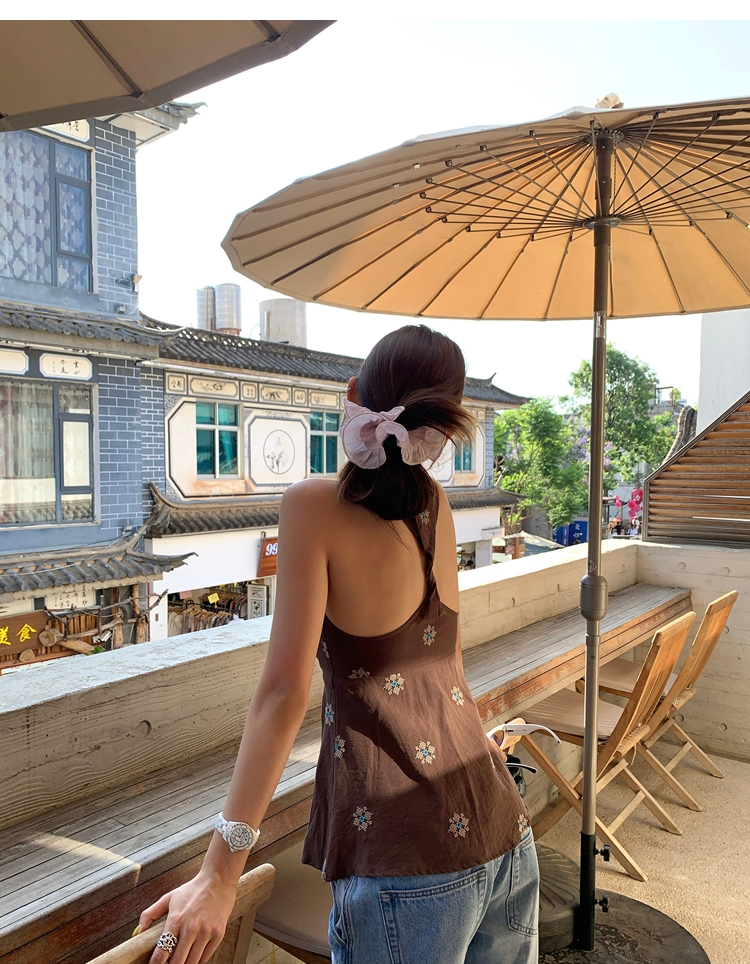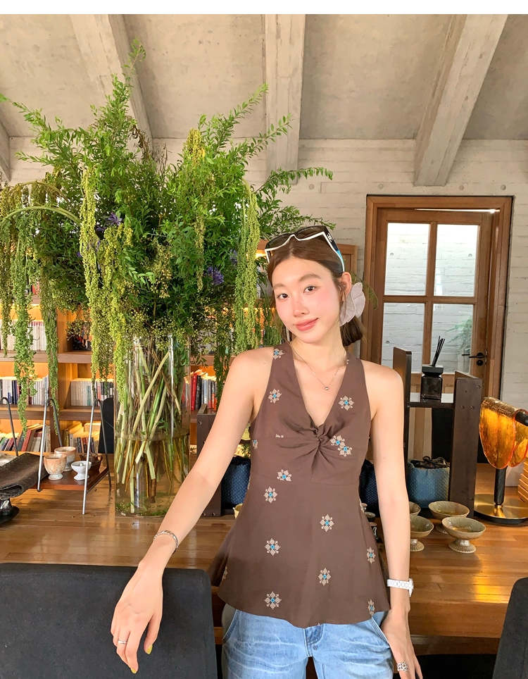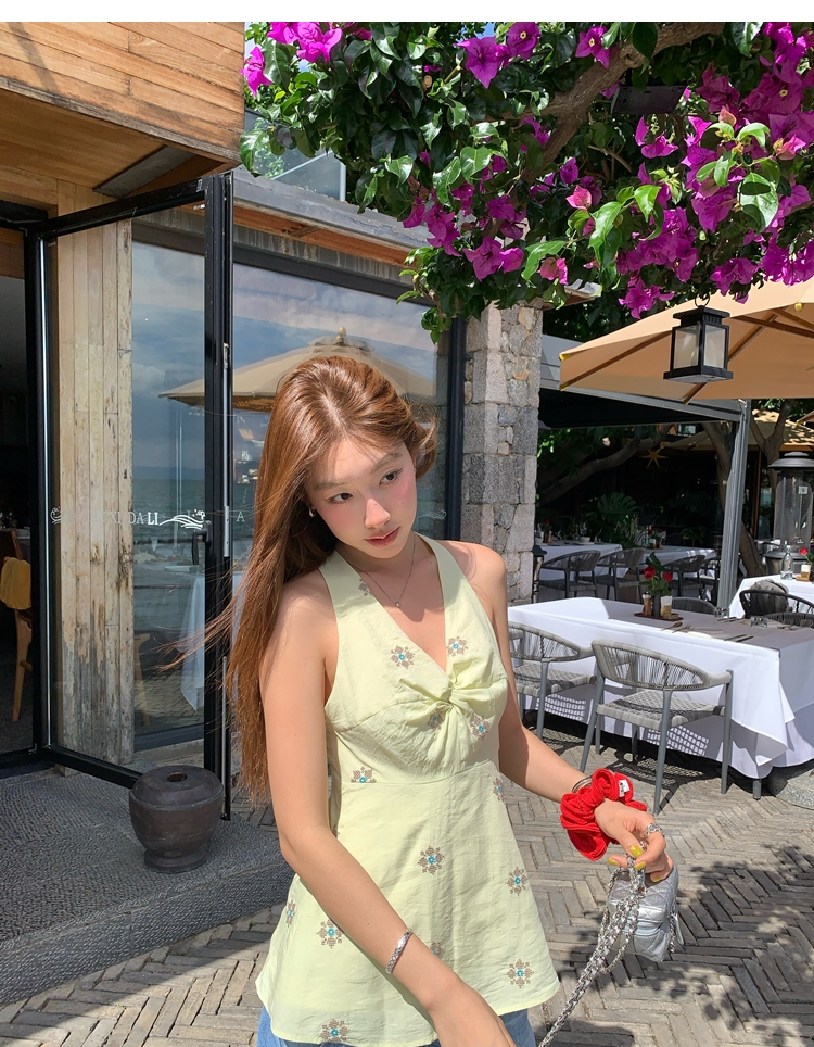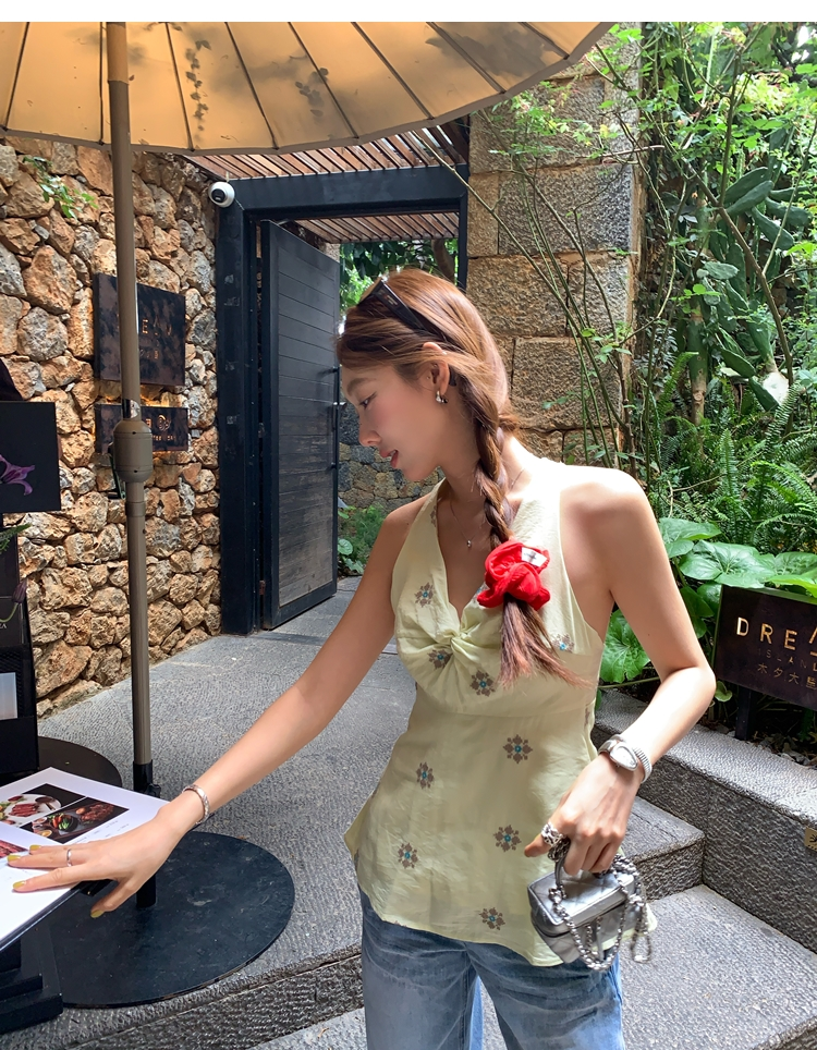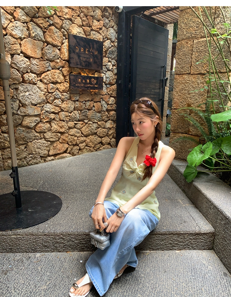 Silk Embroidery Sweet V-neck Twisted Necklace Sleeveless Tank Top