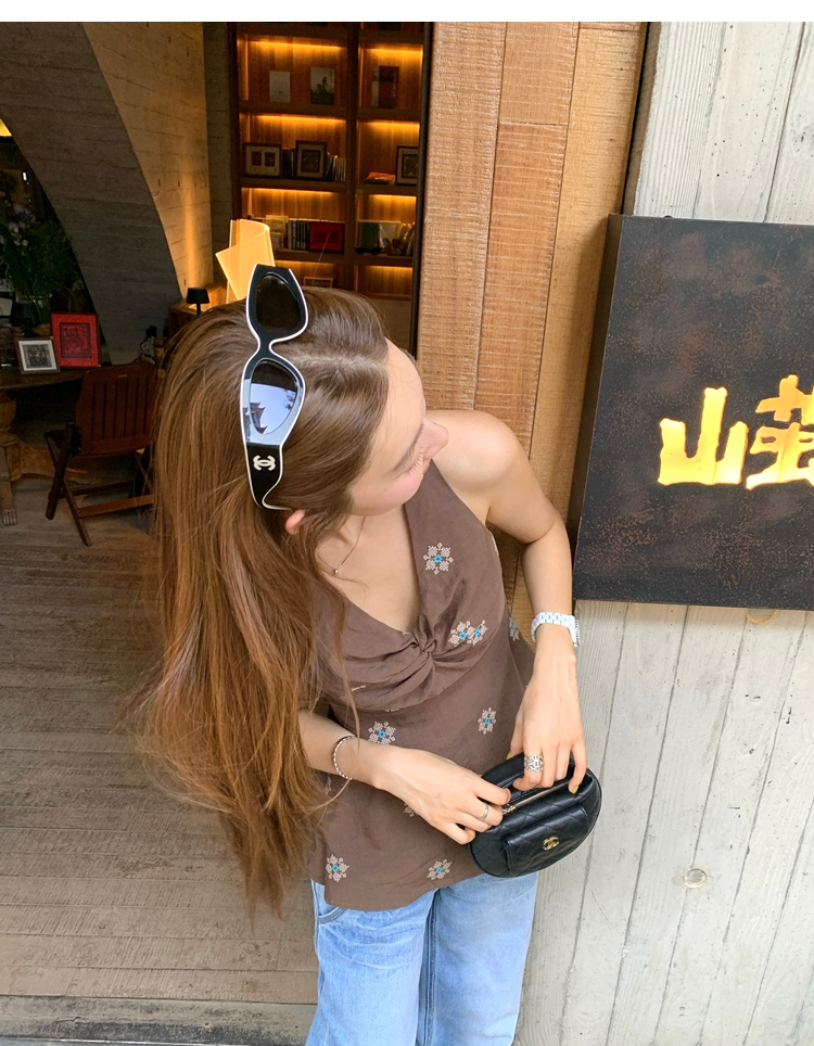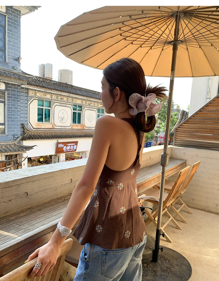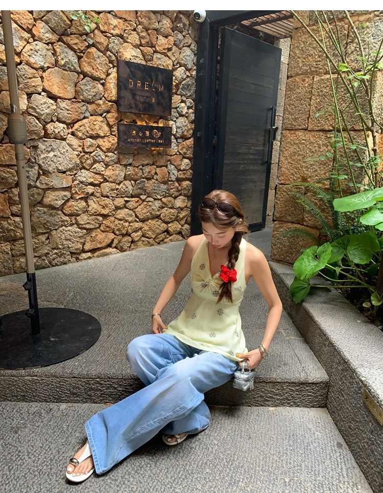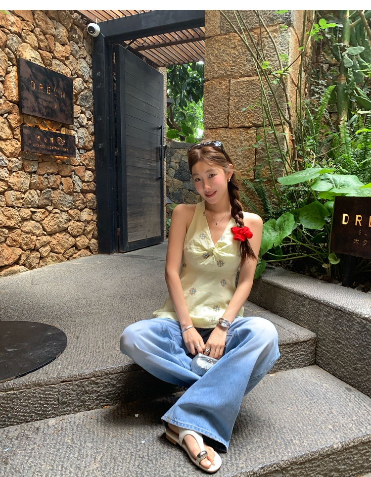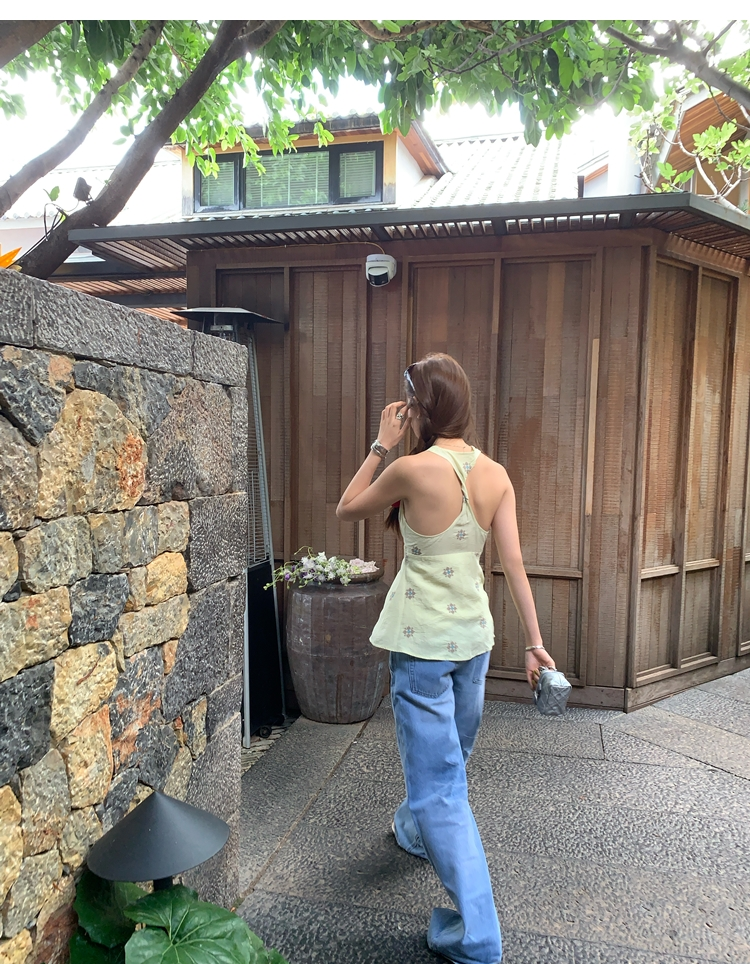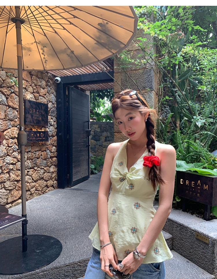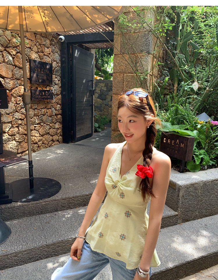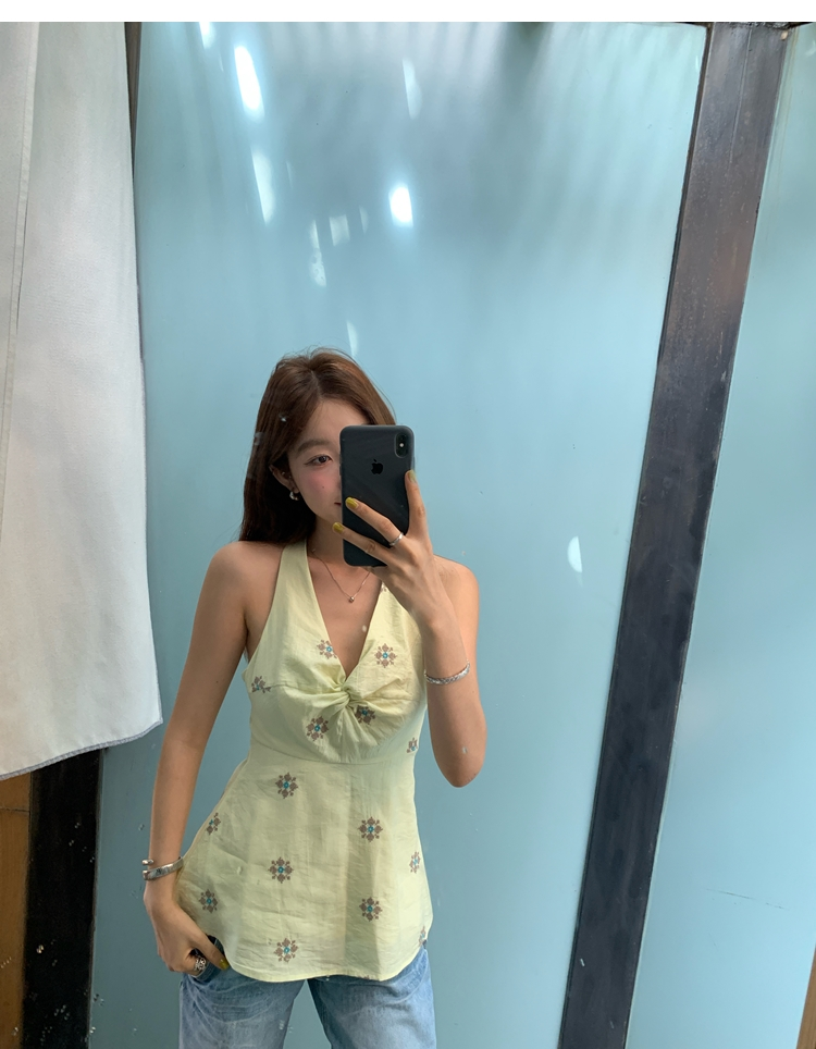 Silk Embroidery Sweet V-neck Twisted Necklace Sleeveless Tank Top