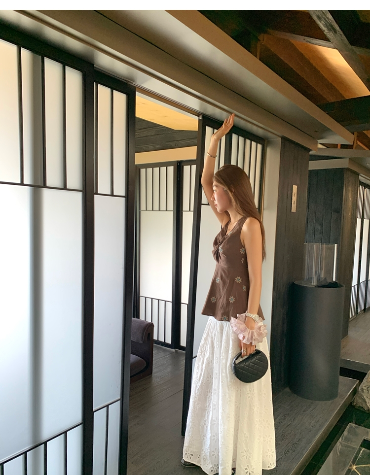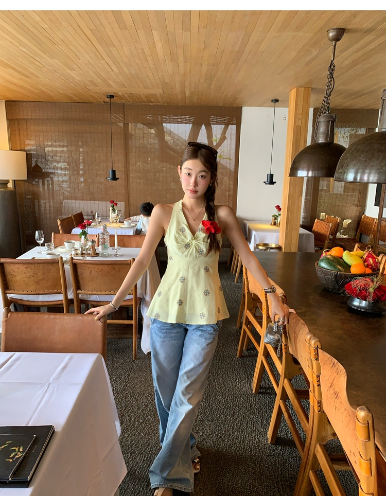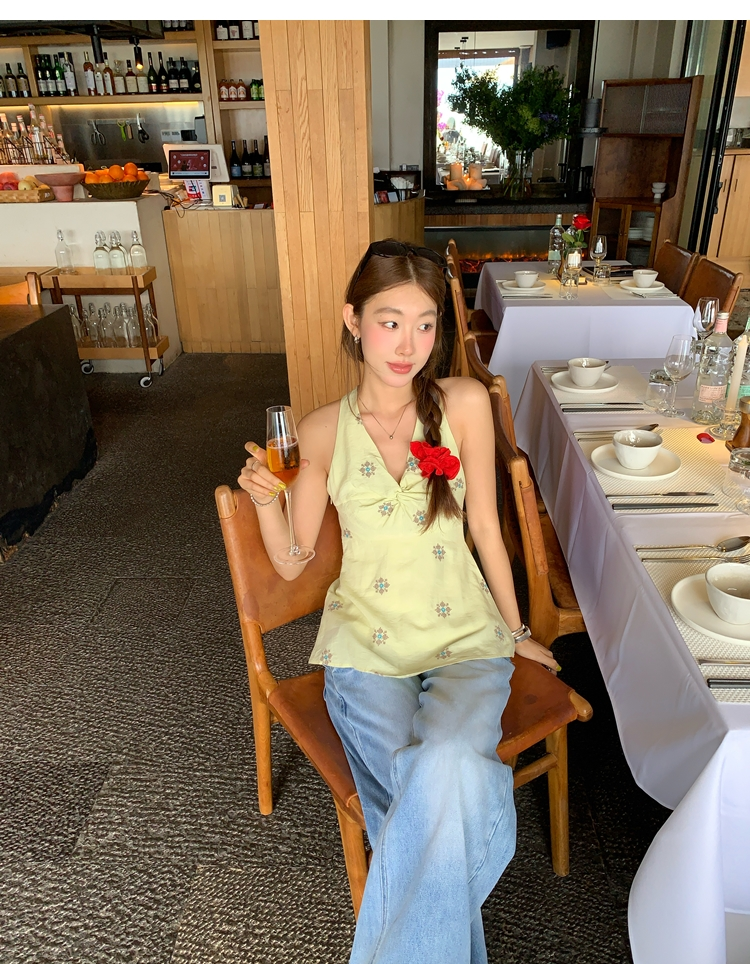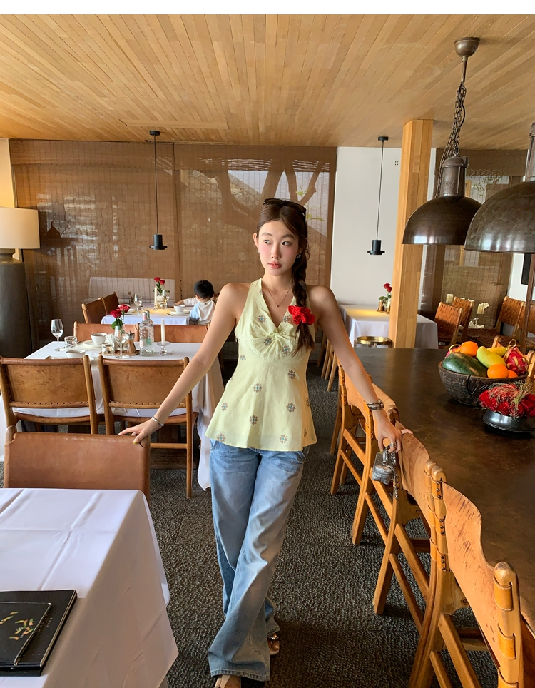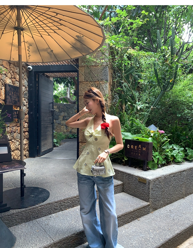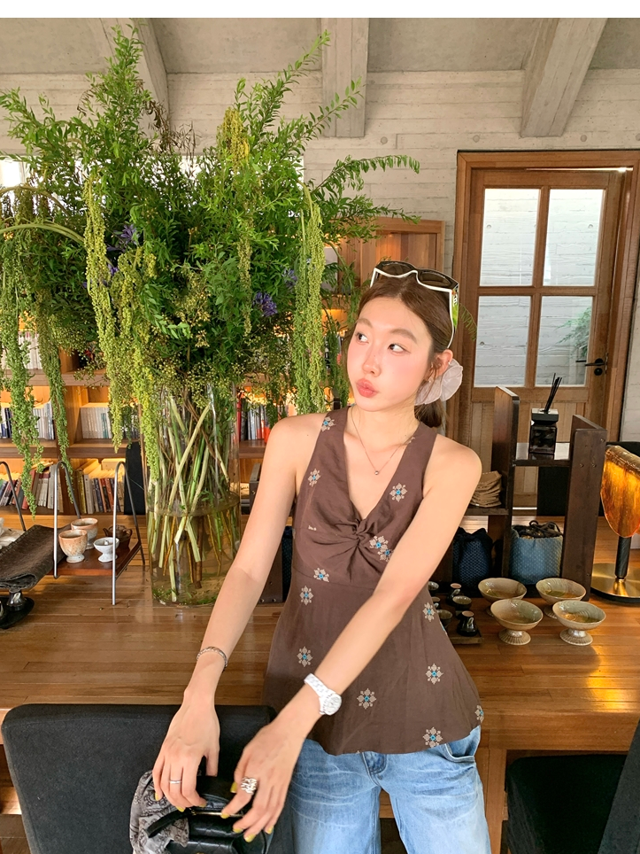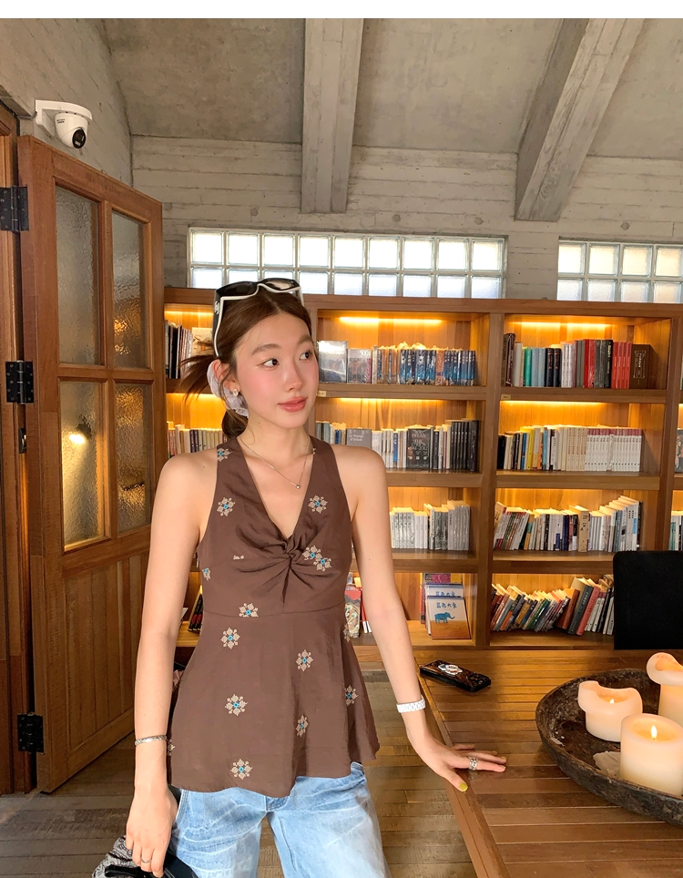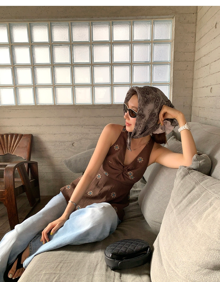 Silk Embroidery Sweet V-neck Twisted Necklace Sleeveless Tank Top