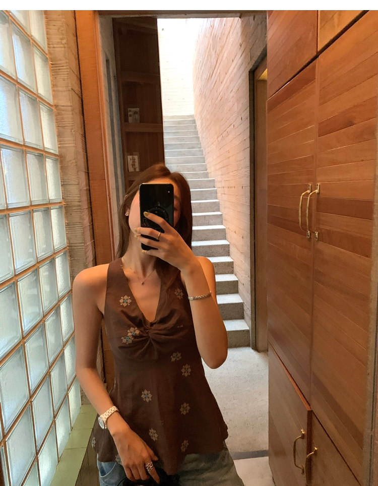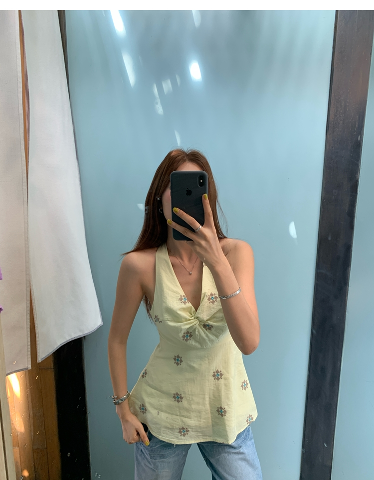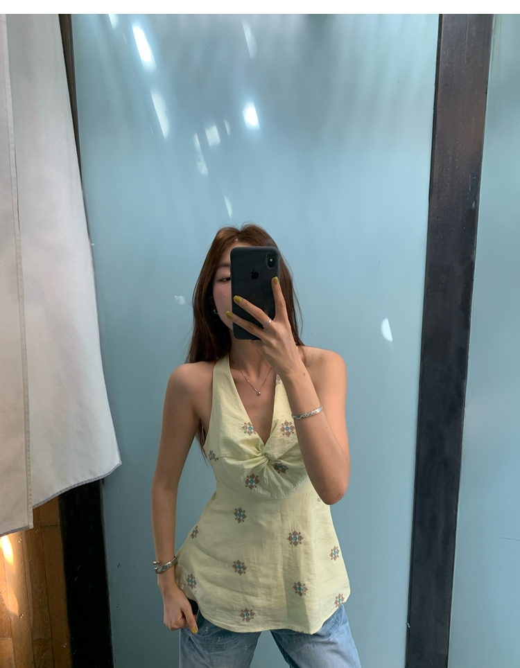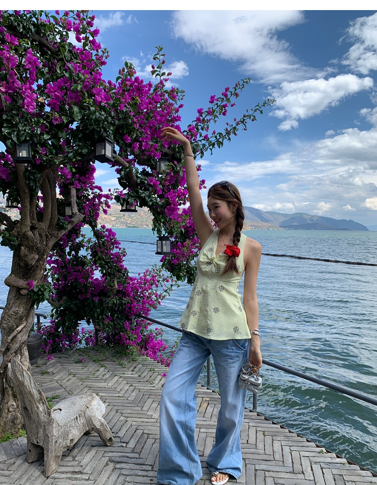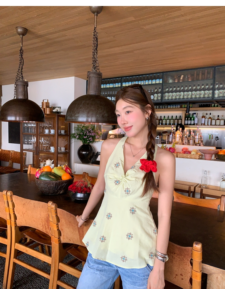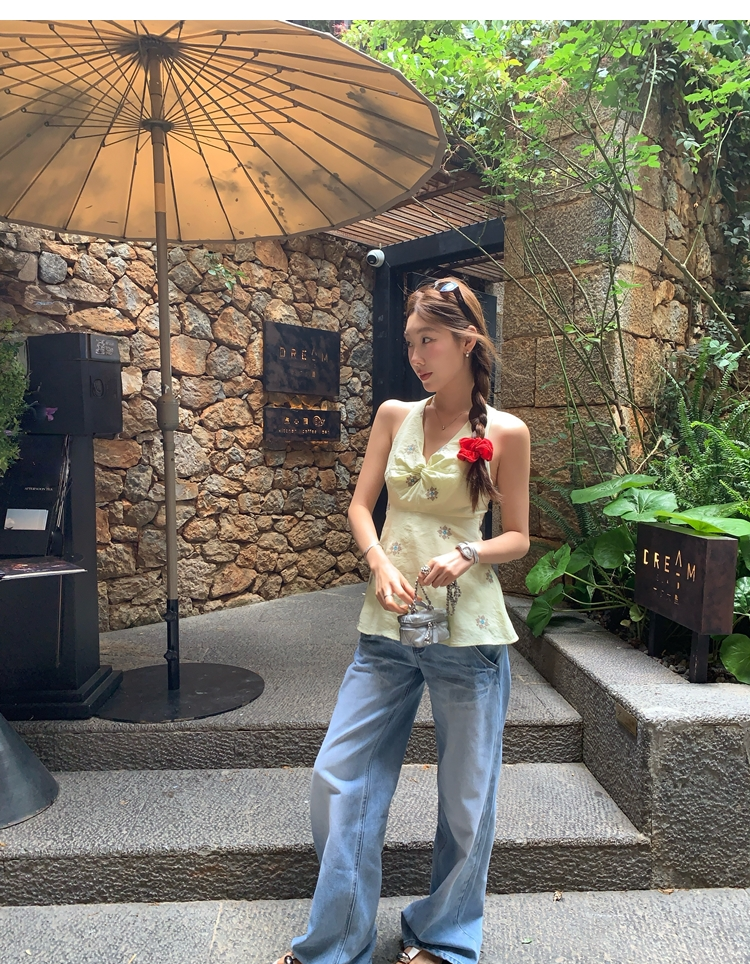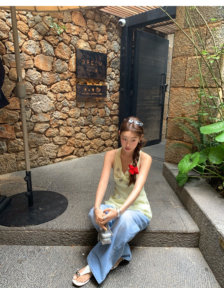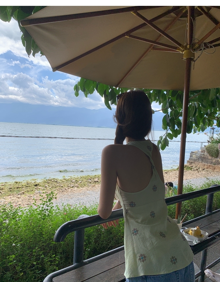 Silk Embroidery Sweet V-neck Twisted Necklace Sleeveless Tank Top