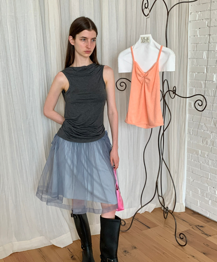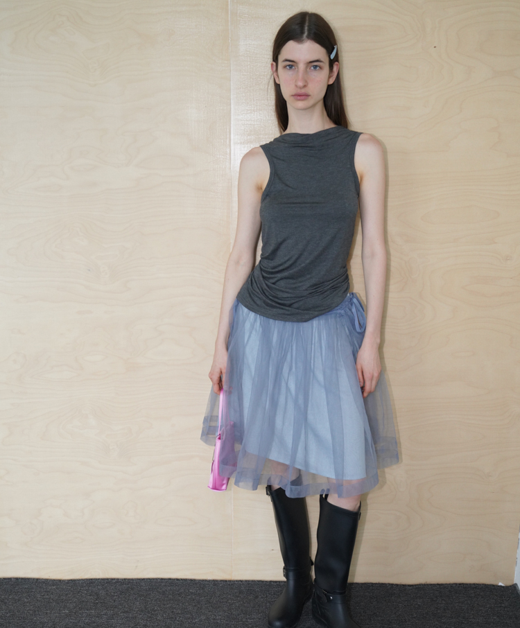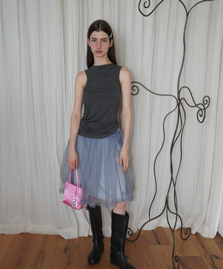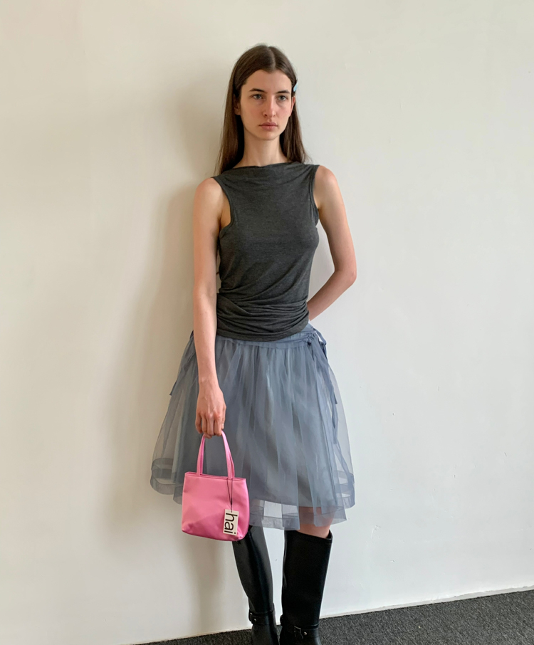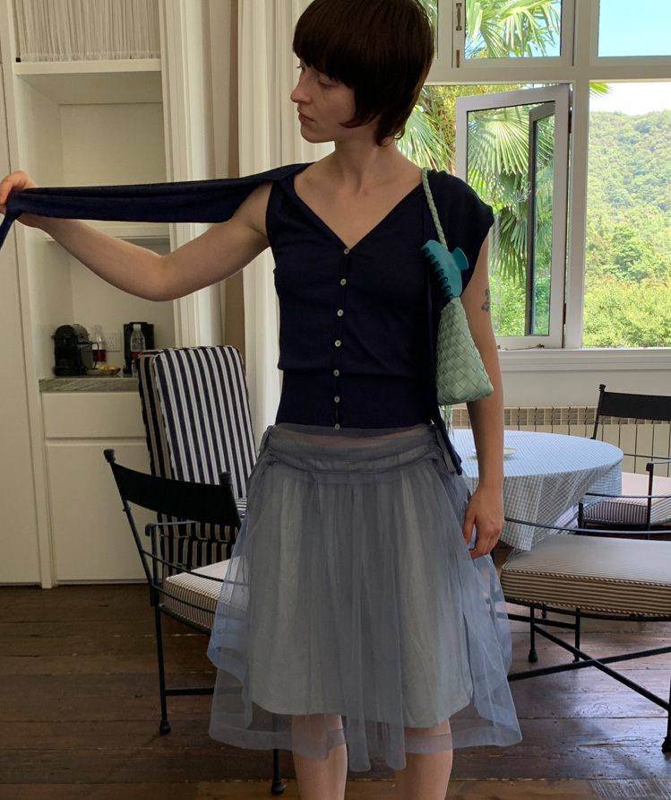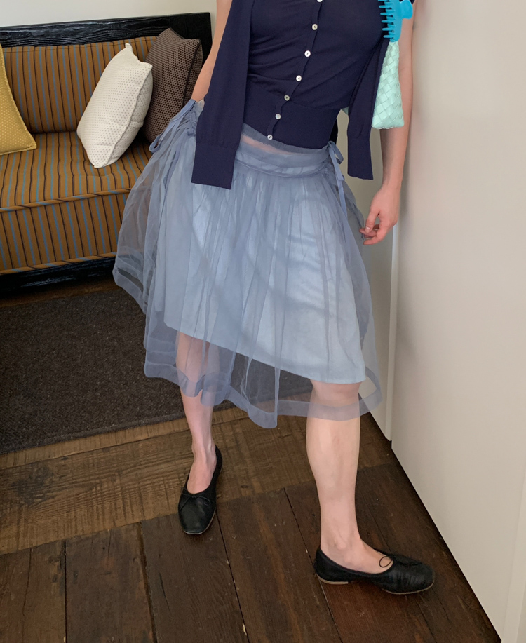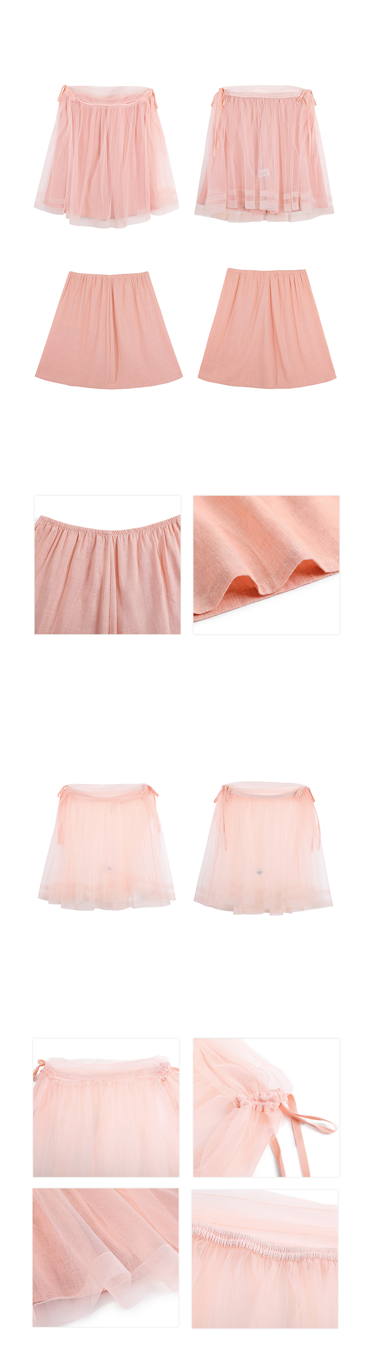 Blogge linen blended stacked wide-waisted tuck mesh half skirt