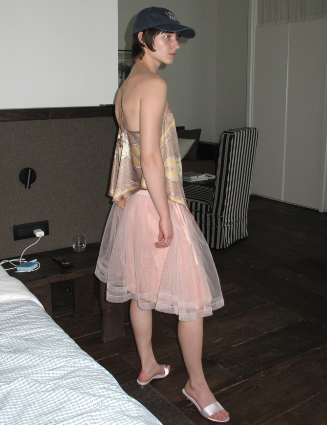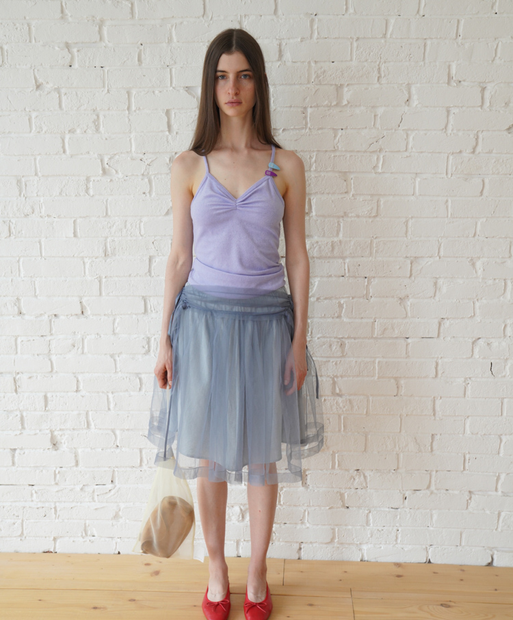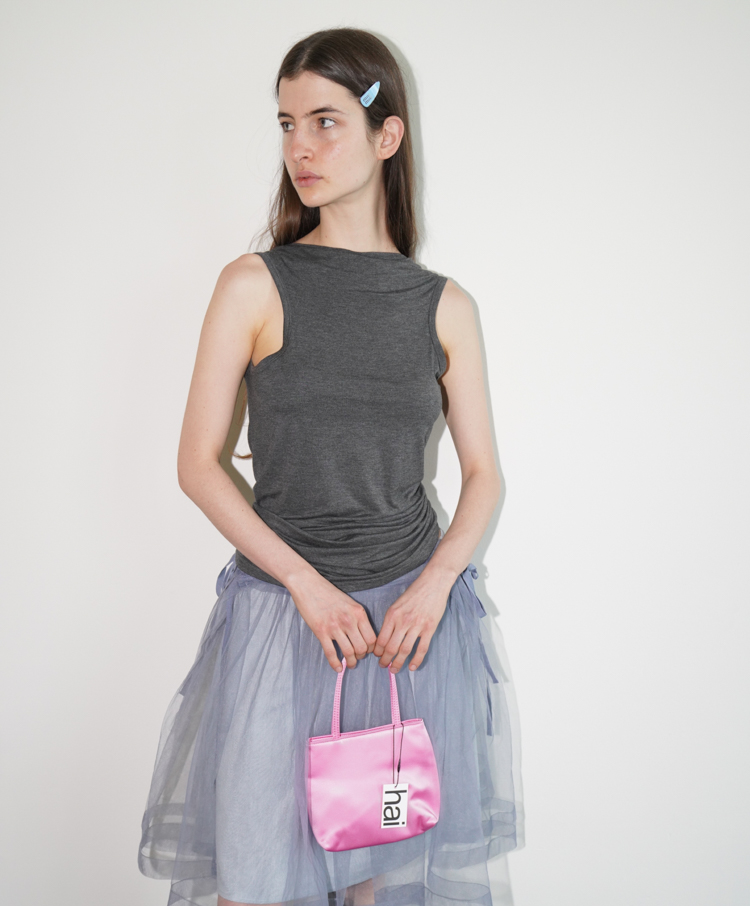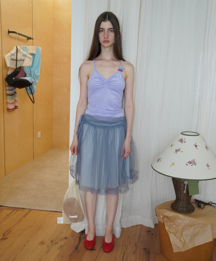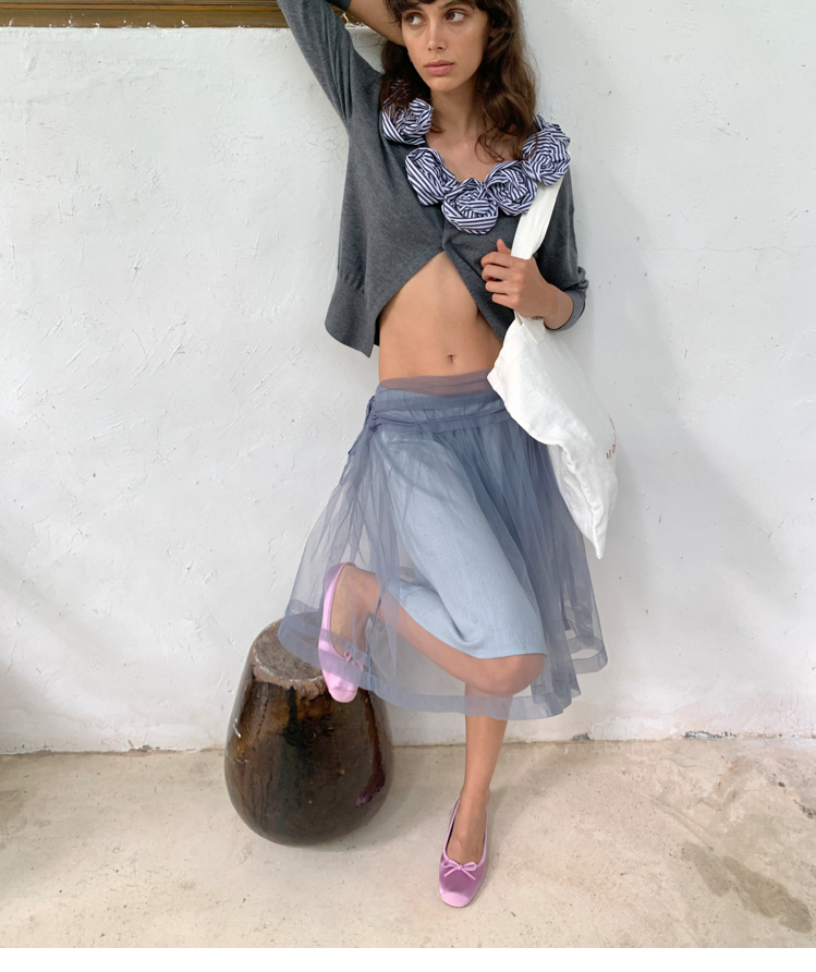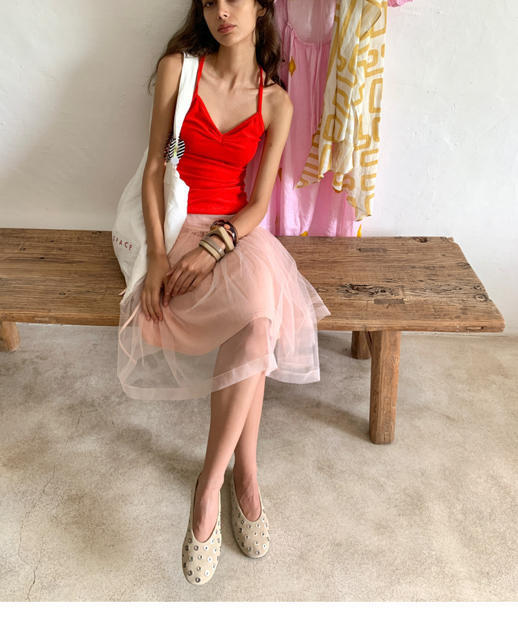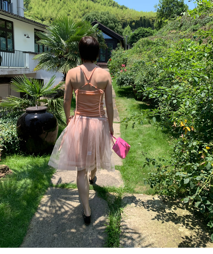 Blogge linen blended stacked wide-waisted tuck mesh half skirt