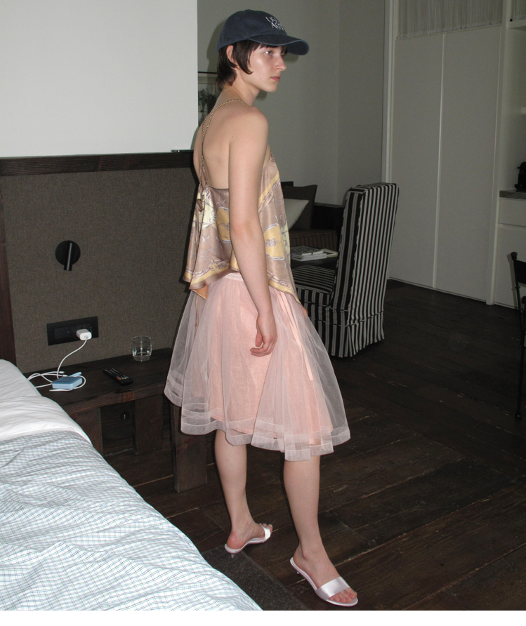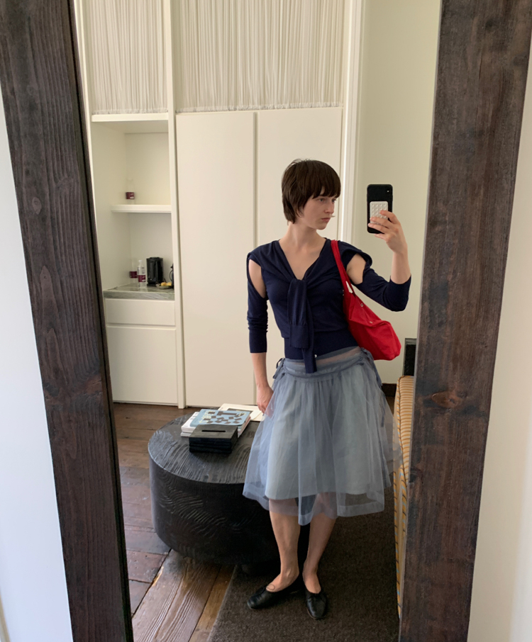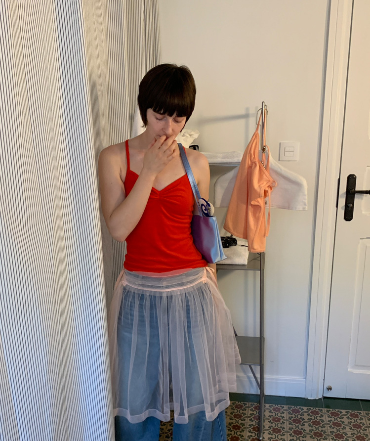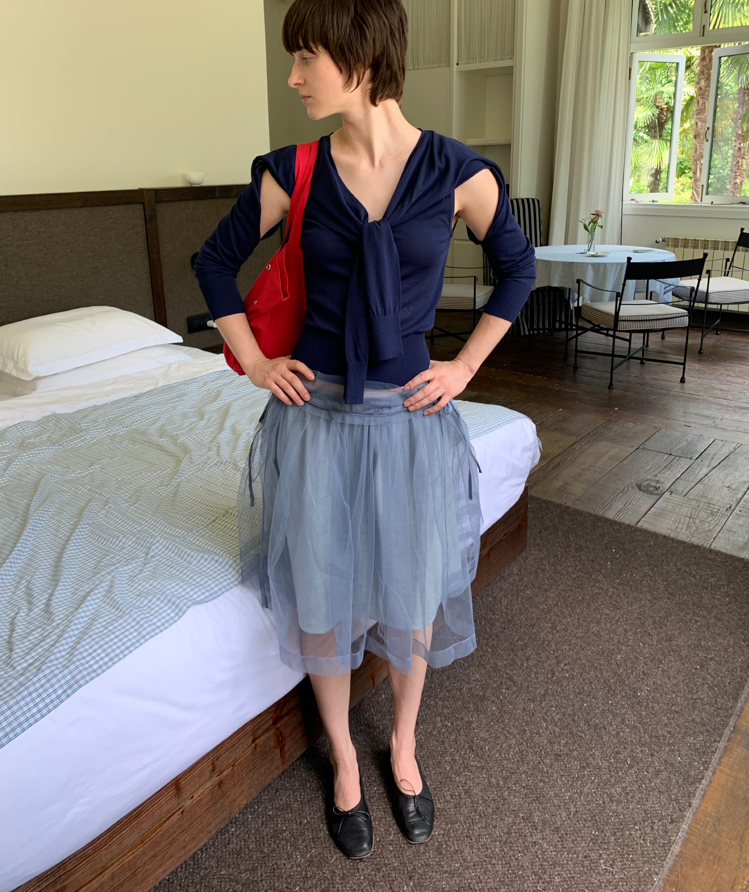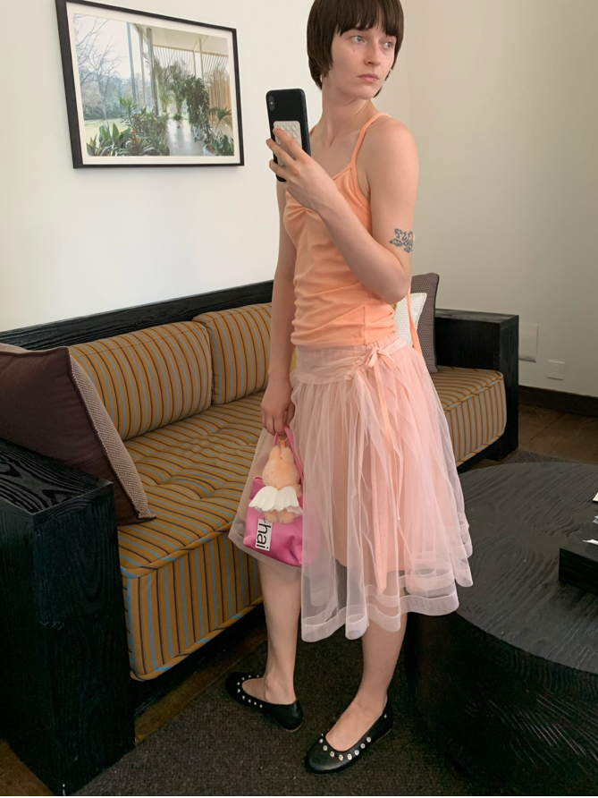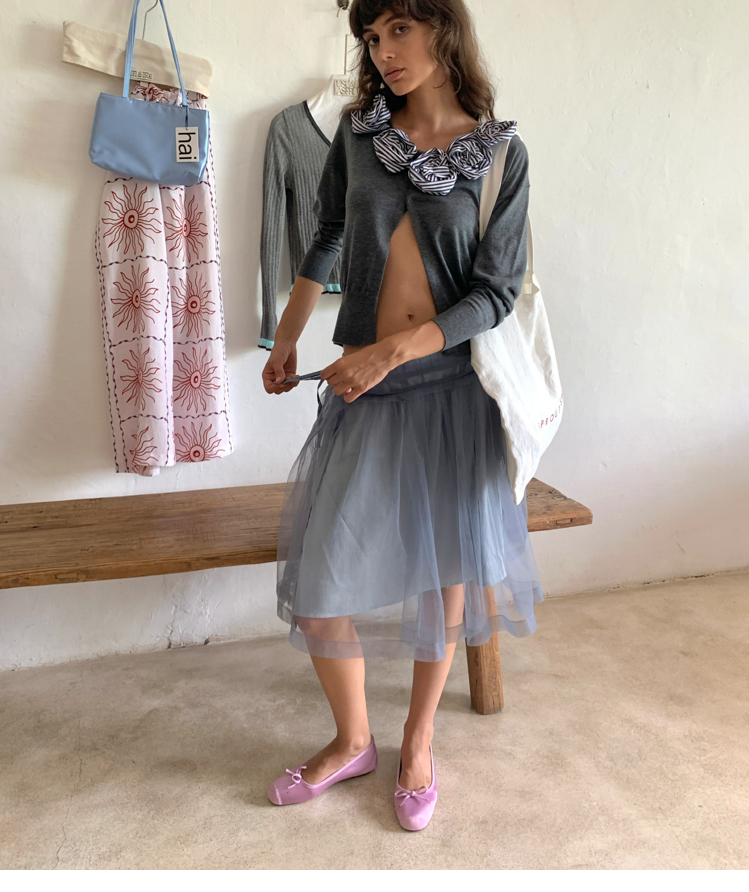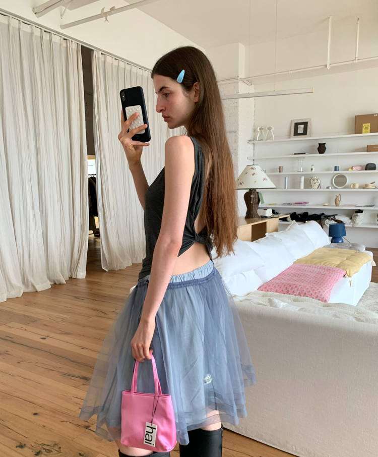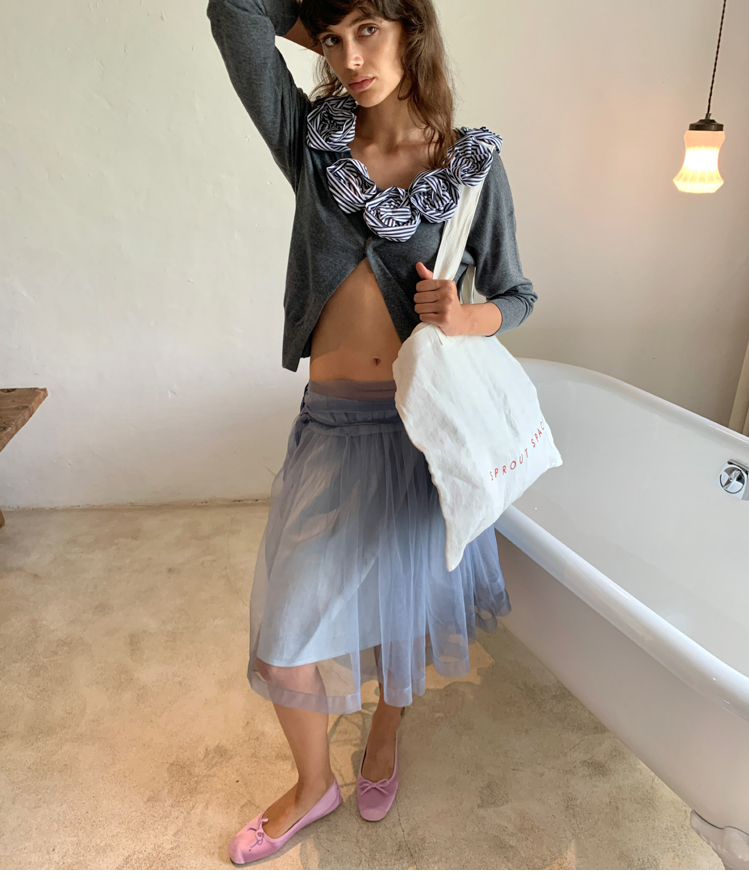 Blogge linen blended stacked wide-waisted tuck mesh half skirt