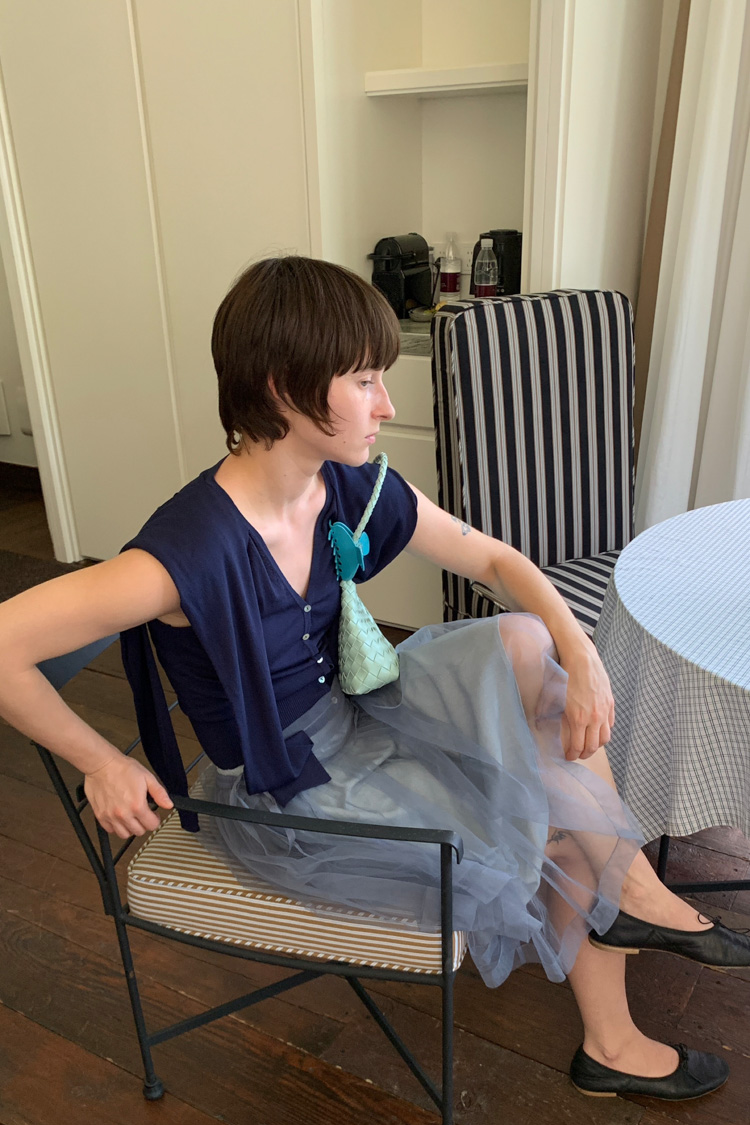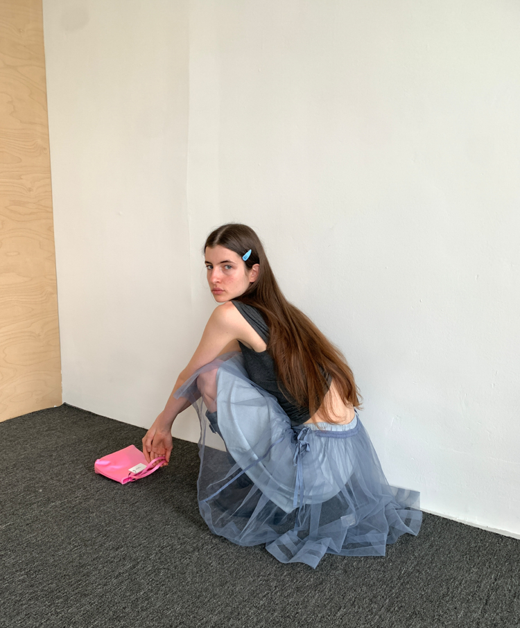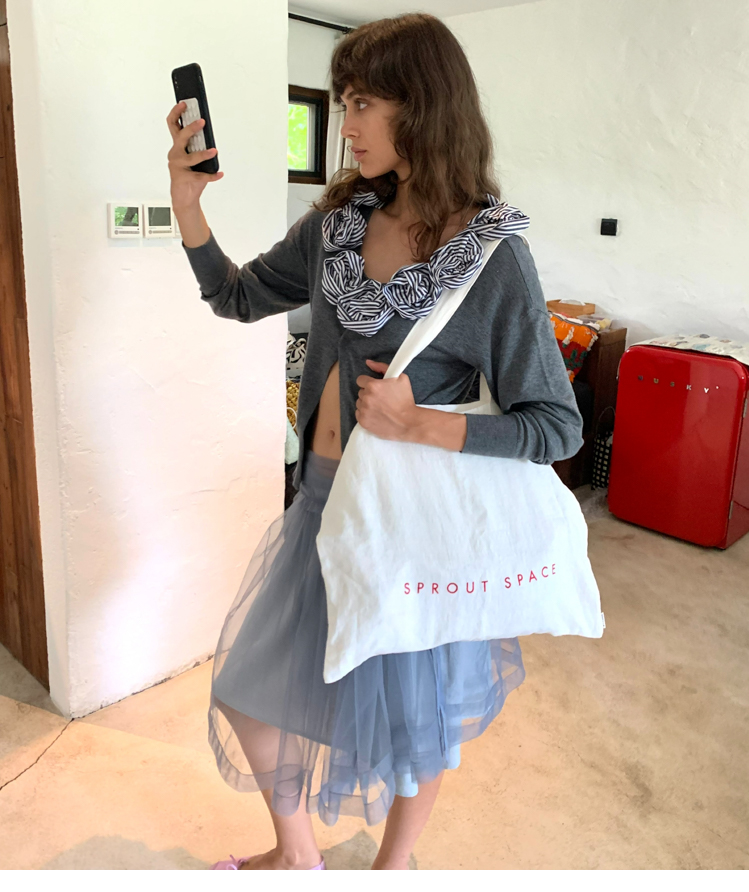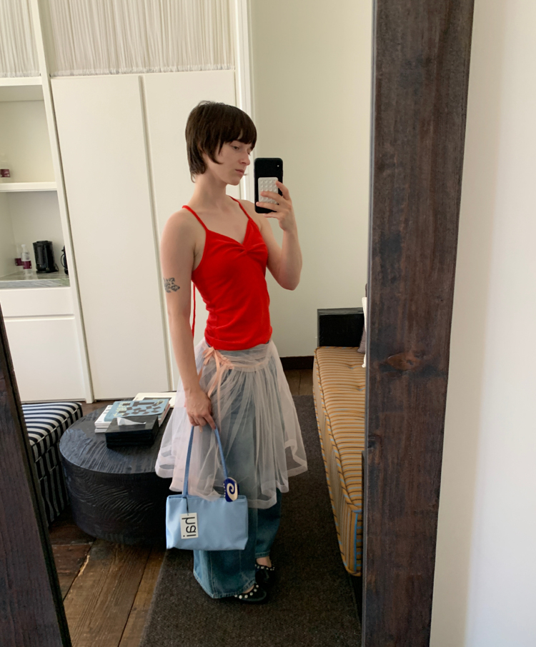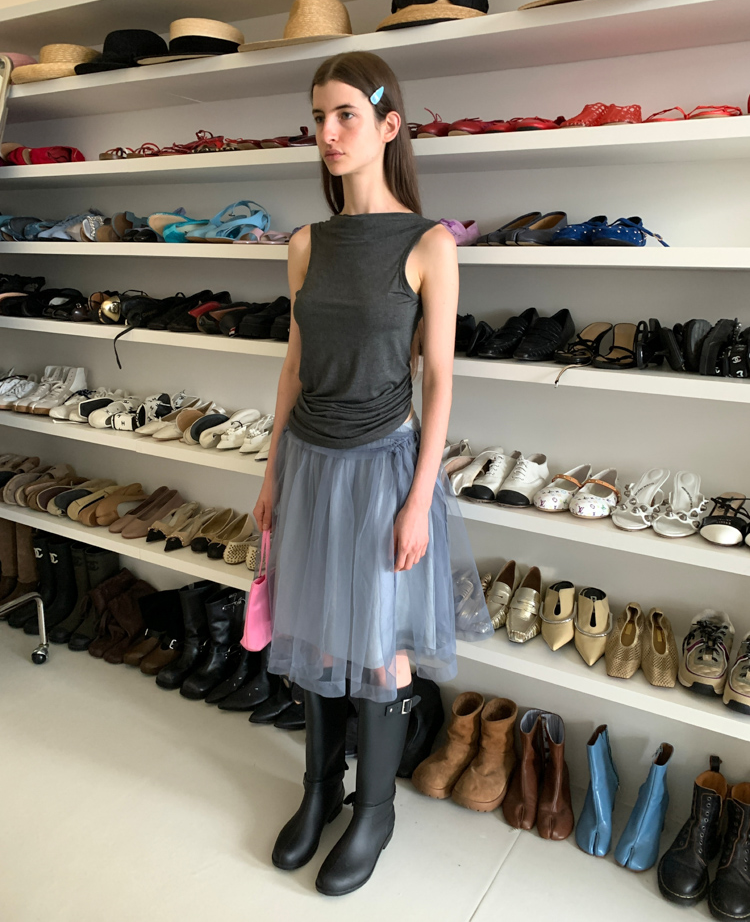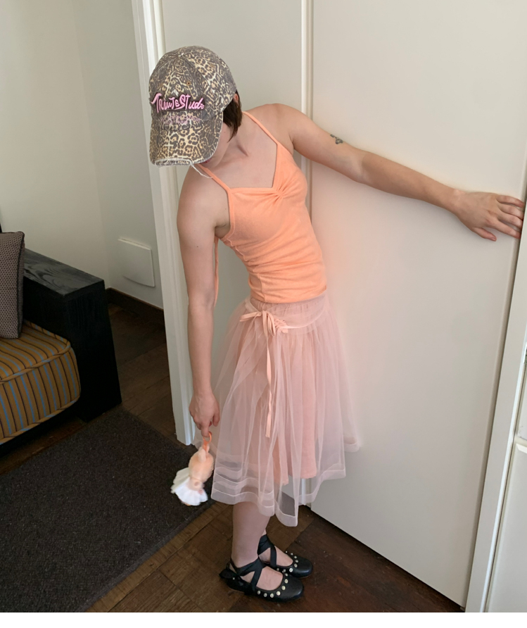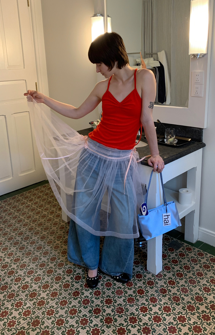 Blogge linen blended stacked wide-waisted tuck mesh half skirt