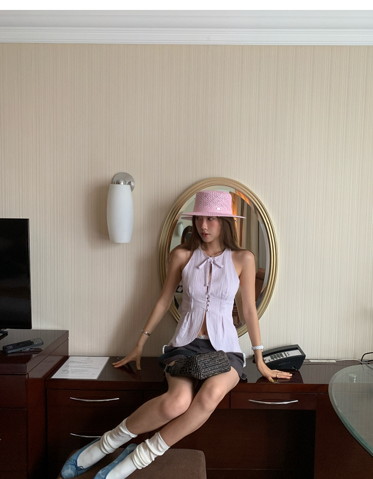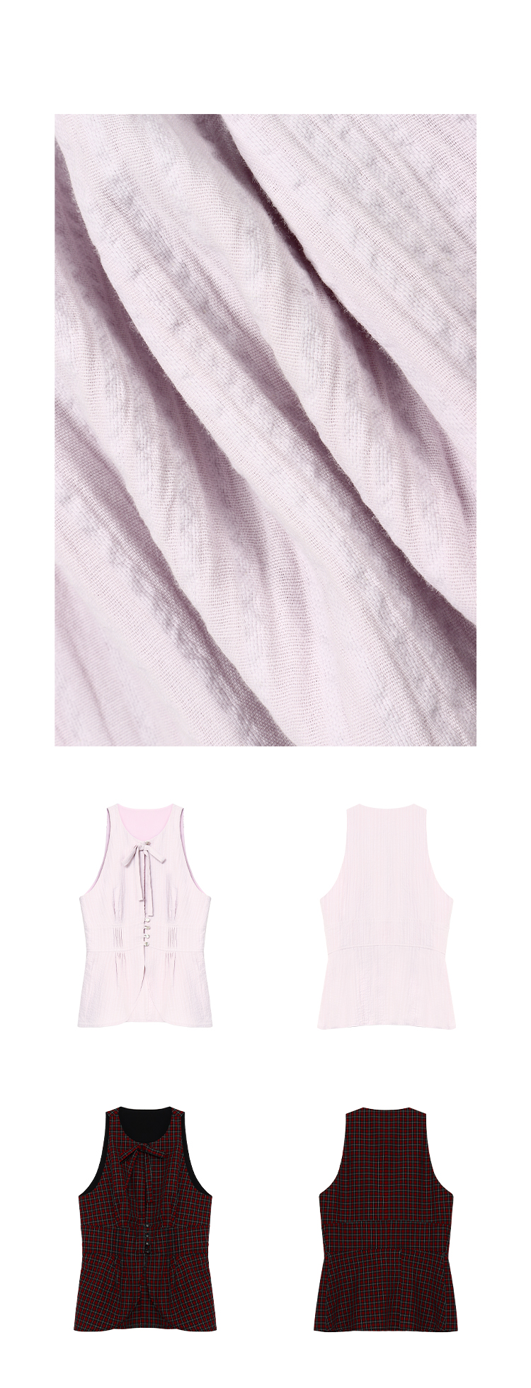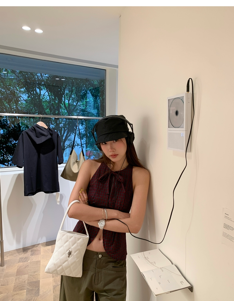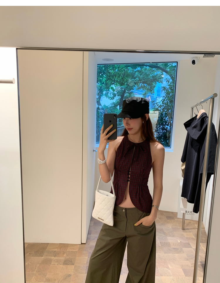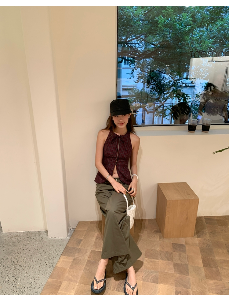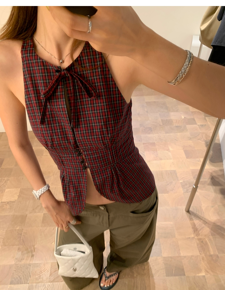 Art Museum French Bow Button Vintage Plaid Sleeveless Top