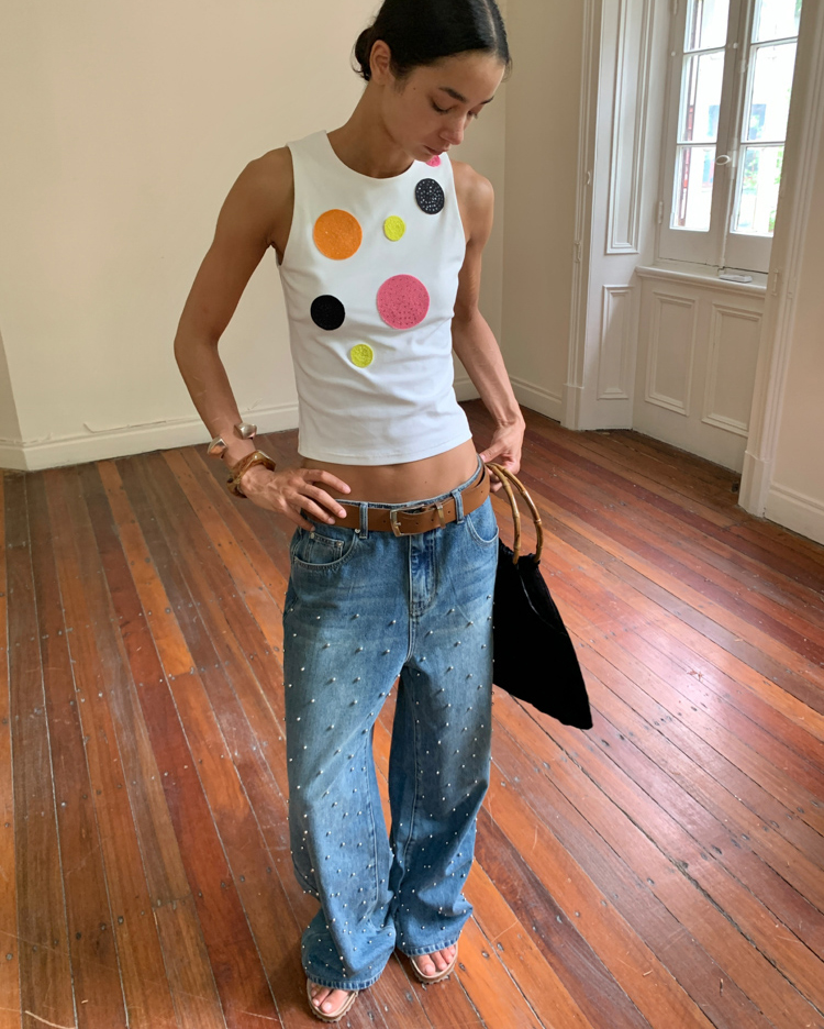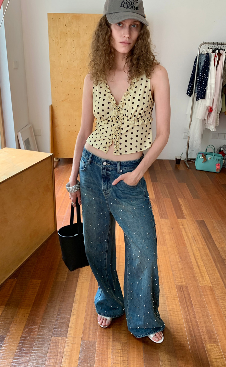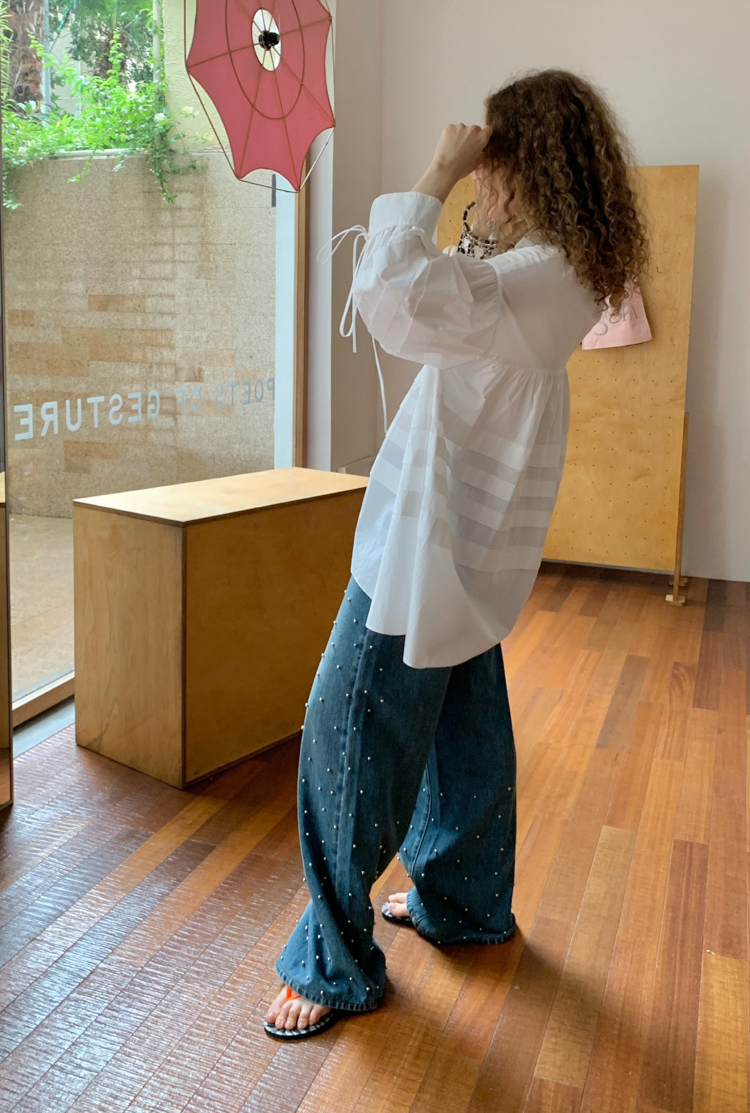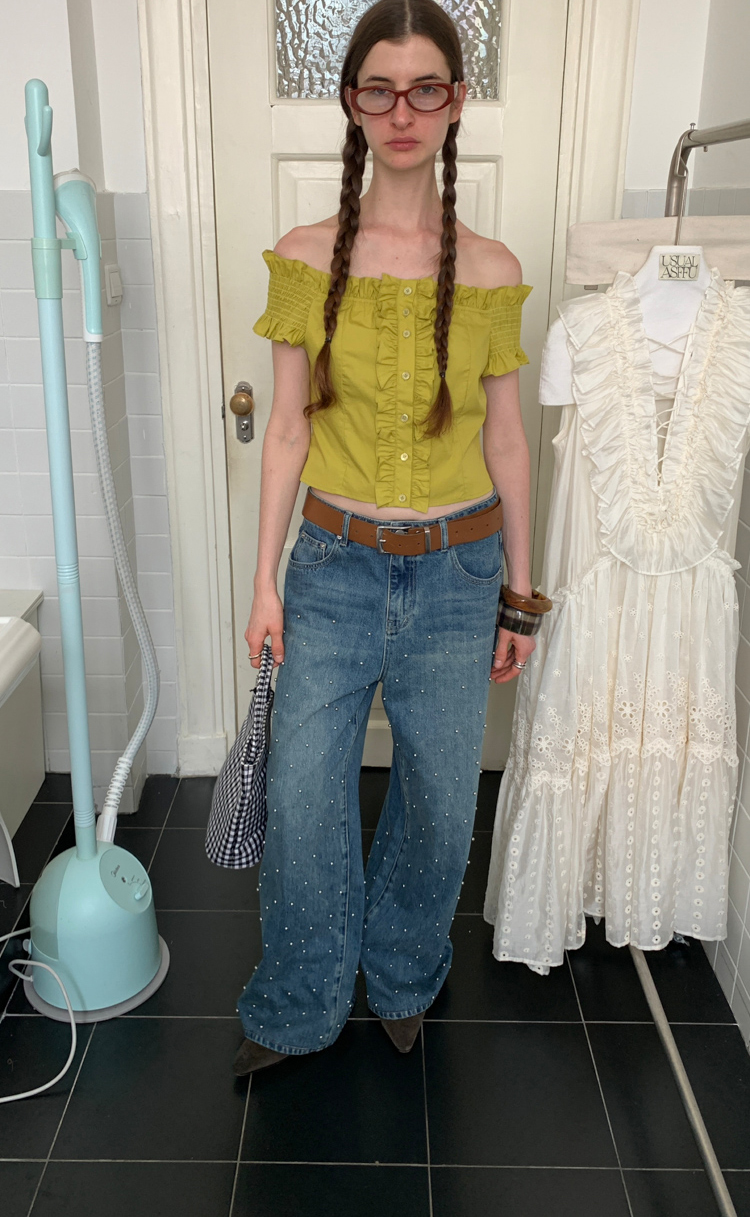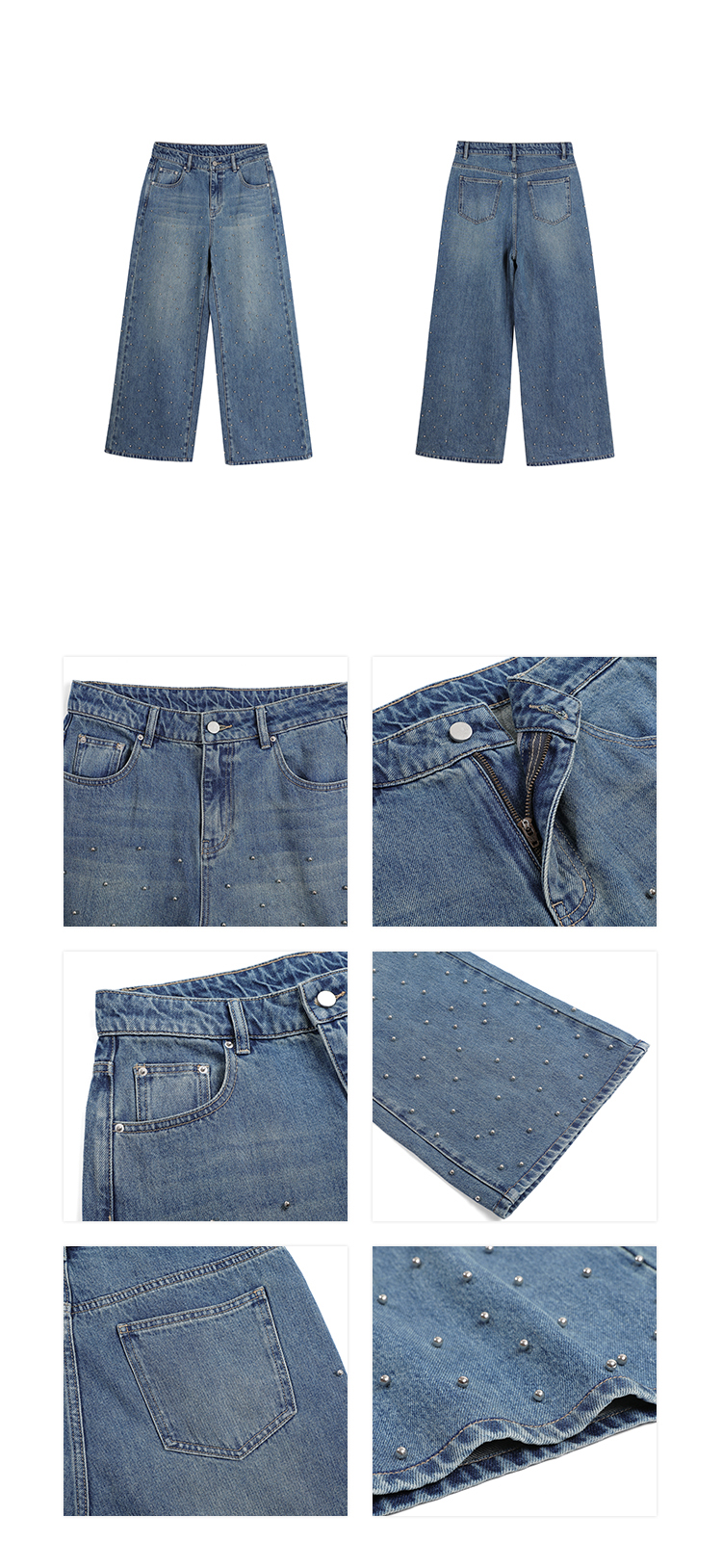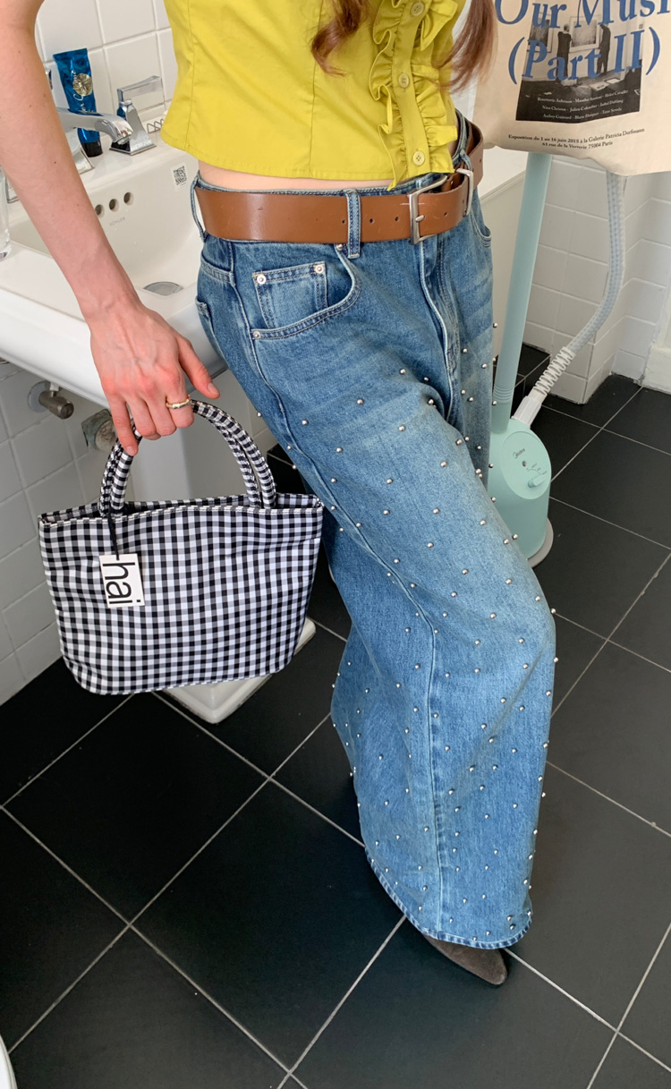 Metal beaded decoration washed wide-leg jeans