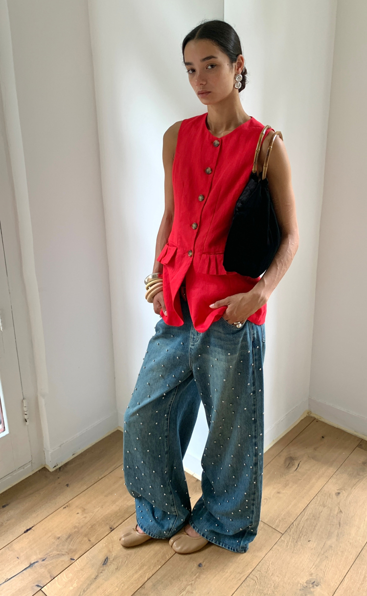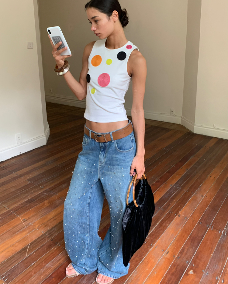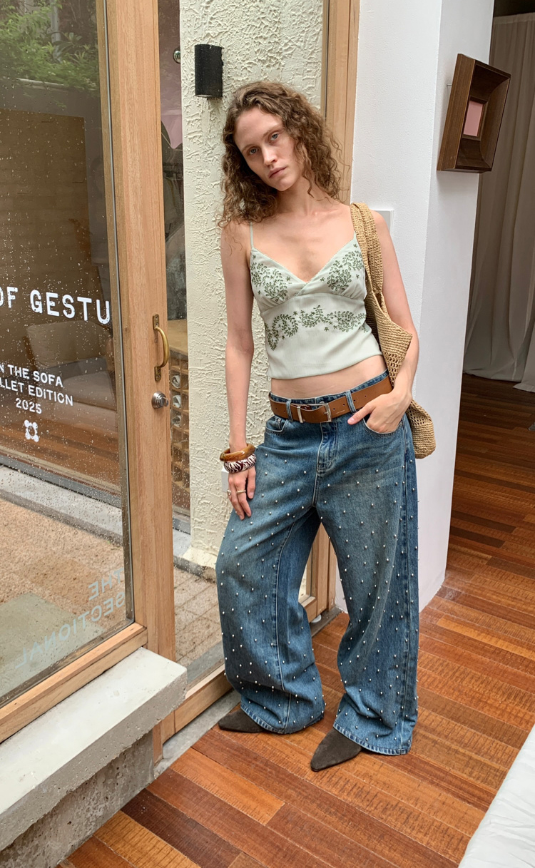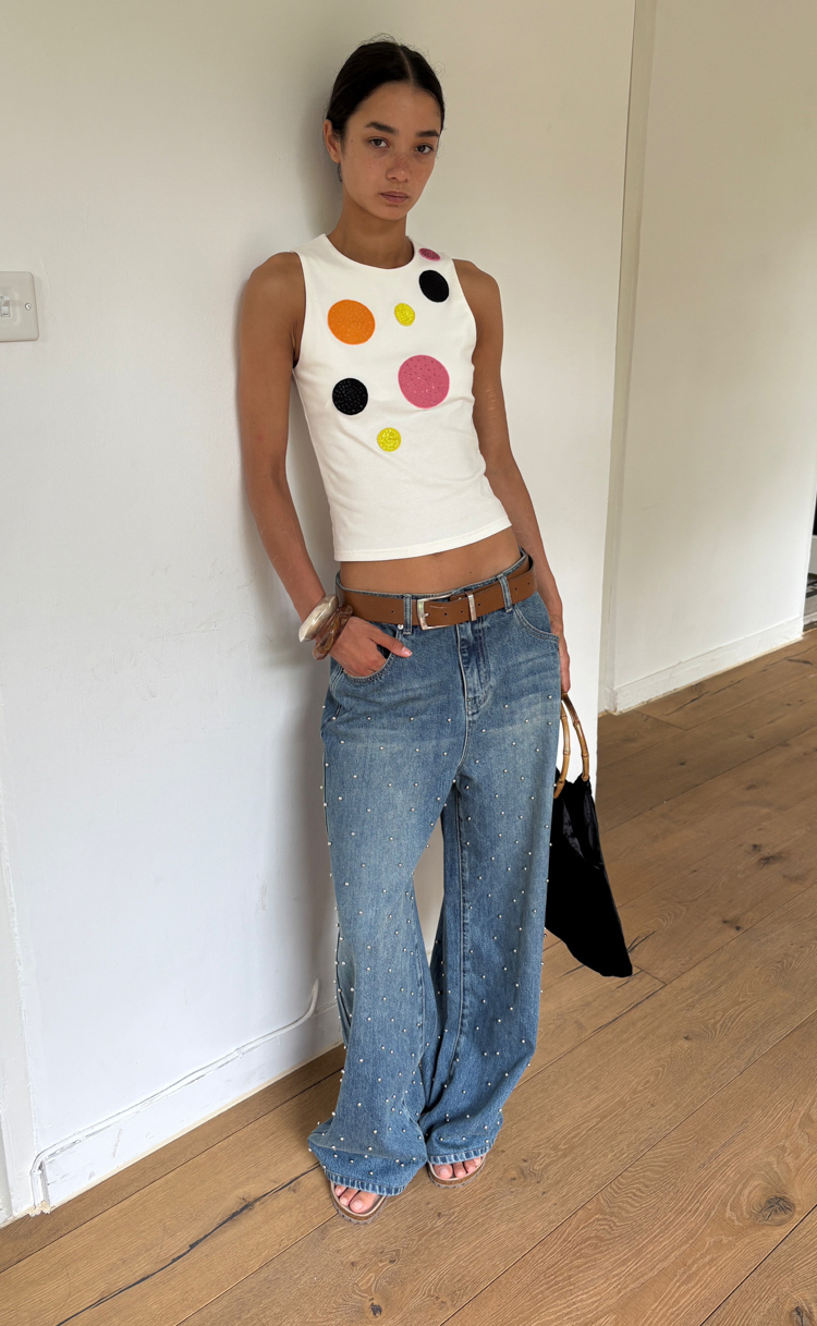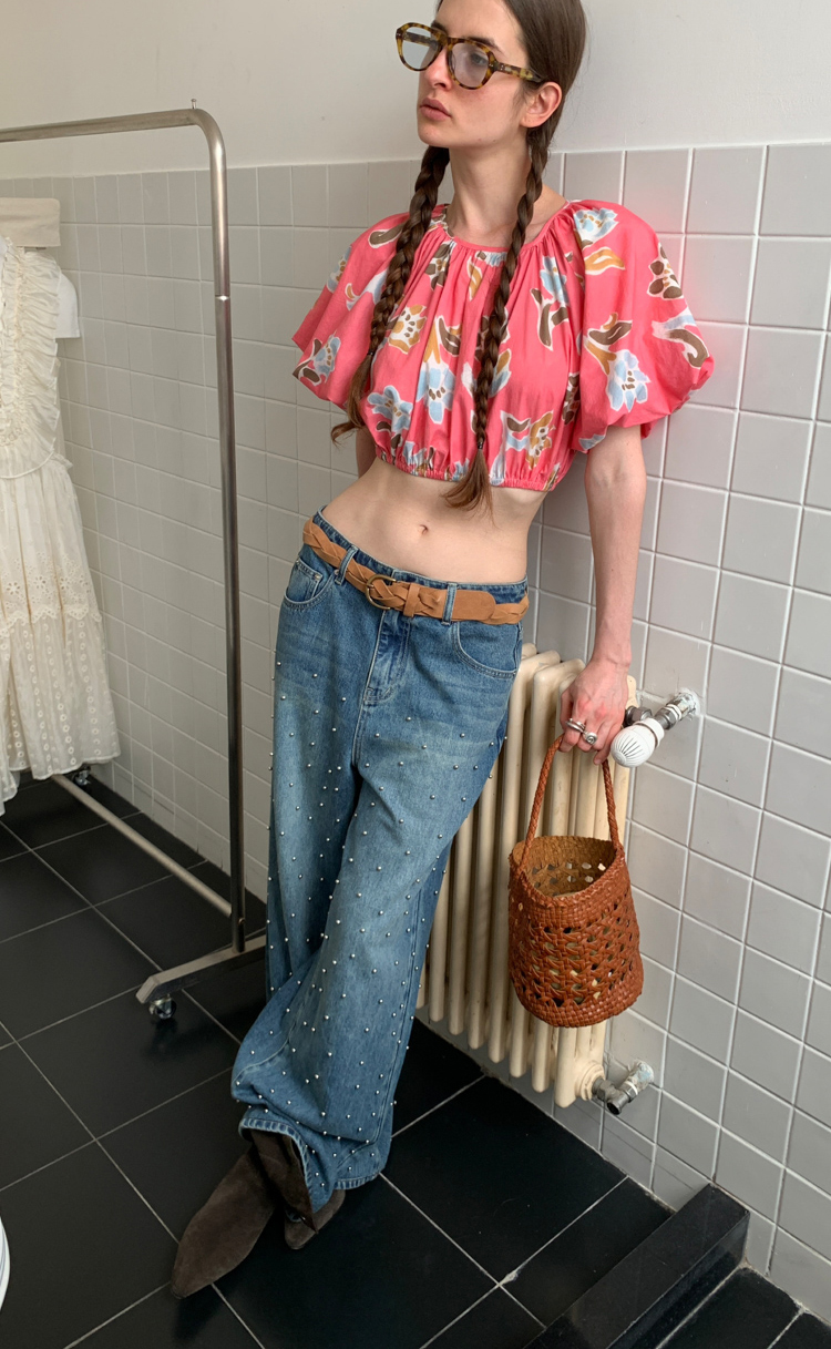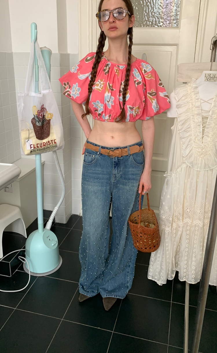 Metal beaded decoration washed wide-leg jeans