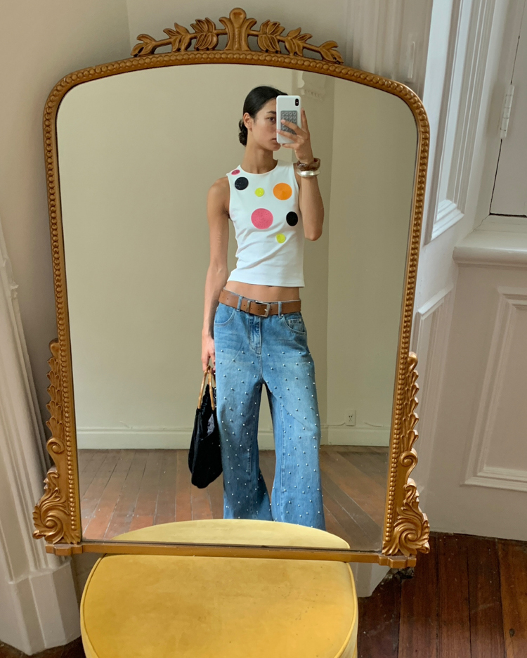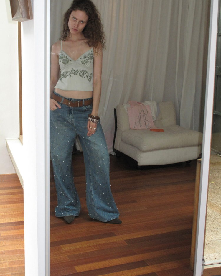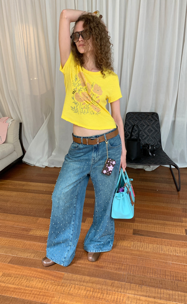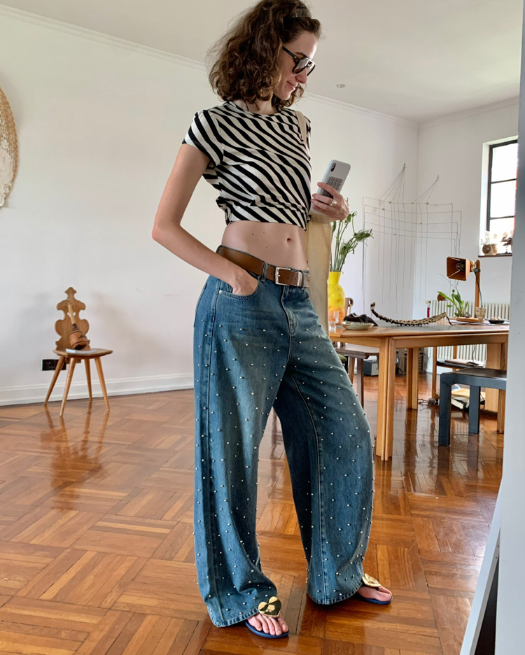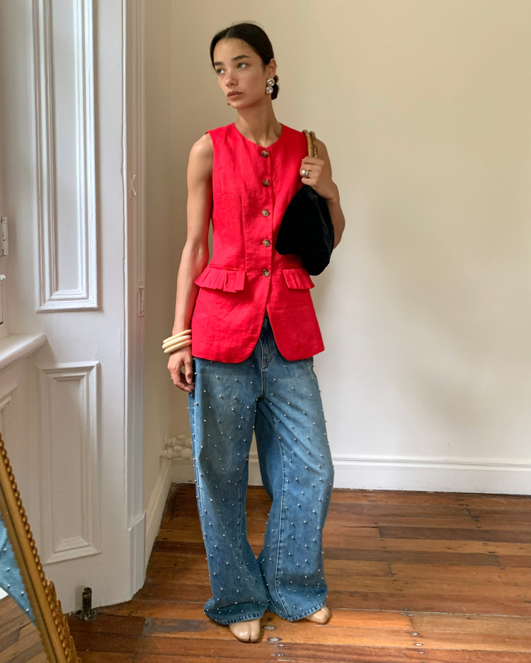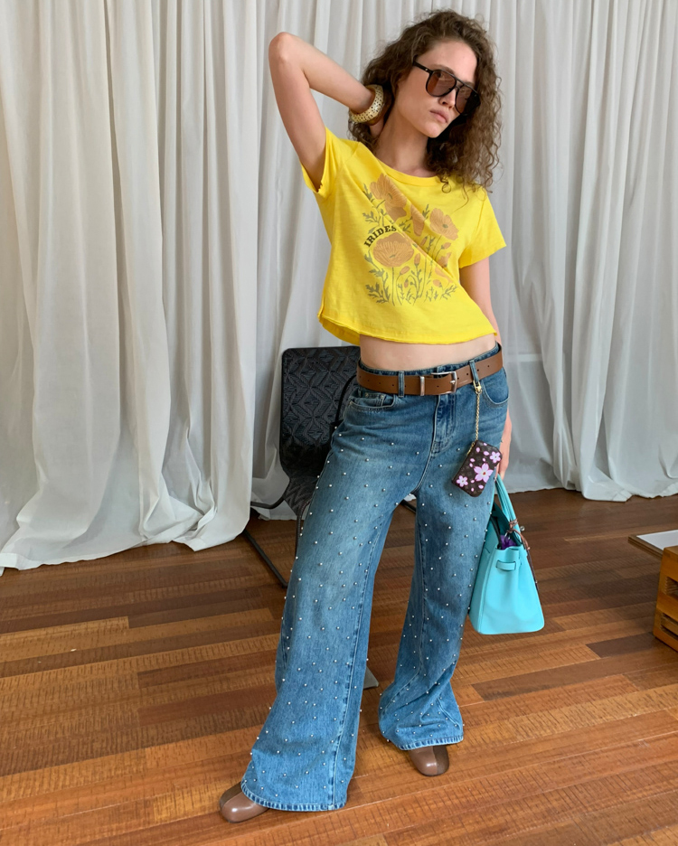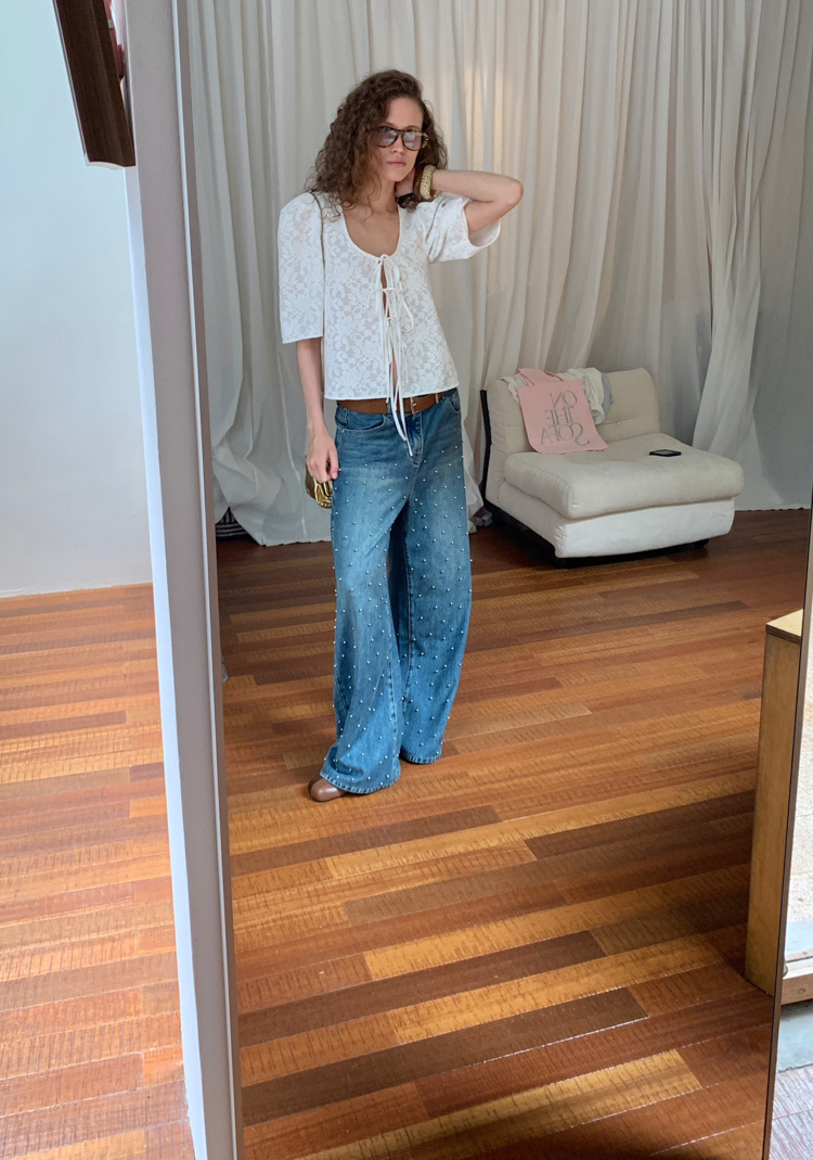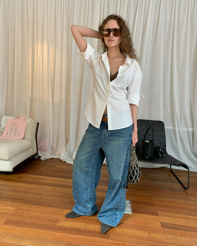 Metal beaded decoration washed wide-leg jeans