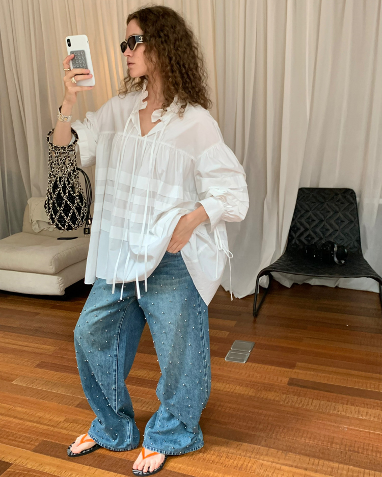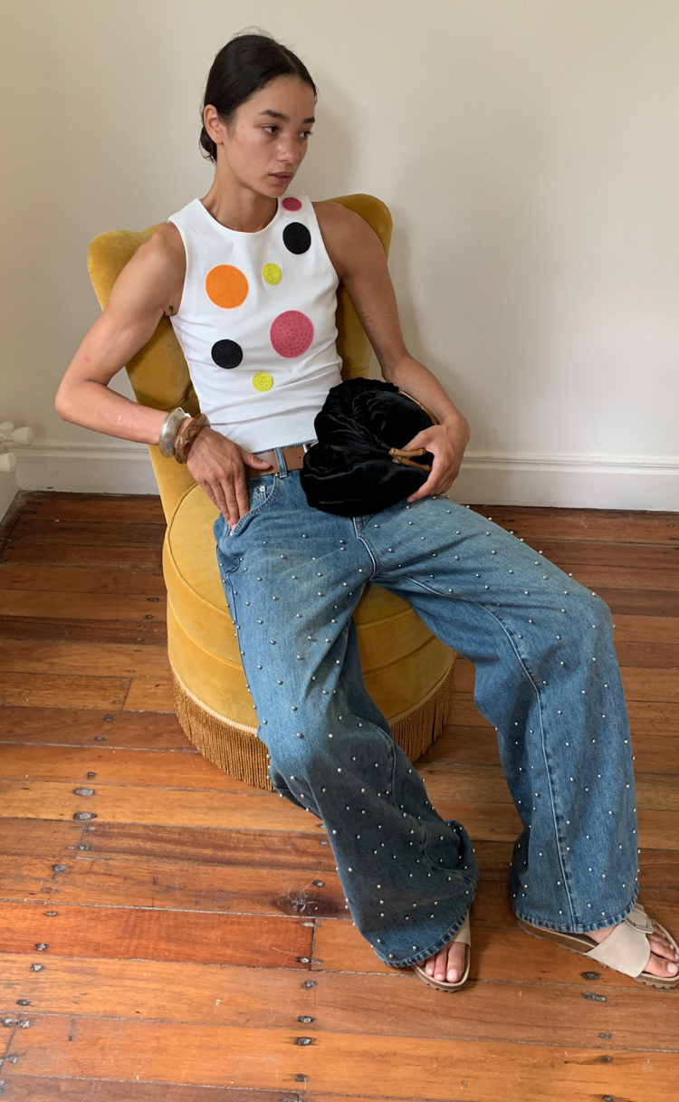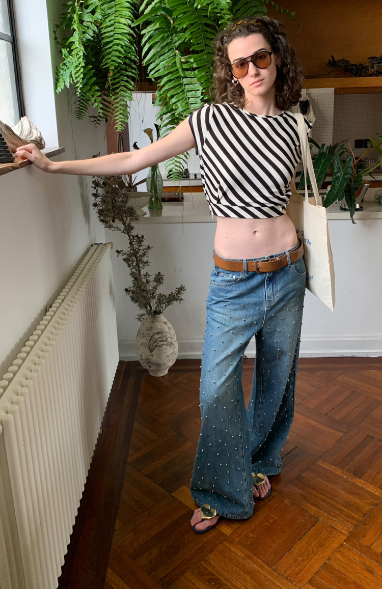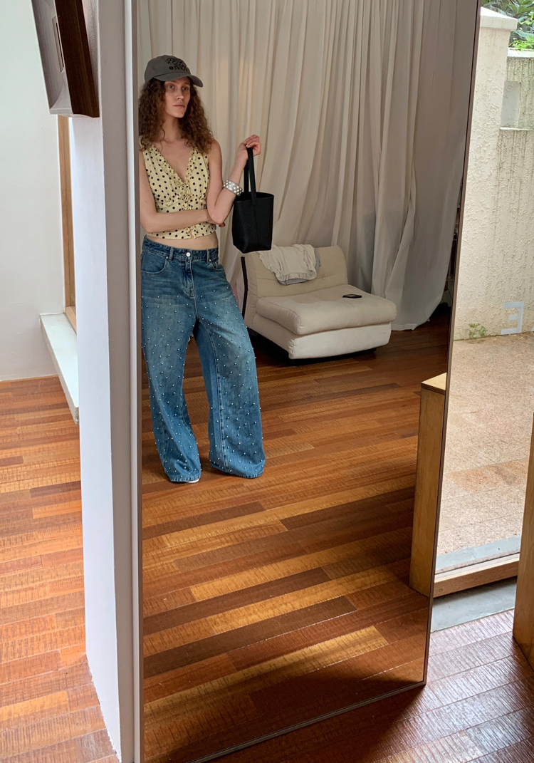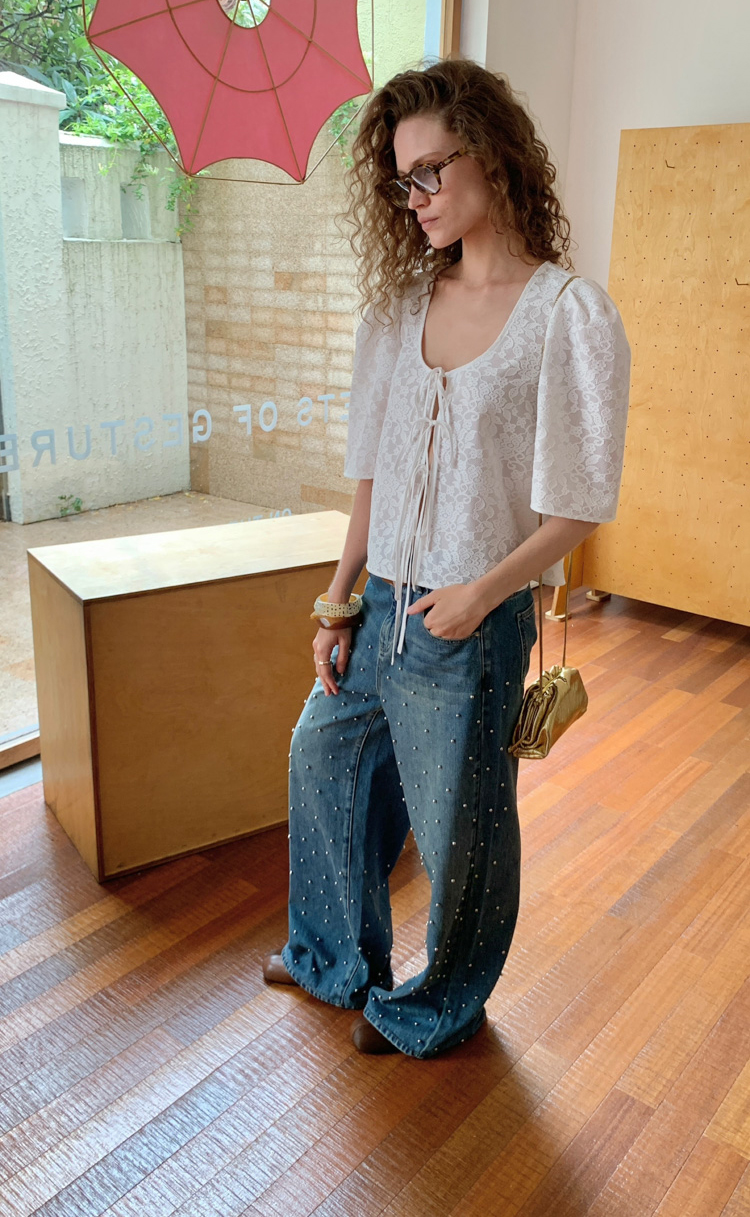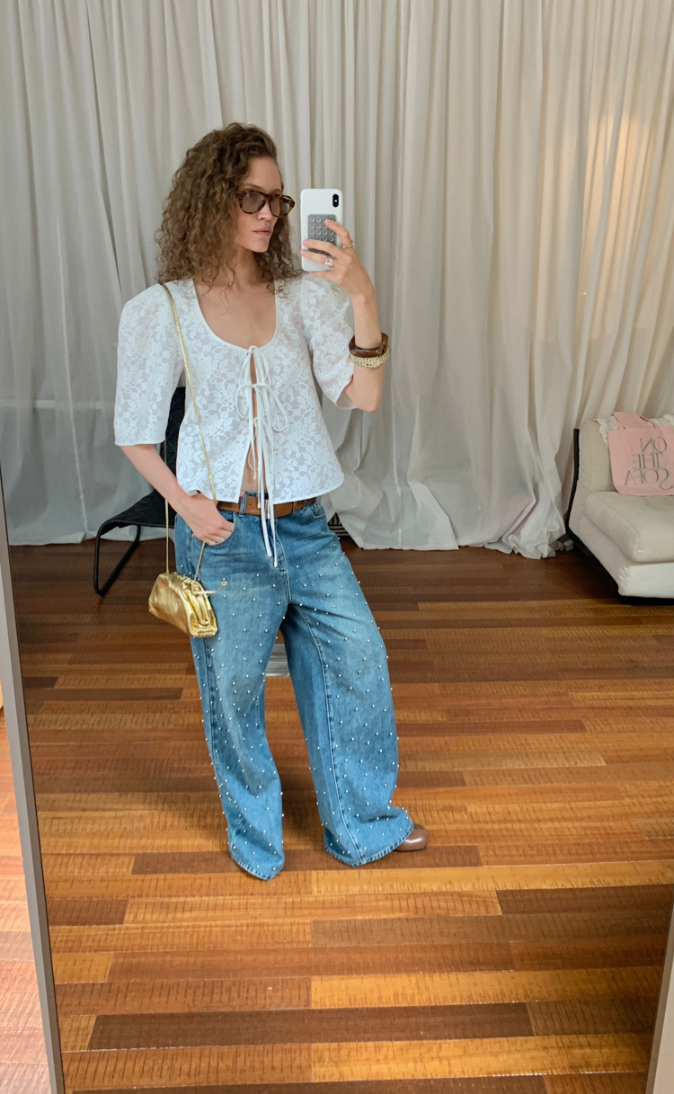 Metal beaded decoration washed wide-leg jeans