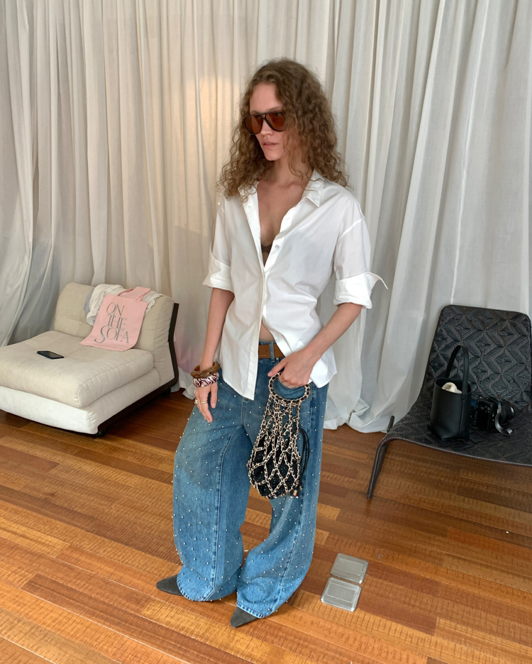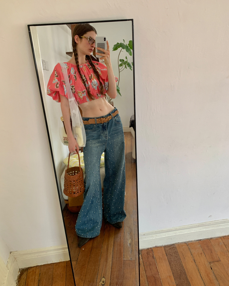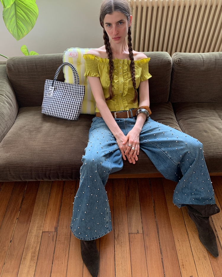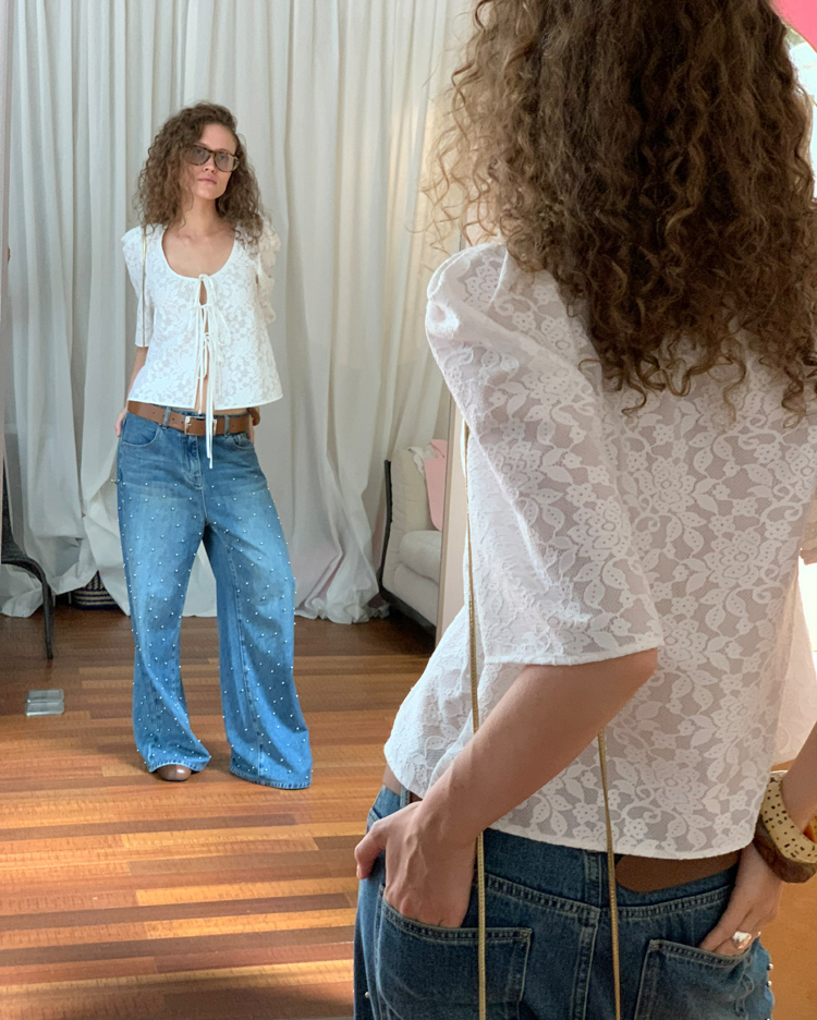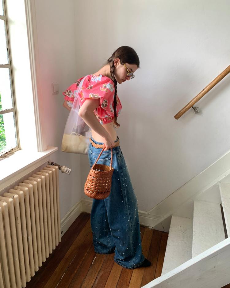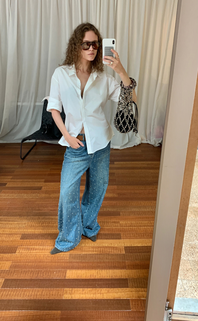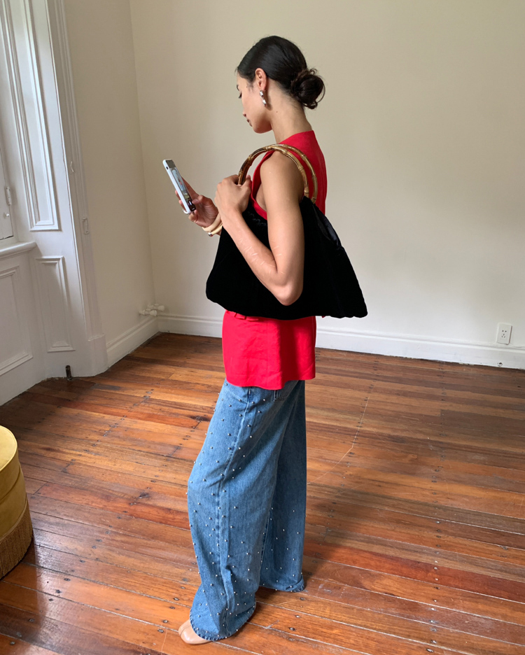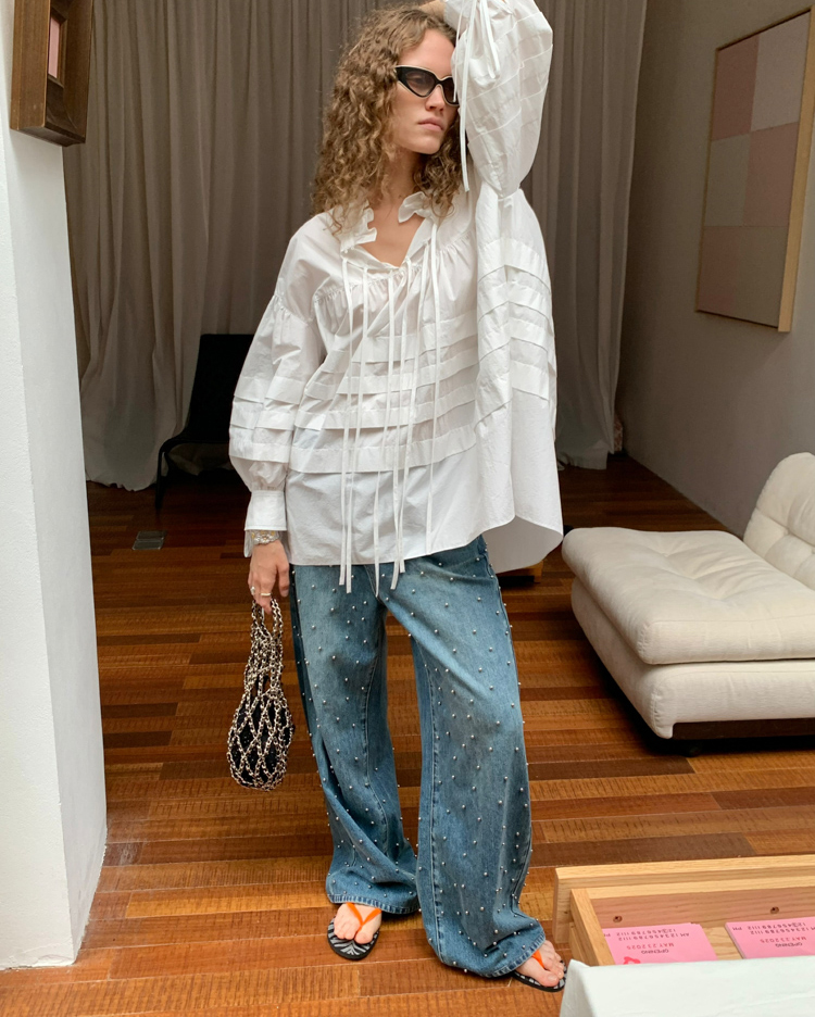 Metal beaded decoration washed wide-leg jeans