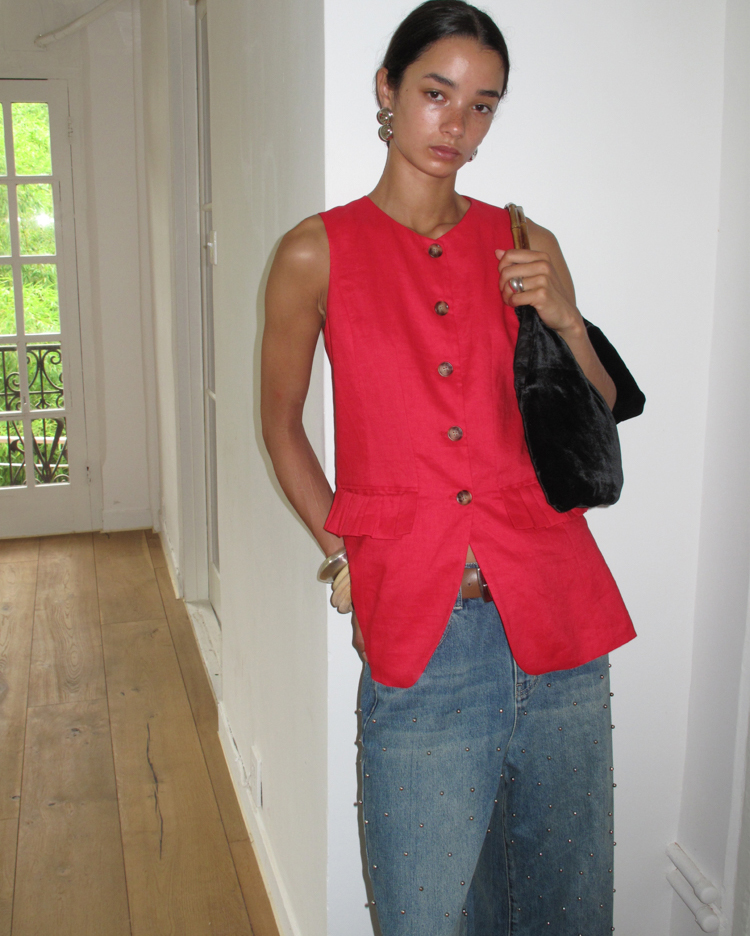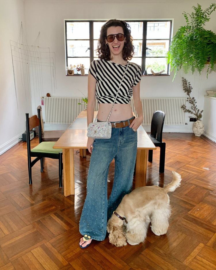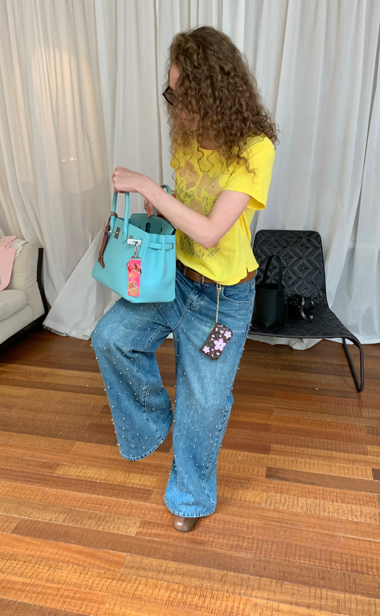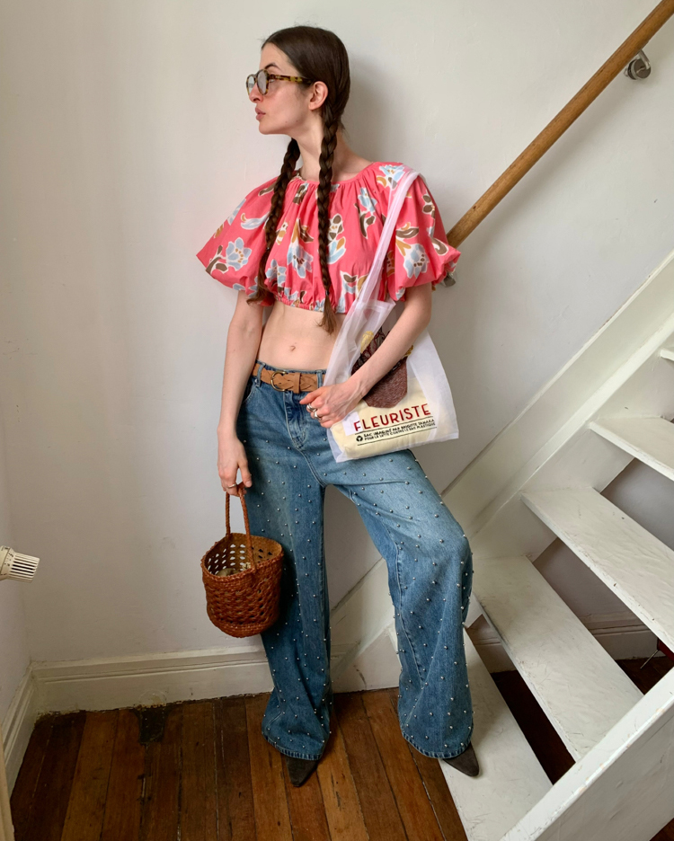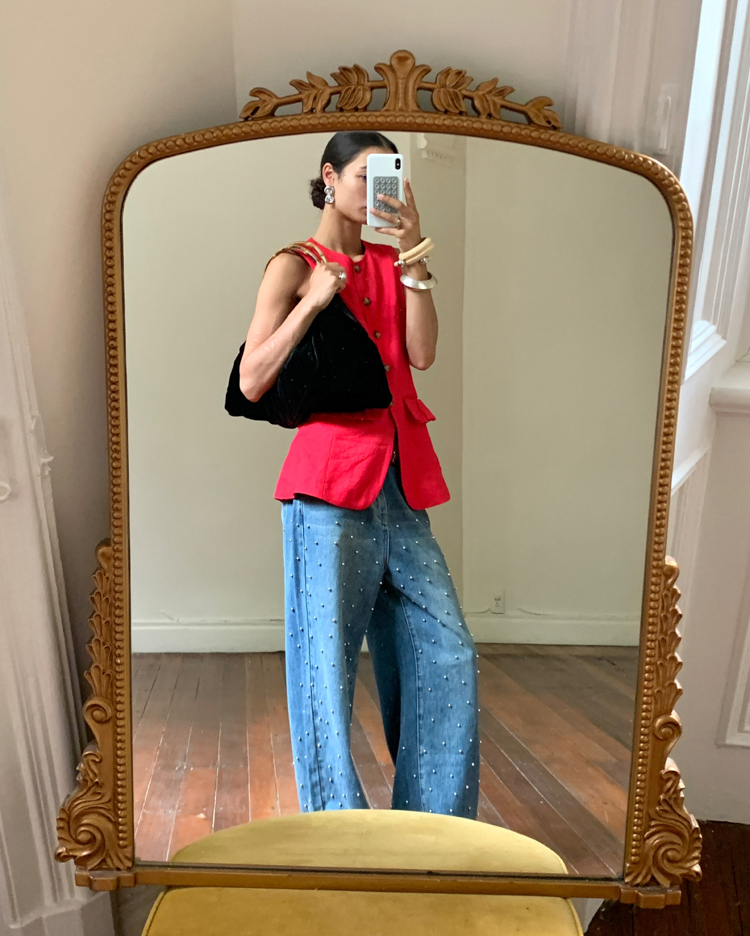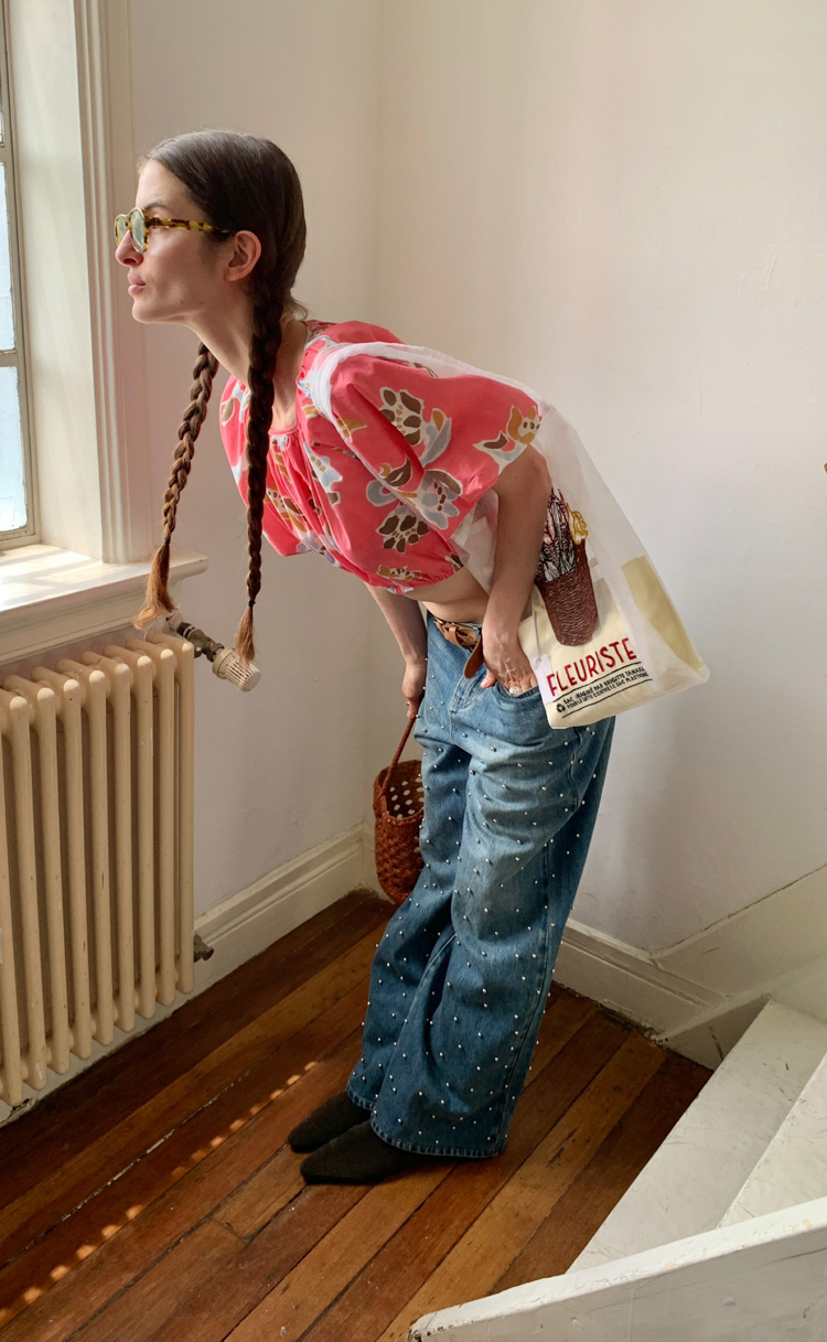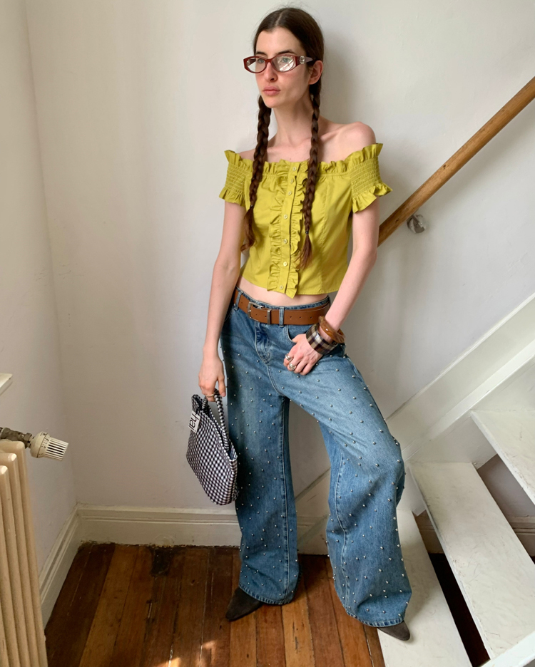 Metal beaded decoration washed wide-leg jeans