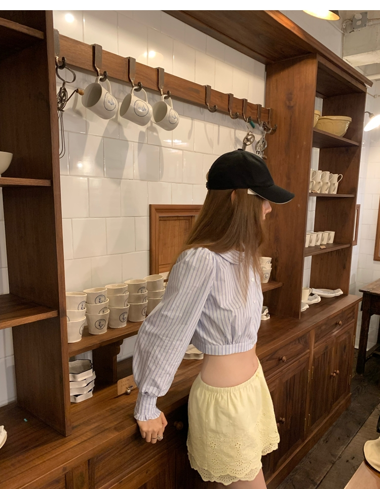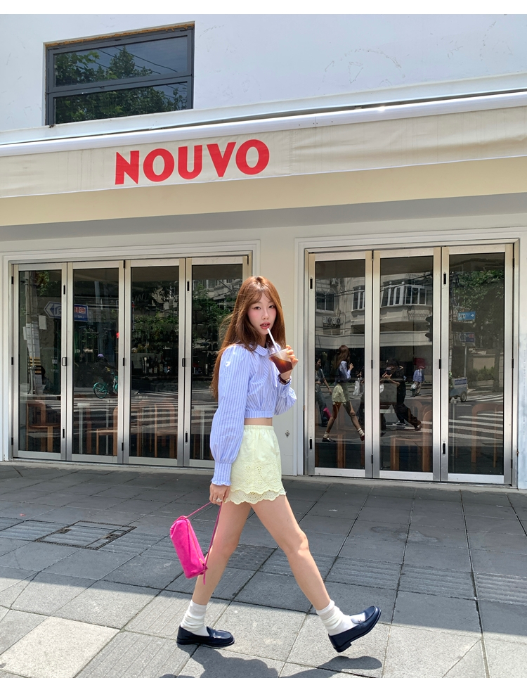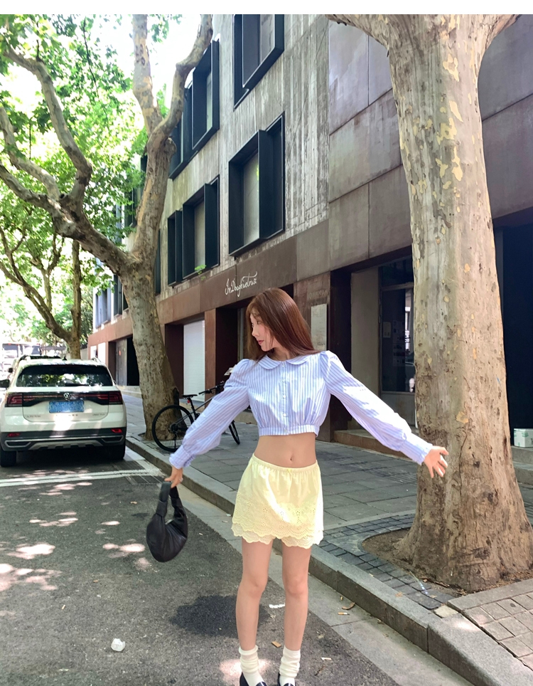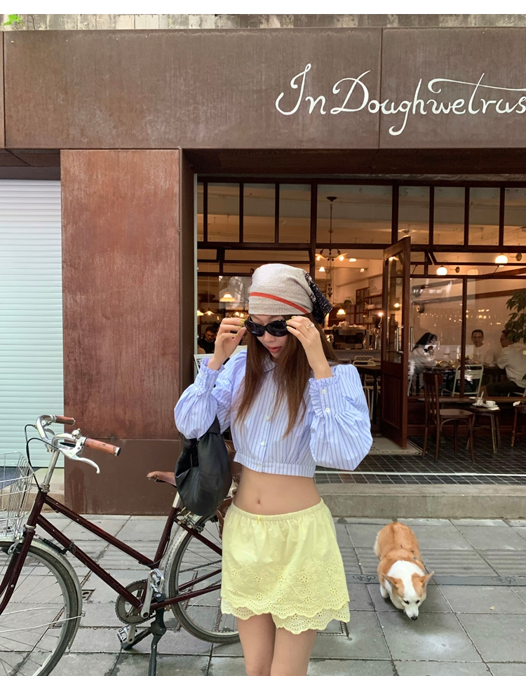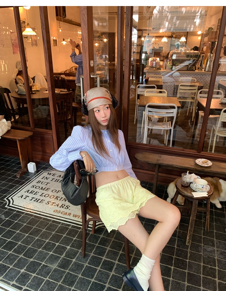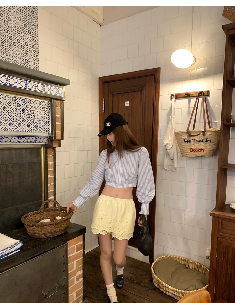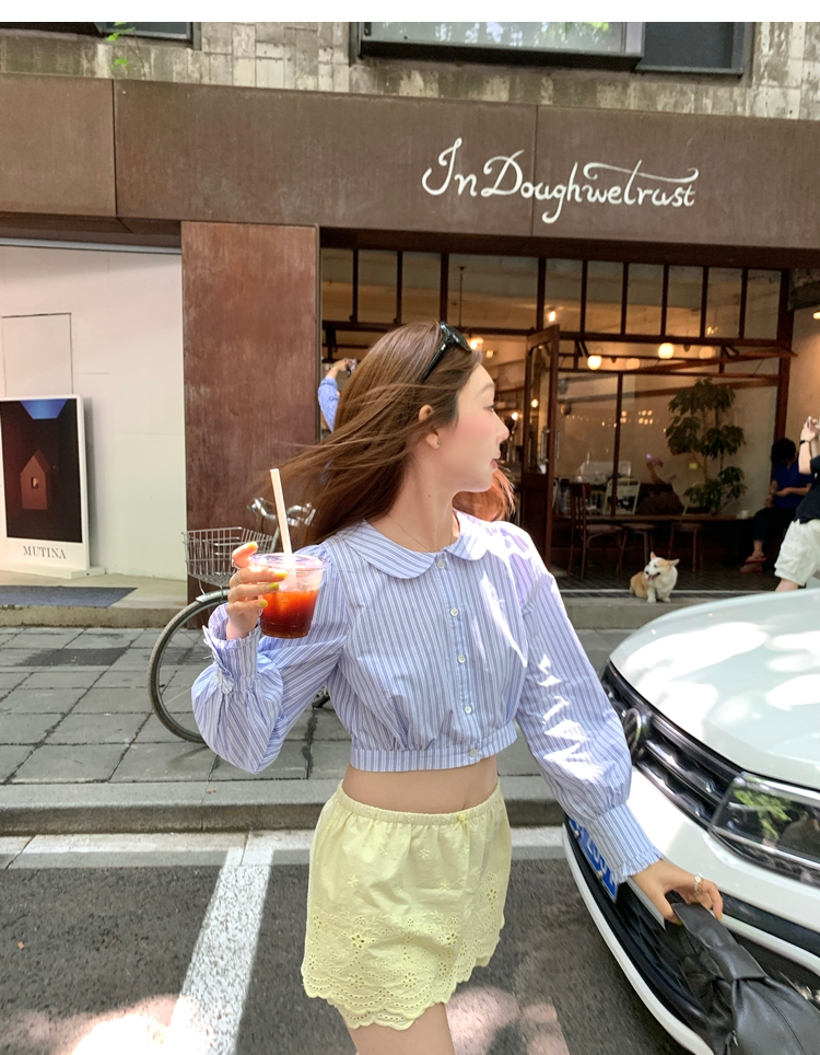 Lemon Vintage Stripe Doll Collar Bubble Sleeve Shirt Lace Floral Shorts Set