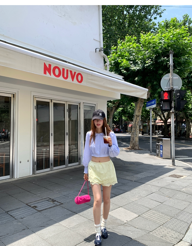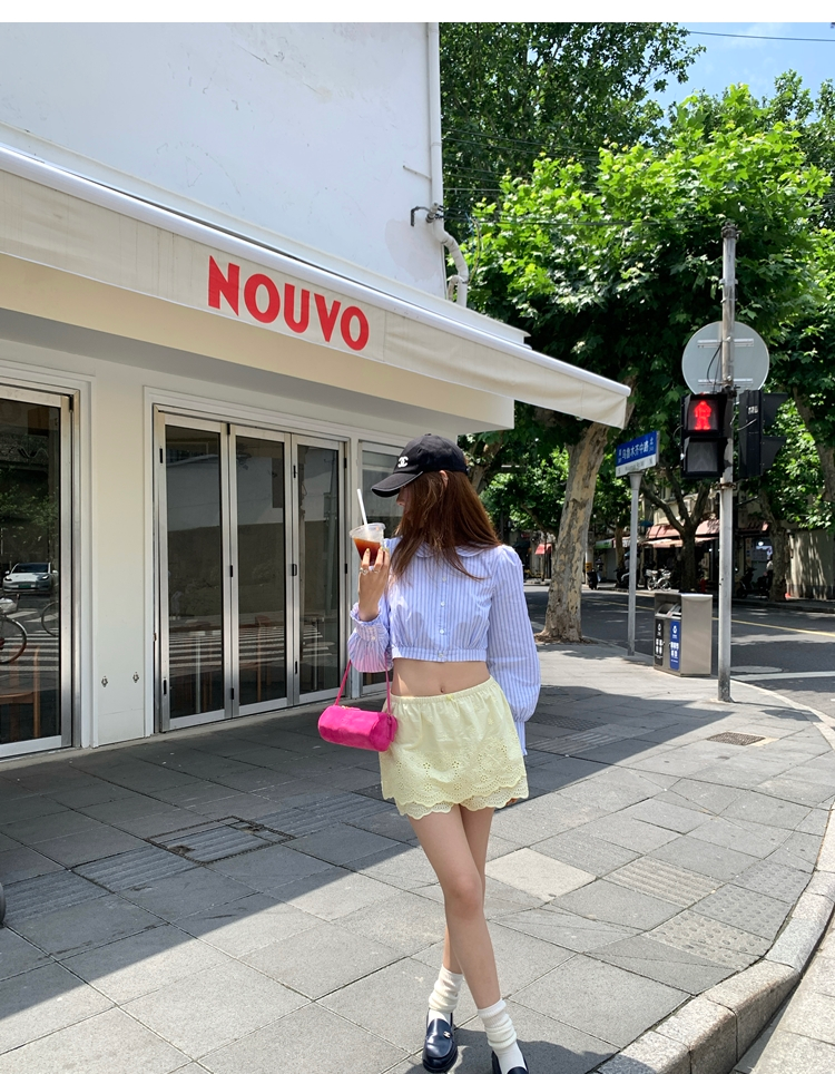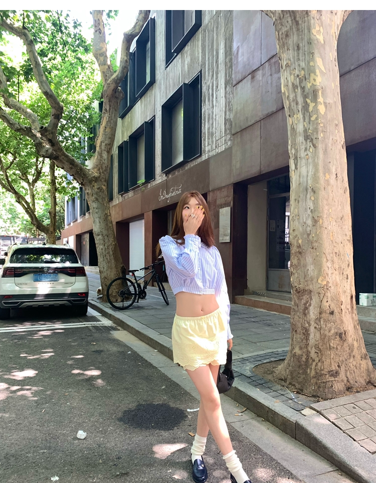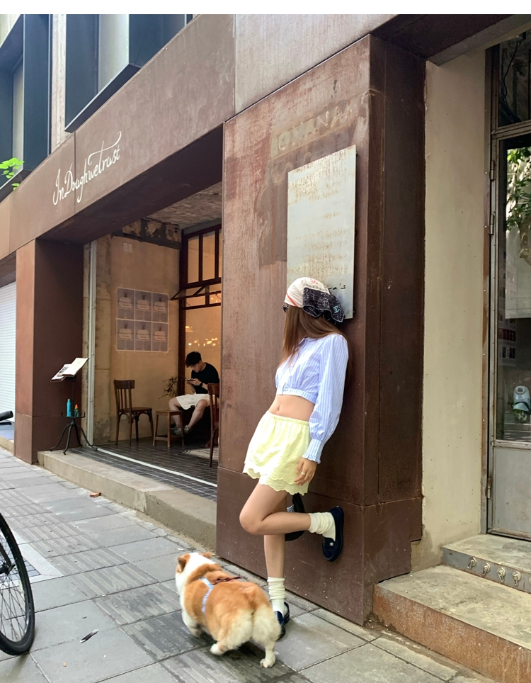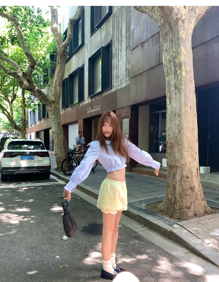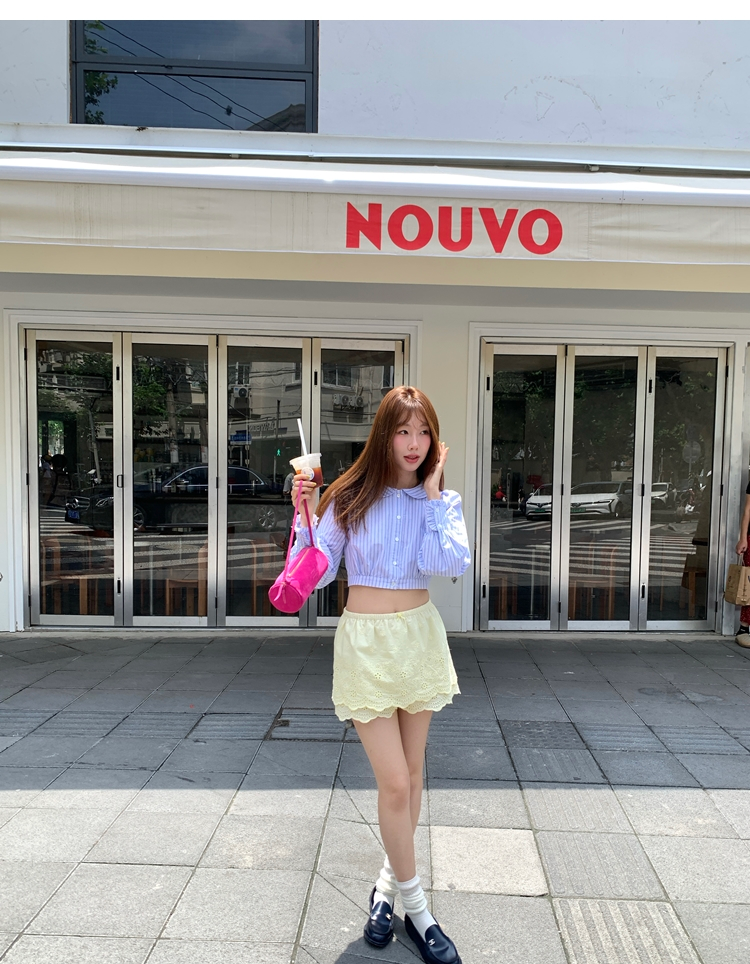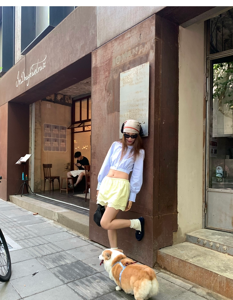 Lemon Vintage Stripe Doll Collar Bubble Sleeve Shirt Lace Floral Shorts Set