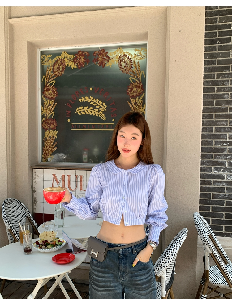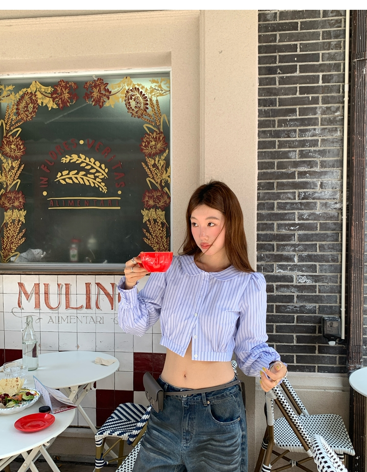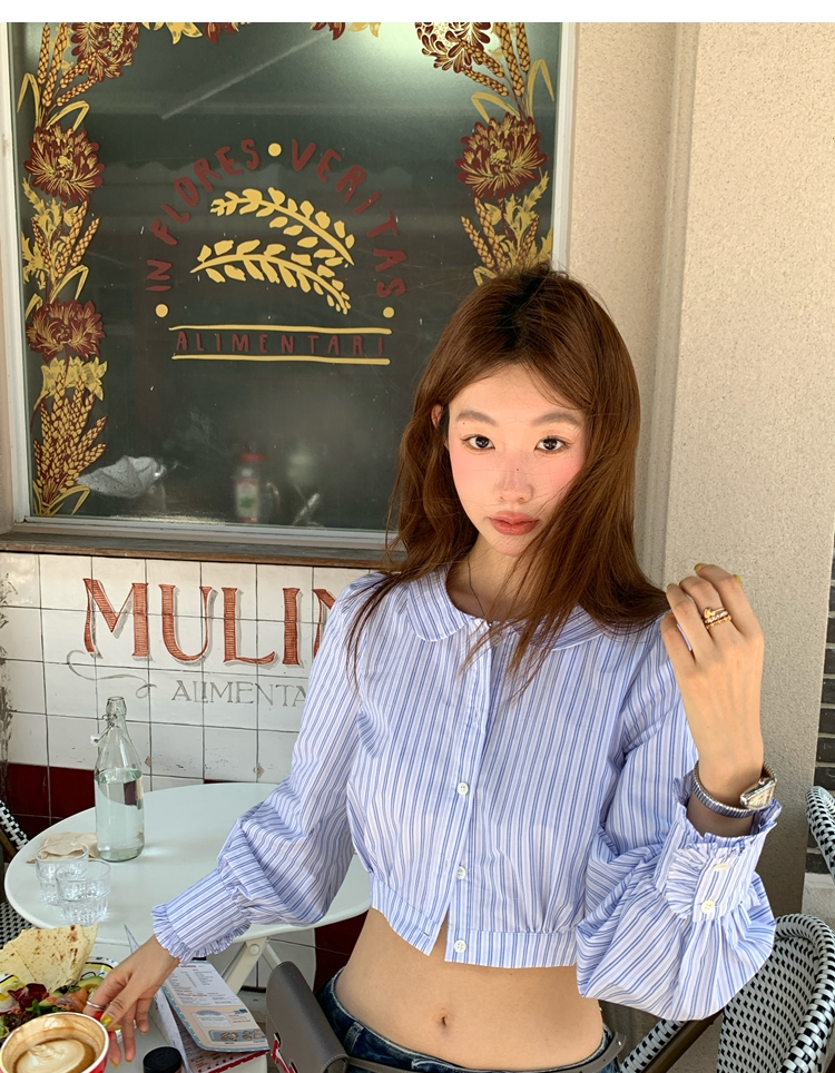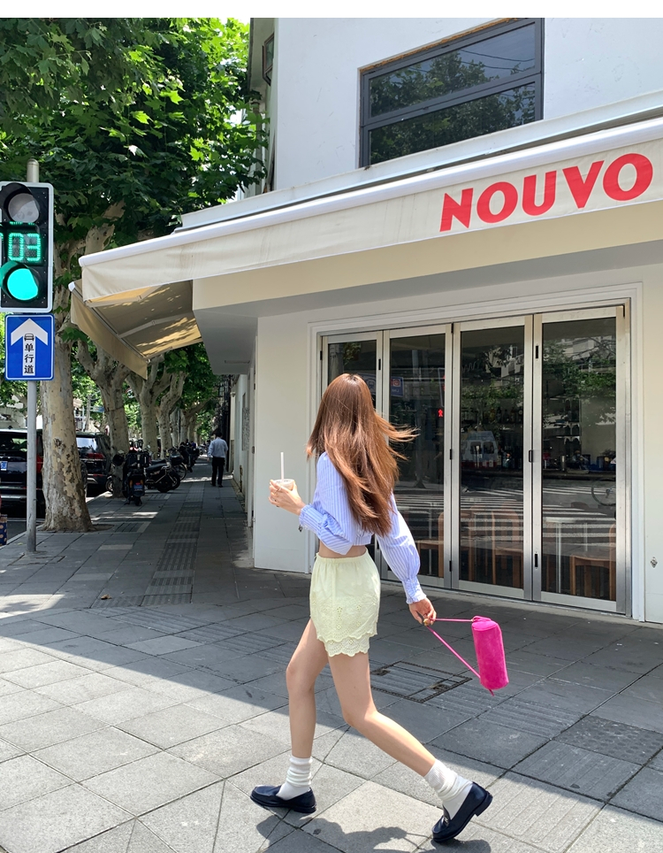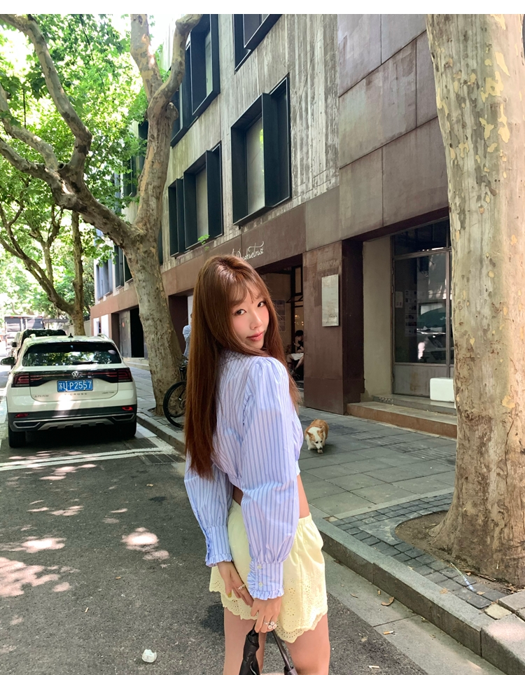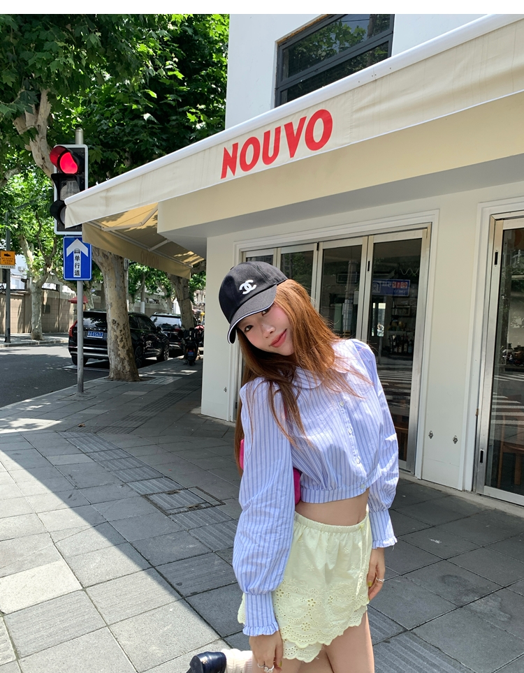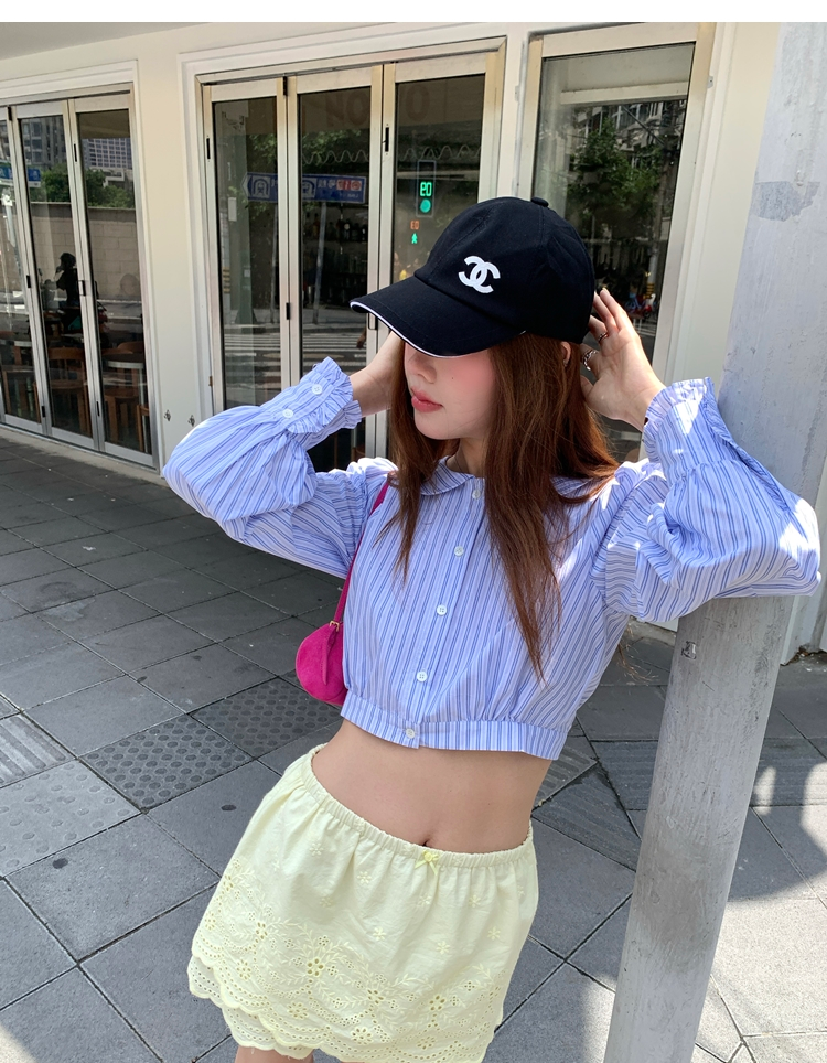 Lemon Vintage Stripe Doll Collar Bubble Sleeve Shirt Lace Floral Shorts Set