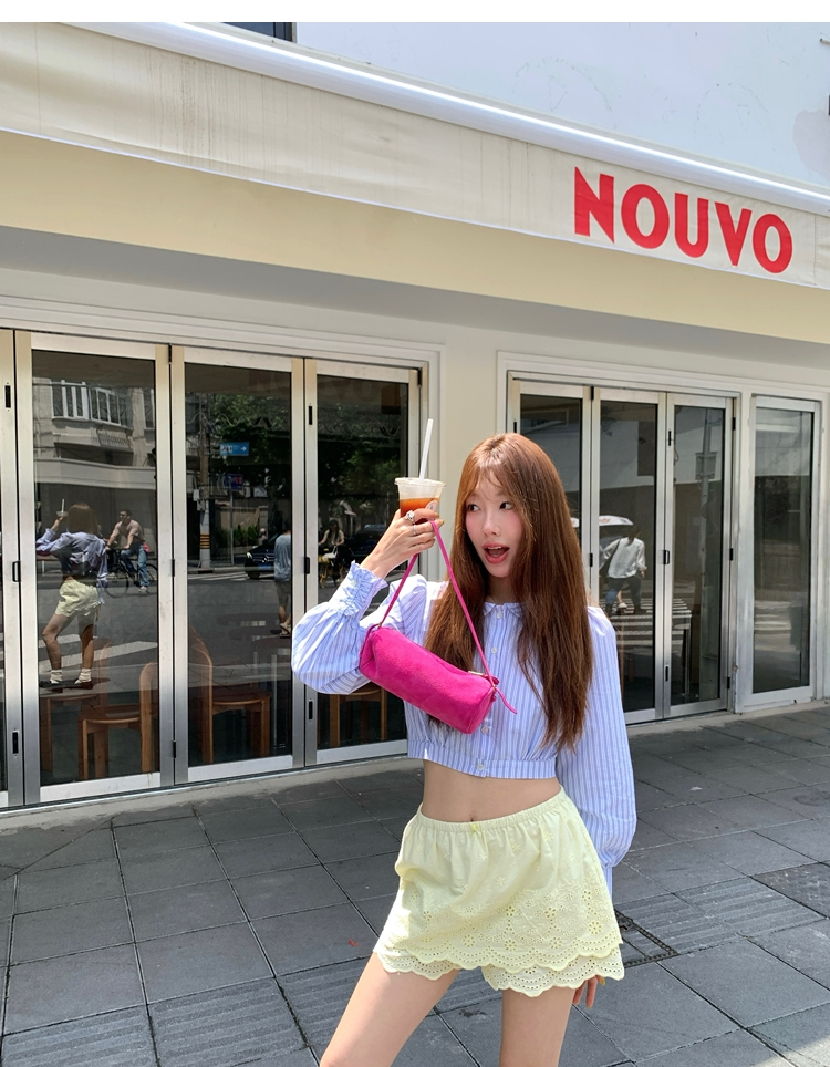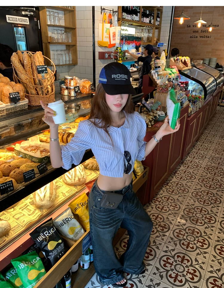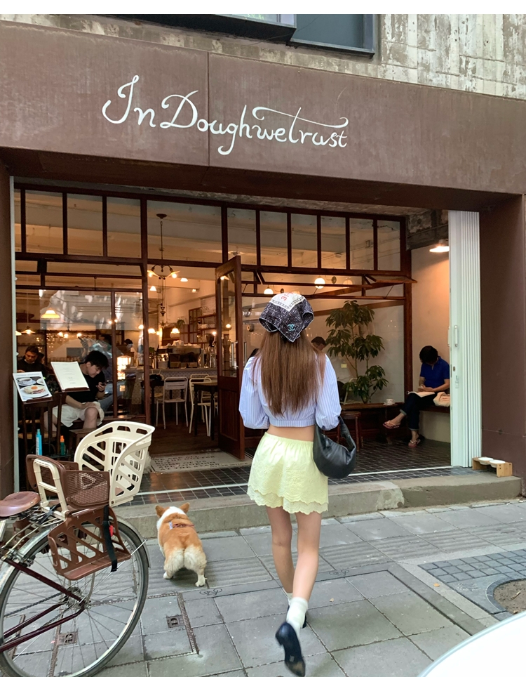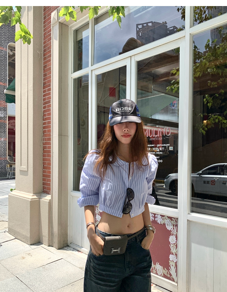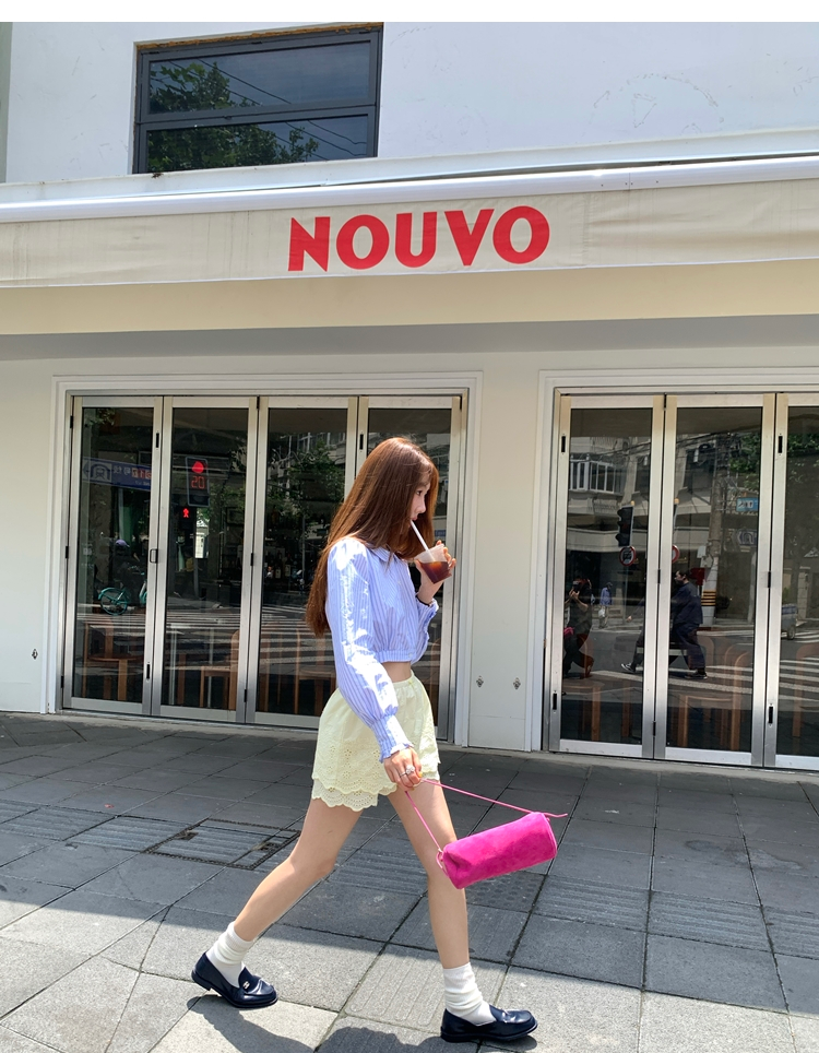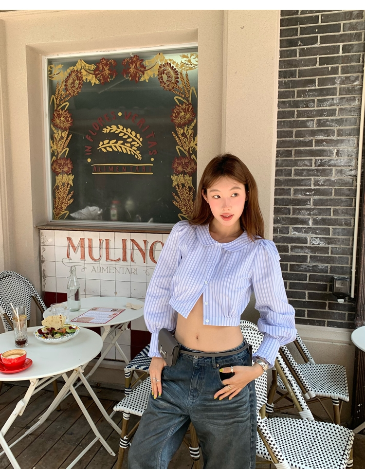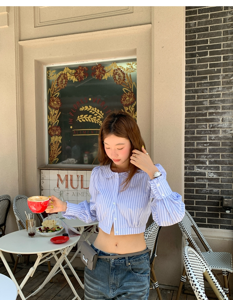 Lemon Vintage Stripe Doll Collar Bubble Sleeve Shirt Lace Floral Shorts Set