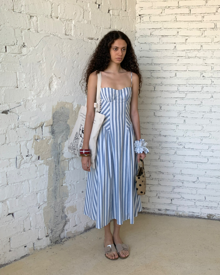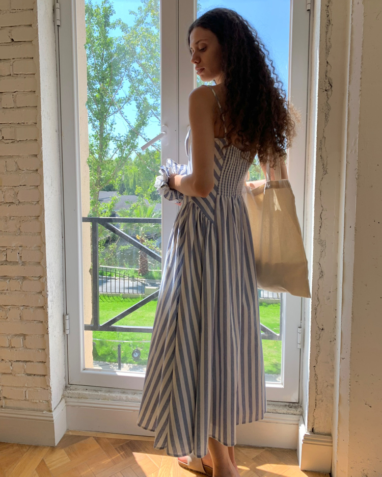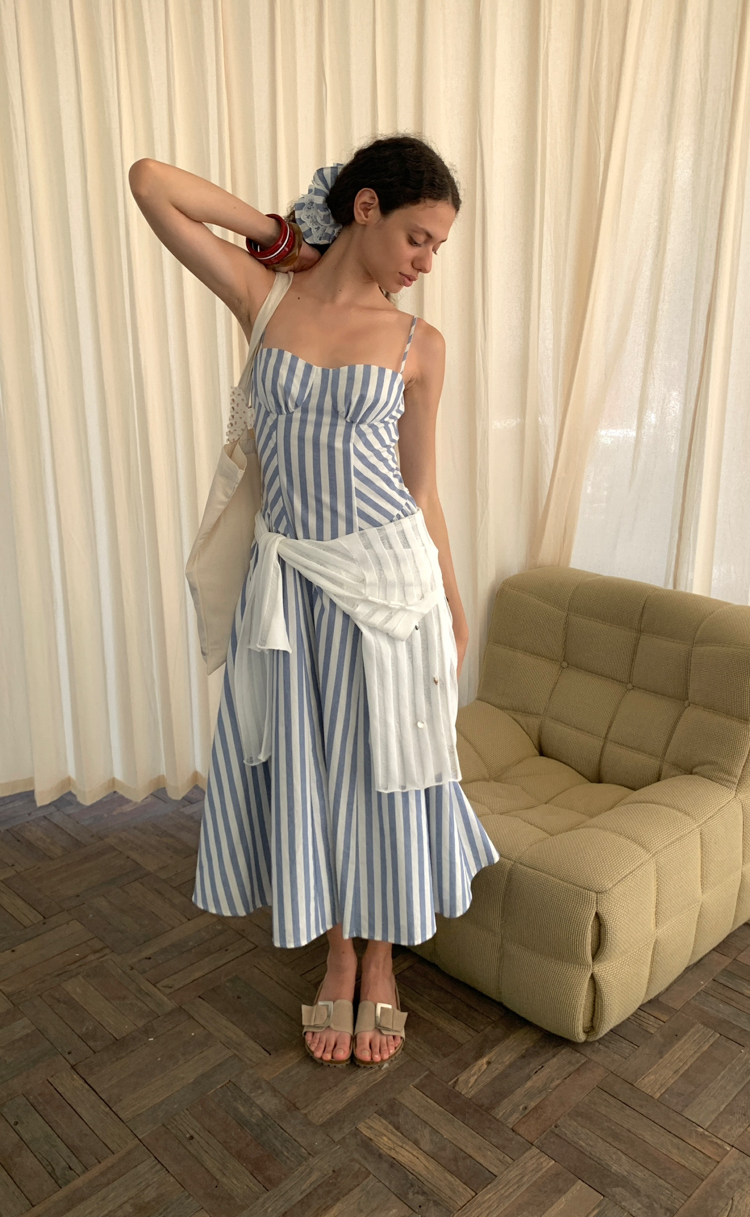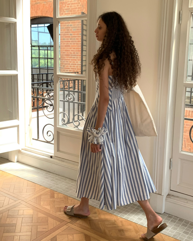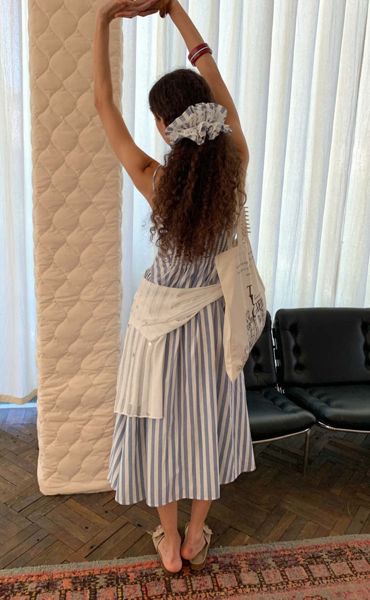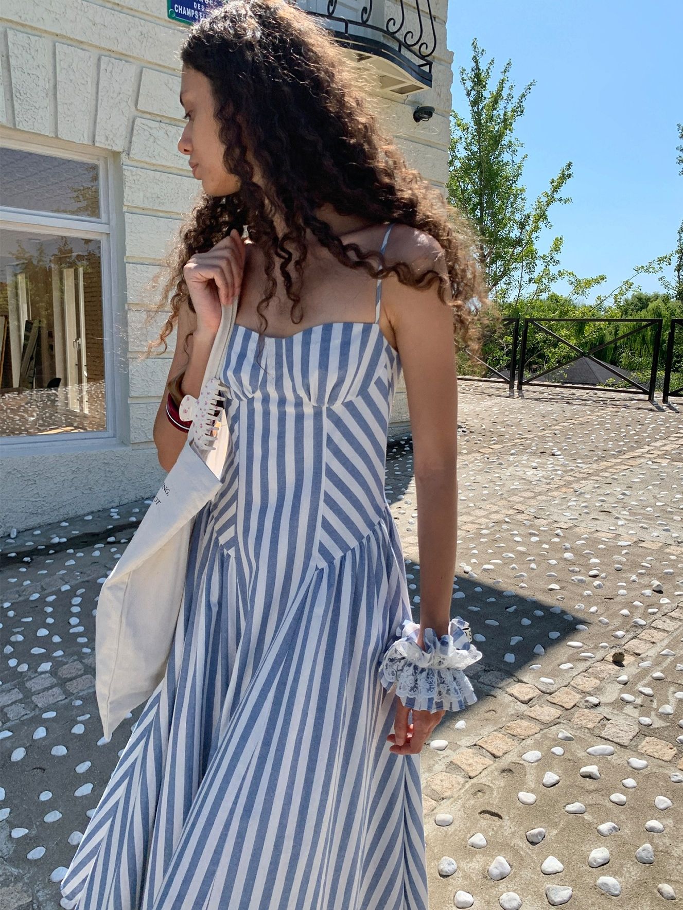 Stitched Blue White Stripe Cotton Long Dress / hairband
