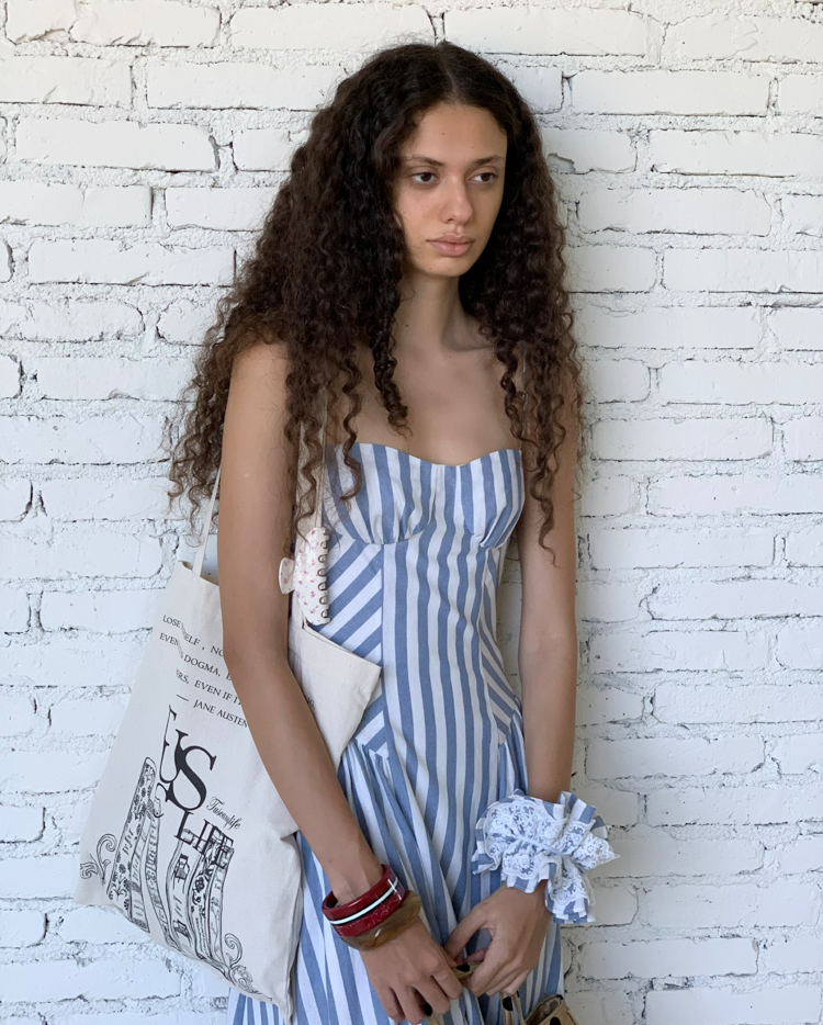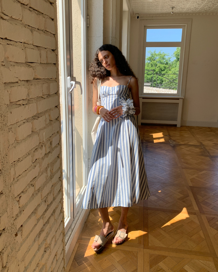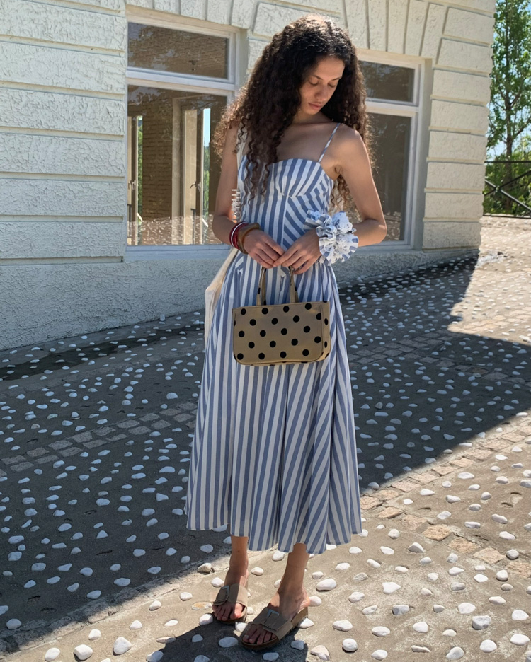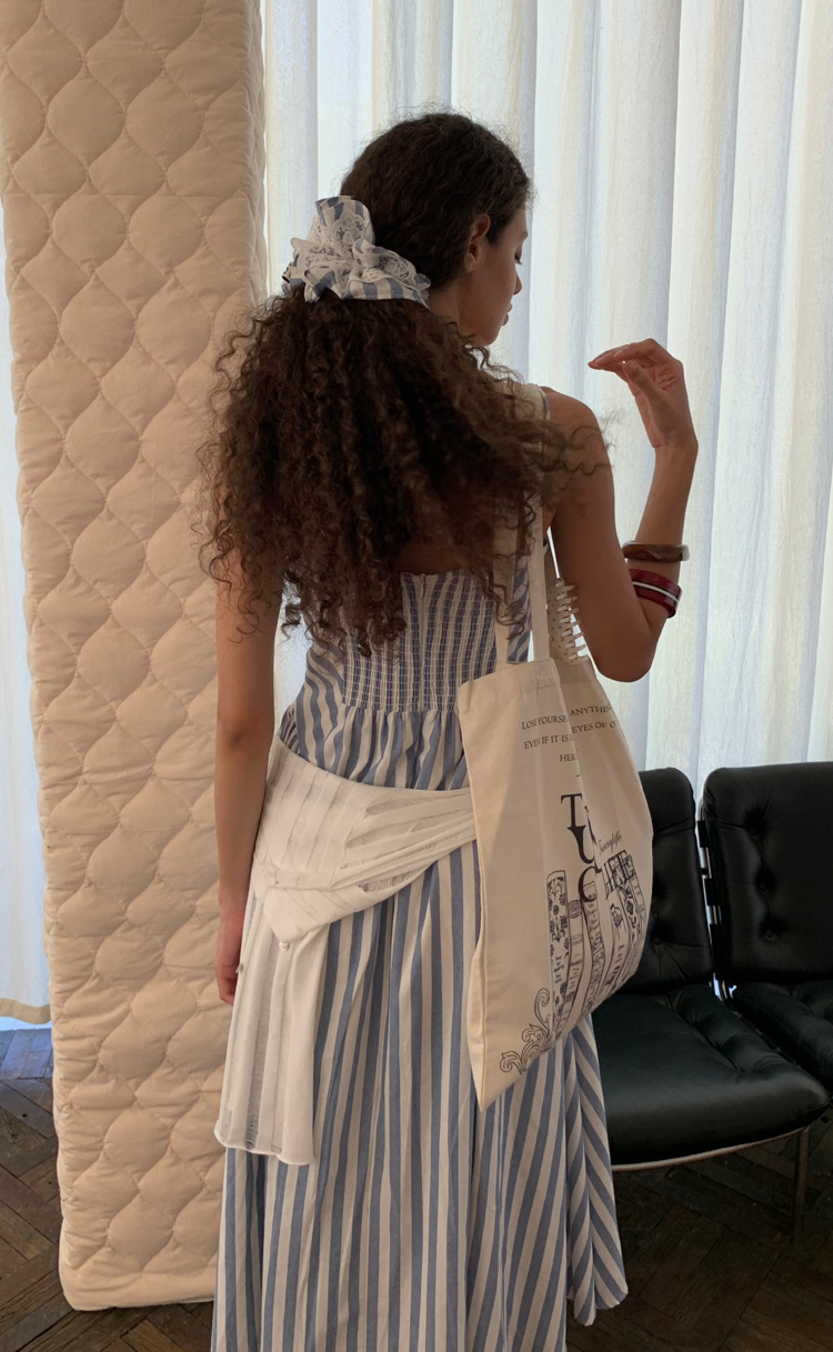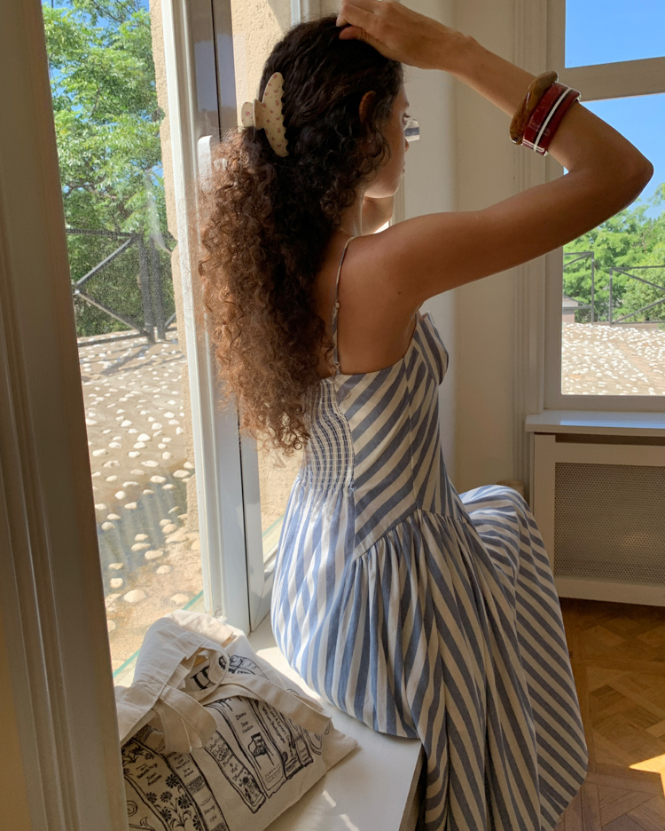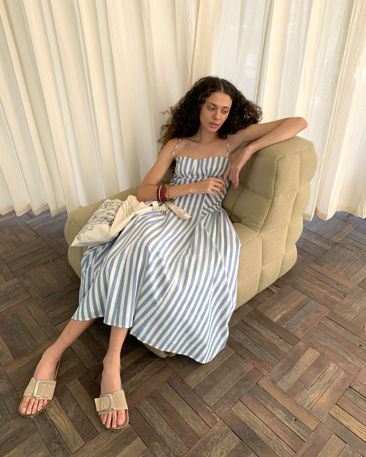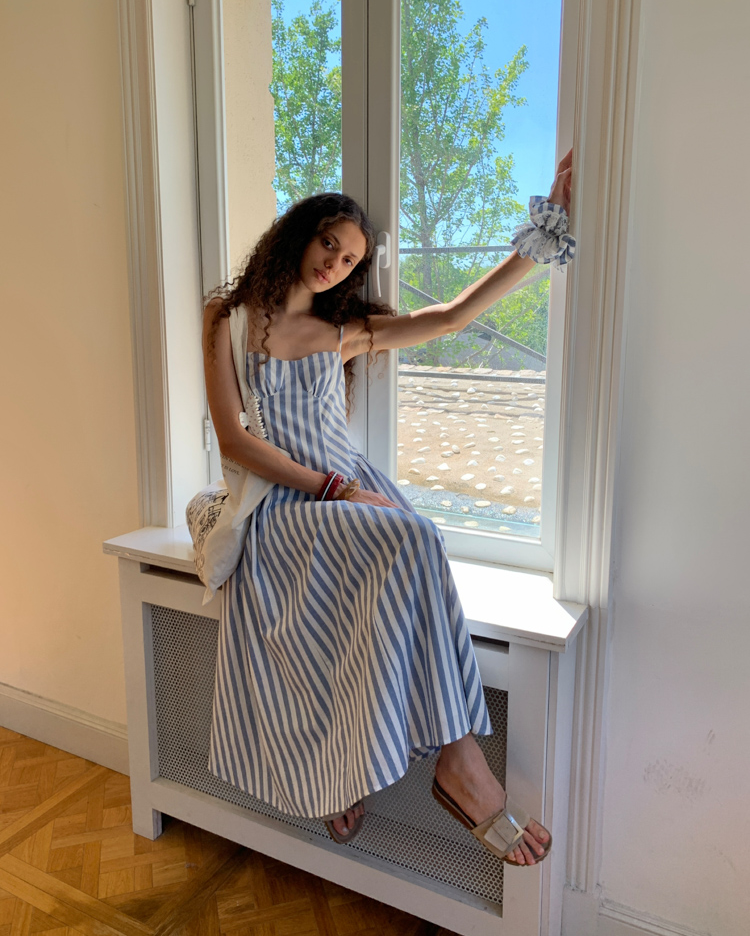 Stitched Blue White Stripe Cotton Long Dress / hairband