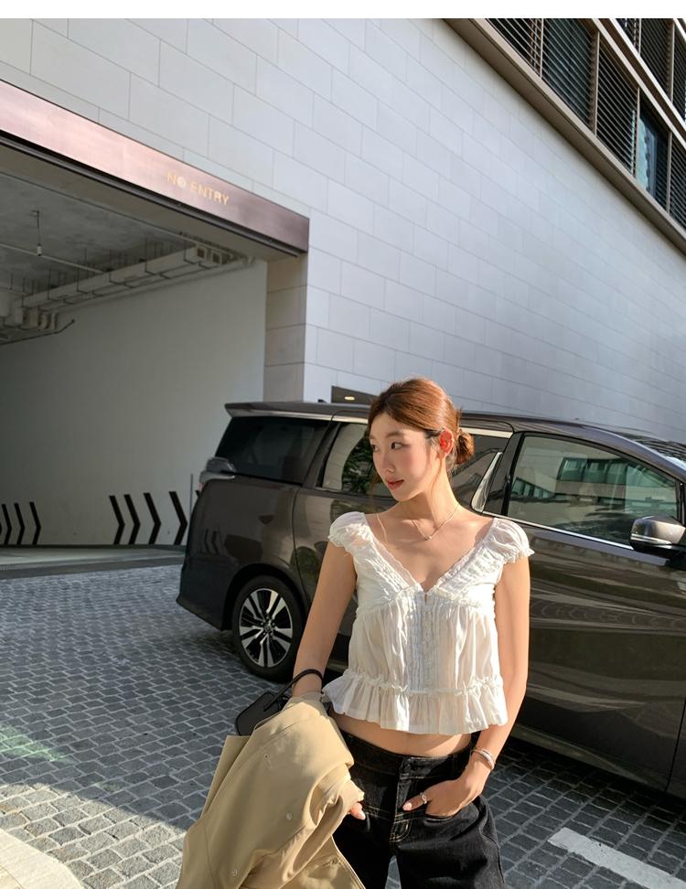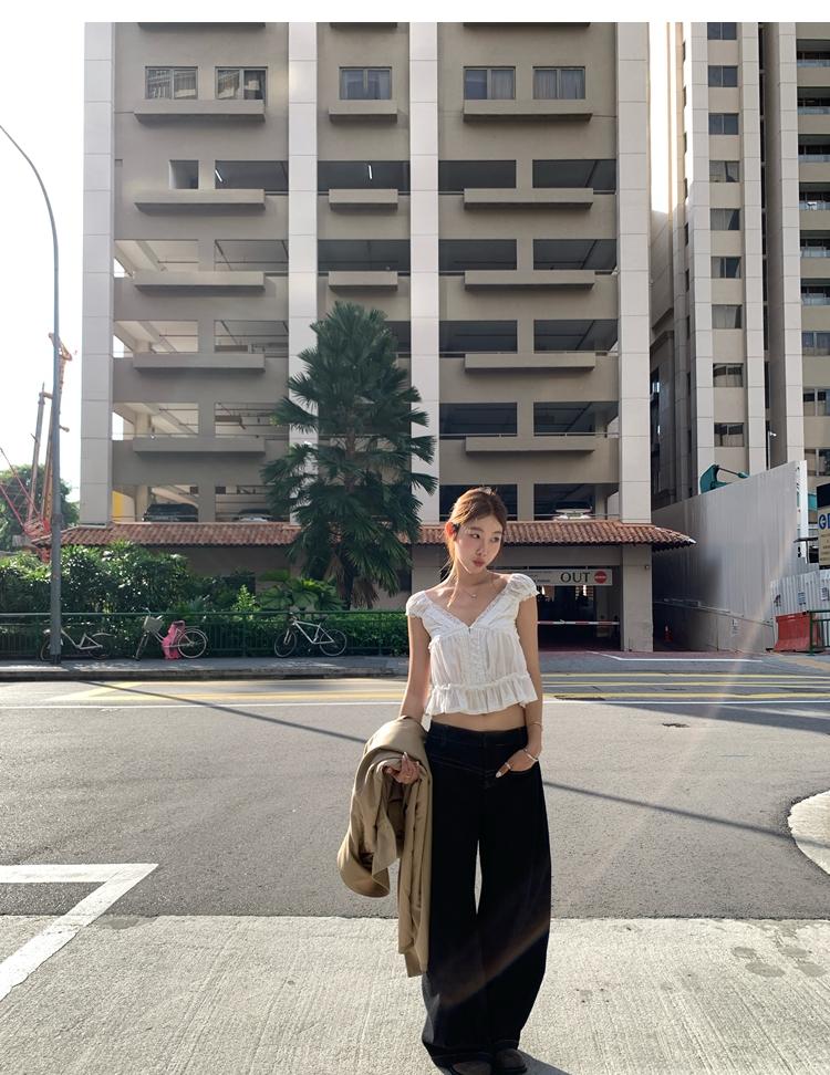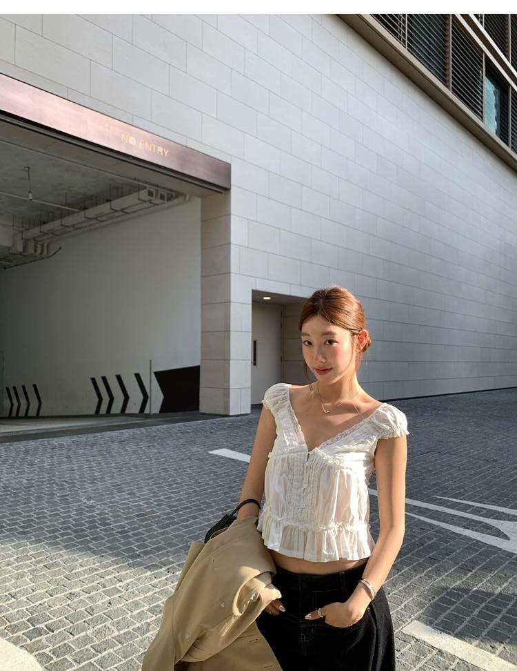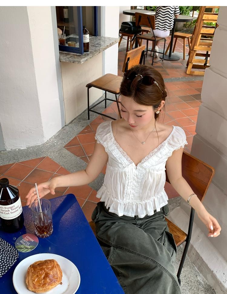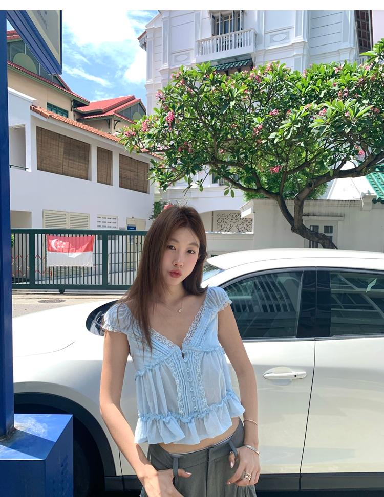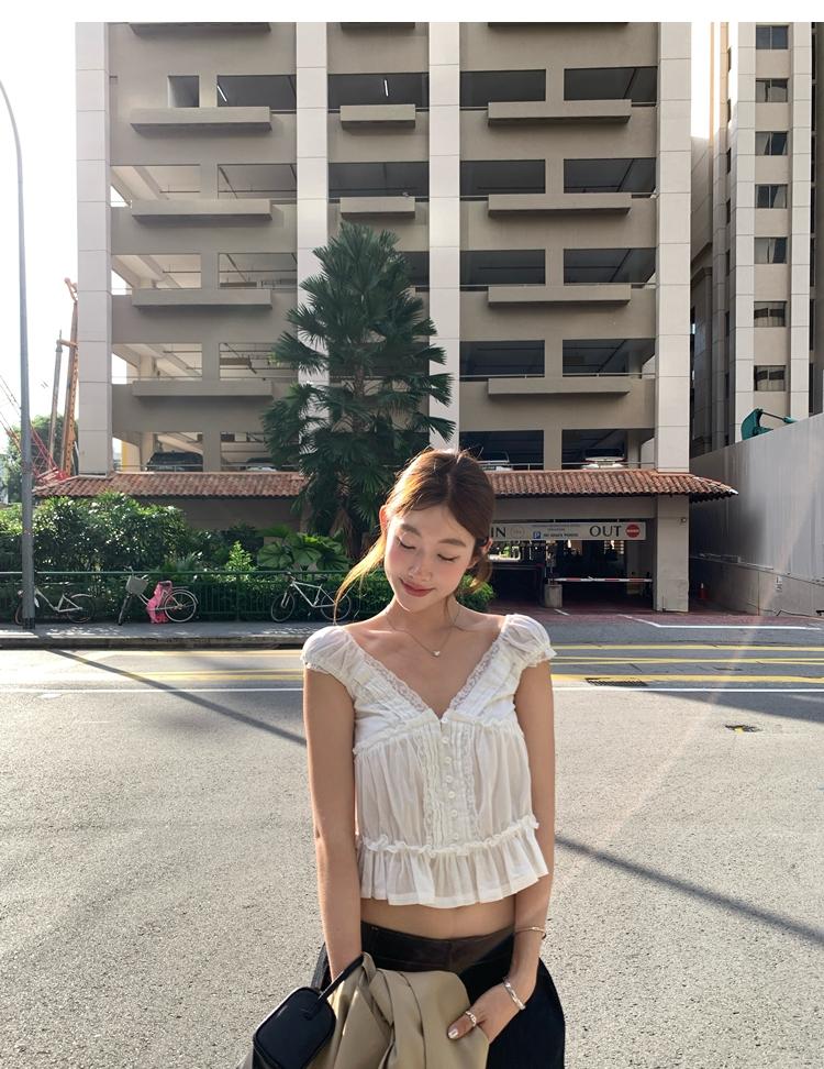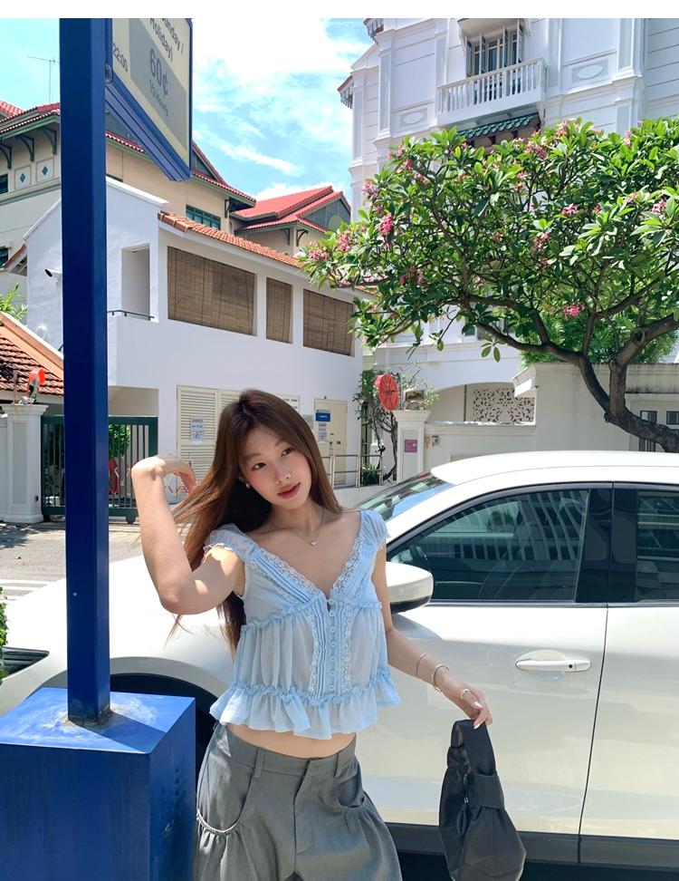 Delicate French lace V-neck back clear lotus leaf edges Top