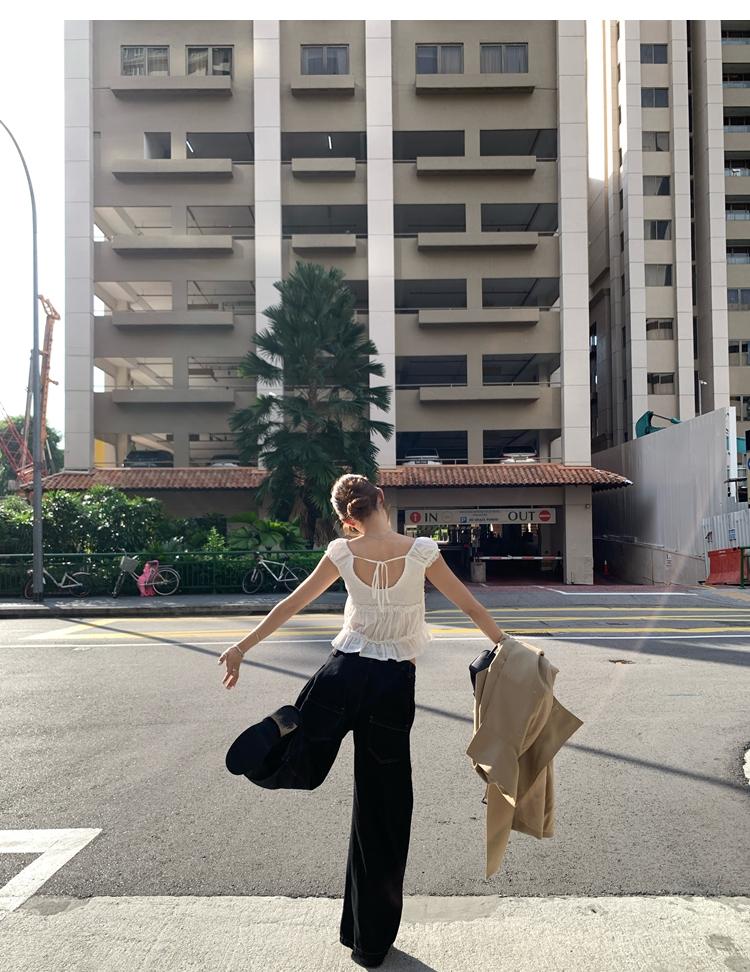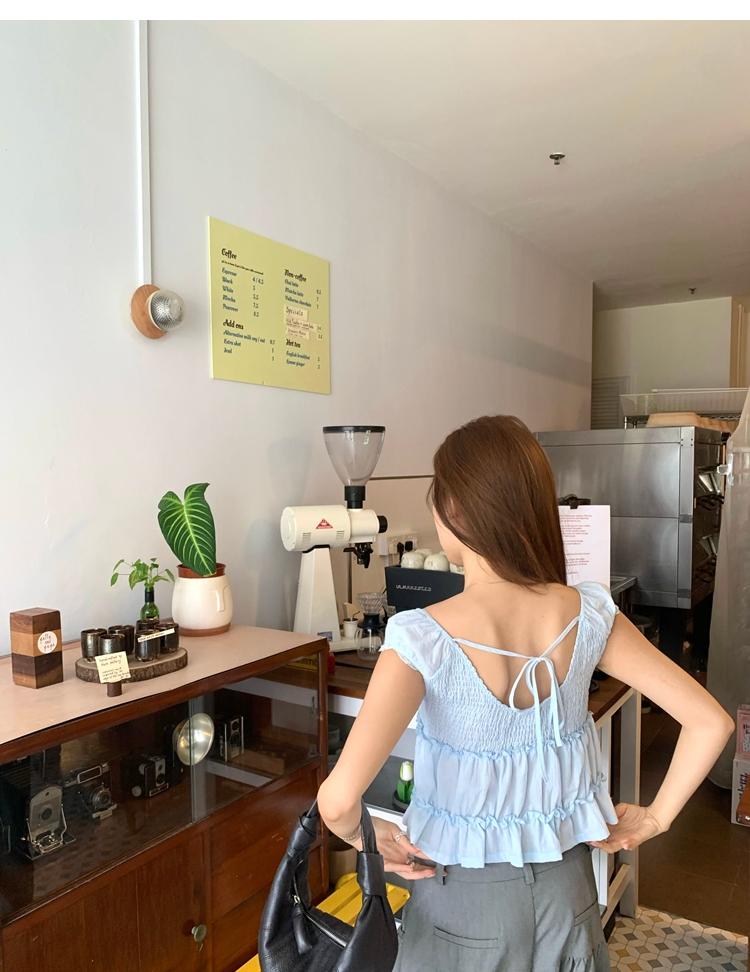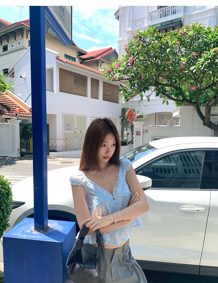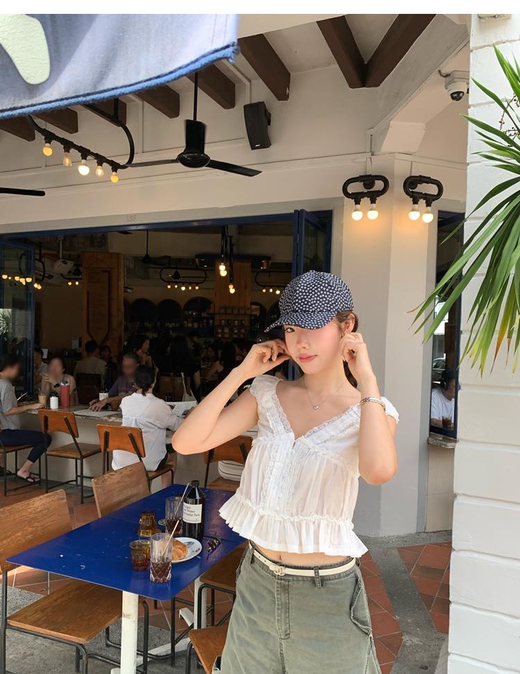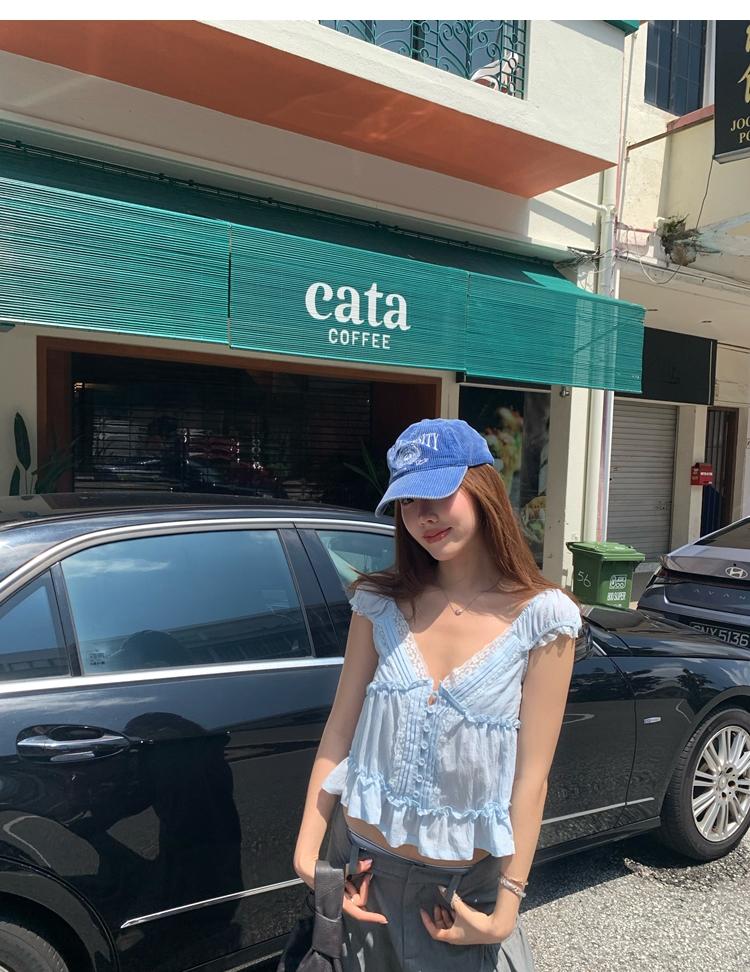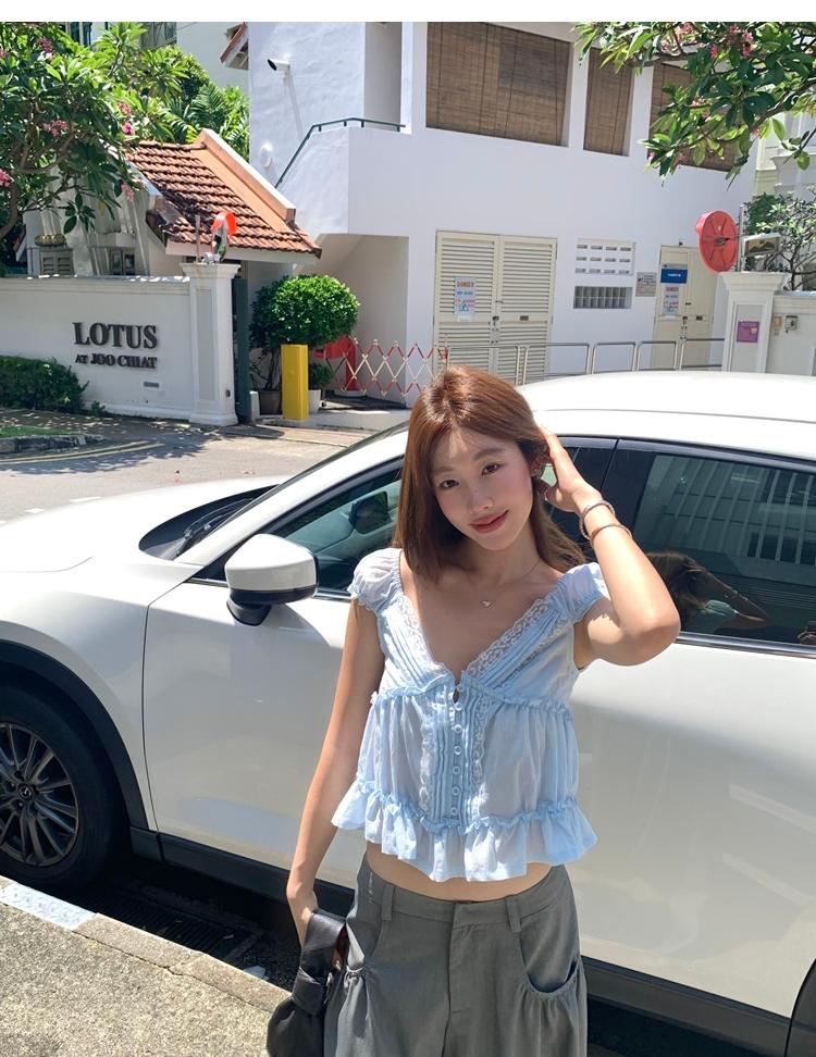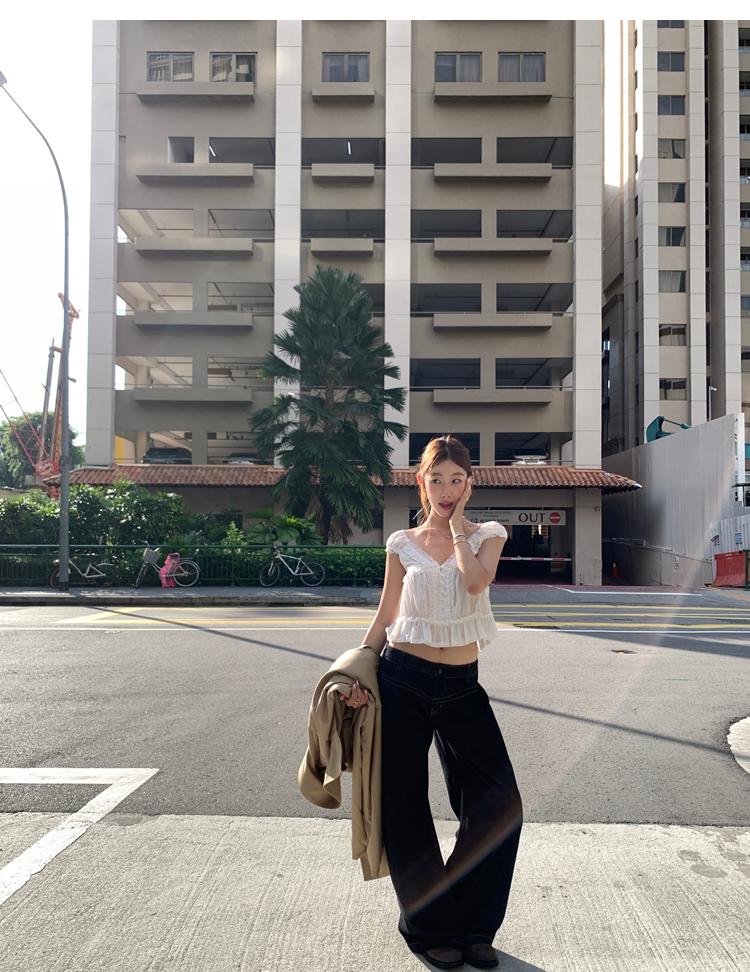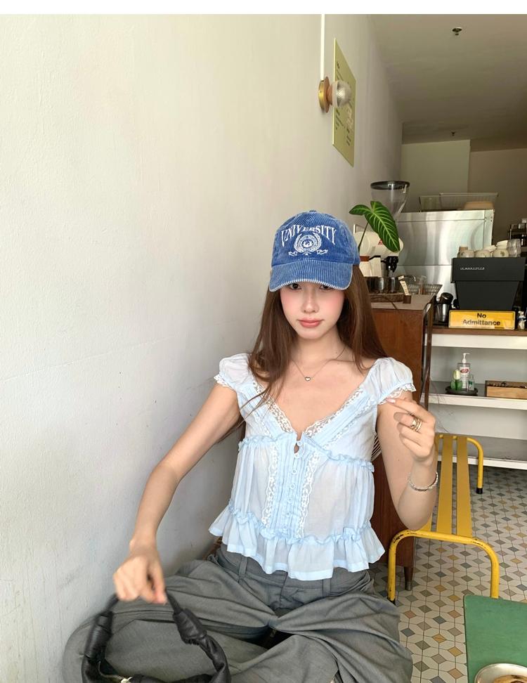 Delicate French lace V-neck back clear lotus leaf edges Top