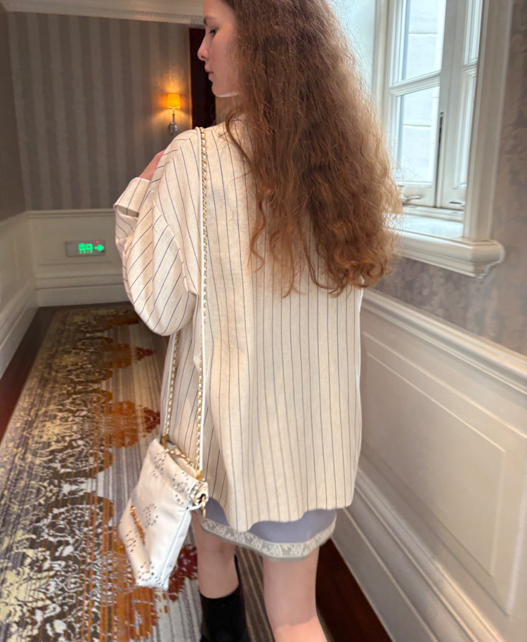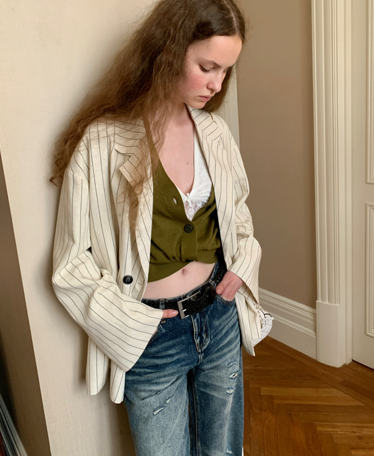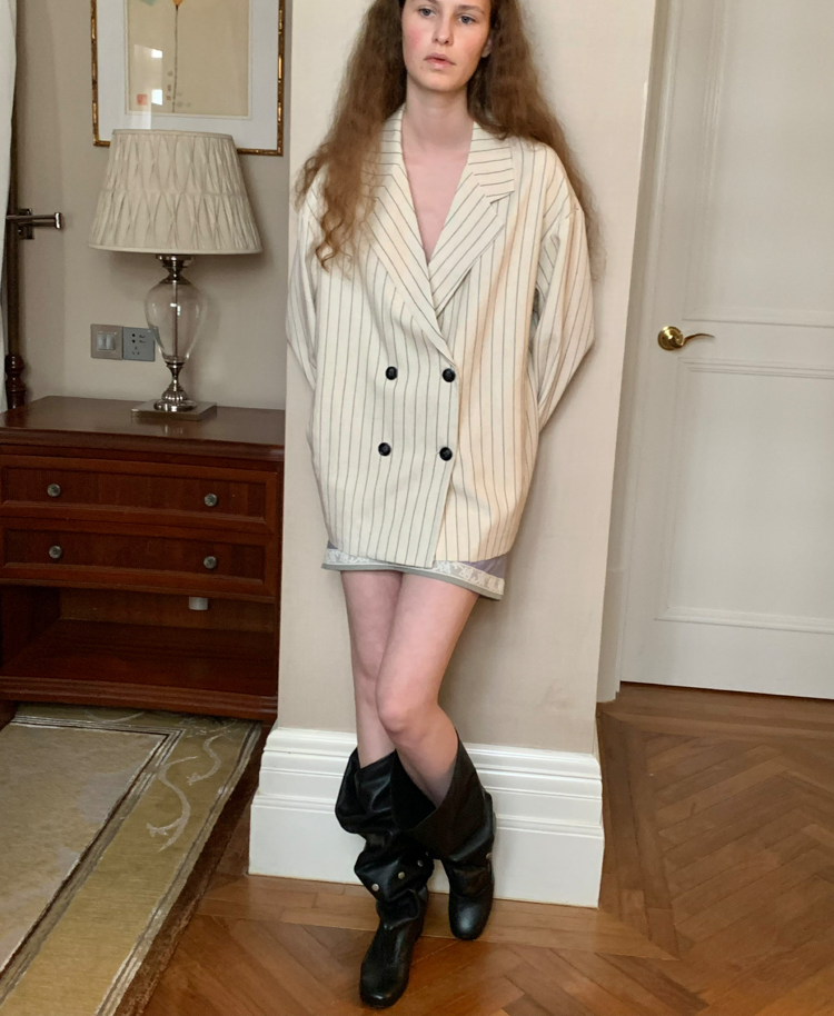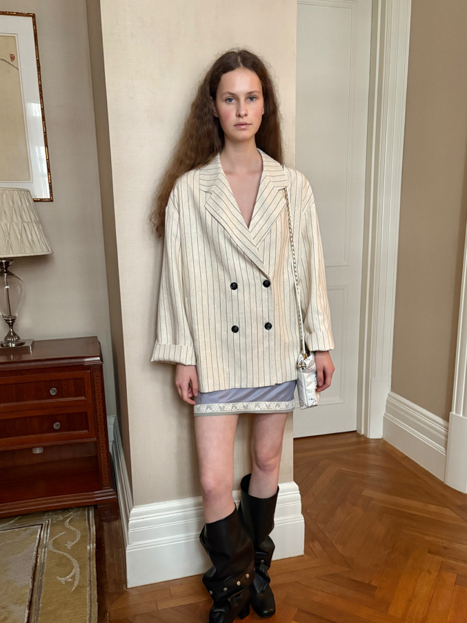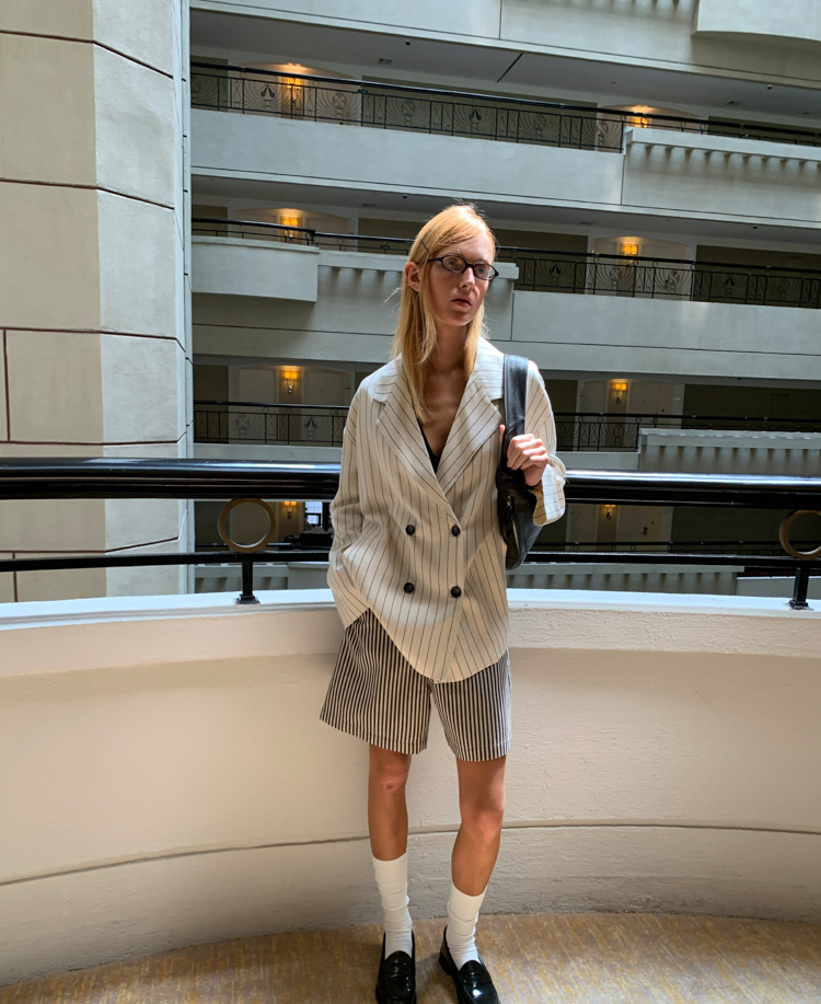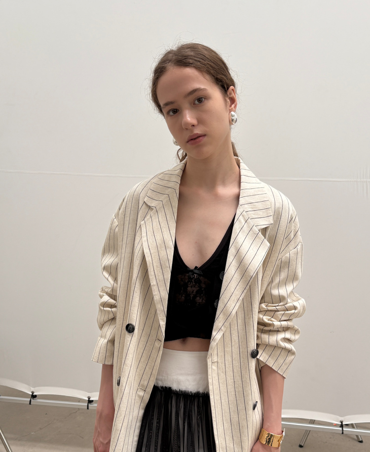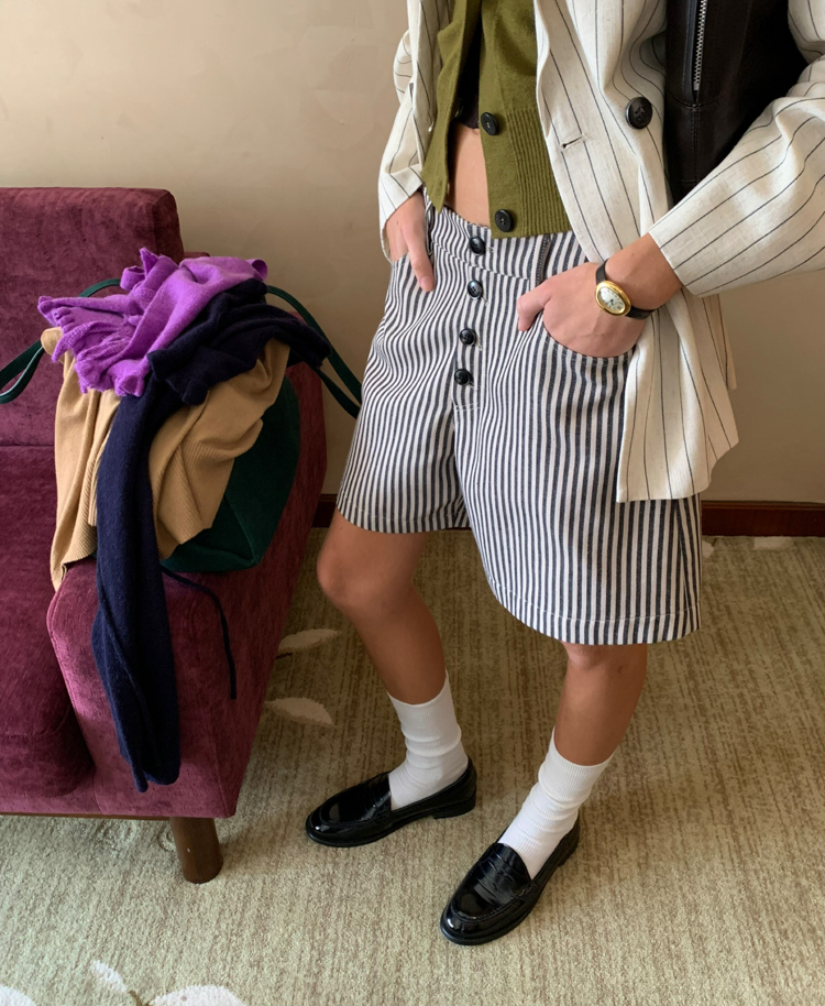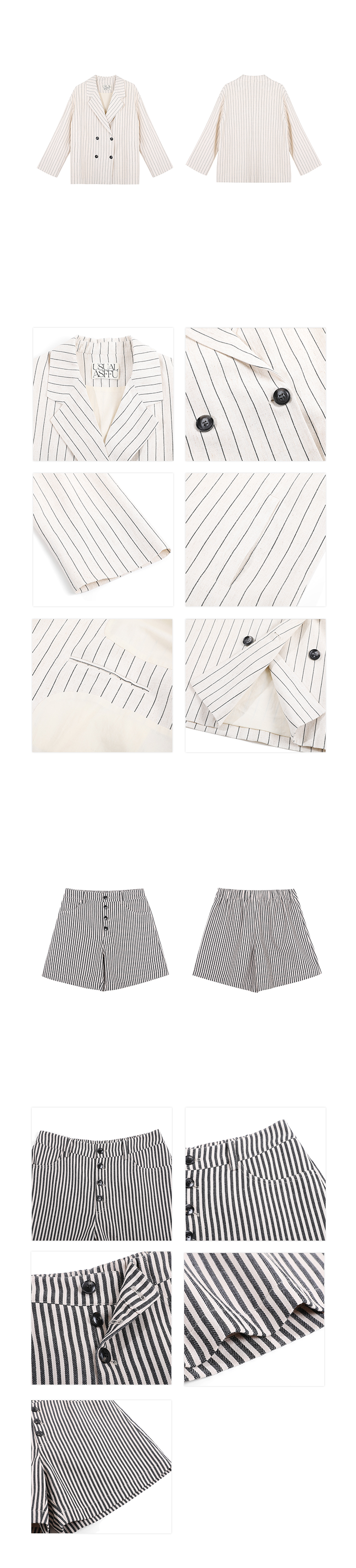 linen blend oversize double placket drop shoulder striped suit & shorts