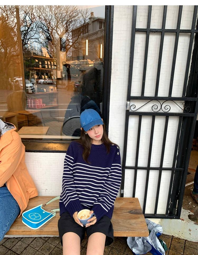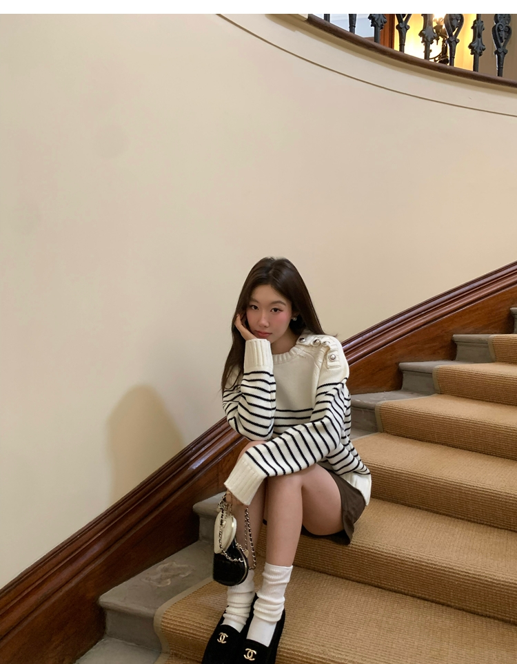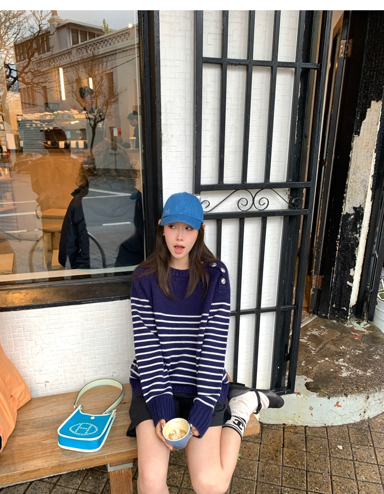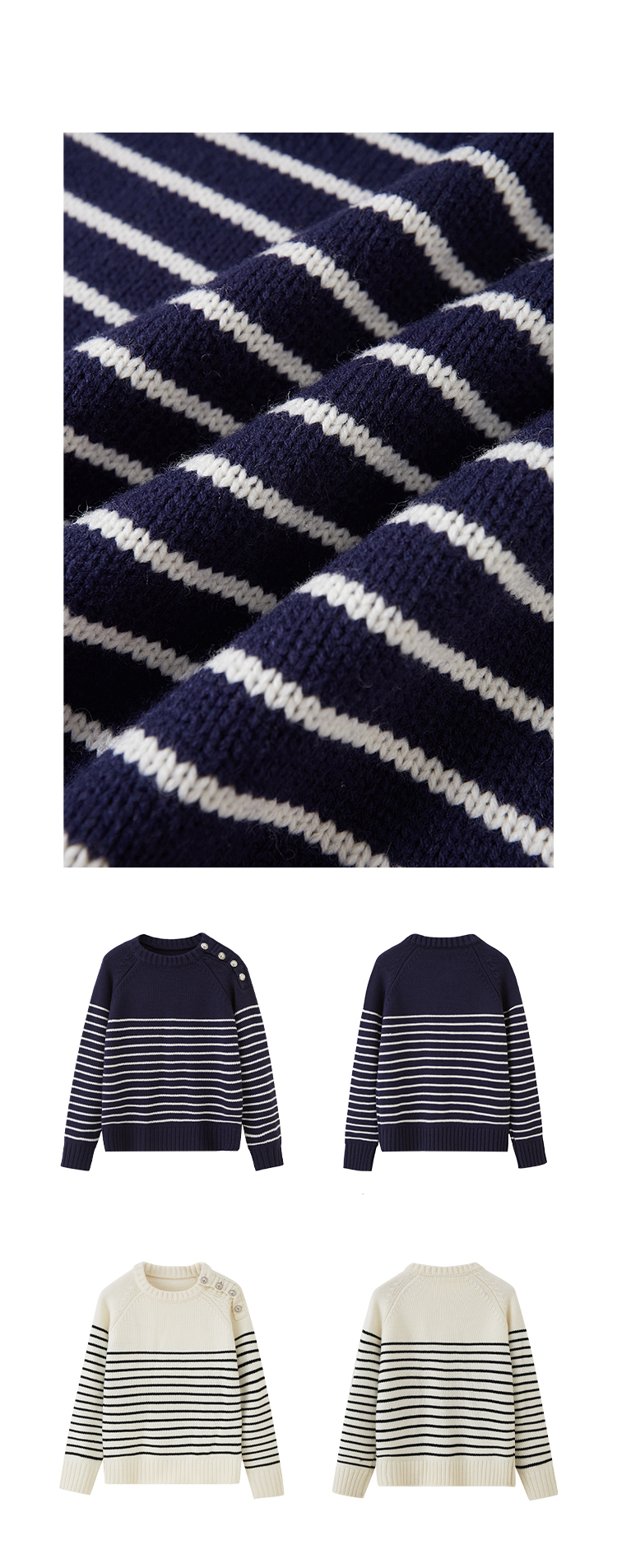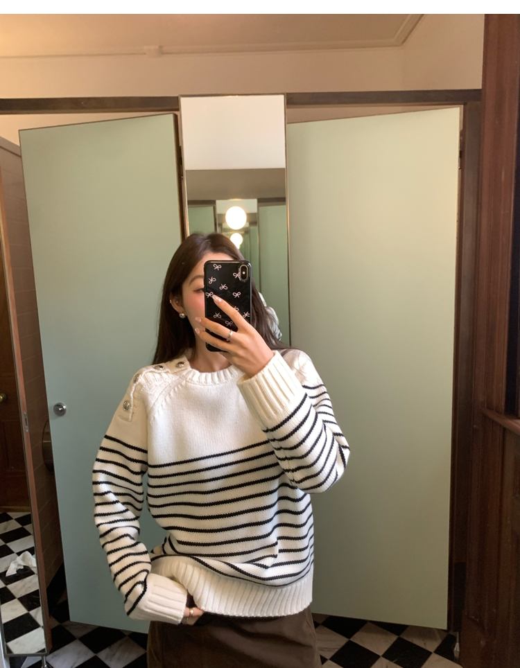 Autumn Winter Contrast Striped Shoulder Button Thick Sweater